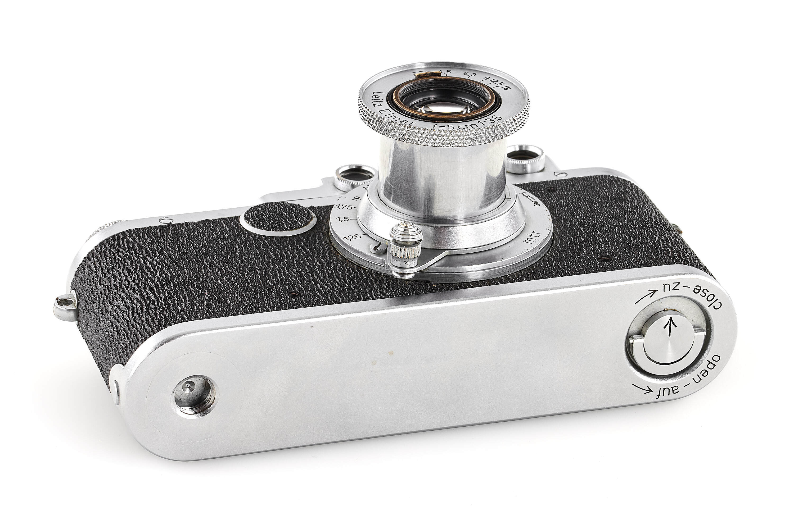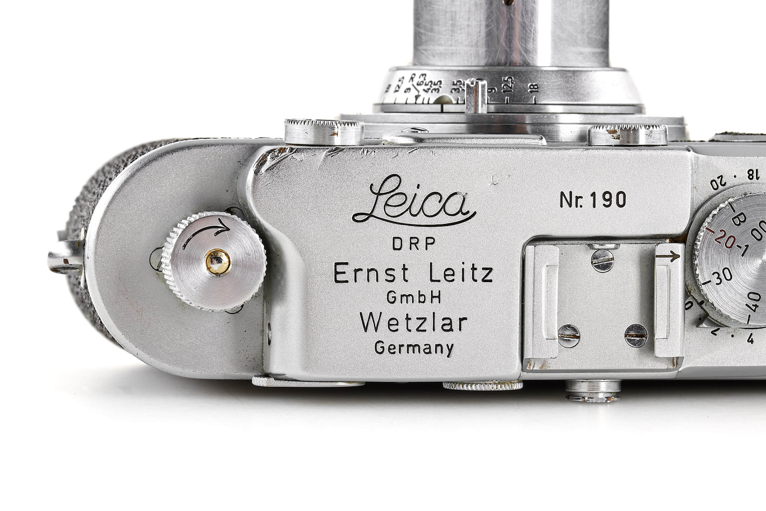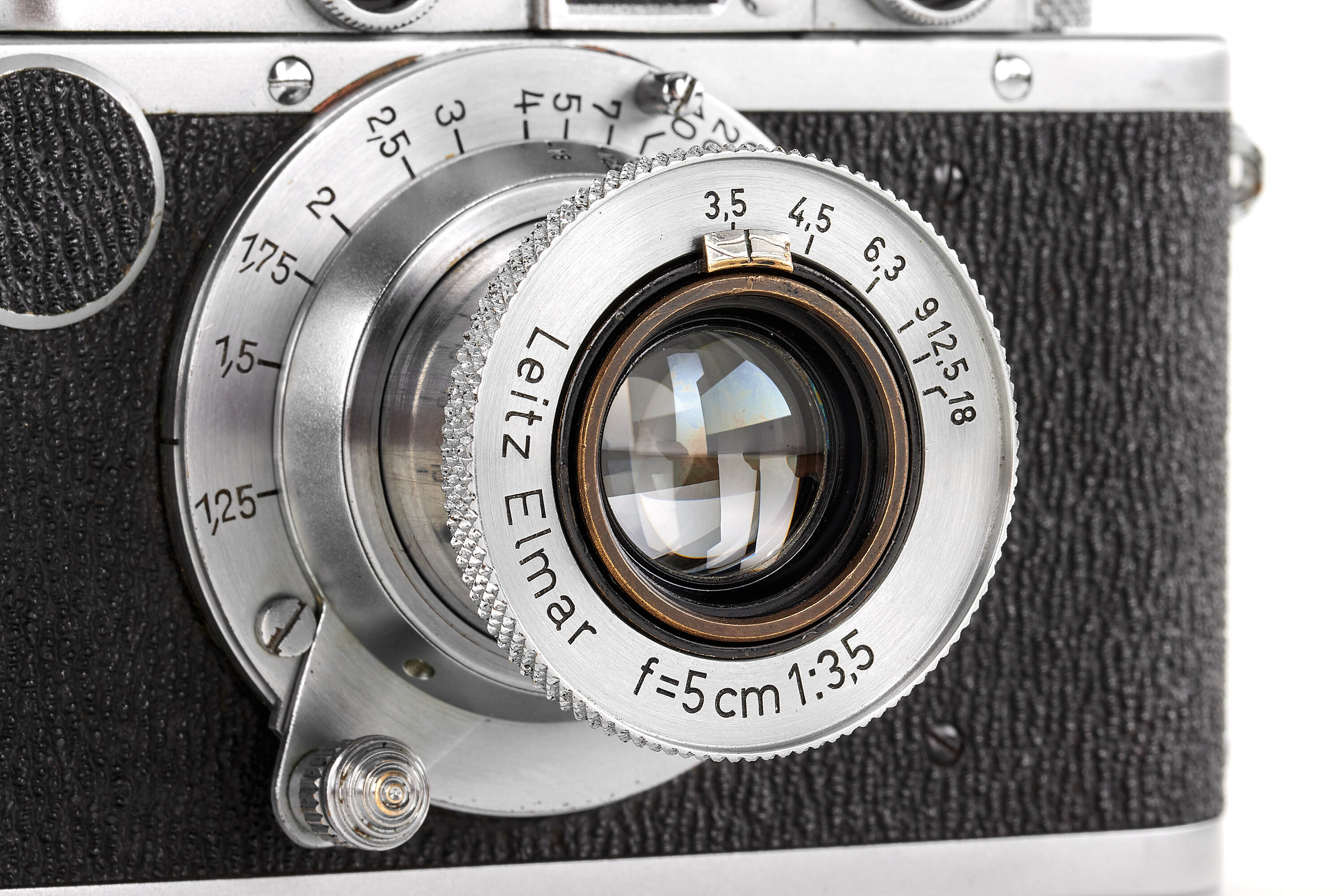 Extremely early Leica IIf, originally a Leica I Mod. A with Anastigmat lens delivered on 20.02.1925, in very good condition. After some repair at Leitz in 1949, 1951 and 1954, the camera was upgraded to IIf specifications (black dial) without slow speed, but keeping the original serial number. Most interesting is that the lens is, most probably, still the very rare original 5-elements Anastigmat lens, here mounted in an unnumbered chrome Elmar housing (front ring engraved Elmar), note the early aperture progression, the 'Germany engraving and the original nickel aperture tab.