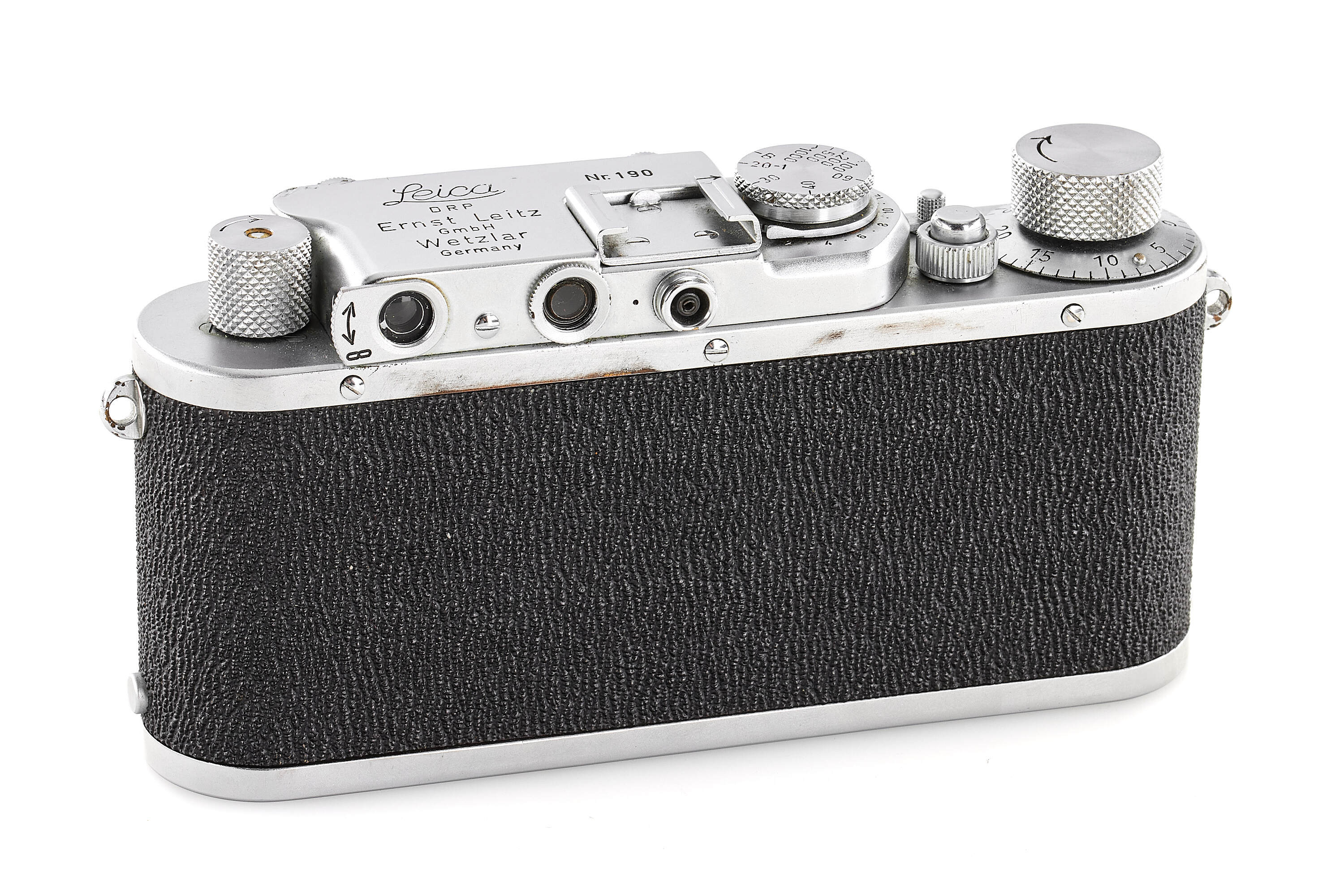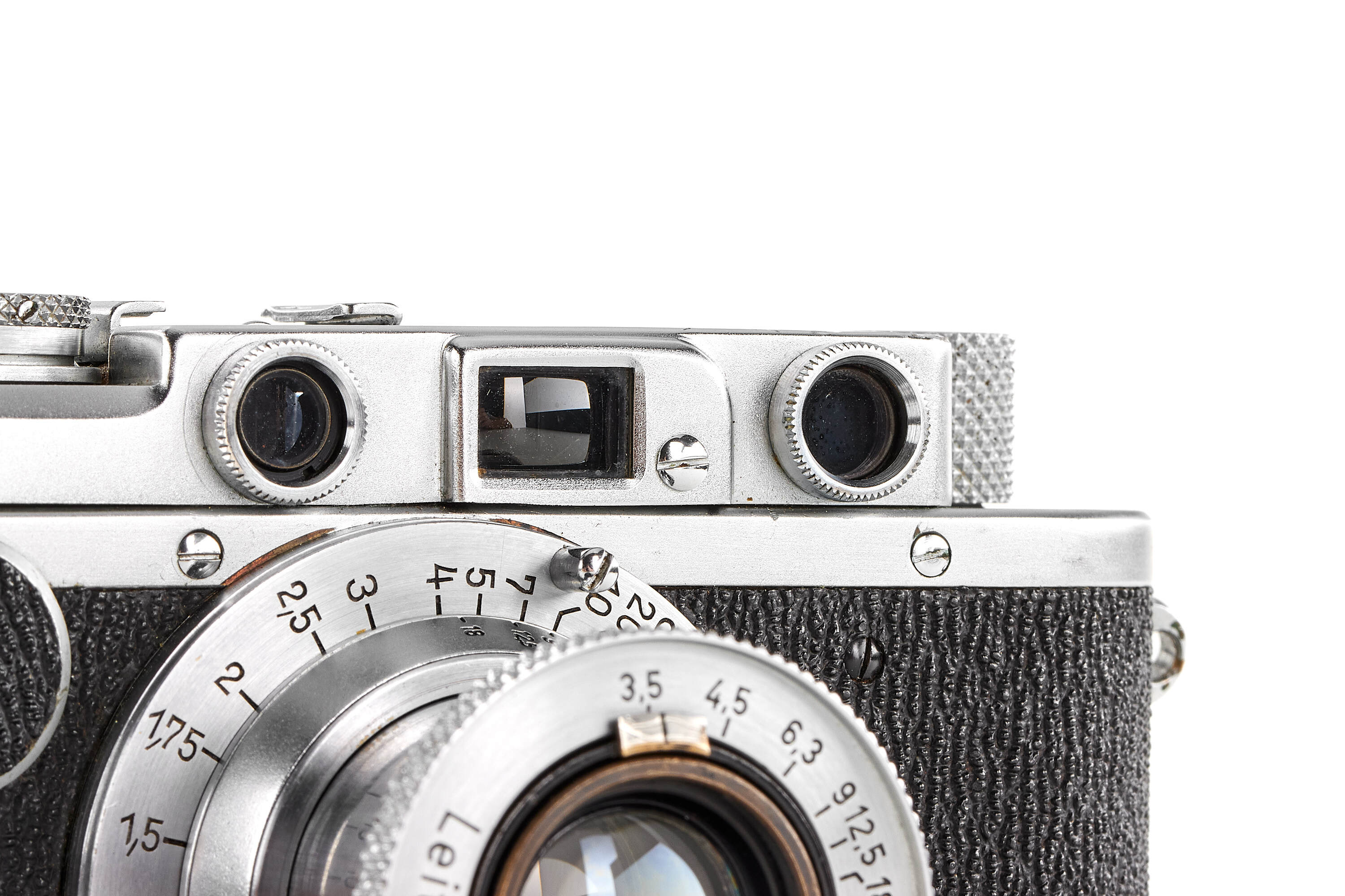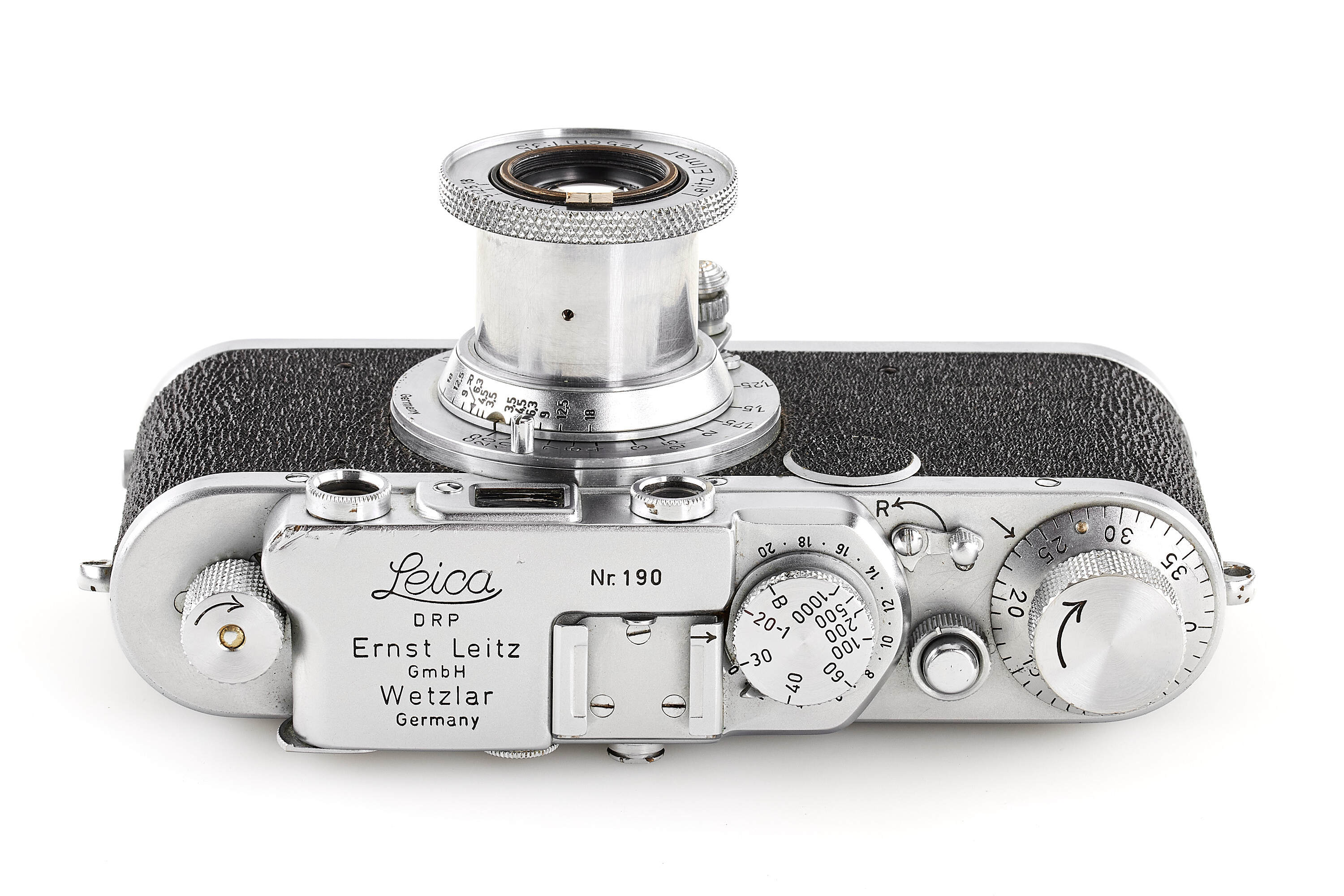 Extremely early Leica IIf, originally a Leica I Mod. A with Anastigmat lens delivered on 20.02.1925, in very good condition. After some repair at Leitz in 1949, 1951 and 1954, the camera was upgraded to IIf specifications (black dial) without slow speed, but keeping the original serial number. Most interesting is that the lens is, most probably, still the very rare original 5-elements Anastigmat lens, here mounted in an unnumbered chrome Elmar housing (front ring engraved Elmar), note the early aperture progression, the 'Germany engraving and the original nickel aperture tab.