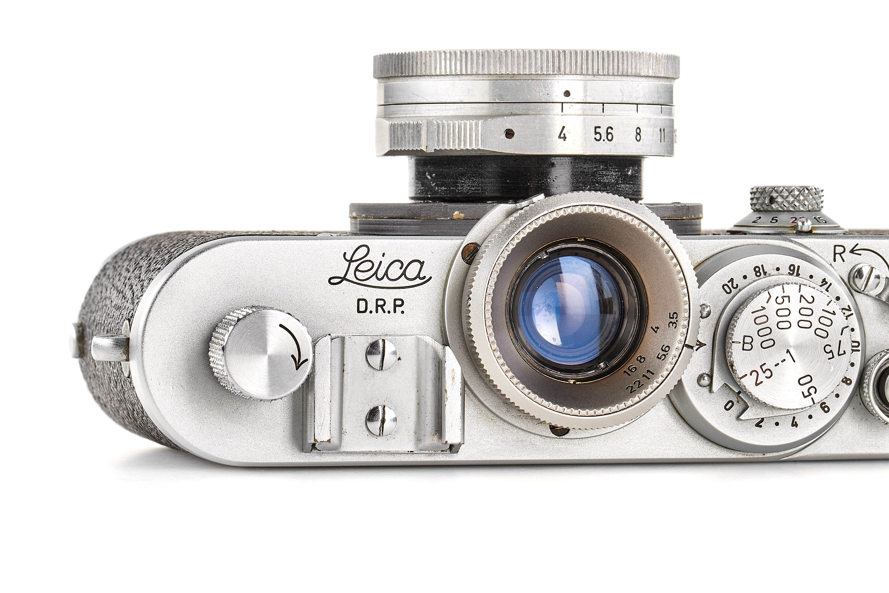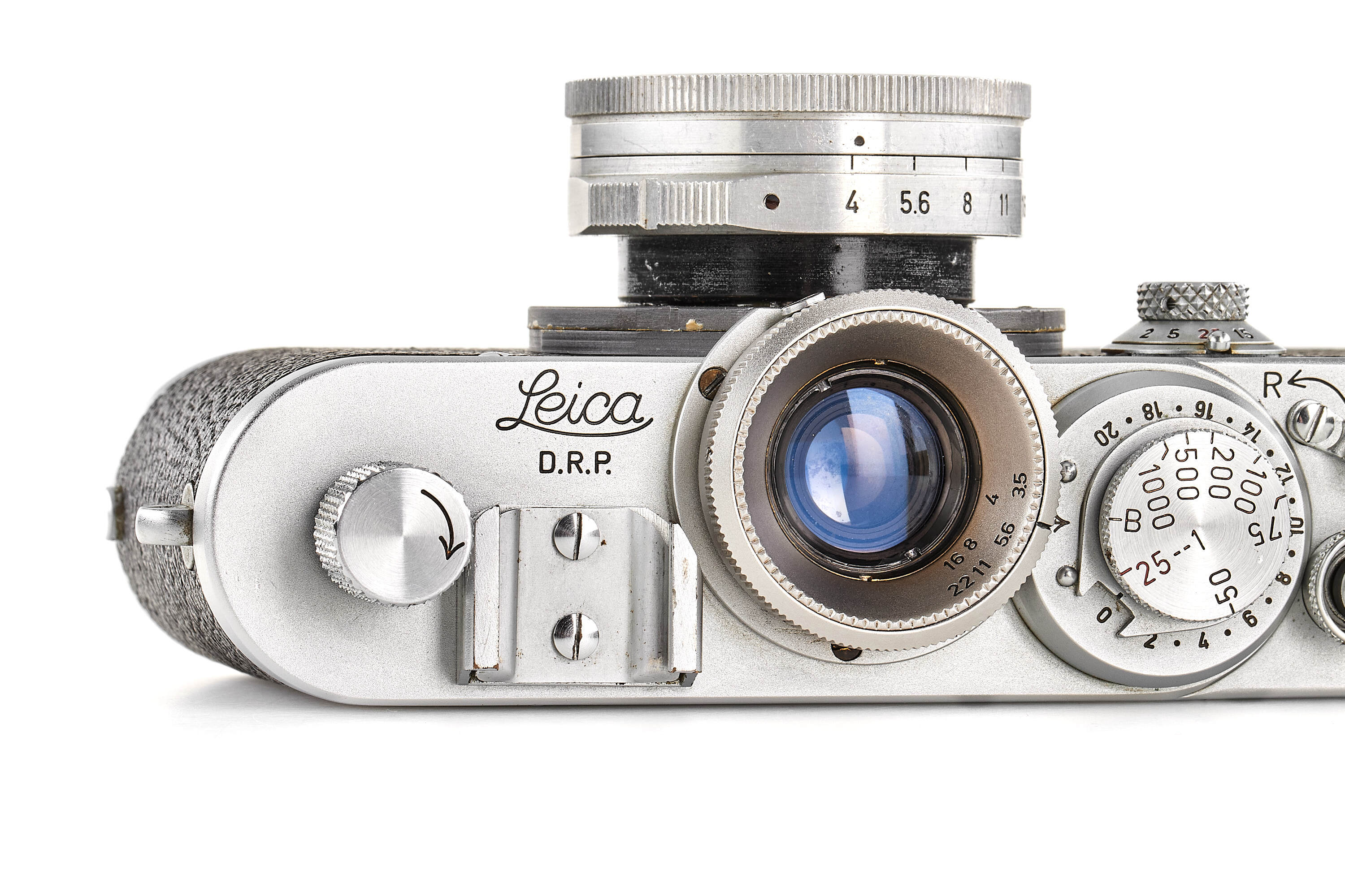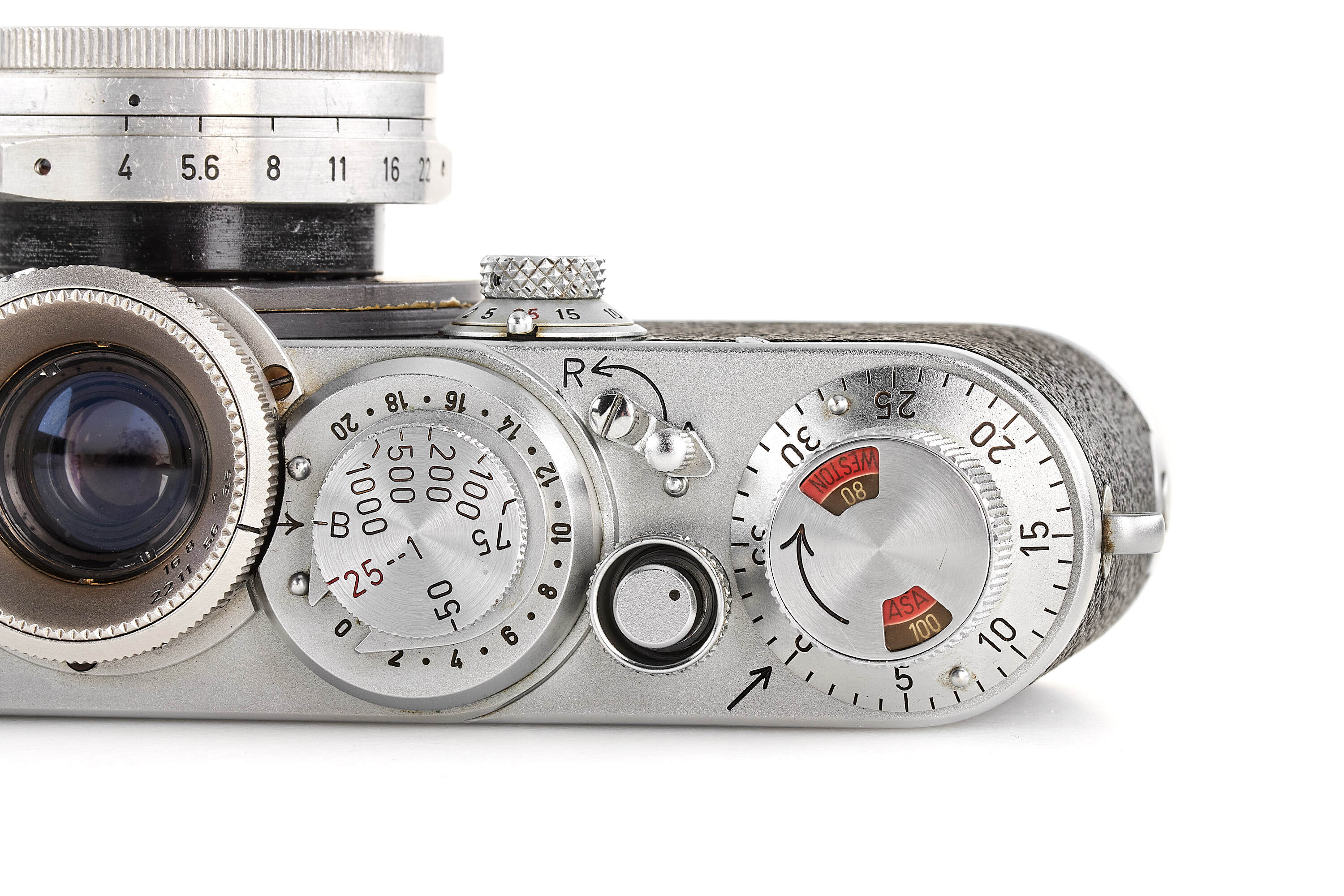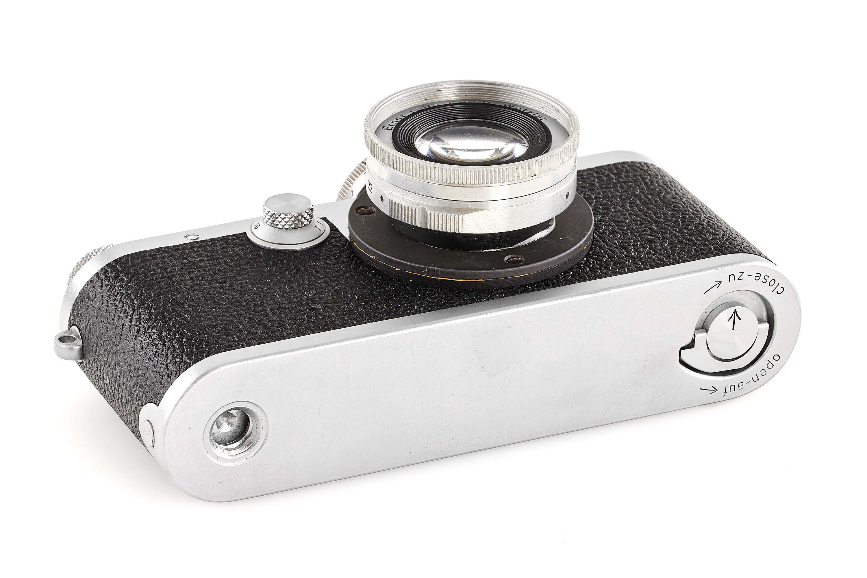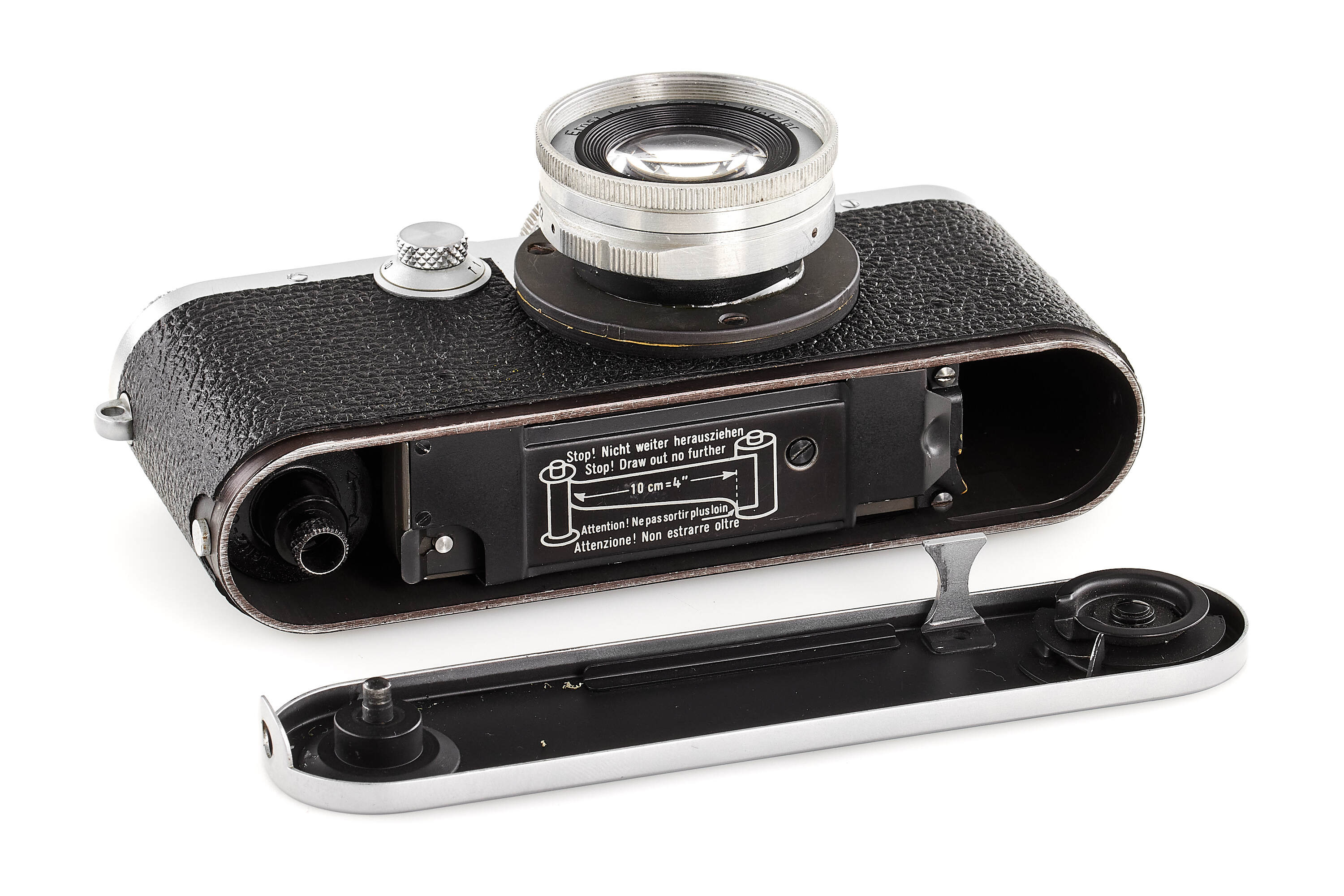 This extraordinary prototype Leica camera, based on the Leica If, was designed for discreet, undercover photography—most likely developed for the West German secret service during the Cold War era. Ingeniously modified, the camera features an imitation Elmar 9cm lens mounted on the front, while the actual functioning lens is cleverly concealed on the top plate, pointing upward. This innovative design allowed the photographer to simulate conventional shooting, while secretly capturing images either straight ahead or to the side, depending on how the camera was held. A precisely engineered internal mirror redirects the image to the film plane, enabling covert operation without attracting attention.