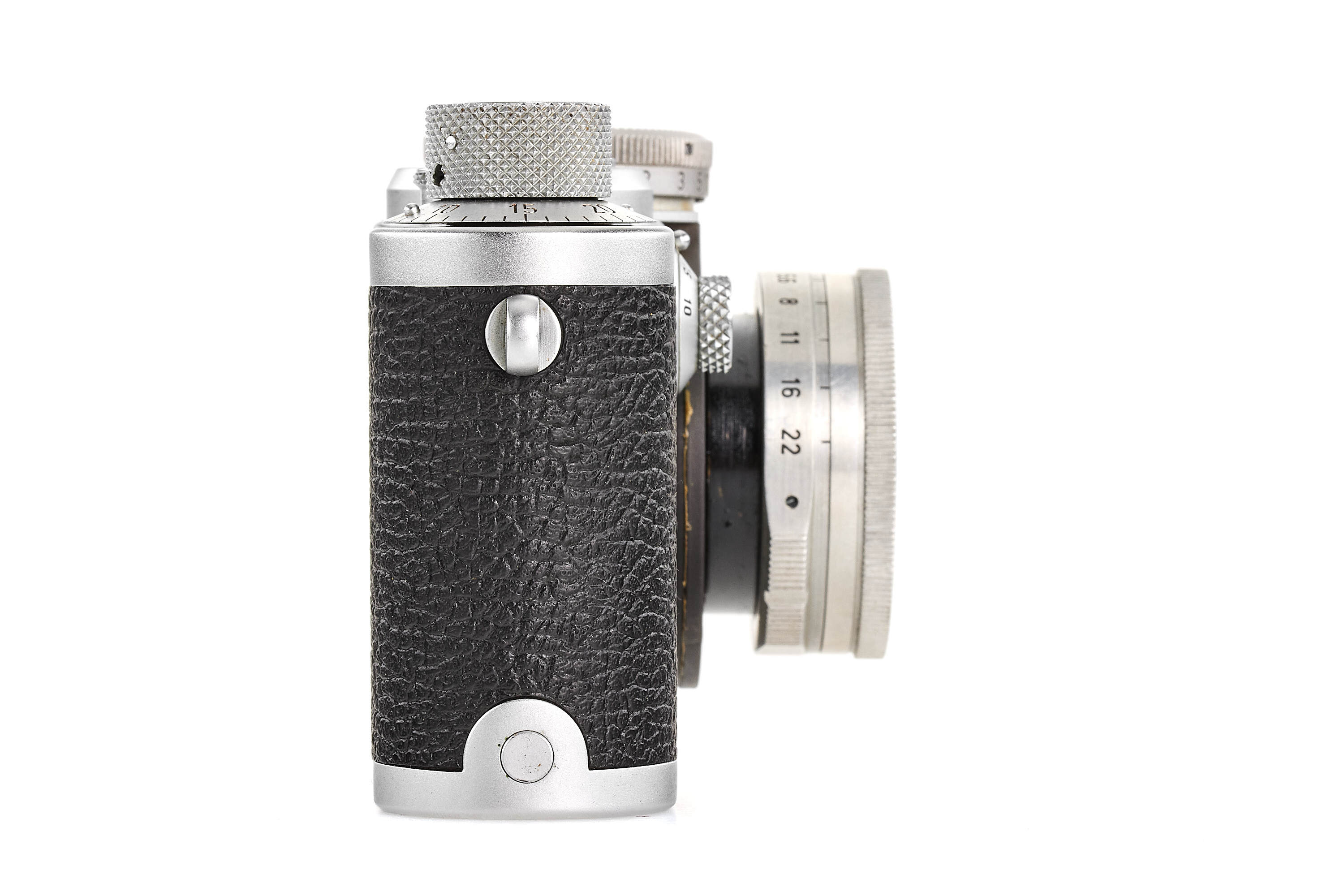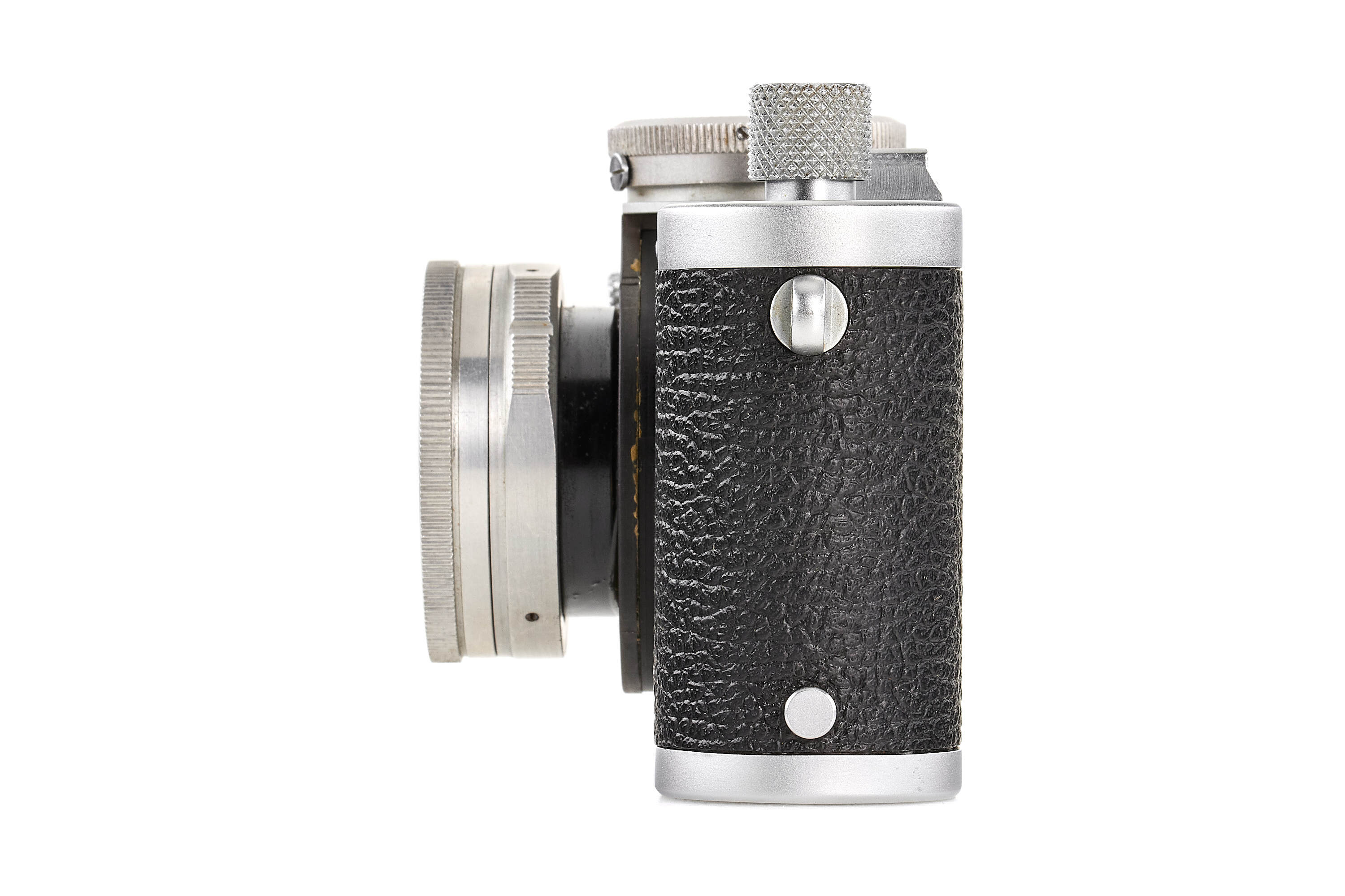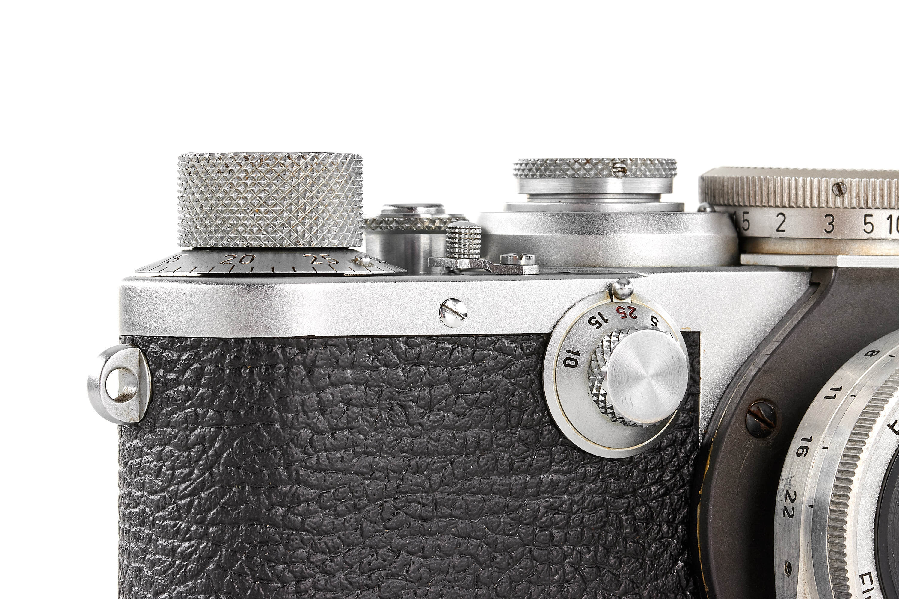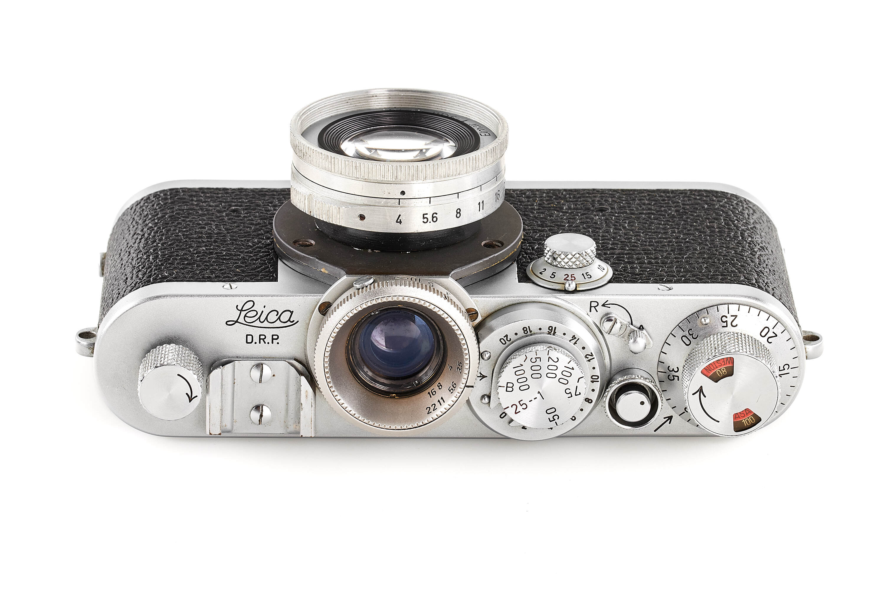 This extraordinary prototype Leica camera, based on the Leica If, was designed for discreet, undercover photography—most likely developed for the West German secret service during the Cold War era. Ingeniously modified, the camera features an imitation Elmar 9cm lens mounted on the front, while the actual functioning lens is cleverly concealed on the top plate, pointing upward. This innovative design allowed the photographer to simulate conventional shooting, while secretly capturing images either straight ahead or to the side, depending on how the camera was held. A precisely engineered internal mirror redirects the image to the film plane, enabling covert operation without attracting attention.