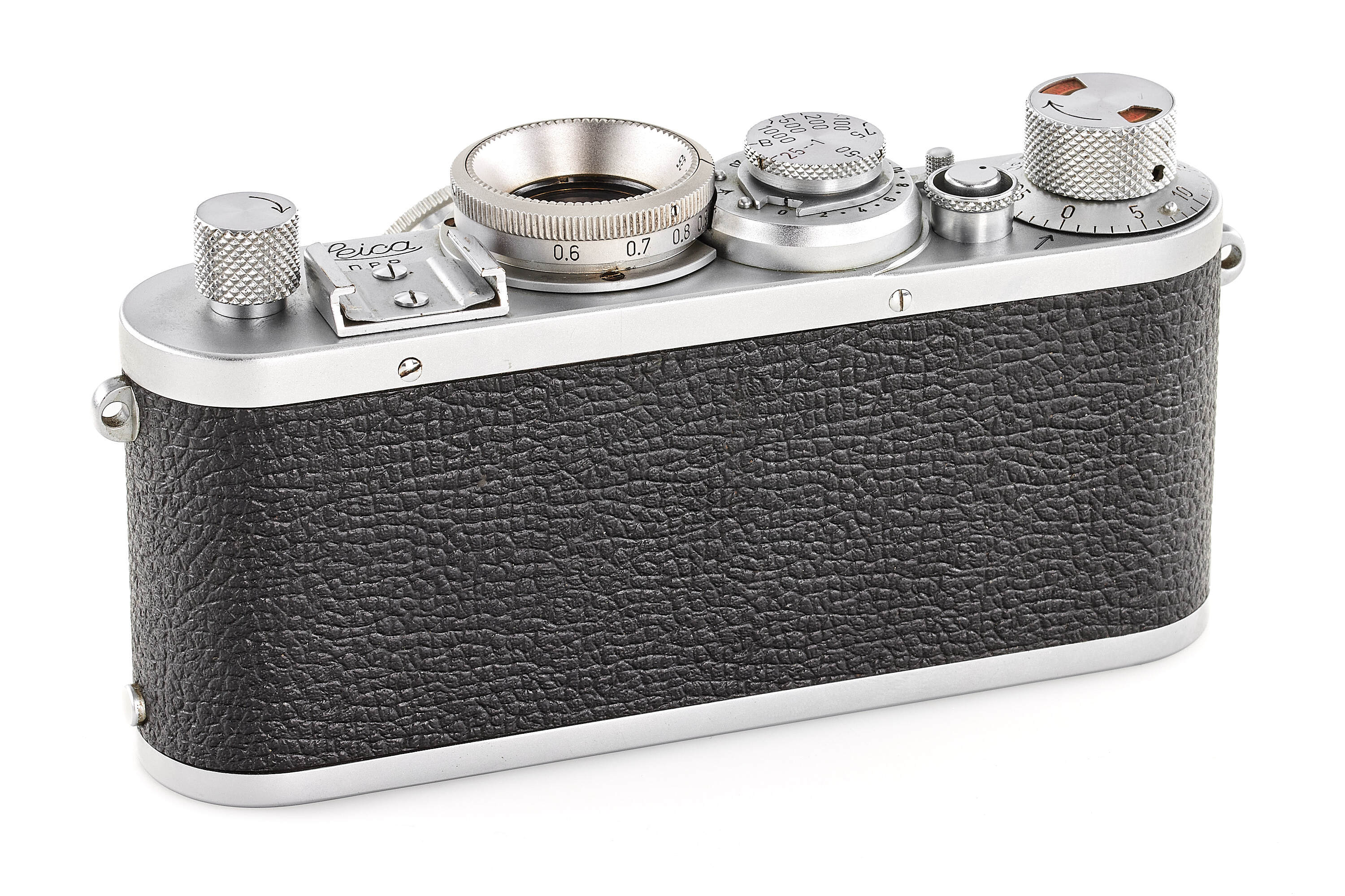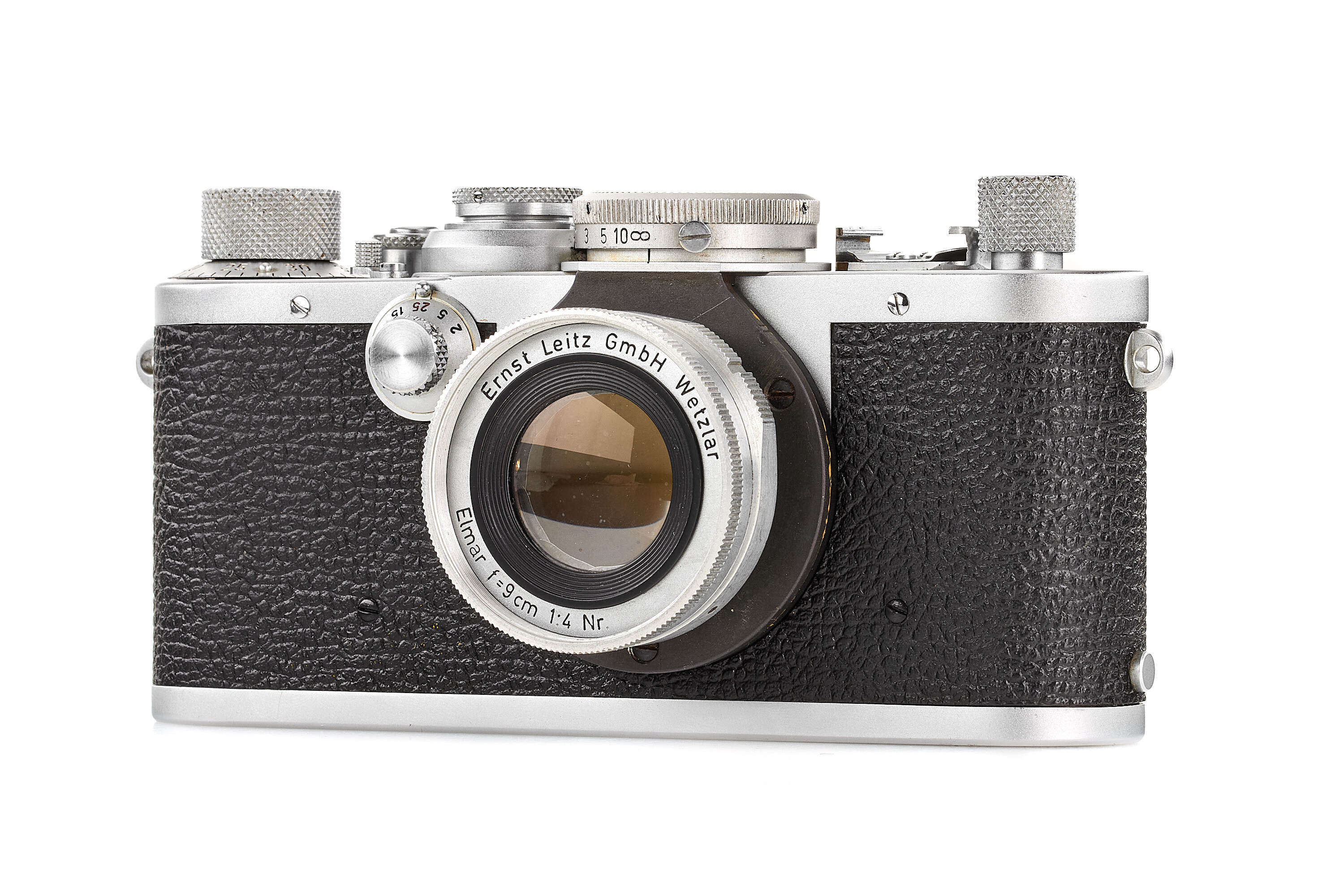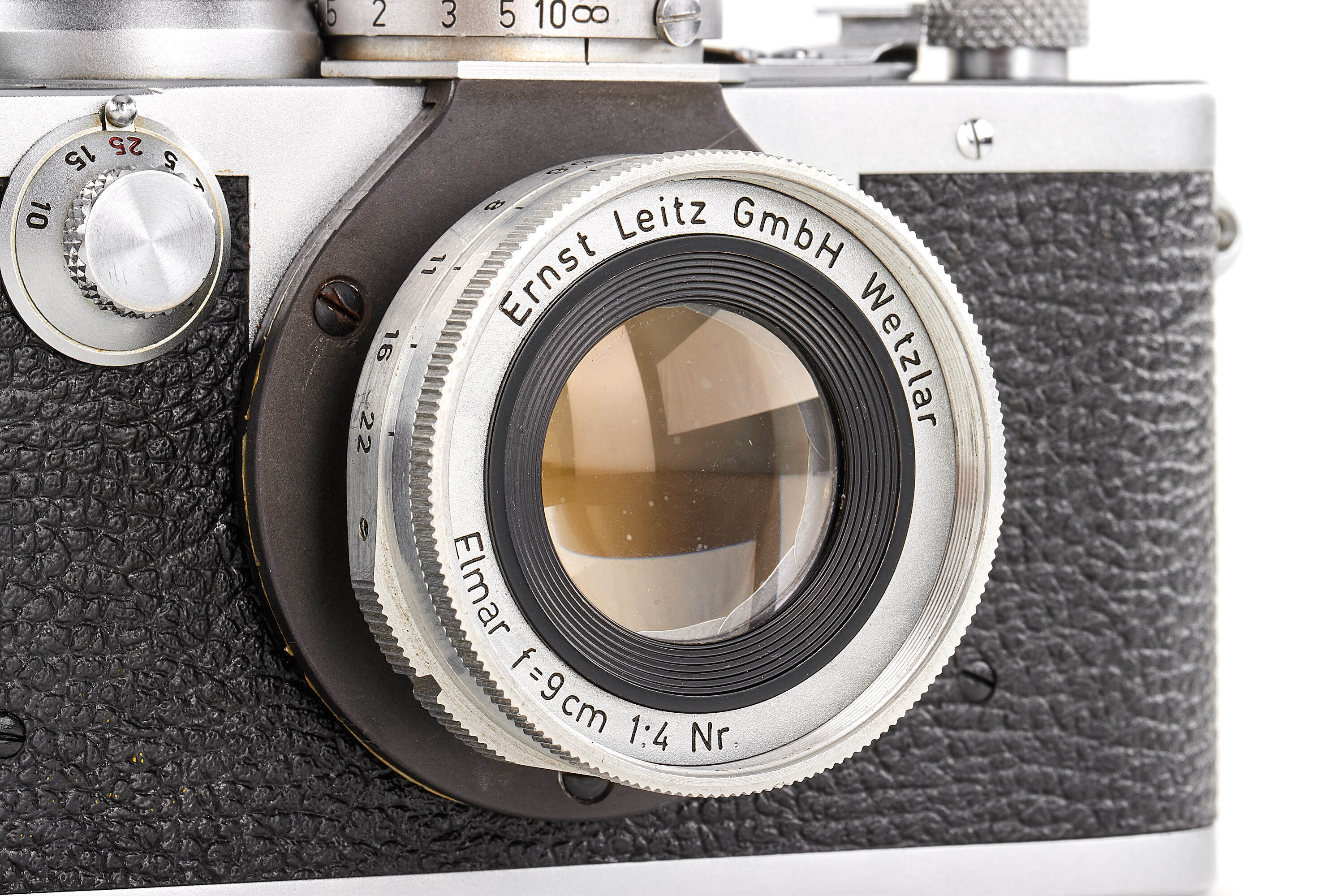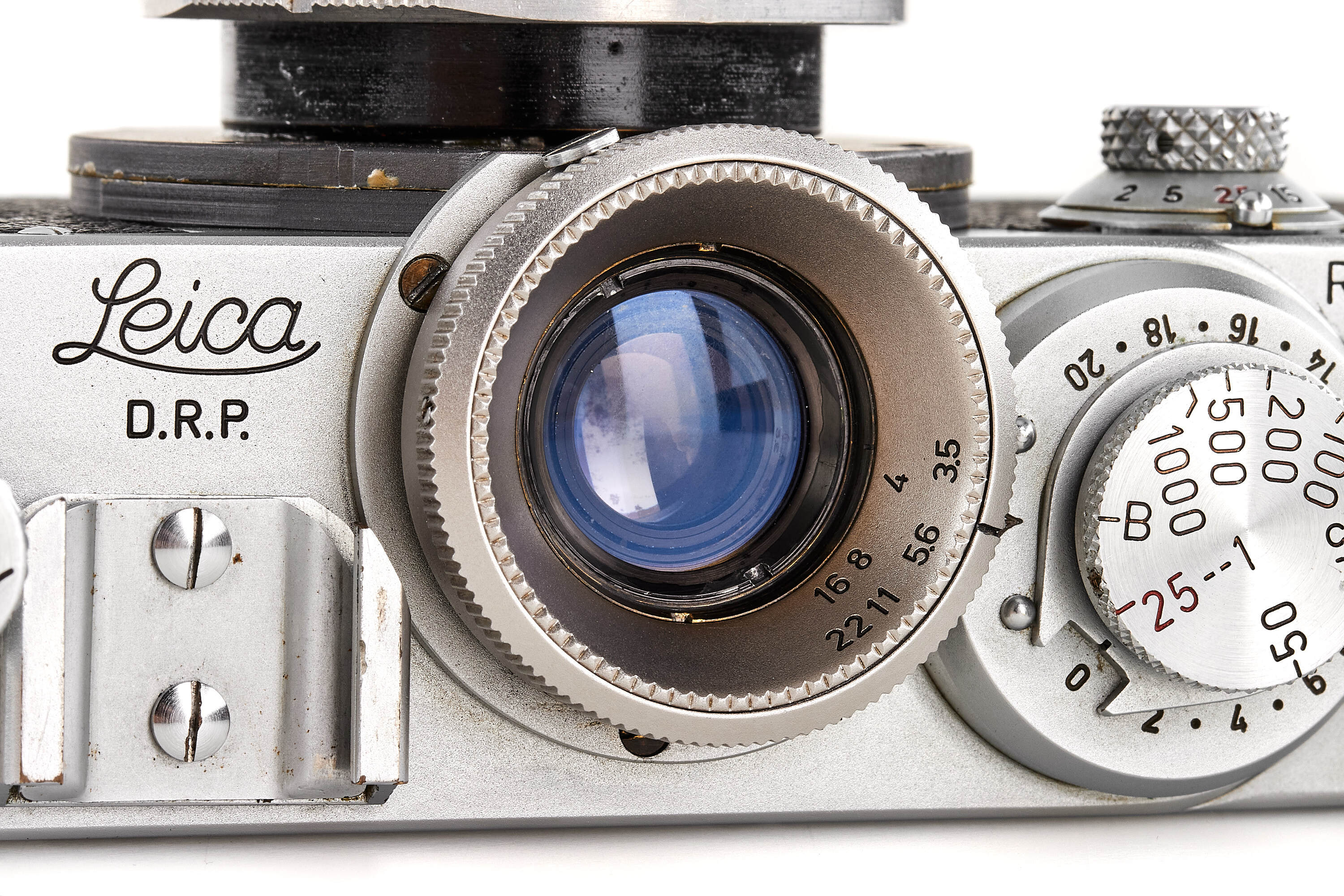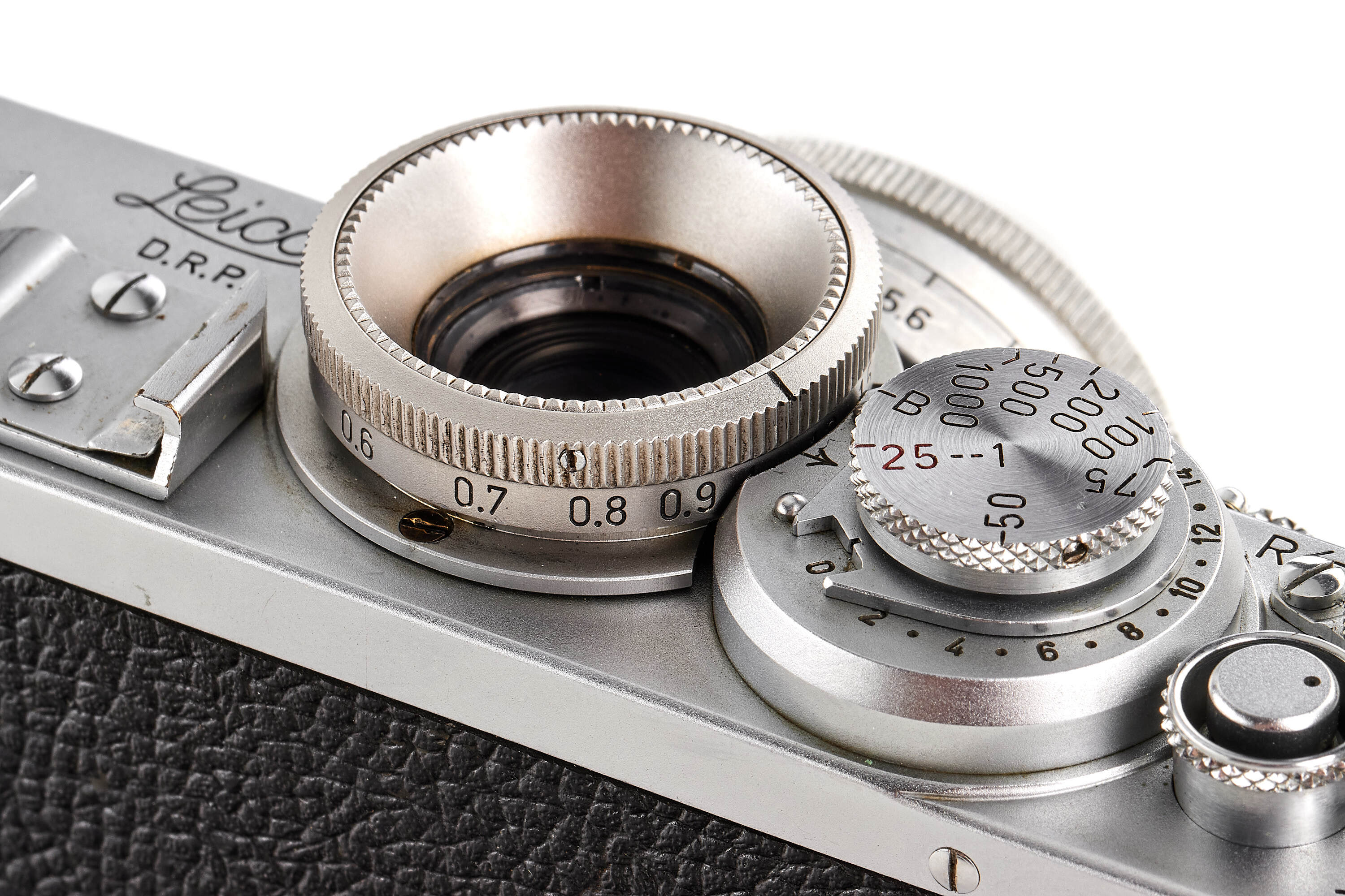 This extraordinary prototype Leica camera, based on the Leica If, was designed for discreet, undercover photography—most likely developed for the West German secret service during the Cold War era. Ingeniously modified, the camera features an imitation Elmar 9cm lens mounted on the front, while the actual functioning lens is cleverly concealed on the top plate, pointing upward. This innovative design allowed the photographer to simulate conventional shooting, while secretly capturing images either straight ahead or to the side, depending on how the camera was held. A precisely engineered internal mirror redirects the image to the film plane, enabling covert operation without attracting attention.