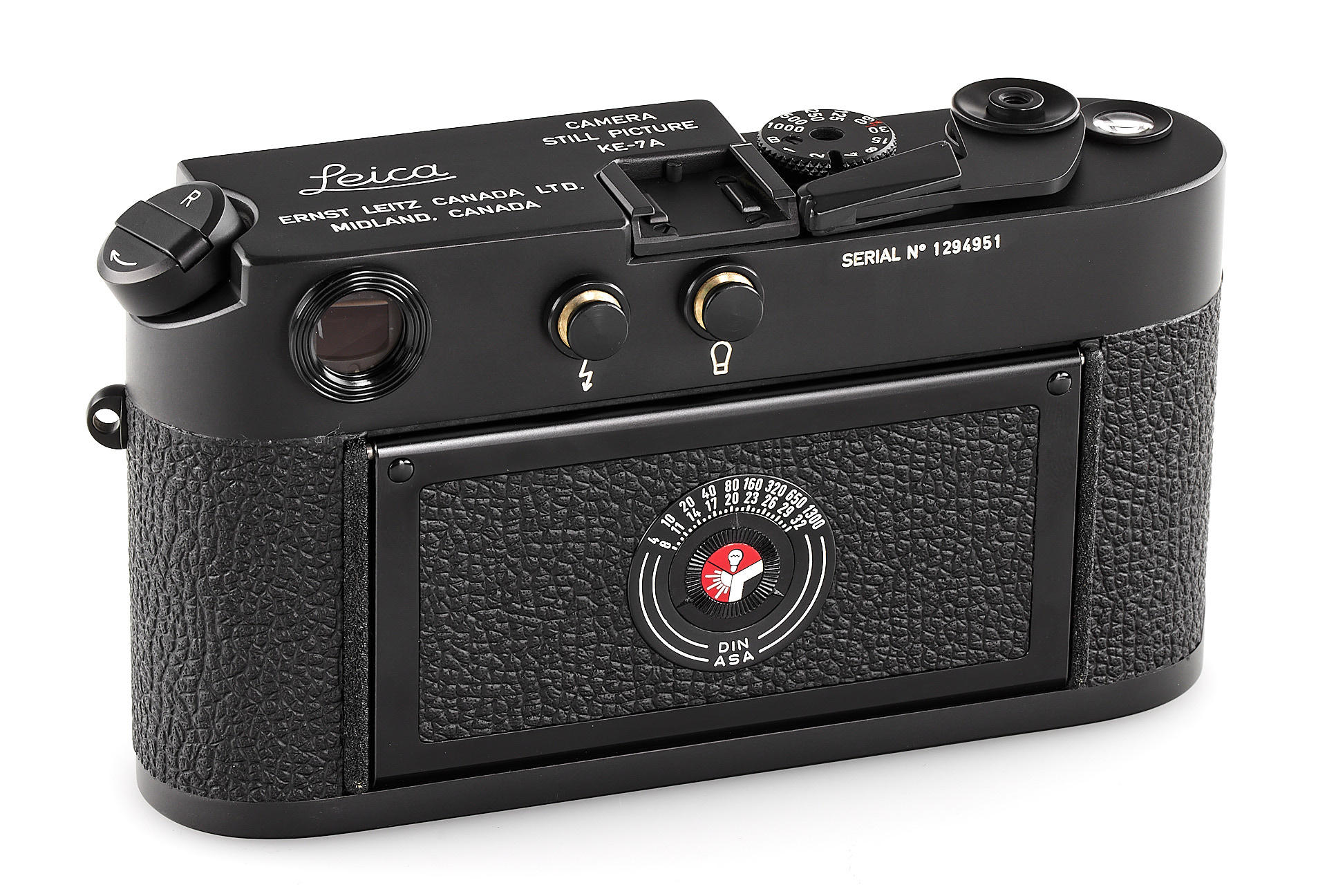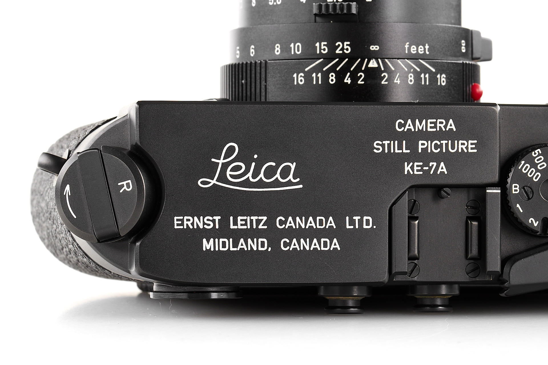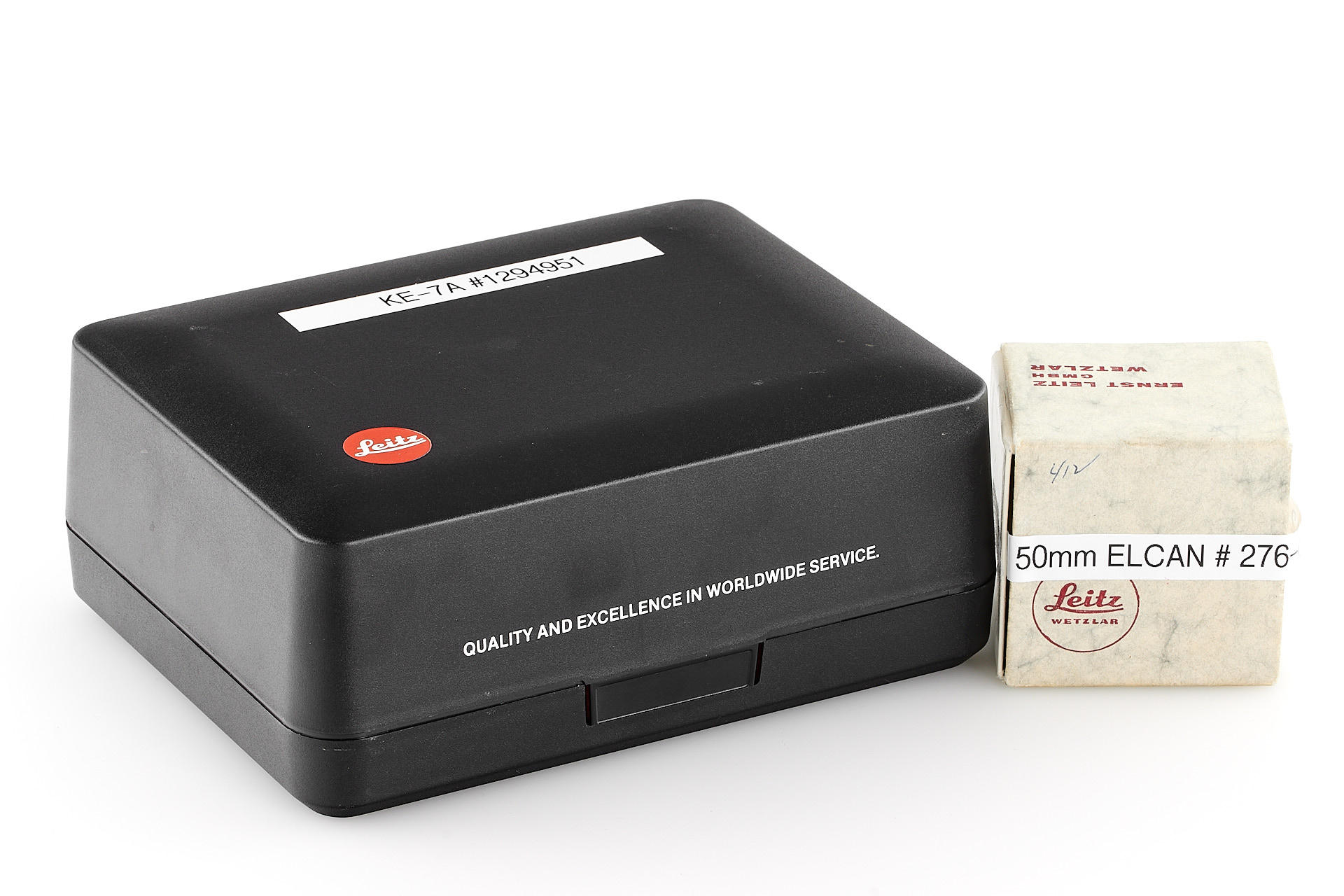 Very rare civilian KE-7A in mint condition and working order, with body cap and presentation box, Elcan 2/50mm no.276-0412 with both caps. In 1972, a special version of a black chrome Leica M4 made in Canada was supplied to the U.S. Military. It was equipped with a four-element 50 mm Elcan f/2, exclusively designed for this camera. The name of this unique military camera outfit was KE-7A. About 440 units were supplied to the military, approximately 60 units representing a production overrun were sold on the civilian market. Those so-called civilian KE-7As are lacking the military markings and are now one of the rarest M cameras.