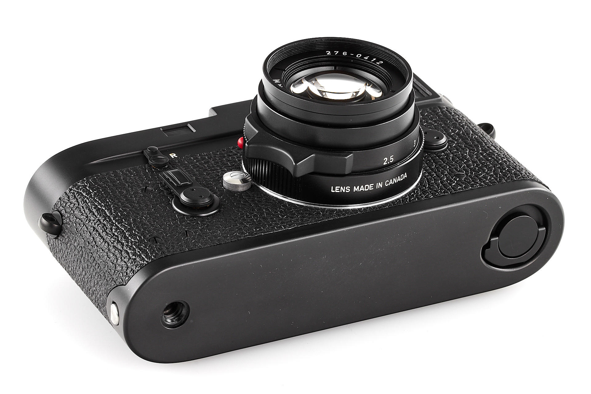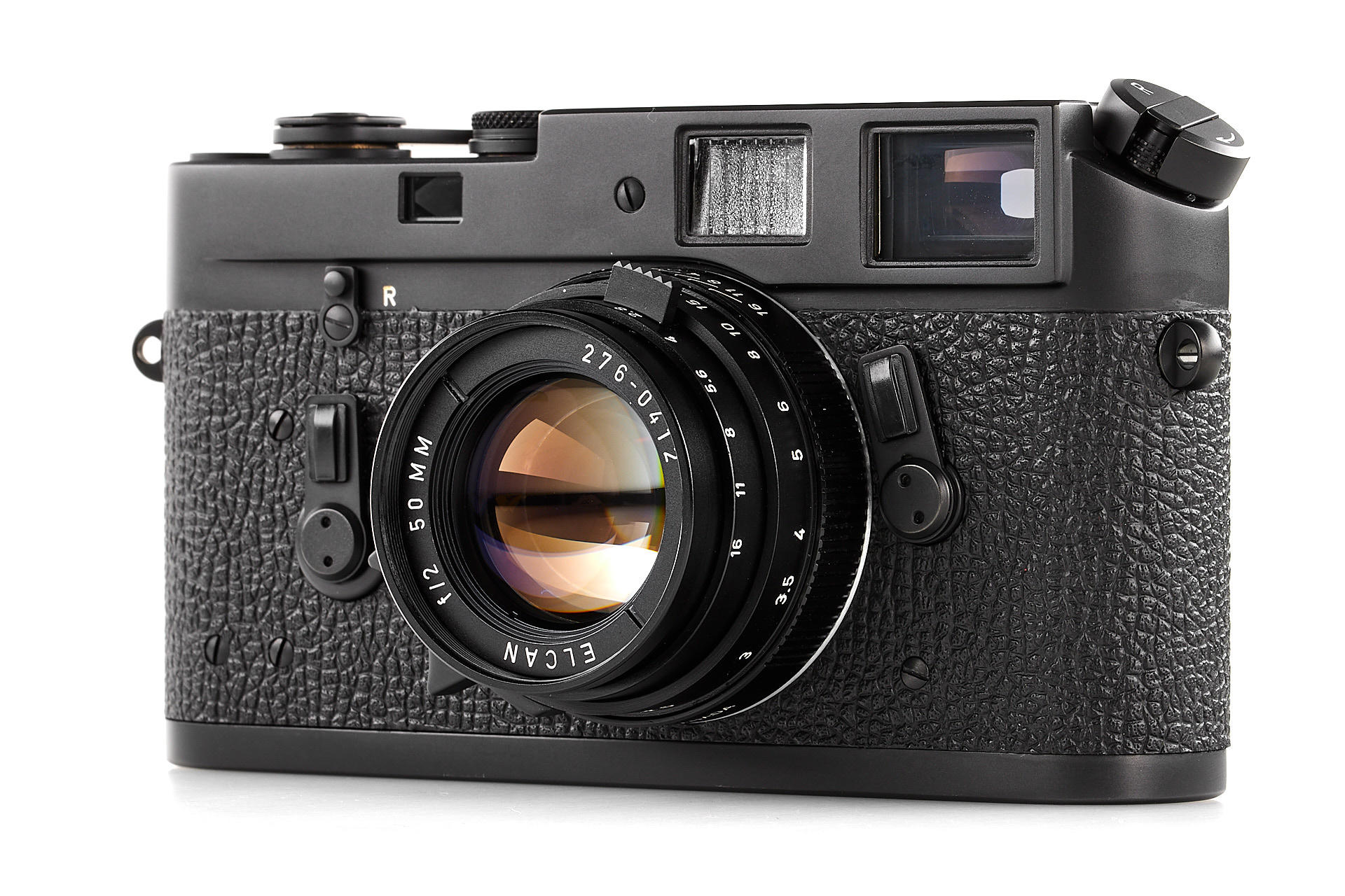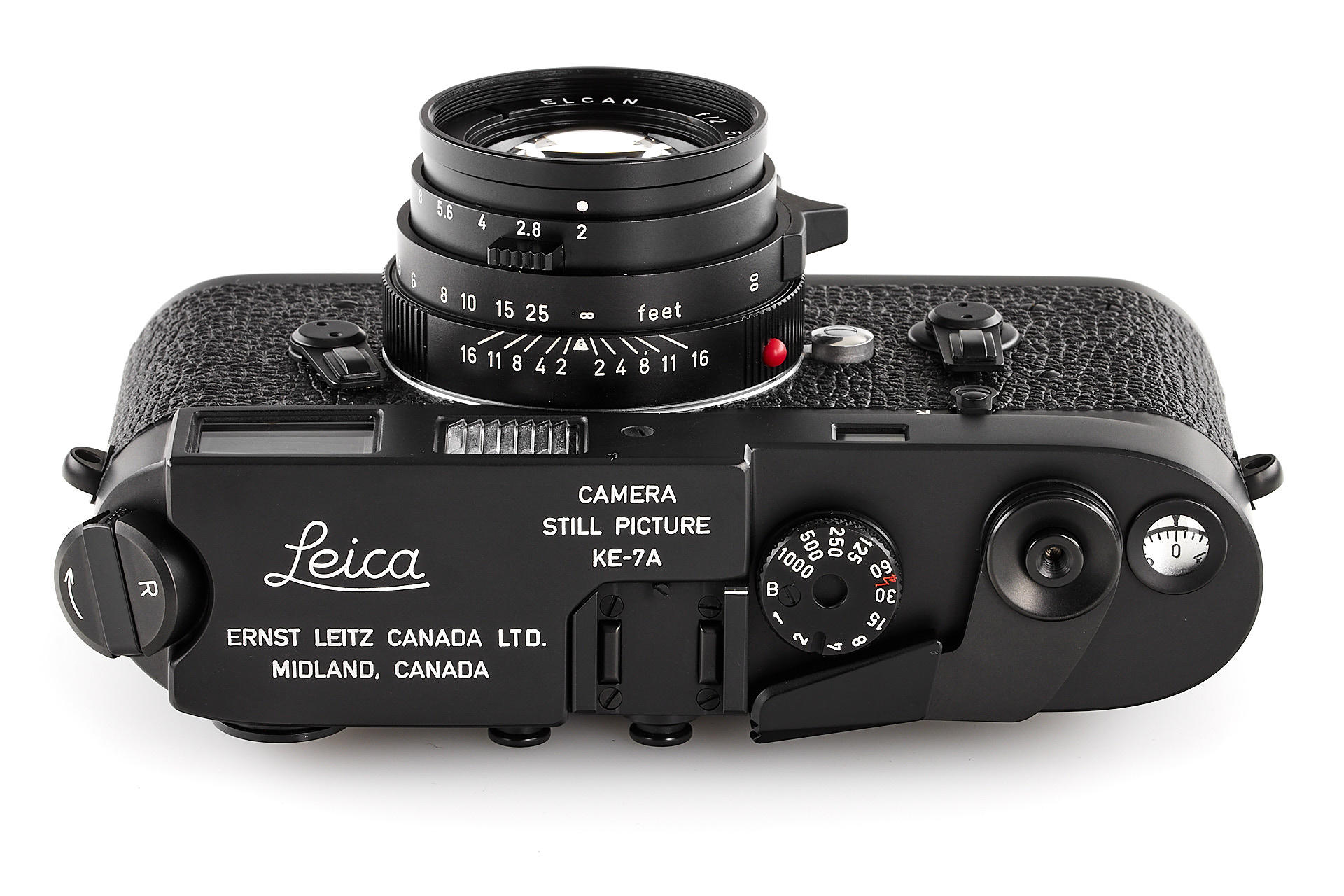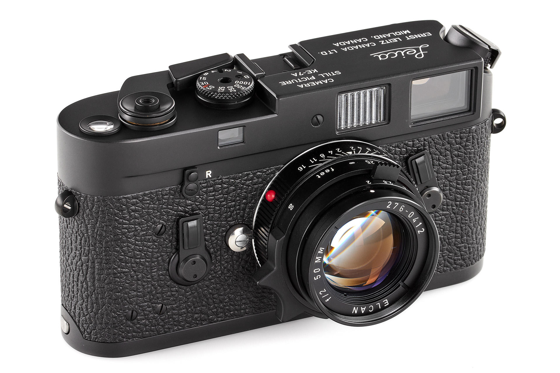 Very rare civilian KE-7A in mint condition and working order, with body cap and presentation box, Elcan 2/50mm no.276-0412 with both caps. In 1972, a special version of a black chrome Leica M4 made in Canada was supplied to the U.S. Military. It was equipped with a four-element 50 mm Elcan f/2, exclusively designed for this camera. The name of this unique military camera outfit was KE-7A. About 440 units were supplied to the military, approximately 60 units representing a production overrun were sold on the civilian market. Those so-called civilian KE-7As are lacking the military markings and are now one of the rarest M cameras.