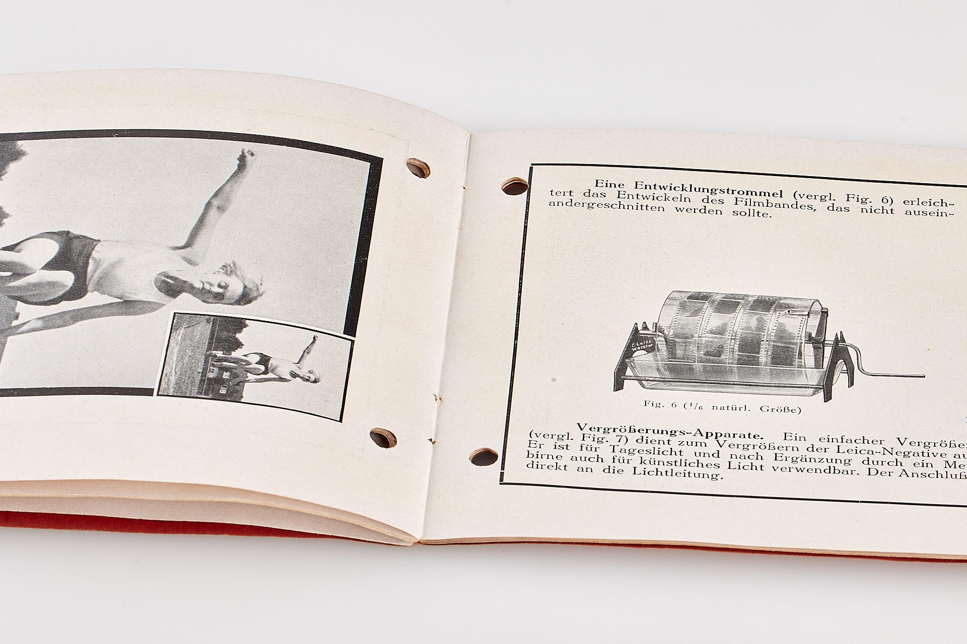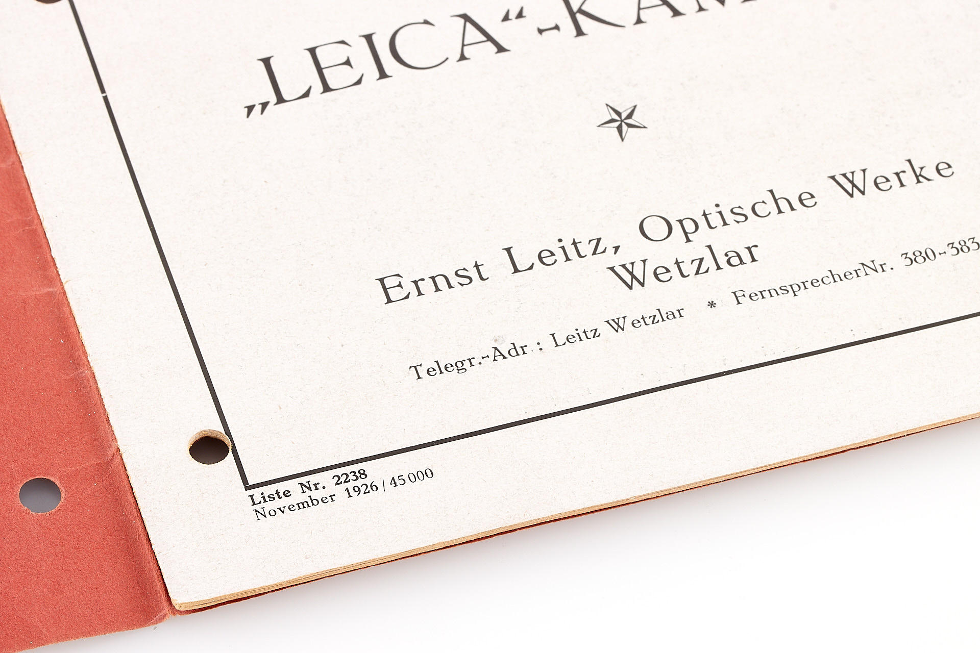 very early and rare German brochure and price list no.2238 for the 'Leica'-Kamera (later officially named Leica I Mod. A), Leica I Mod. B "Compur" and accessories, printed in november 1926, 20 pages 12 x 17cm with gold printing red cover, in very good condition