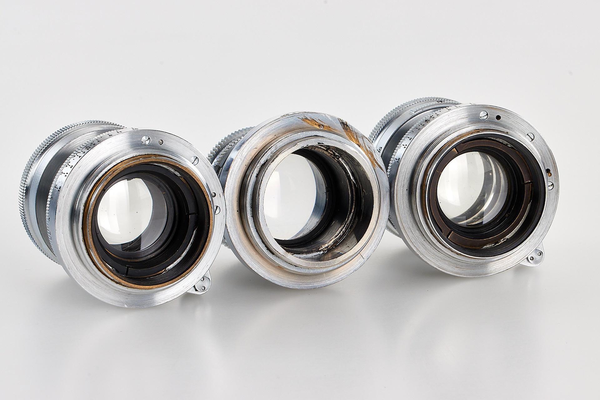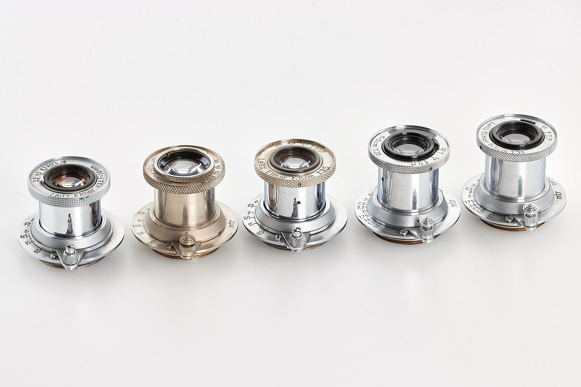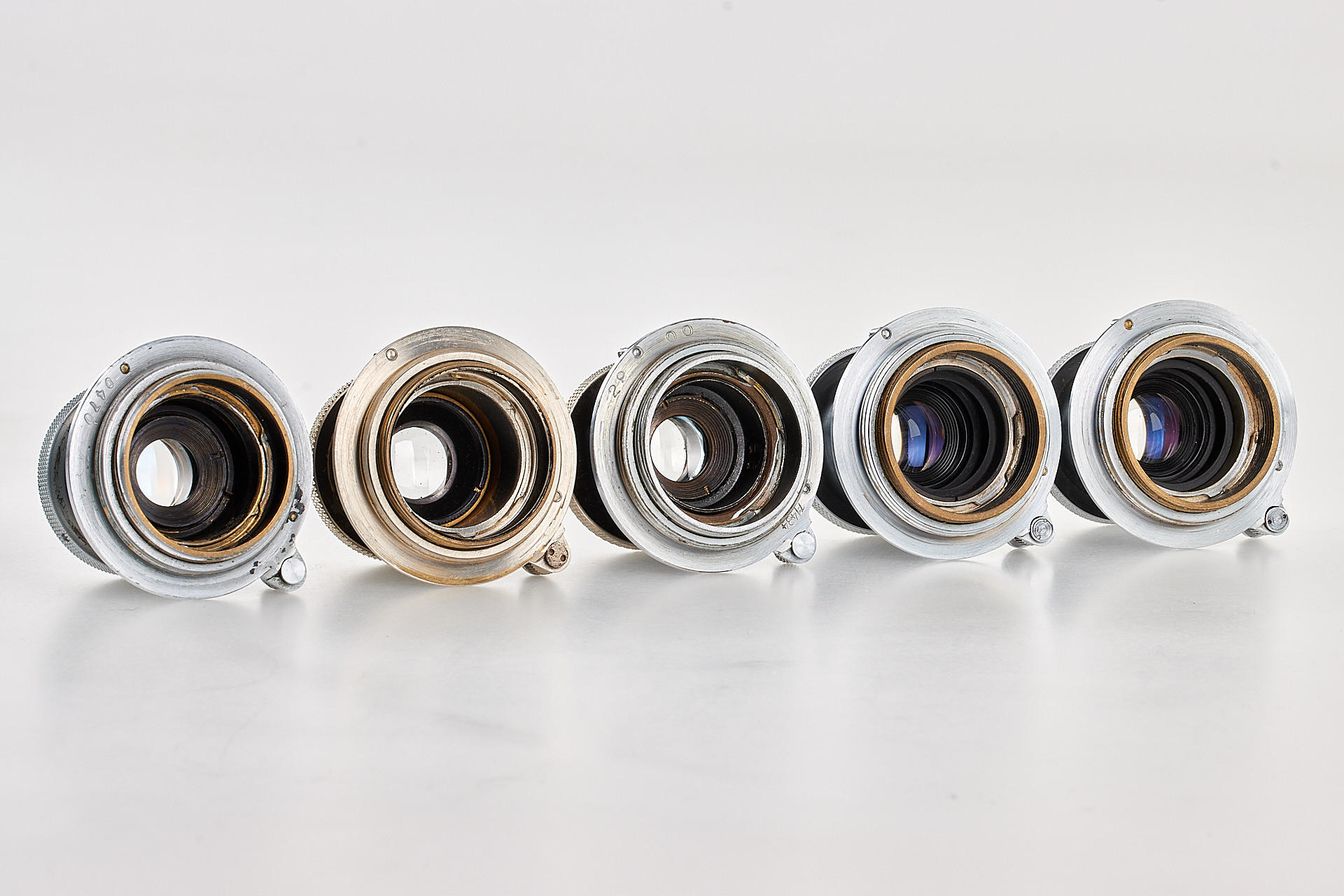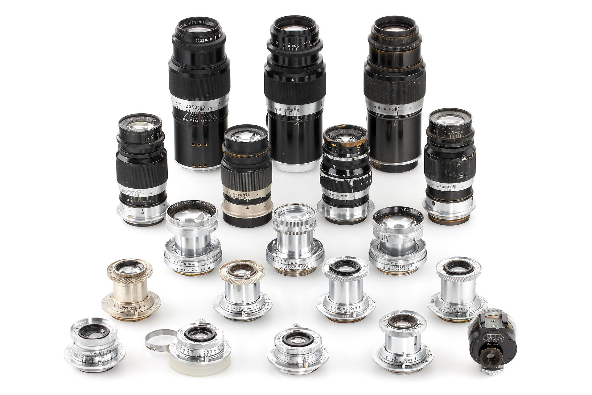 Very interesting collection of 19 fake Leica M39 lenses, ex Leica factory inventory, some very well made, composed of 2x Elmar 3.5/3.5cm, 1x Summaron 3.5/3.5cm, 5x Elmar 3.5/3.5 cm, 1x Summar 2/5cm, 2x Summitar 2/5cm, 4x Elmar 4/9cm, 3x Hektor 4.5/13.5cm and 1x finder VIOOH