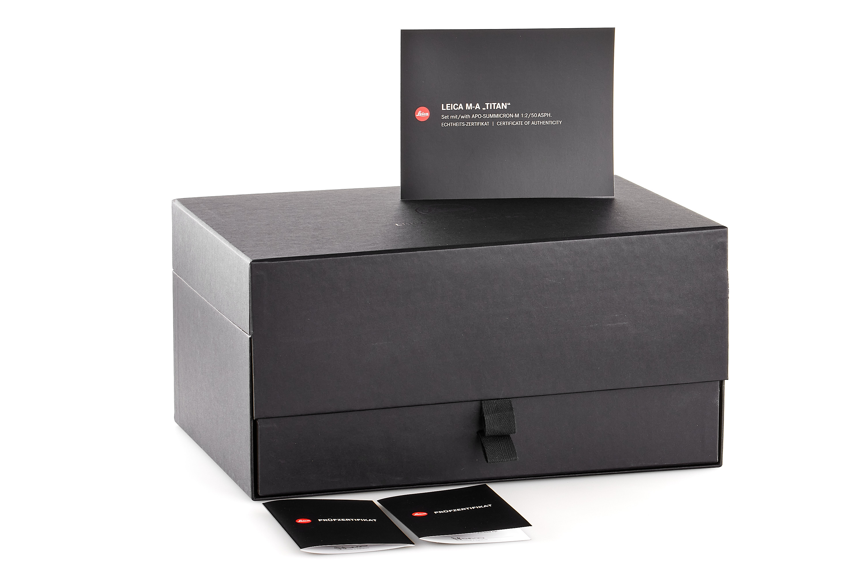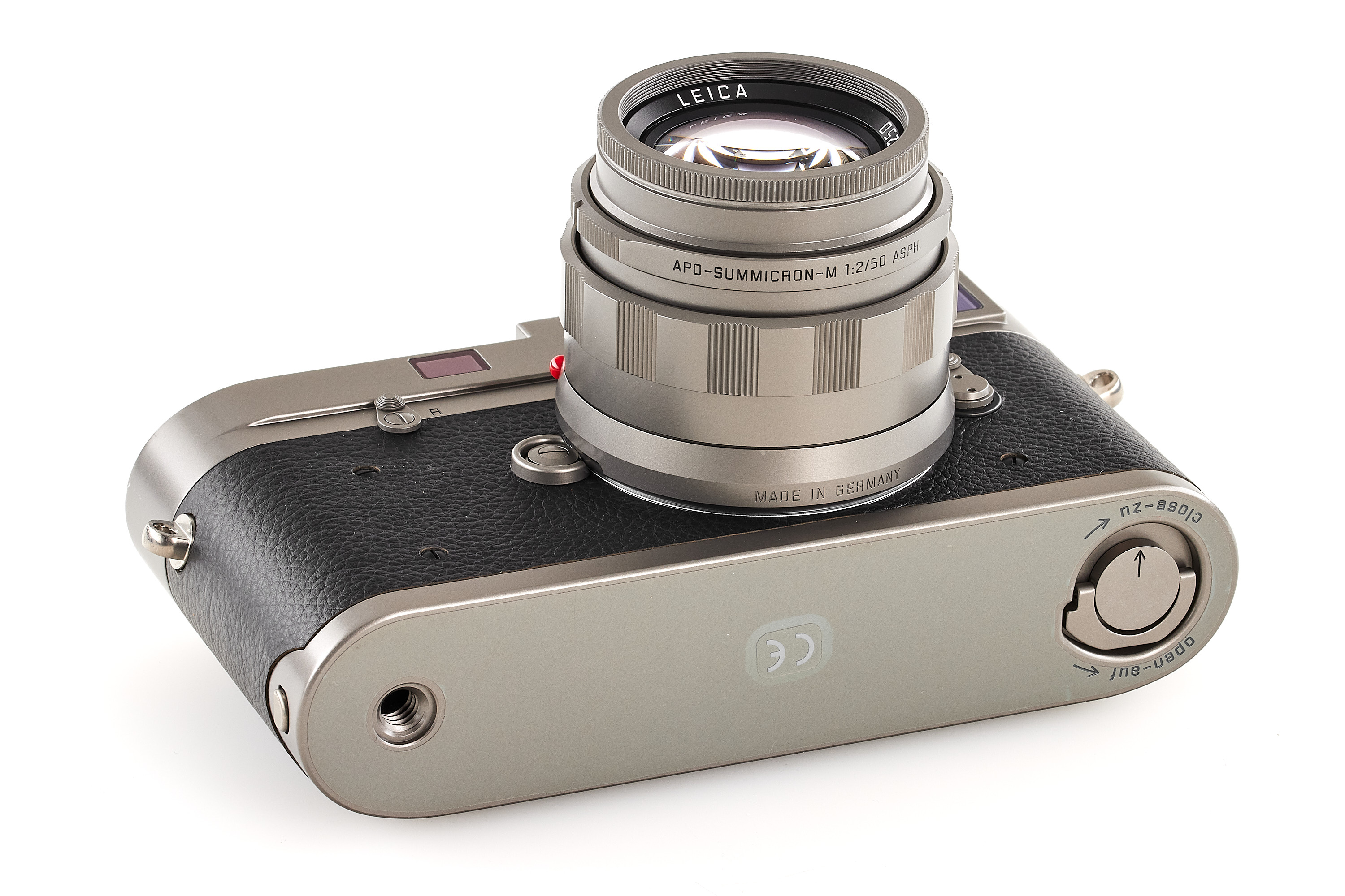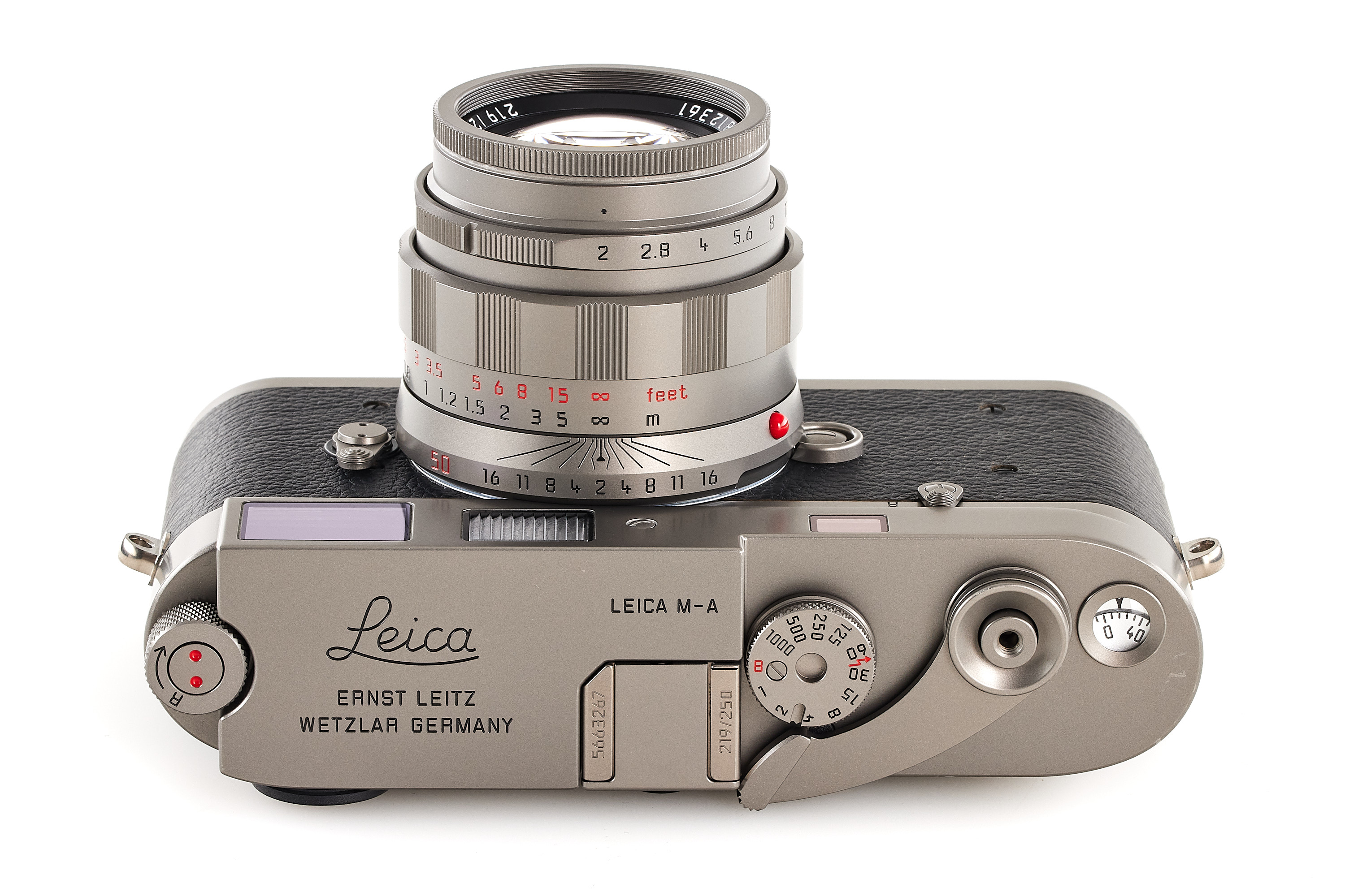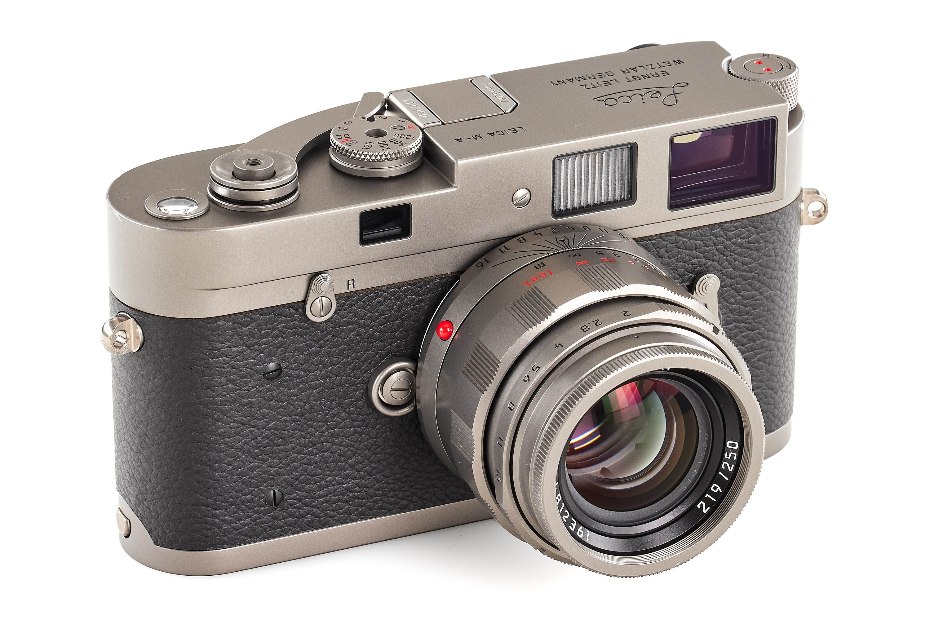 Beautiful special edition set limited to 250 pieces, incl. body Leica M-A in Titanium finish, with serial number no.5663267 and special number 219/250, with special Titanium Apo-Summicon-M Asph. 2/50mm no.4812361 (also engraved 219/250), in mint condition, only few light marks on the top plate complete with all accessories, papers and maker's boxes.