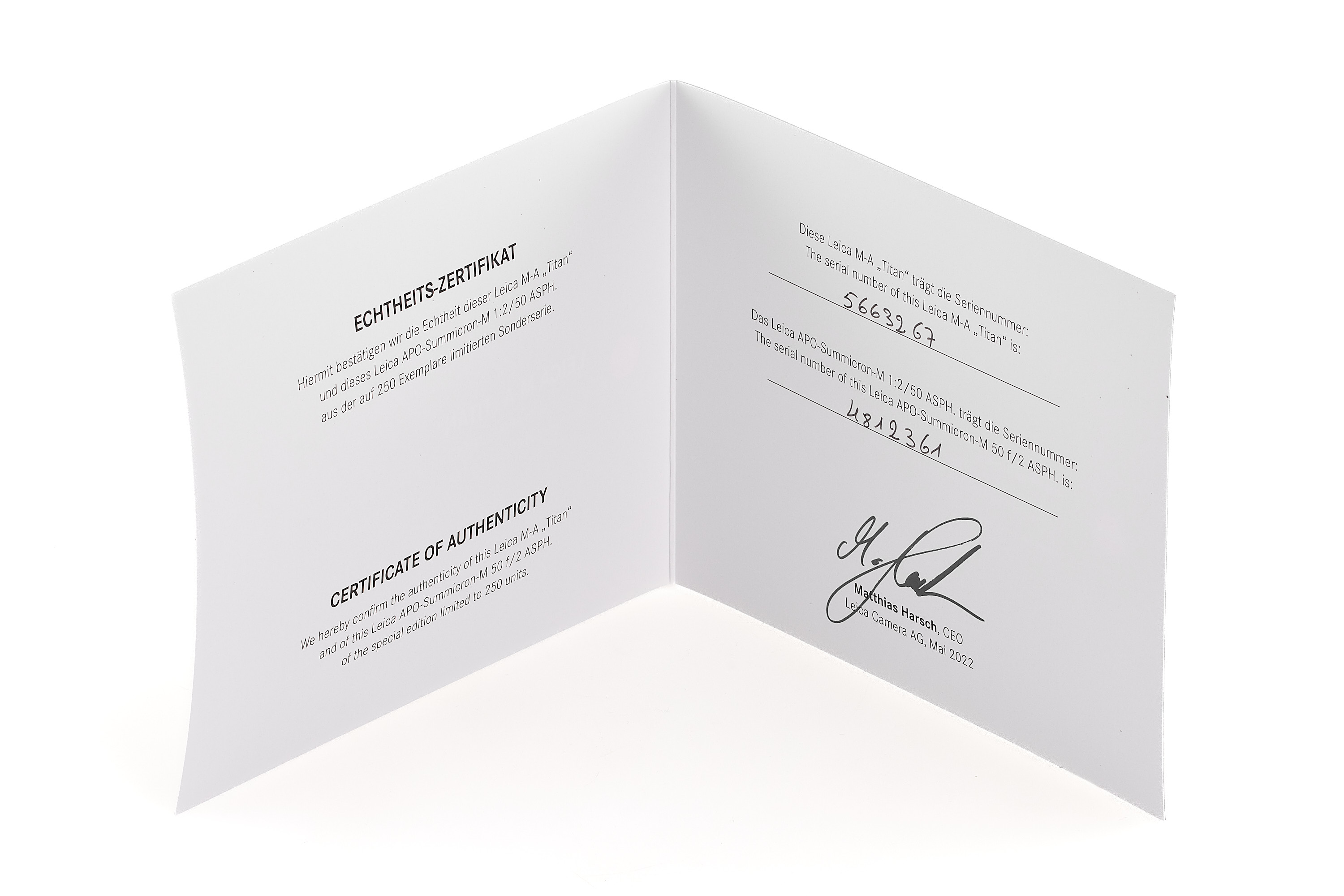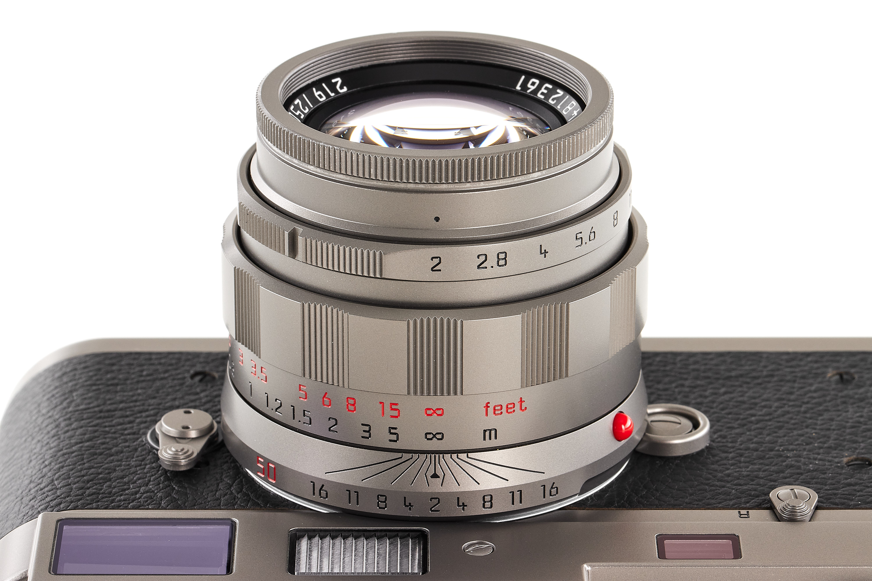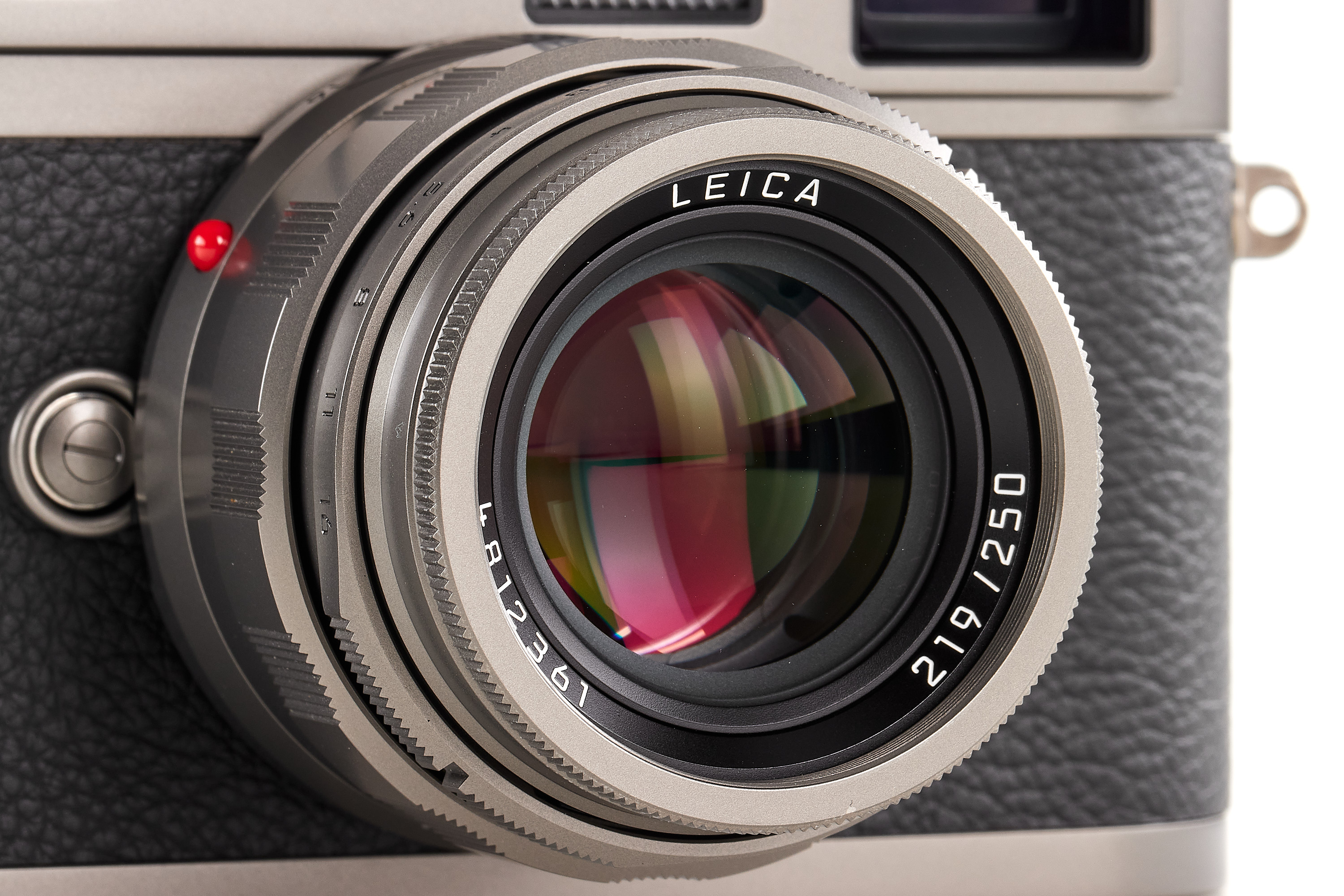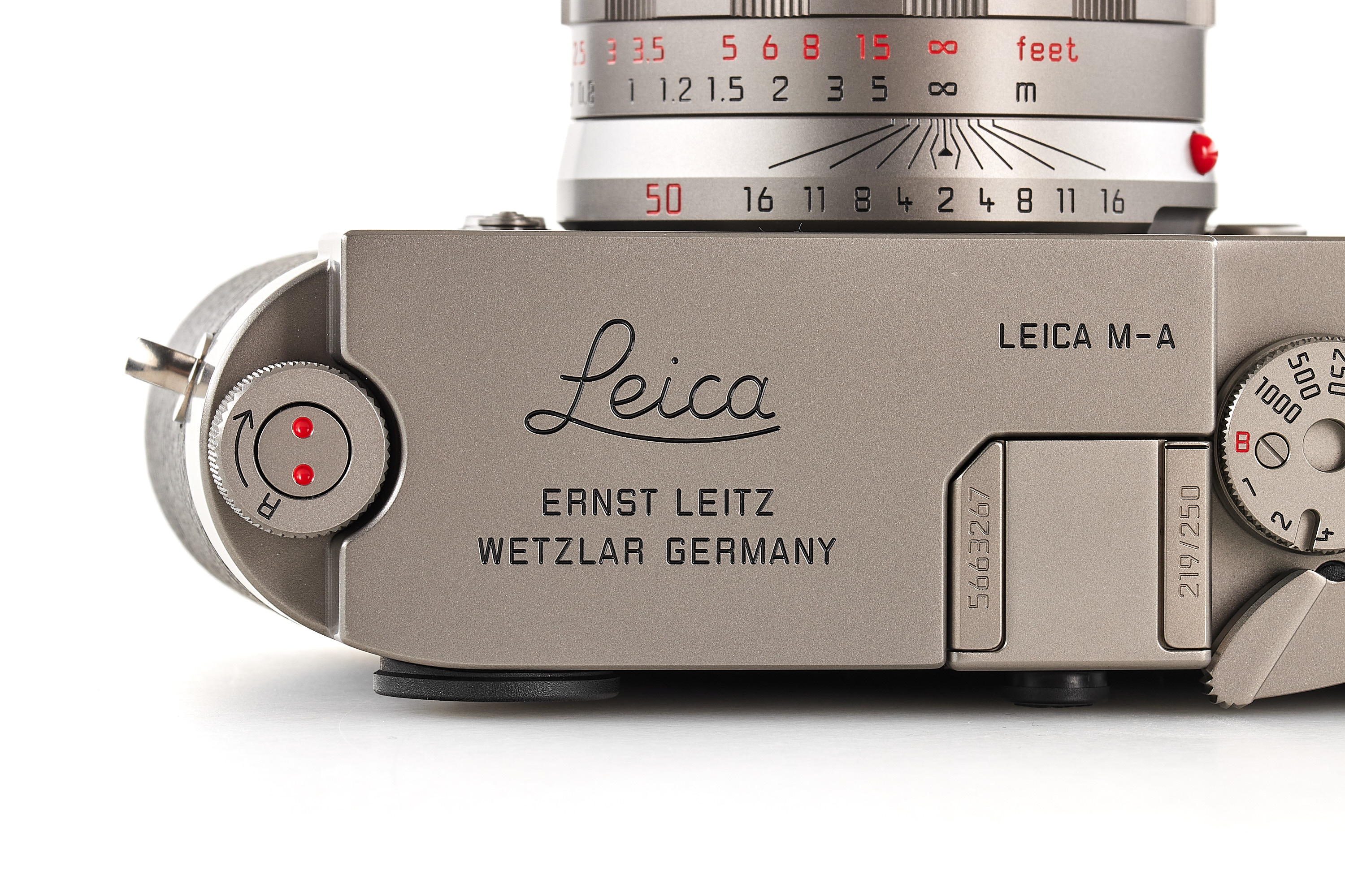 Beautiful special edition set limited to 250 pieces, incl. body Leica M-A in Titanium finish, with serial number no.5663267 and special number 219/250, with special Titanium Apo-Summicon-M Asph. 2/50mm no.4812361 (also engraved 219/250), in mint condition, only few light marks on the top plate complete with all accessories, papers and maker's boxes.