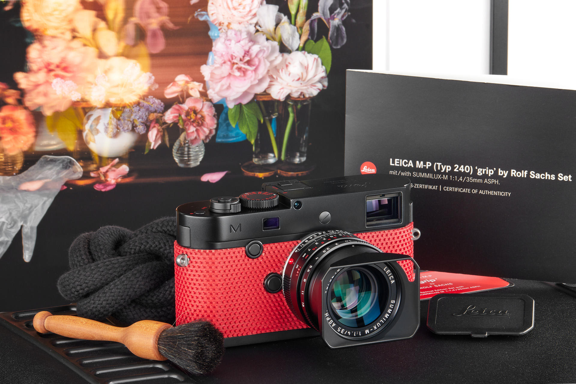 A special edition Leica M-P (Typ 240) issued in collaboration with artist and photographer Rolf Sachs. The unusual set, consisting of a Leica M-P camera no.5153719 and the fast classic lens Leica Summilux-M 1.4/35mm ASPH. no.4670248. The combination of unusual materials in an eye-catching choice of colour and classic design lends the camera a unique look and makes the Leica M-P ‘grip‘ by Rolf Sachs a true collector’s item. This special edition was strictly limited to only 79 sets for the worldwide market. Included in the set is an original print cm40x58cm from the Corona series, signed by Mr. Sachs.