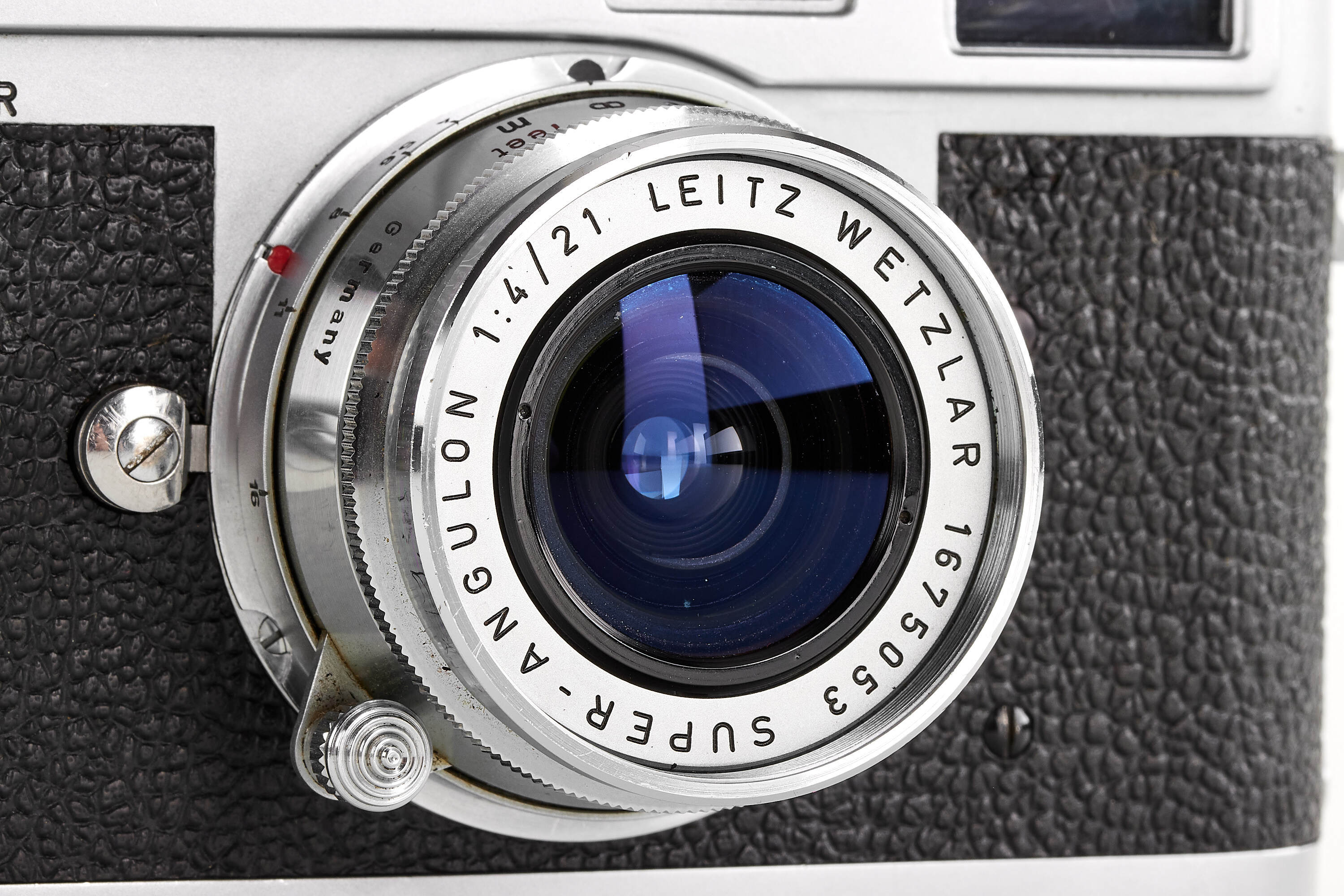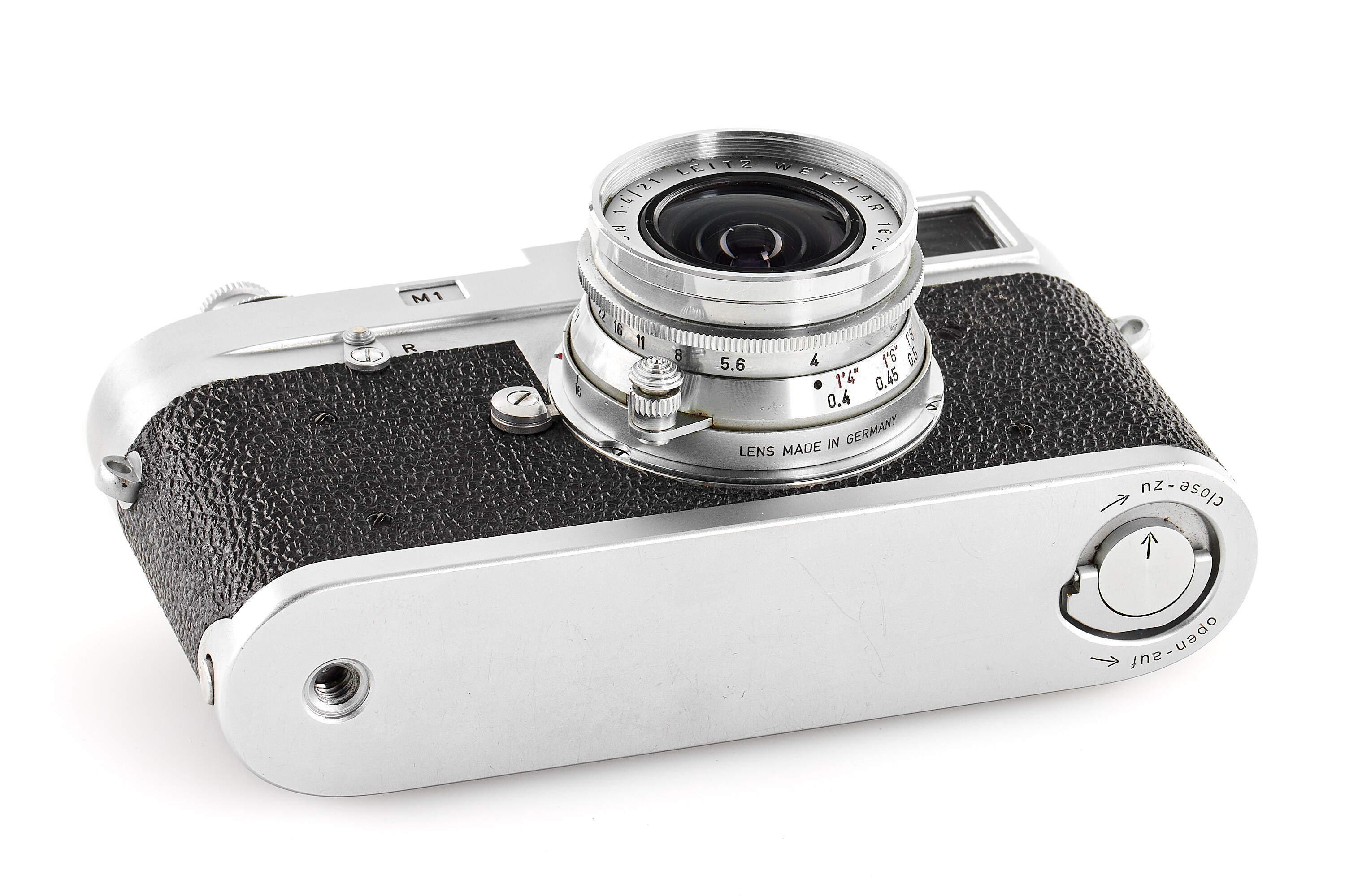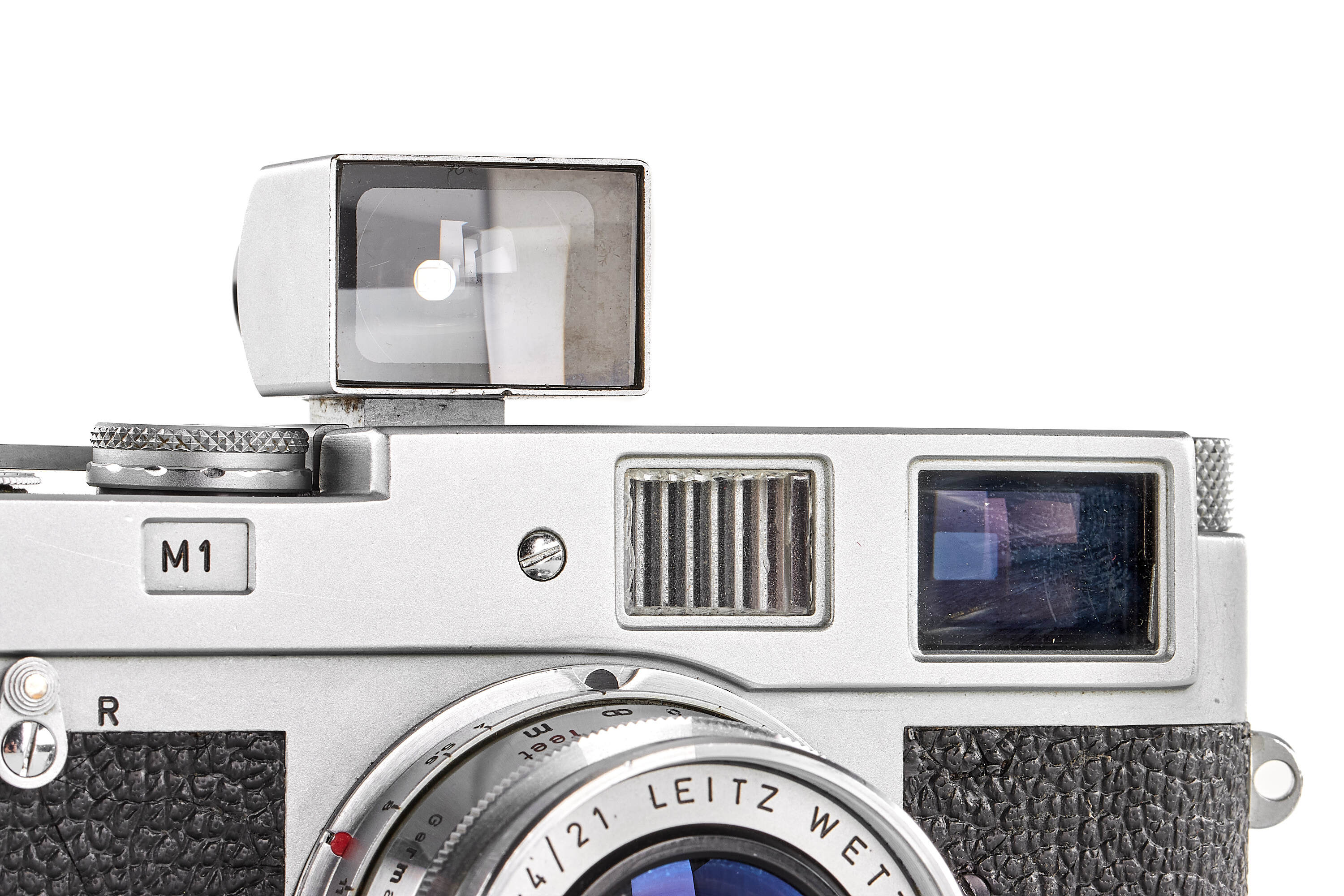 Chrome Leica M1 in very good condition, with OZTNO screw mount shutter release adapter and body cap, delivered to retailer Manca, New York, on 25.01.1962, together with rare Super-Angulon 4/21mm no.1675053 with SBKOO finder and M39/M adapter.