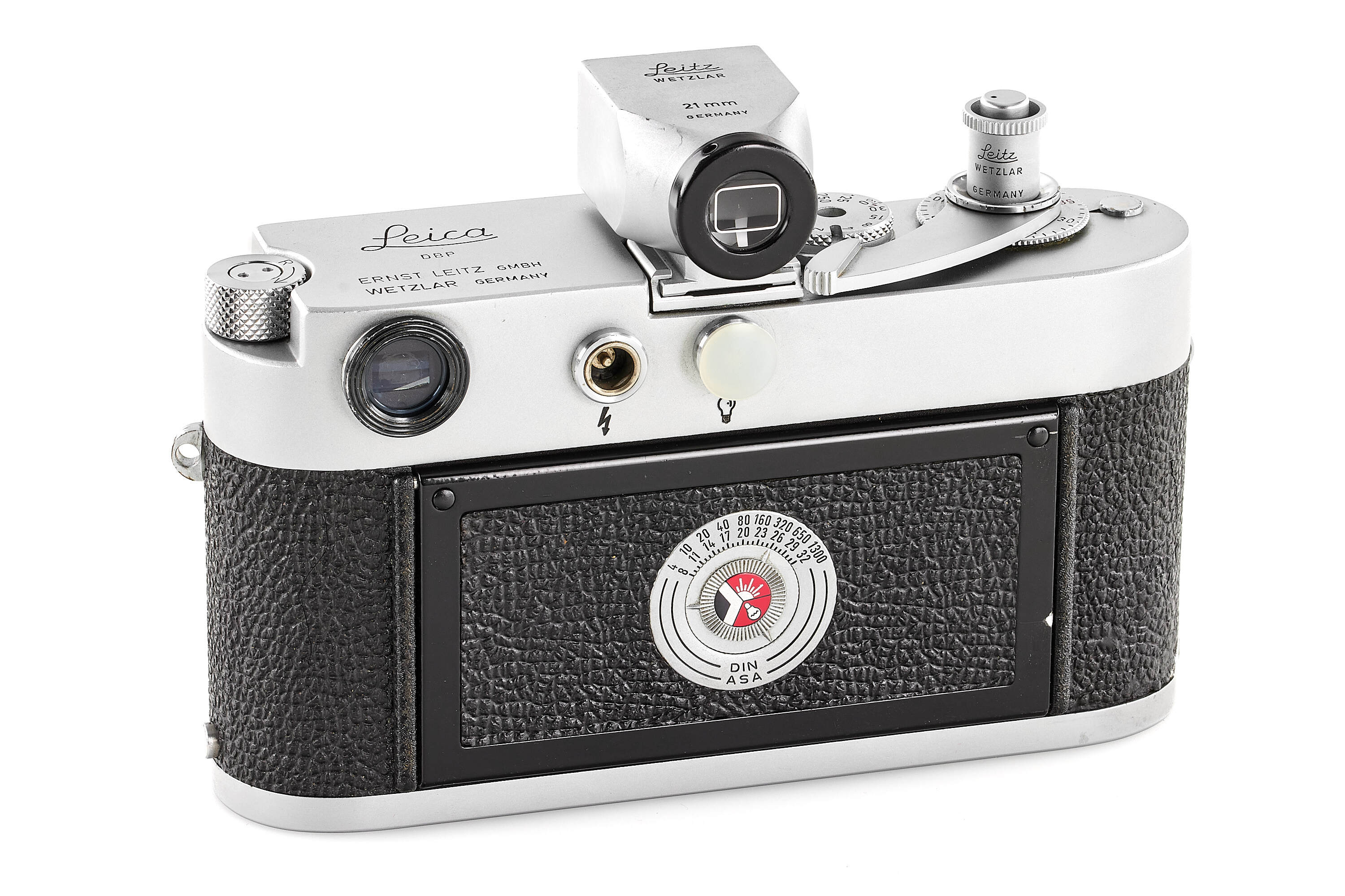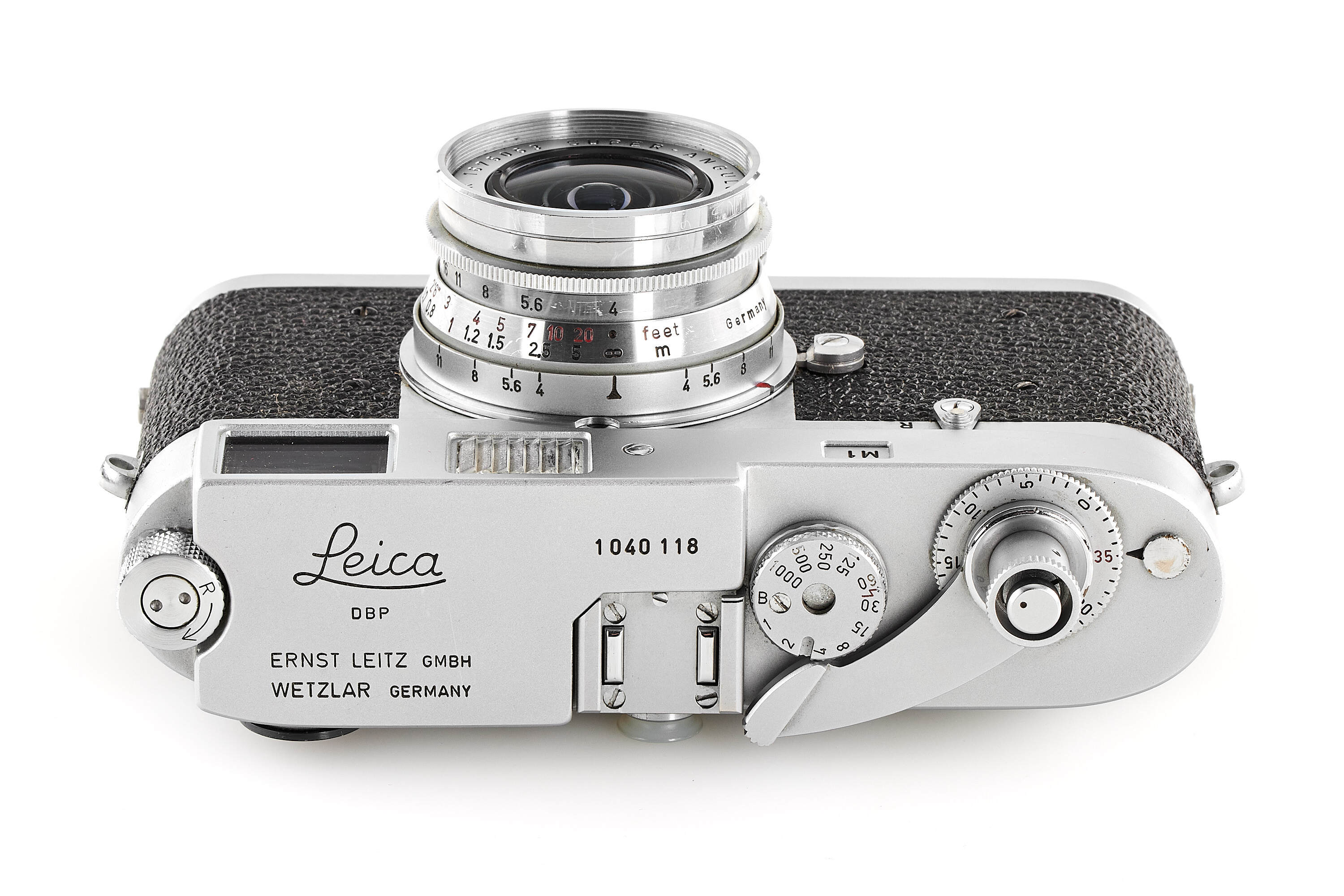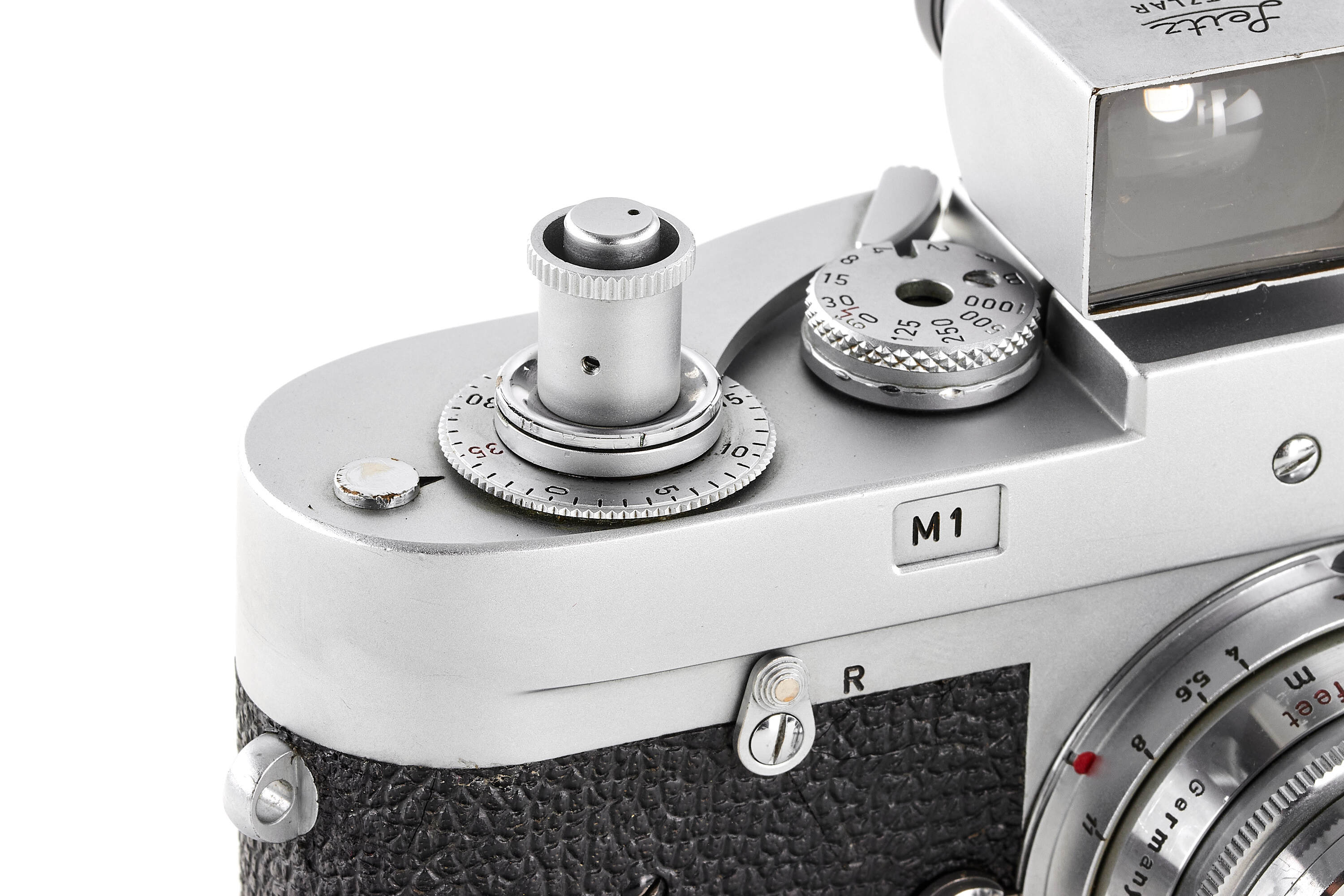 Chrome Leica M1 in very good condition, with OZTNO screw mount shutter release adapter and body cap, delivered to retailer Manca, New York, on 25.01.1962, together with rare Super-Angulon 4/21mm no.1675053 with SBKOO finder and M39/M adapter.