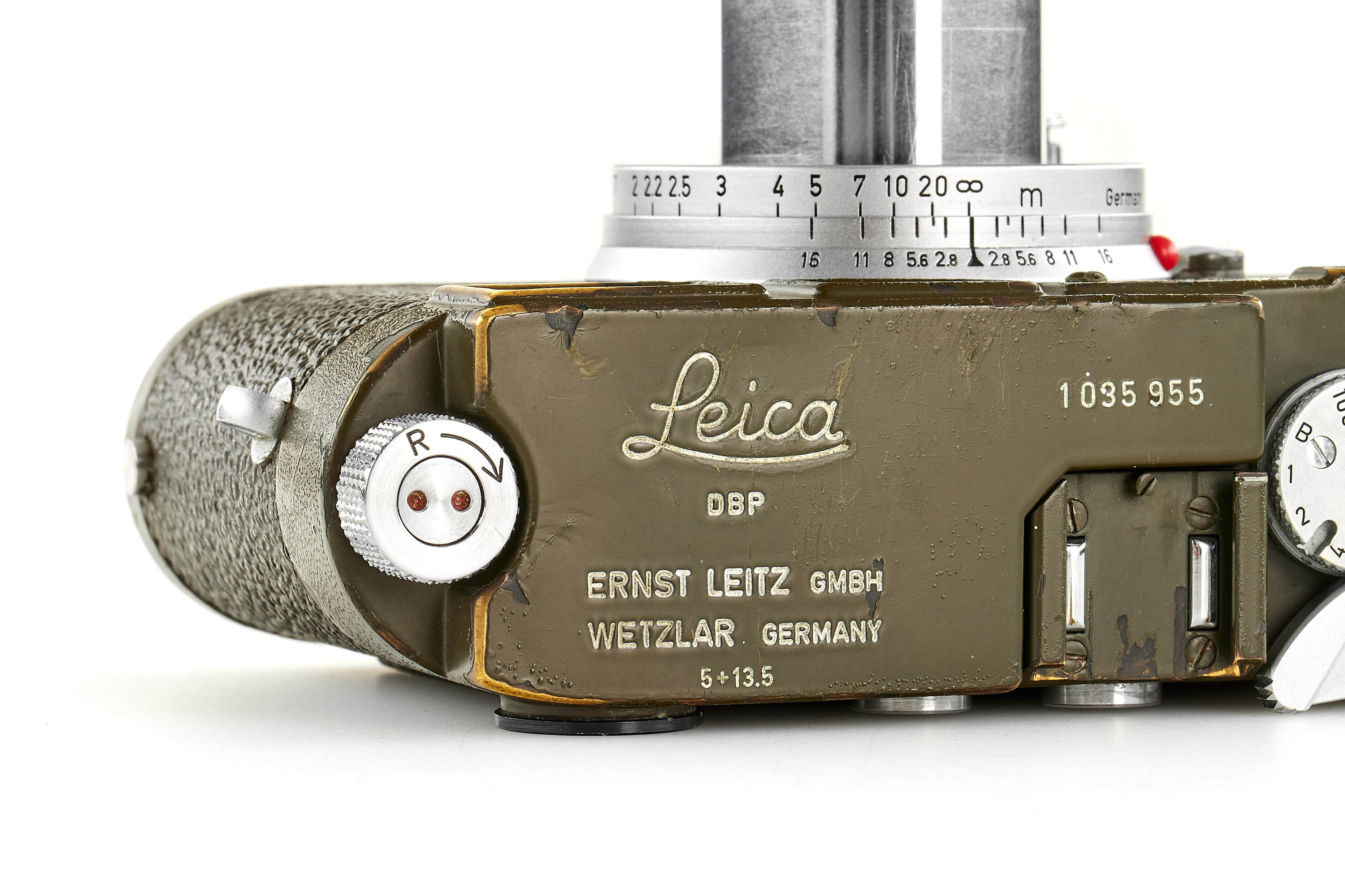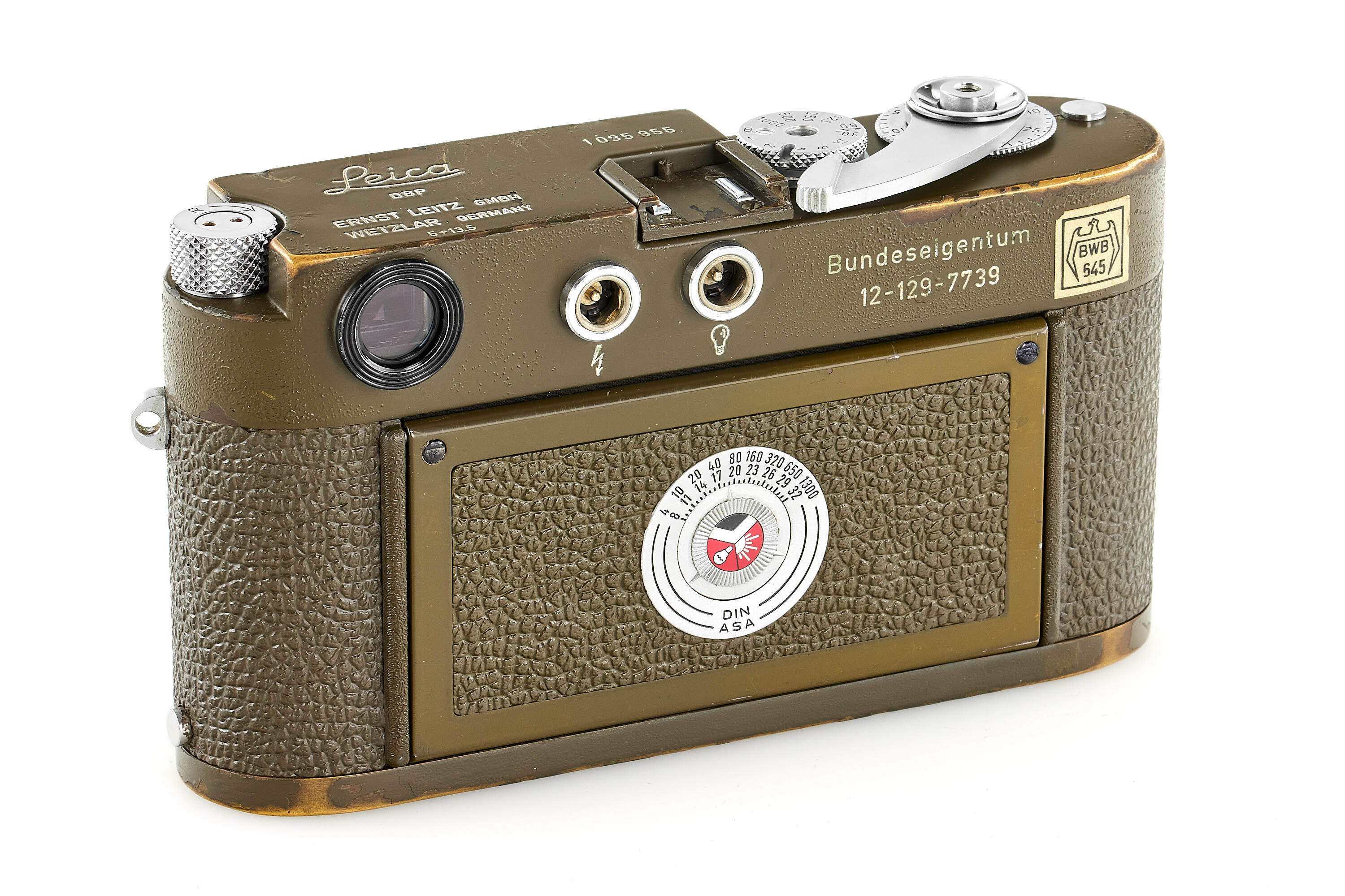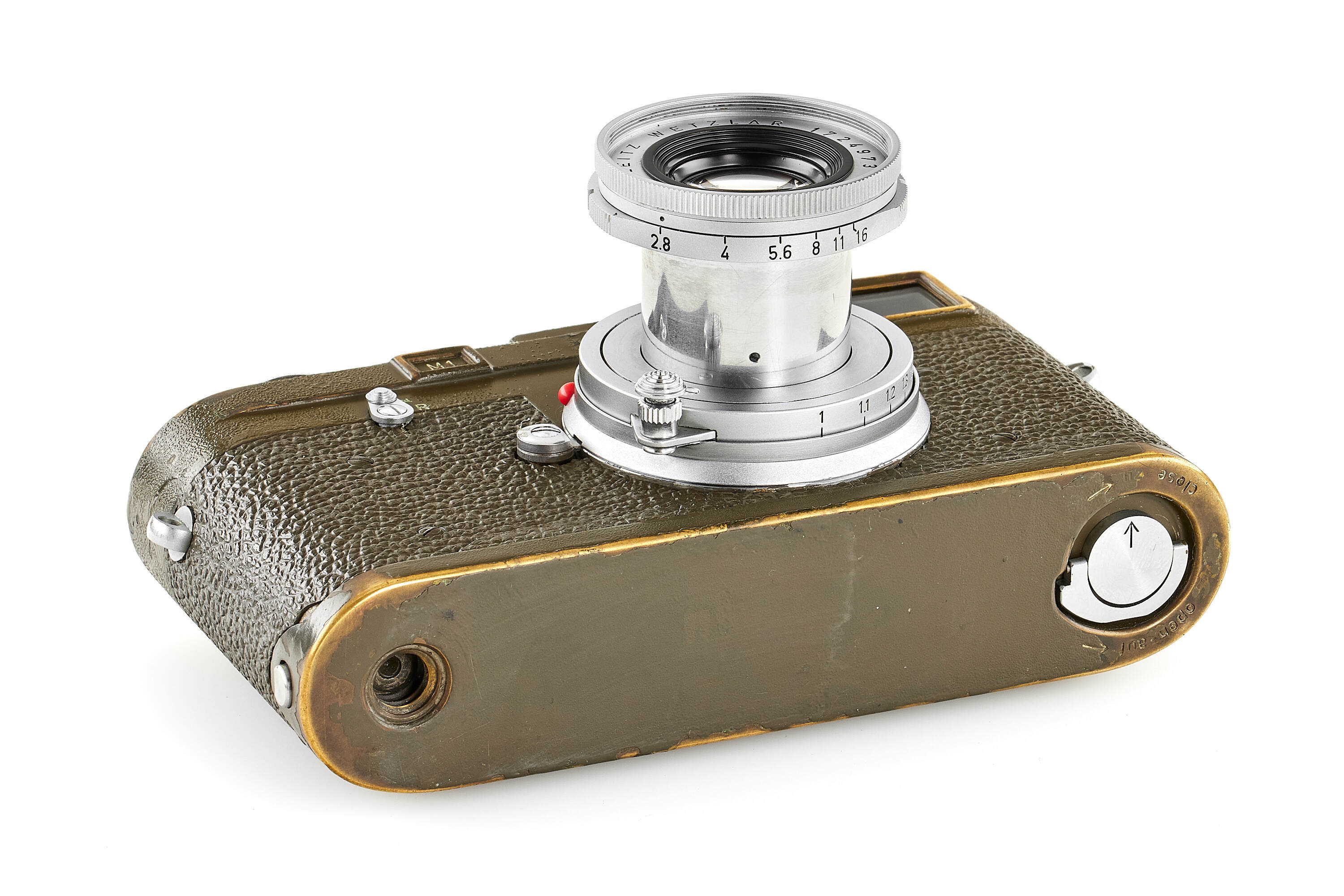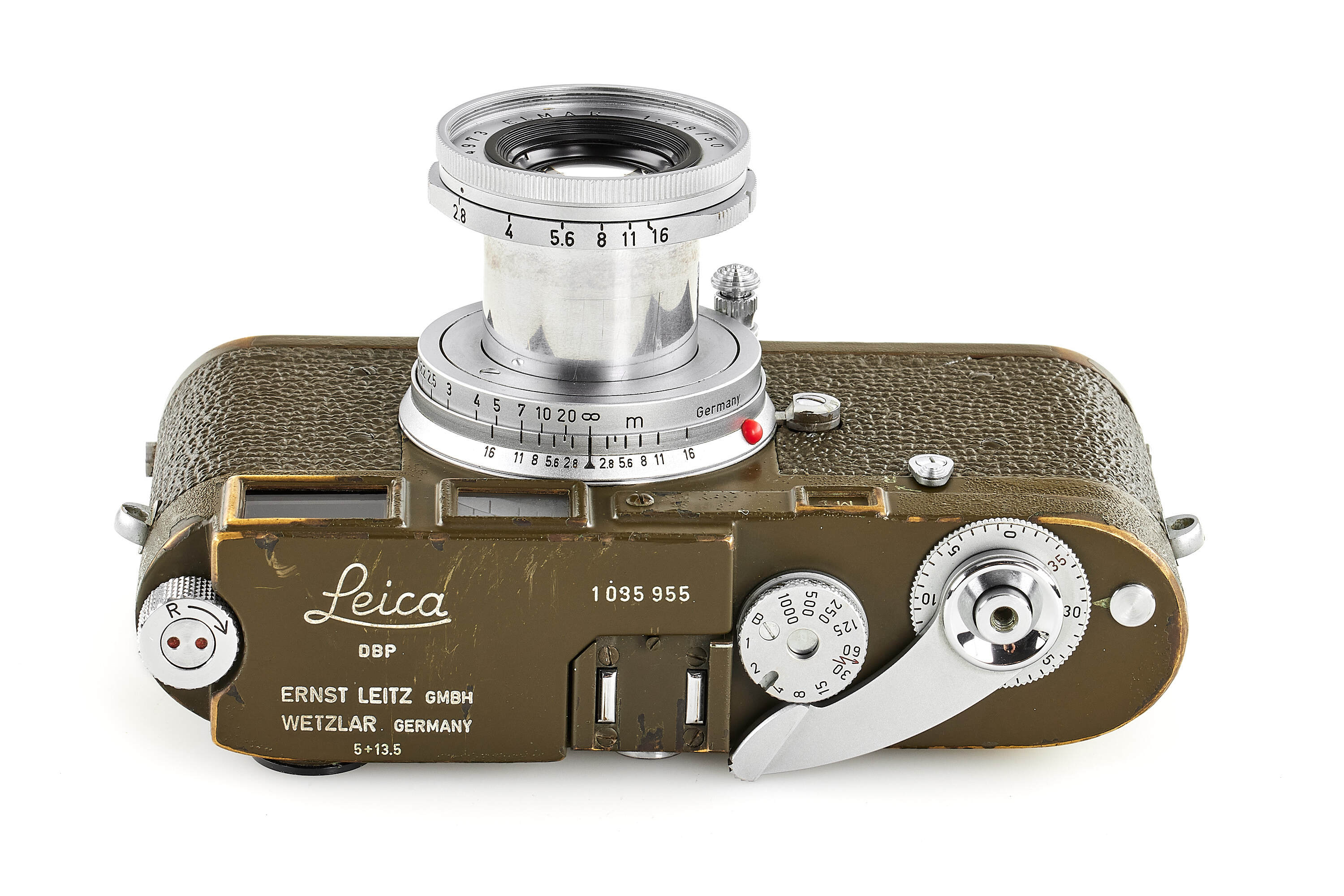 Fully original, second type M1 green engraved 'Bundeseigentum 12-129-7739', rare version with '5+13,5cm' engraving near the eyepiece, with MP top plate (only 75 of these cameras were produced and delivered to Wilhelmshaven and Kiel in 1961), in good condition, with original green vulcanite with fine pattern, with chrome Elmar 2,8/5cm no.1724973 without military engravings (front lens cap), optics showing cleaning marks, the camera has been delivered to German Marine in Wilhelmshaven on 25.10.1961.