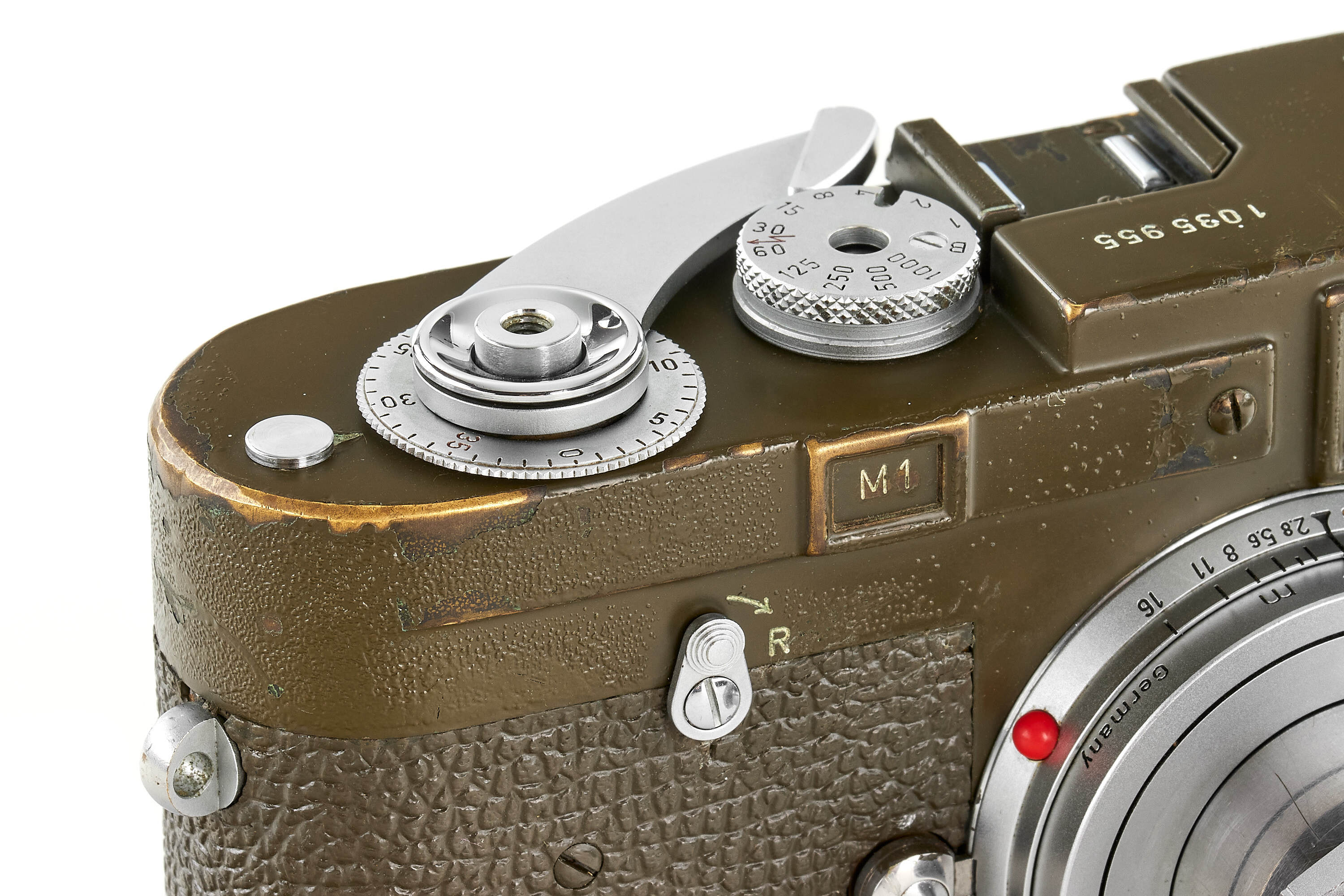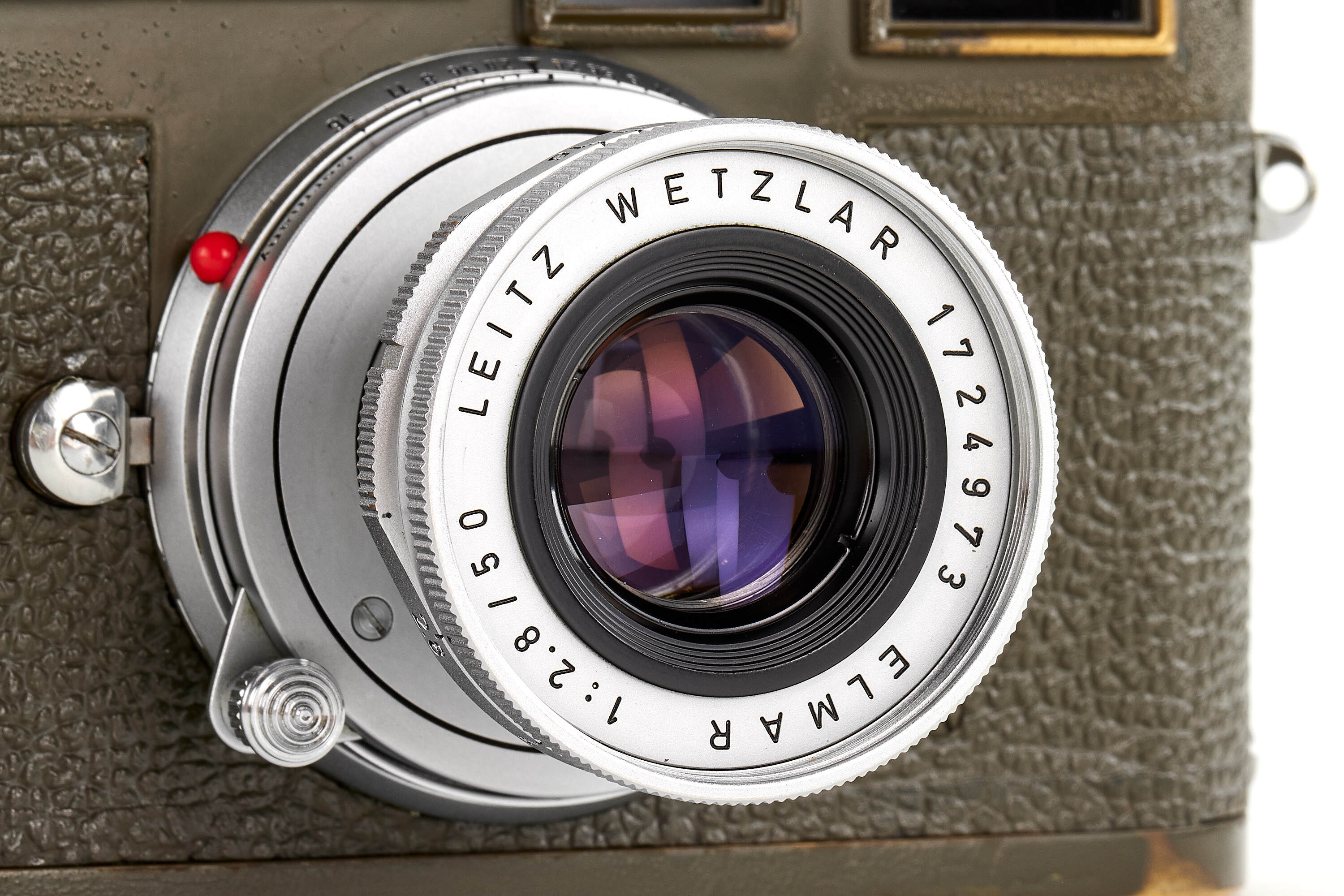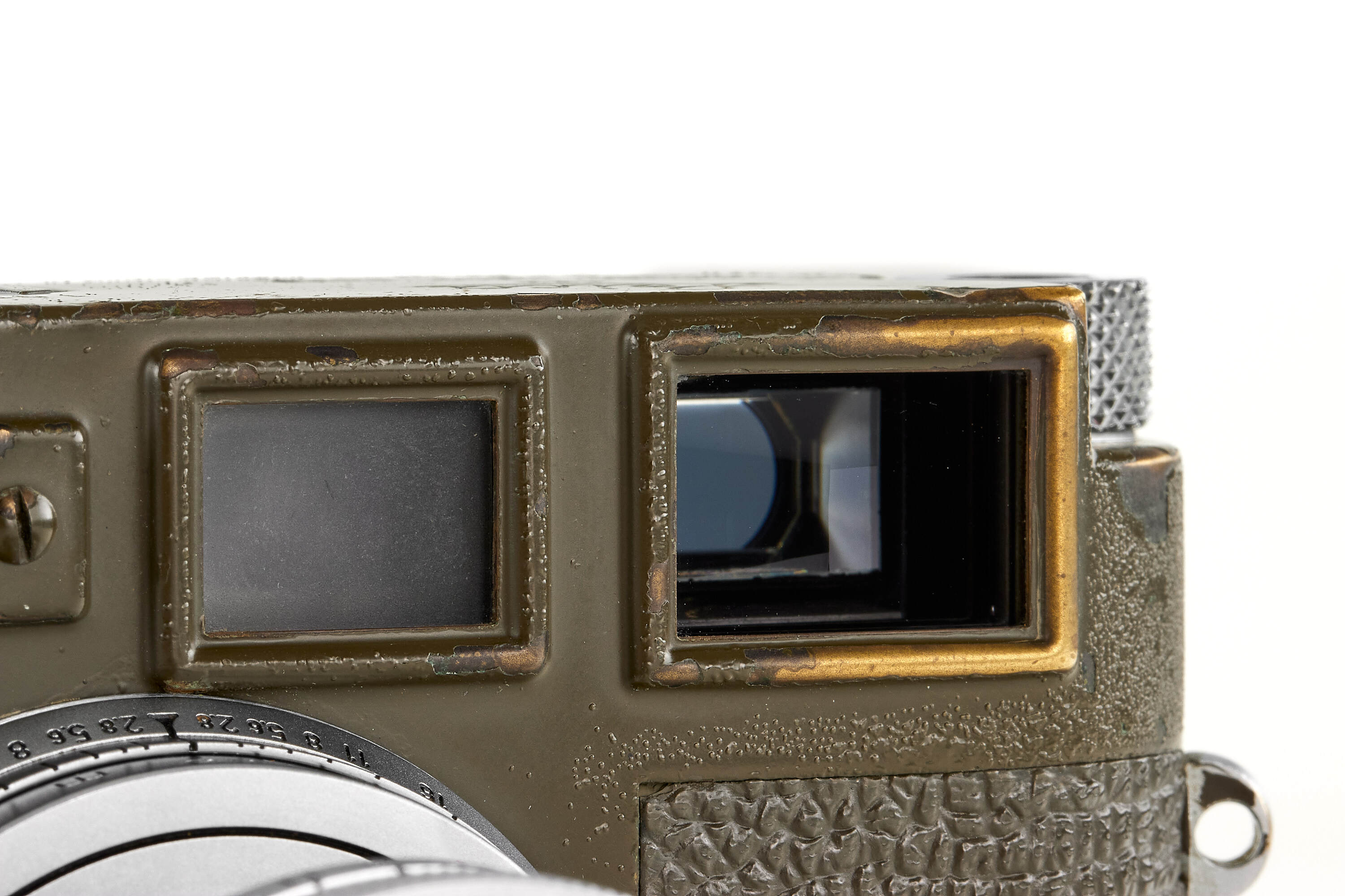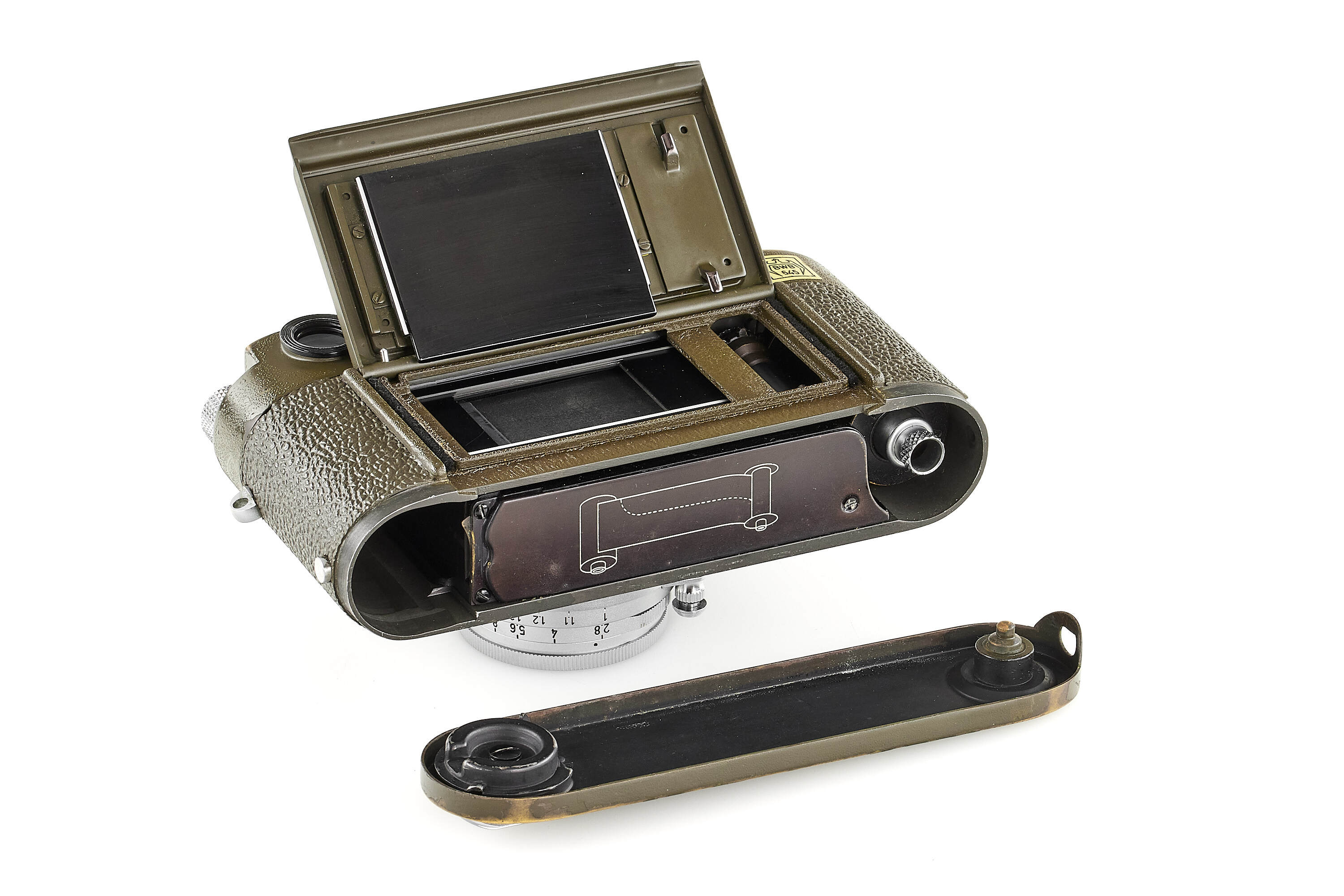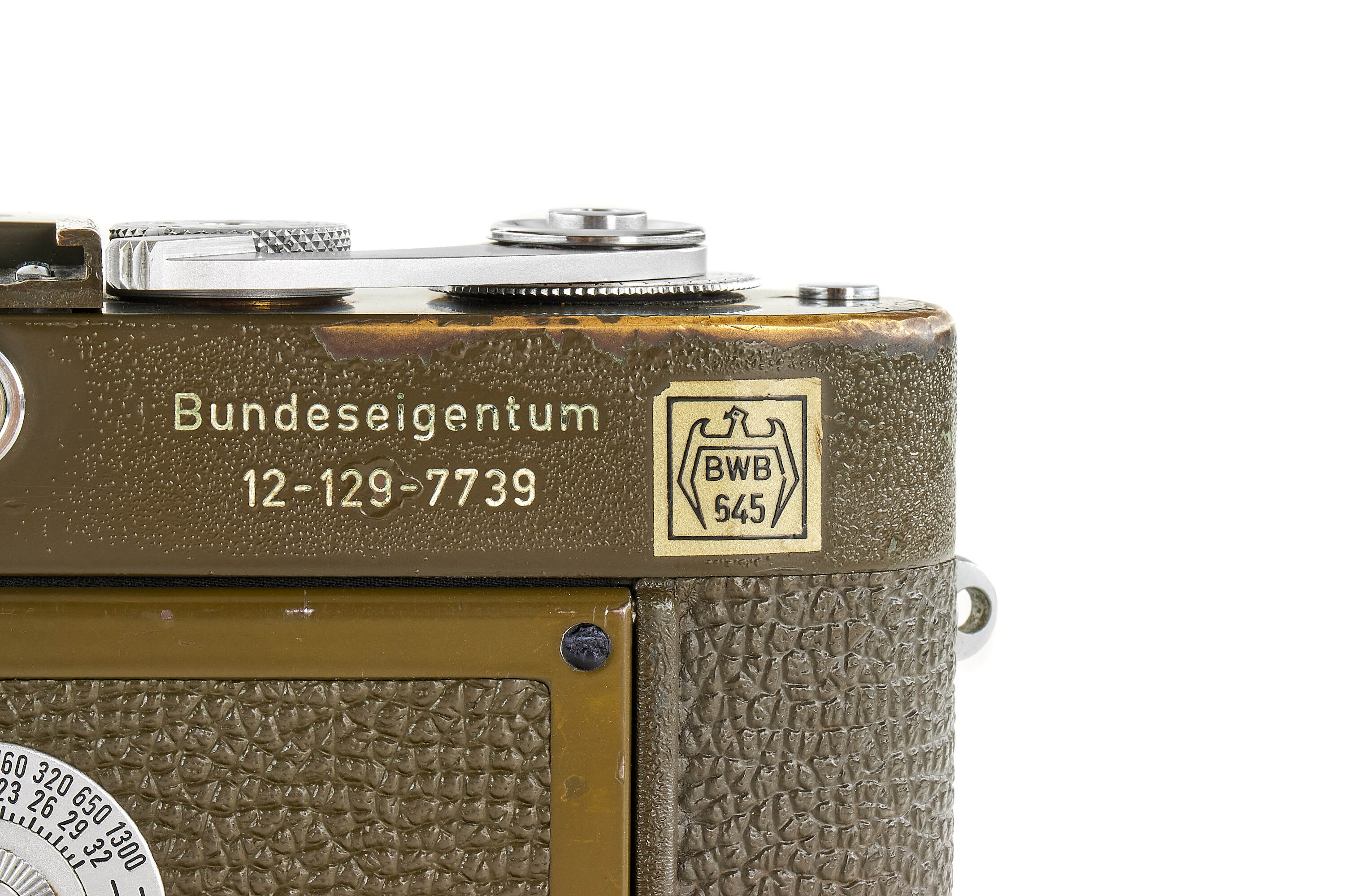 Fully original, second type M1 green engraved 'Bundeseigentum 12-129-7739', rare version with '5+13,5cm' engraving near the eyepiece, with MP top plate (only 75 of these cameras were produced and delivered to Wilhelmshaven and Kiel in 1961), in good condition, with original green vulcanite with fine pattern, with chrome Elmar 2,8/5cm no.1724973 without military engravings (front lens cap), optics showing cleaning marks, the camera has been delivered to German Marine in Wilhelmshaven on 25.10.1961.