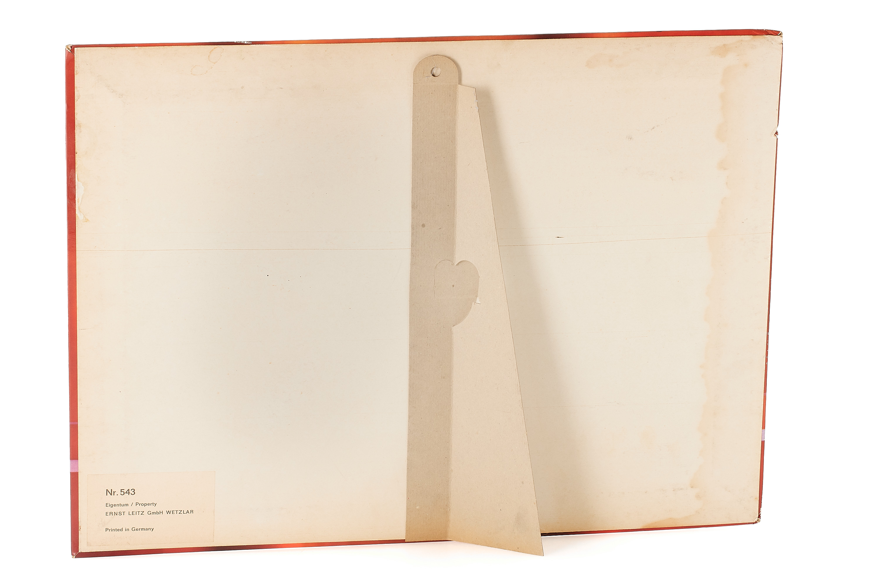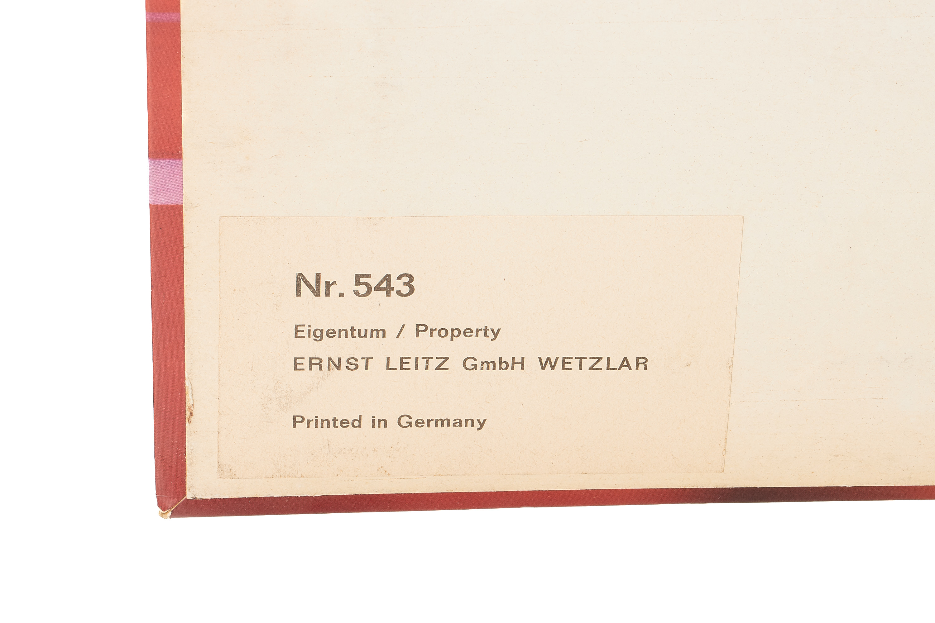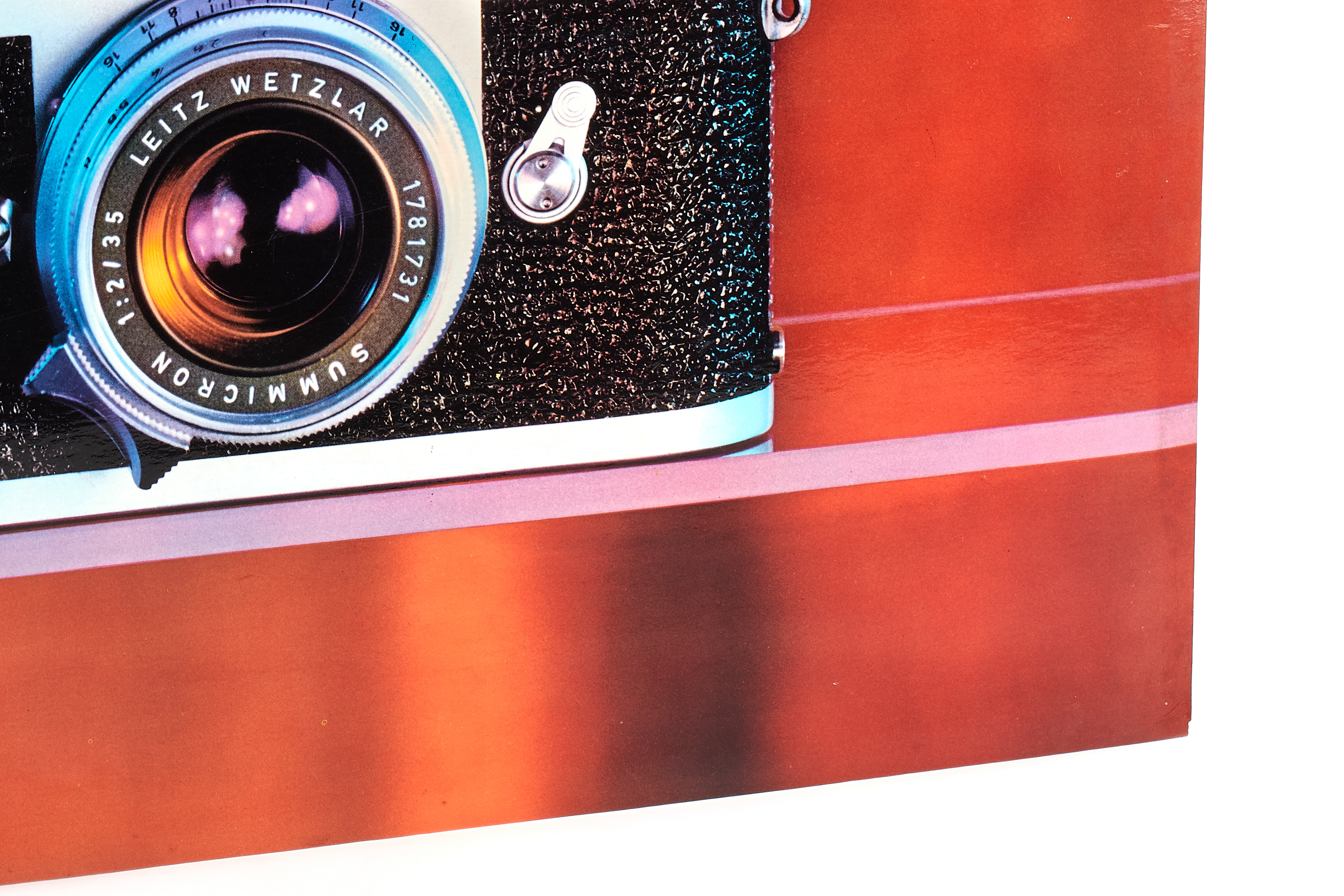 Very nice advertising sign showing a Leica M2 chrome with Summicron 35mm and Leica Meter, 41.5x55.5 picture glued on cardboard, in almost mint condition, showing some light discolouration, sticker on the back with 'Nr.543 - Eigentum/Property - Ernst Leitz GmbH Wetzlar - Printed in Germany'