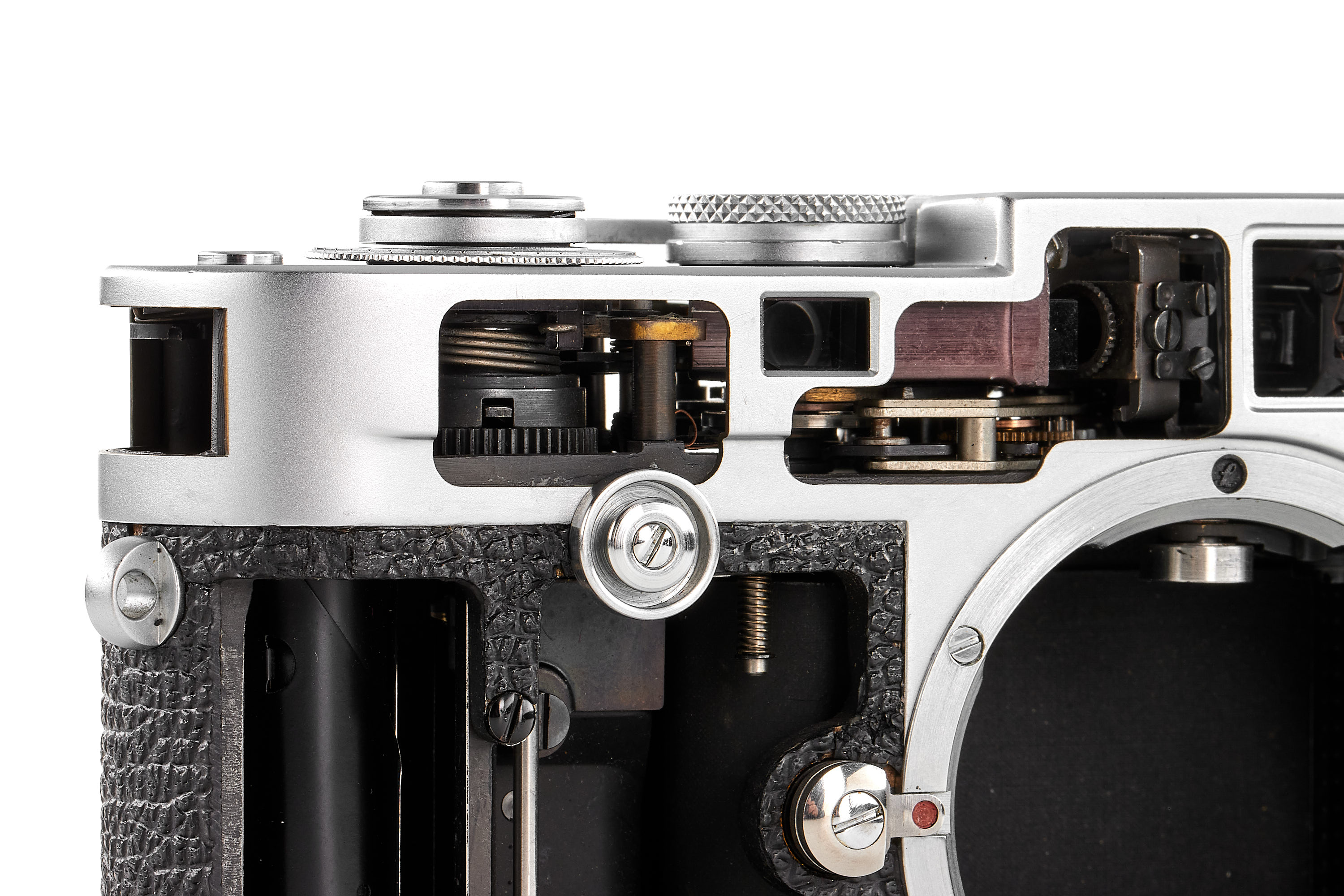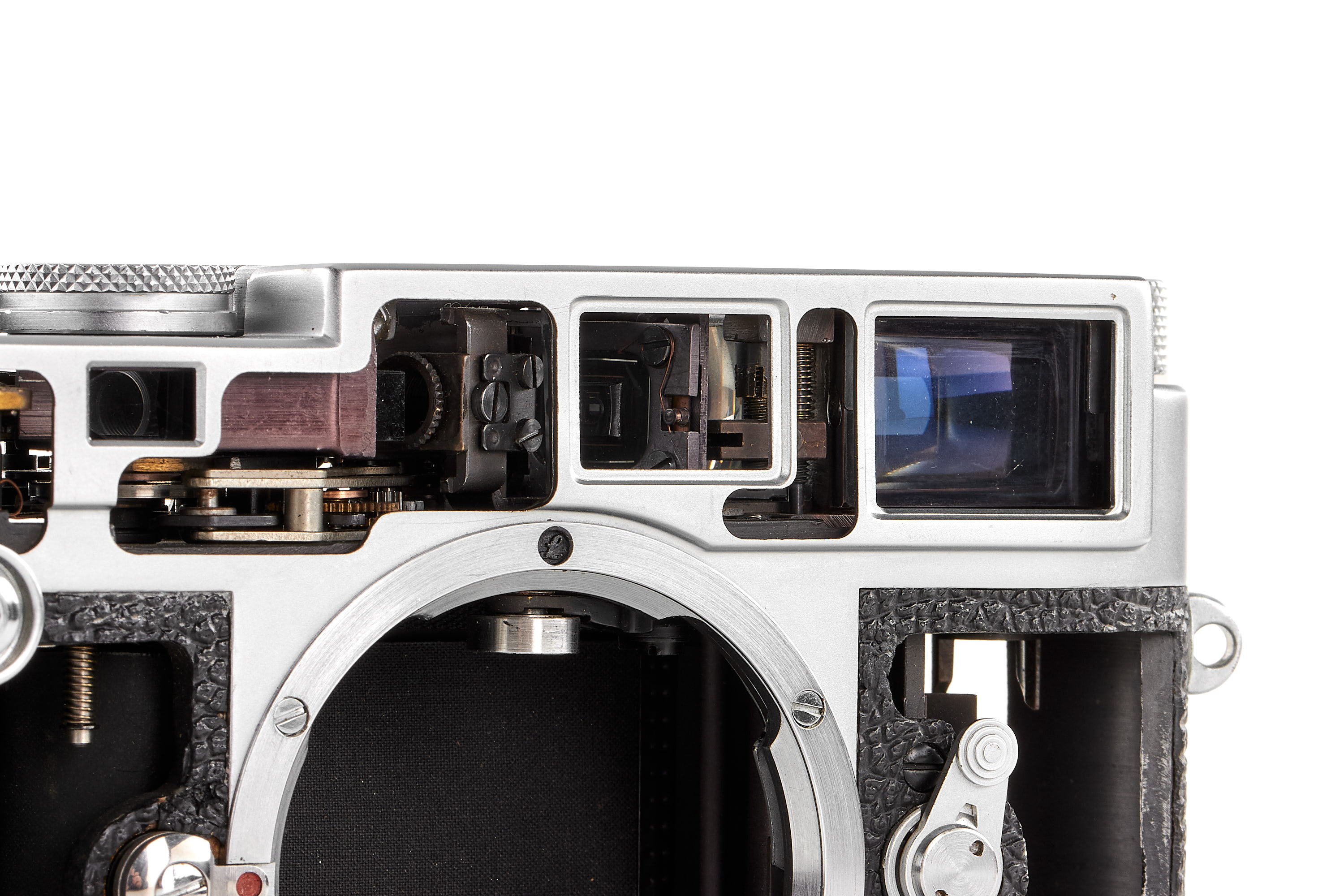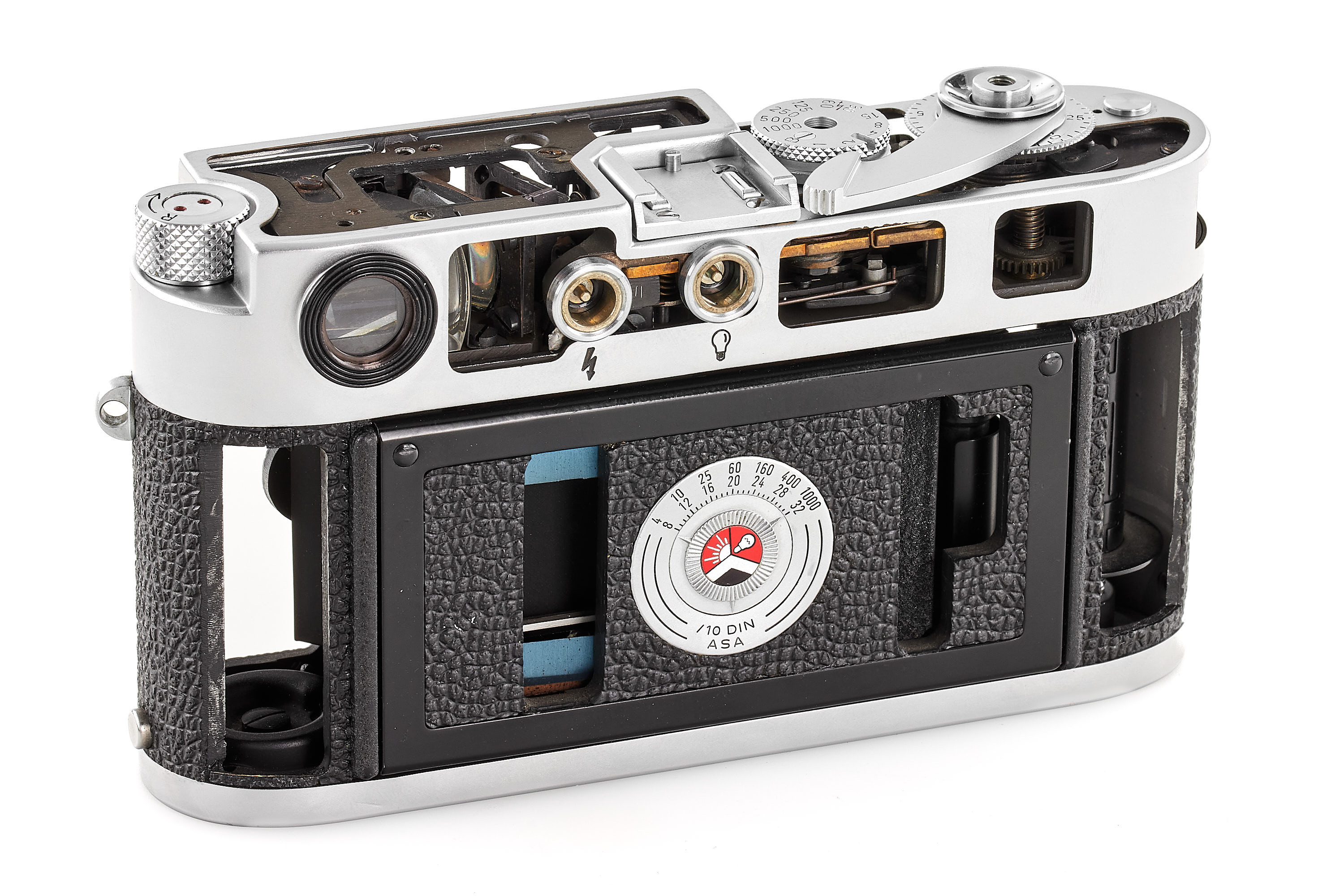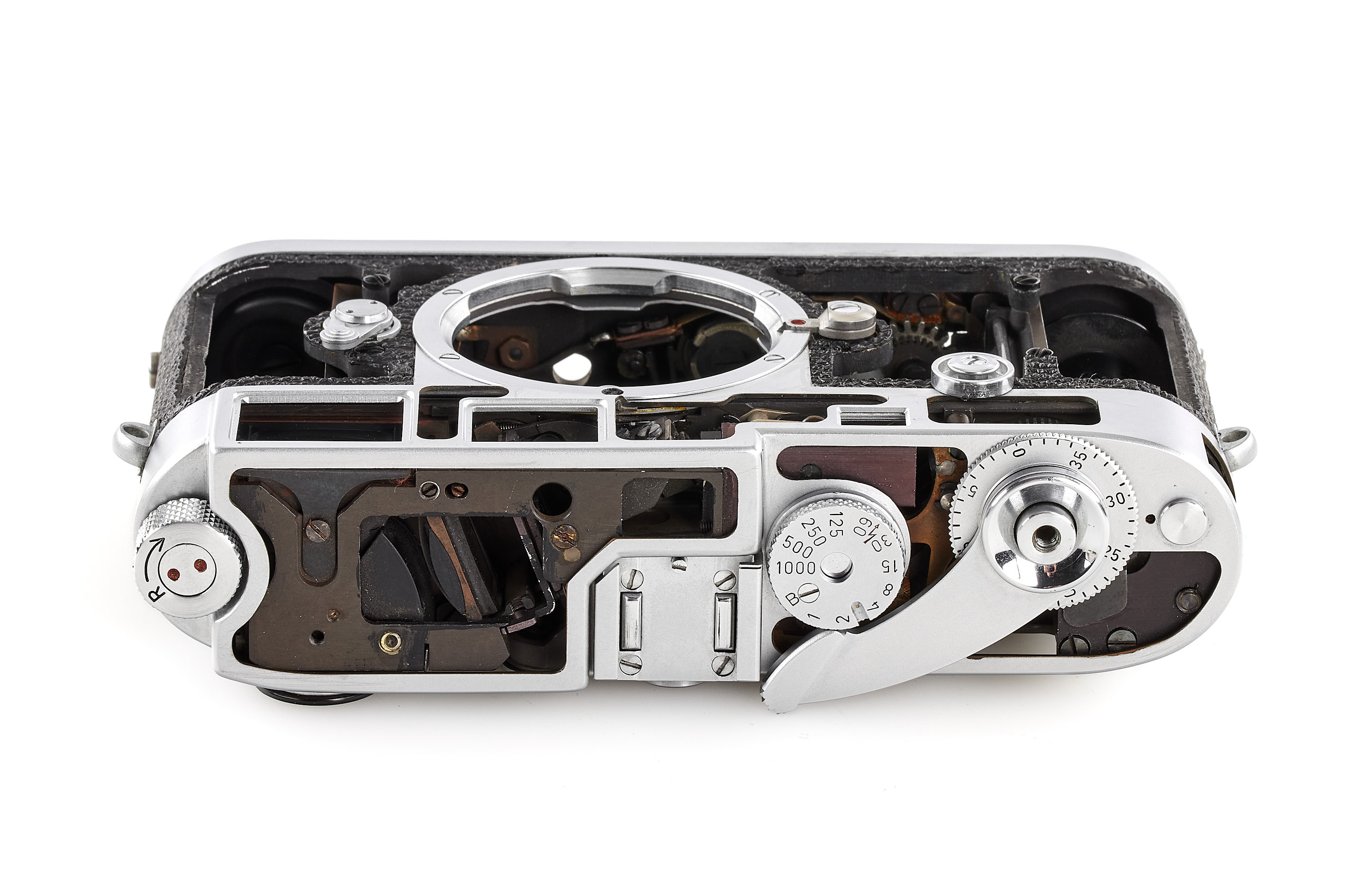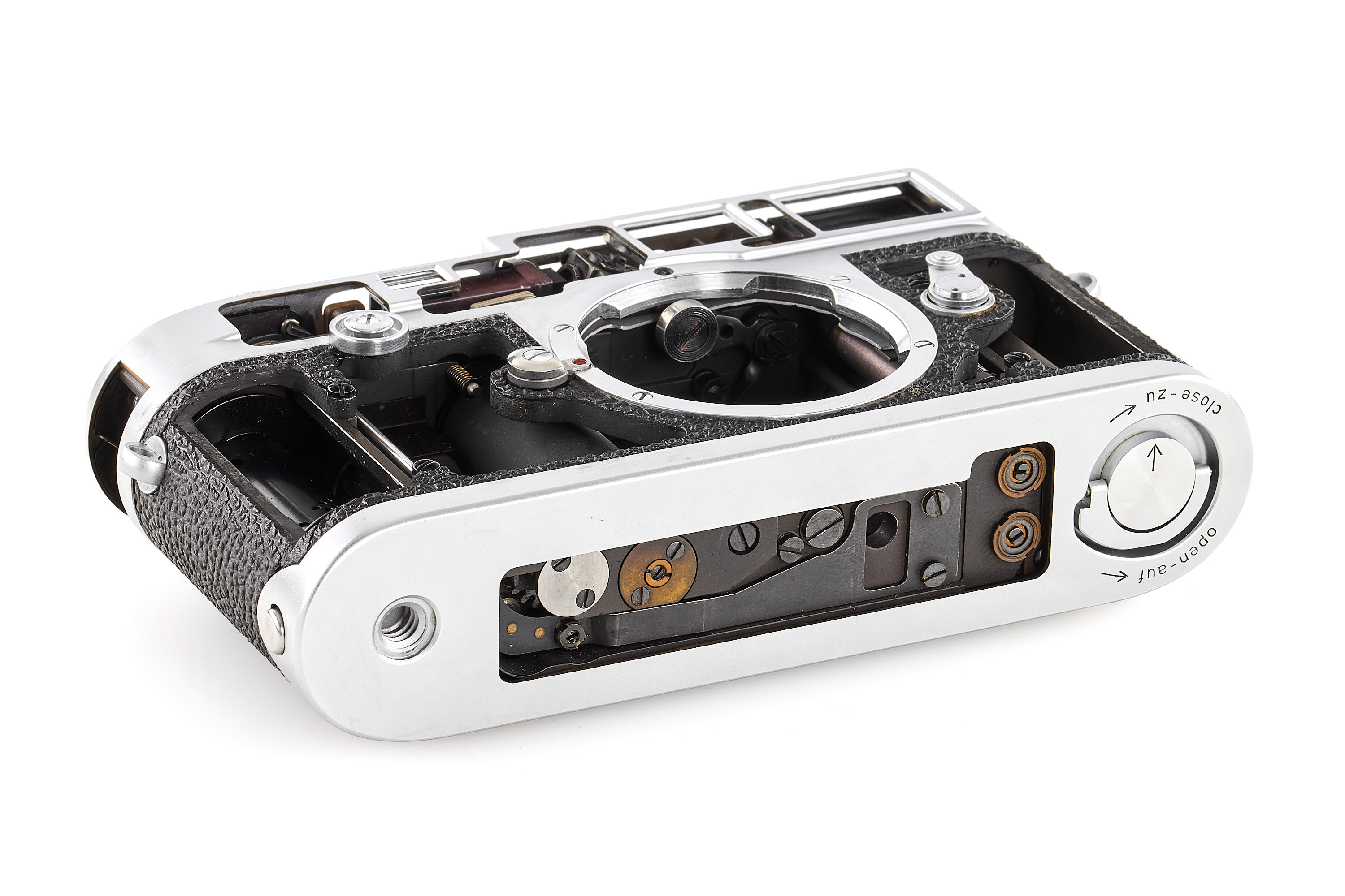 Very rare original cut-away early Leica M2 button-rewind model, in mint condition and fully operable, note the cut-away bottom plate.