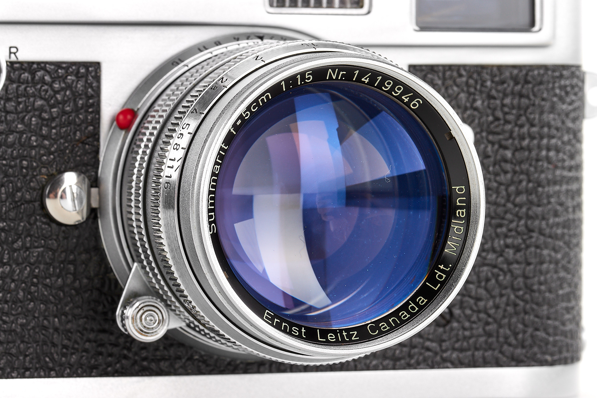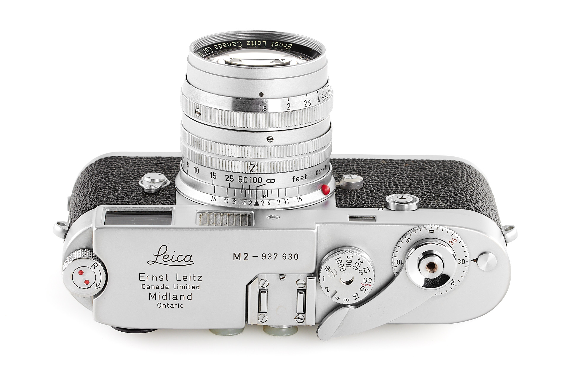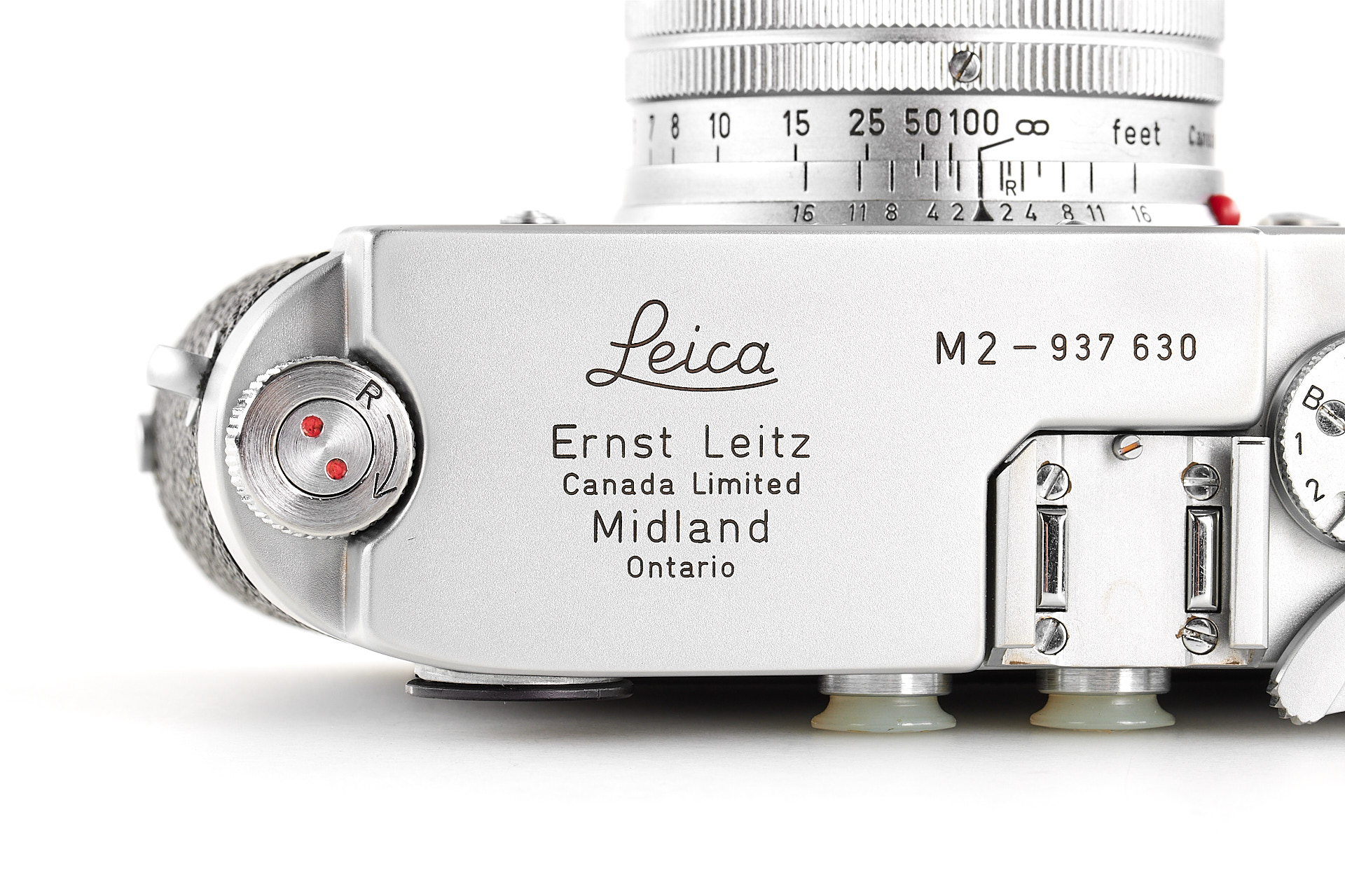 Very rare Leica M2 in near mint condition produced in Canada, engraved "Ernst Leitz Canada Limited Midland Ontario" on the top plate. Only about 1,500 units of the Leica M2 were assembled at the Leitz plant in Canada, while the total production number was more than 76.000. Usually, these cameras were equipped with top plates from the Wetzlar production. Just a handful of examples carried the “Leitz Canada“ engravings and were intended as samples. Included with the camera is a matching, rare, original Midland Summarit 1.5/5cm no.1419946, also in beautiful, near-mint condition.