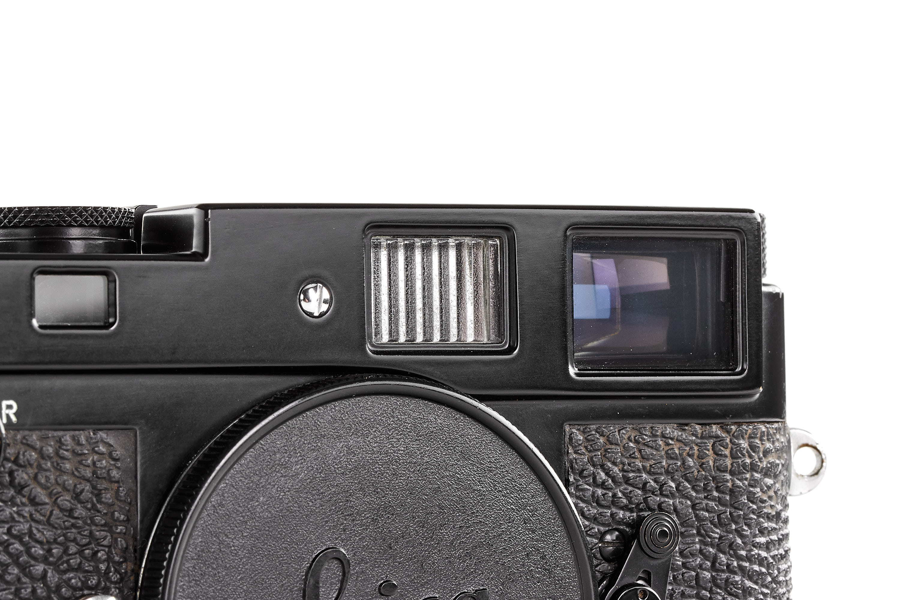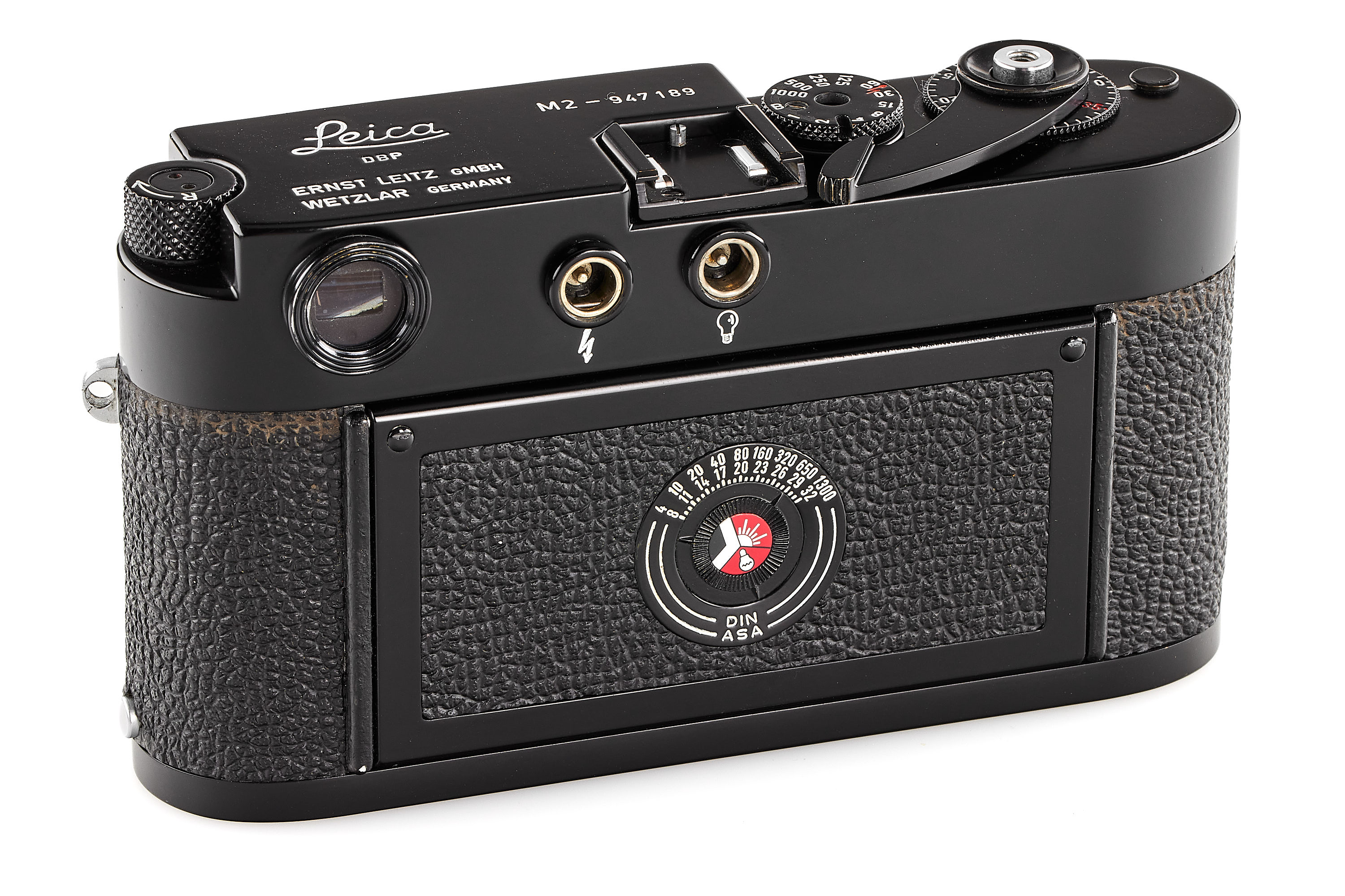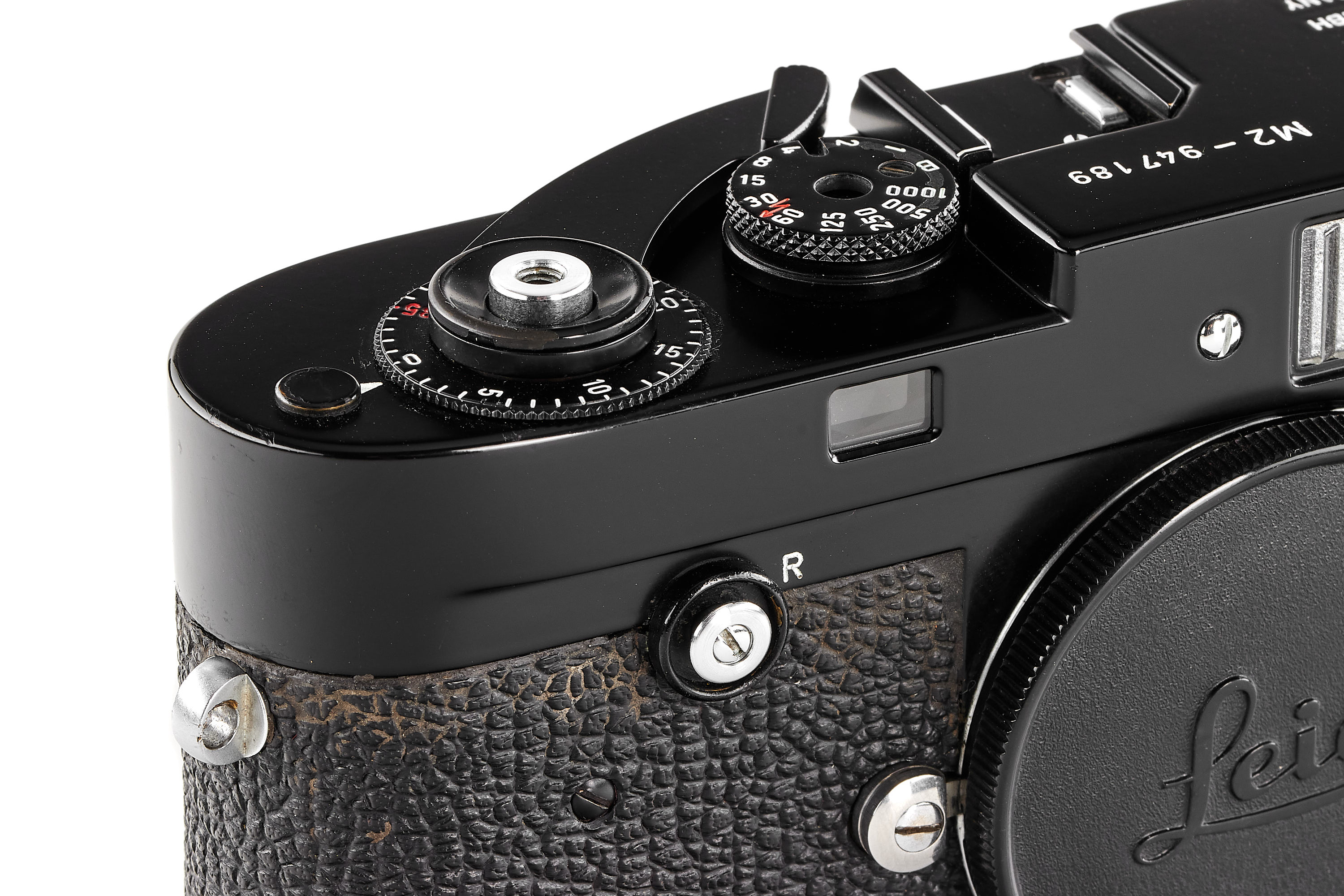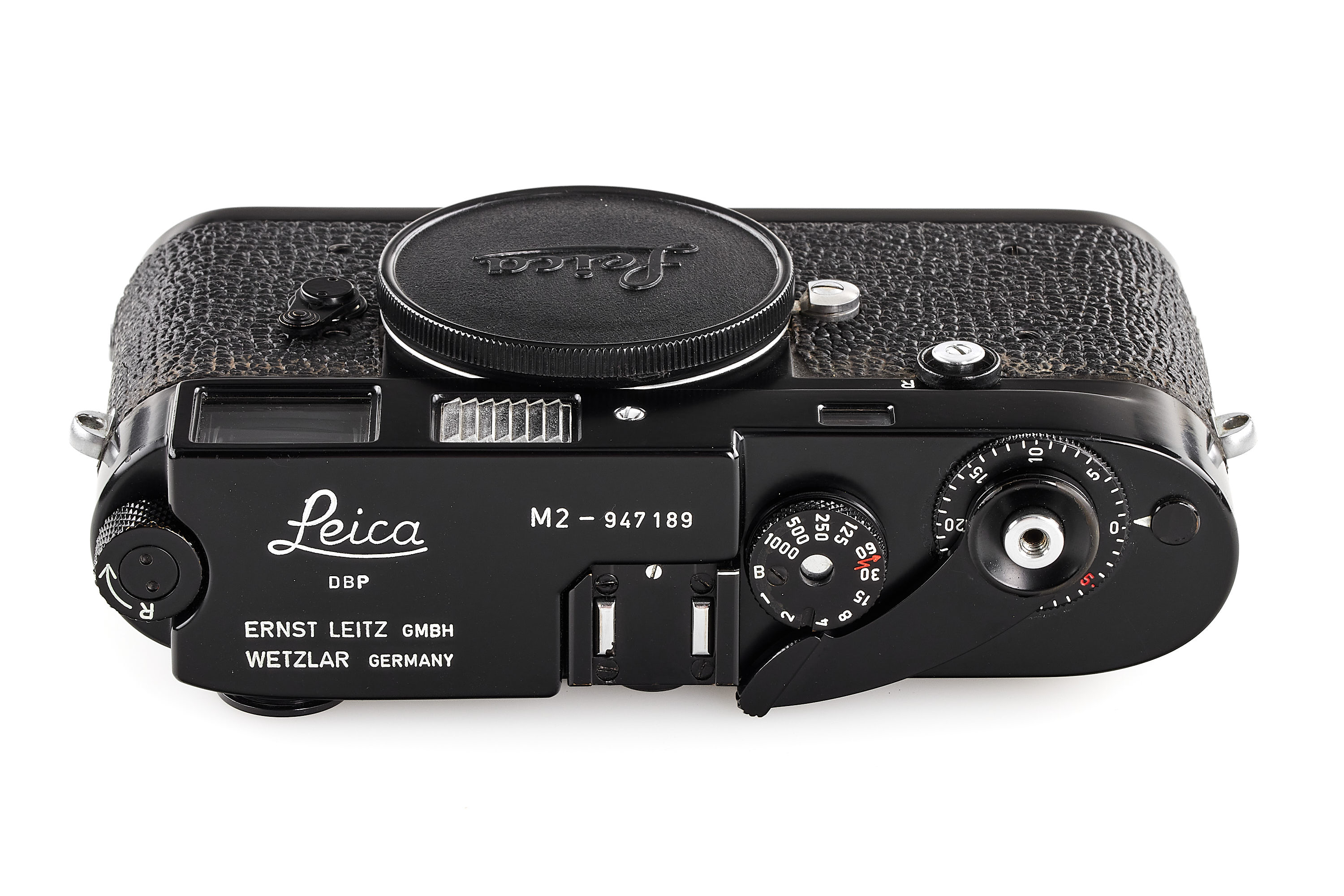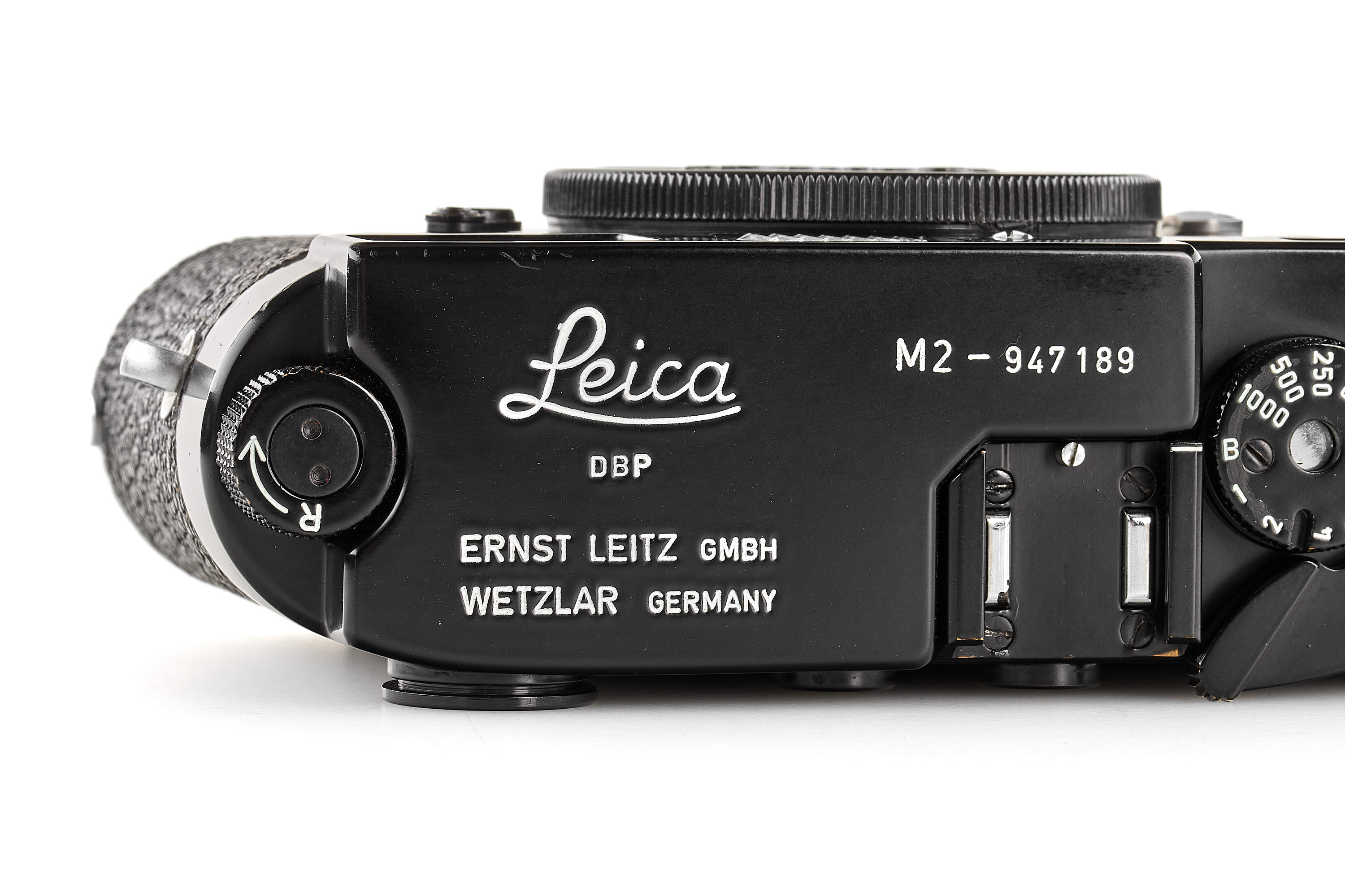 An early Leica M2 with button rewind and without a self-timer, originally a chrome version delivered on 02.07.1959, most probably black painted by Leica in 1962, in mint condition, shutter needs attention, with body cap.