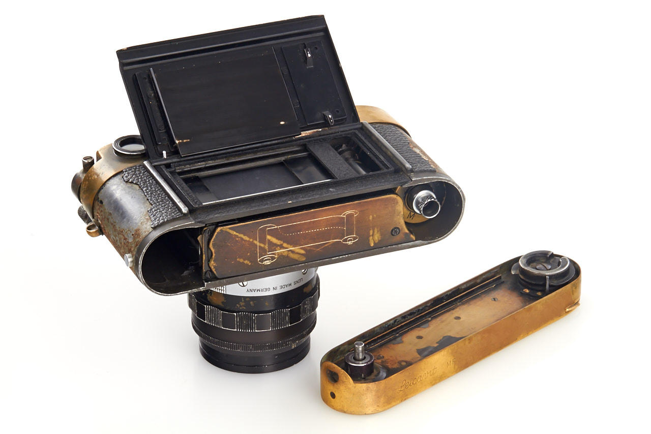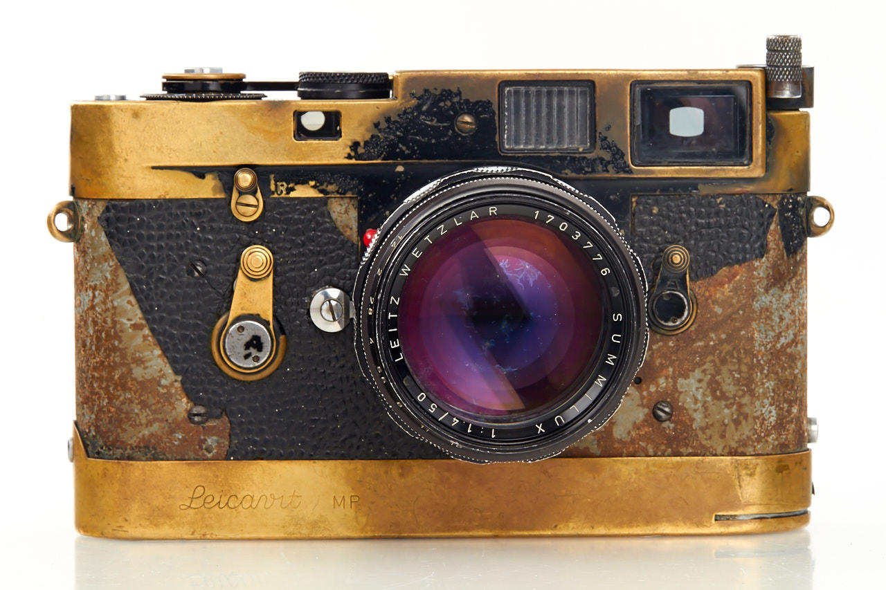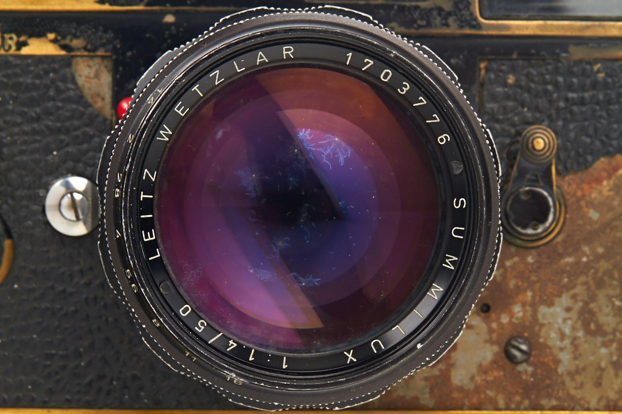 heavy used black paint body with Leicavit MP and black paint Summilux 1.4/50mm no.1703776 (rear part was changed during a repair with chrome part) with clean optics, camera and Leicavit in perfect working order with clean finder and smooth shutter - a fantastic piece of photo journalism from the famous US Magnum photographer Paul Fusco - with his letter of confirmation