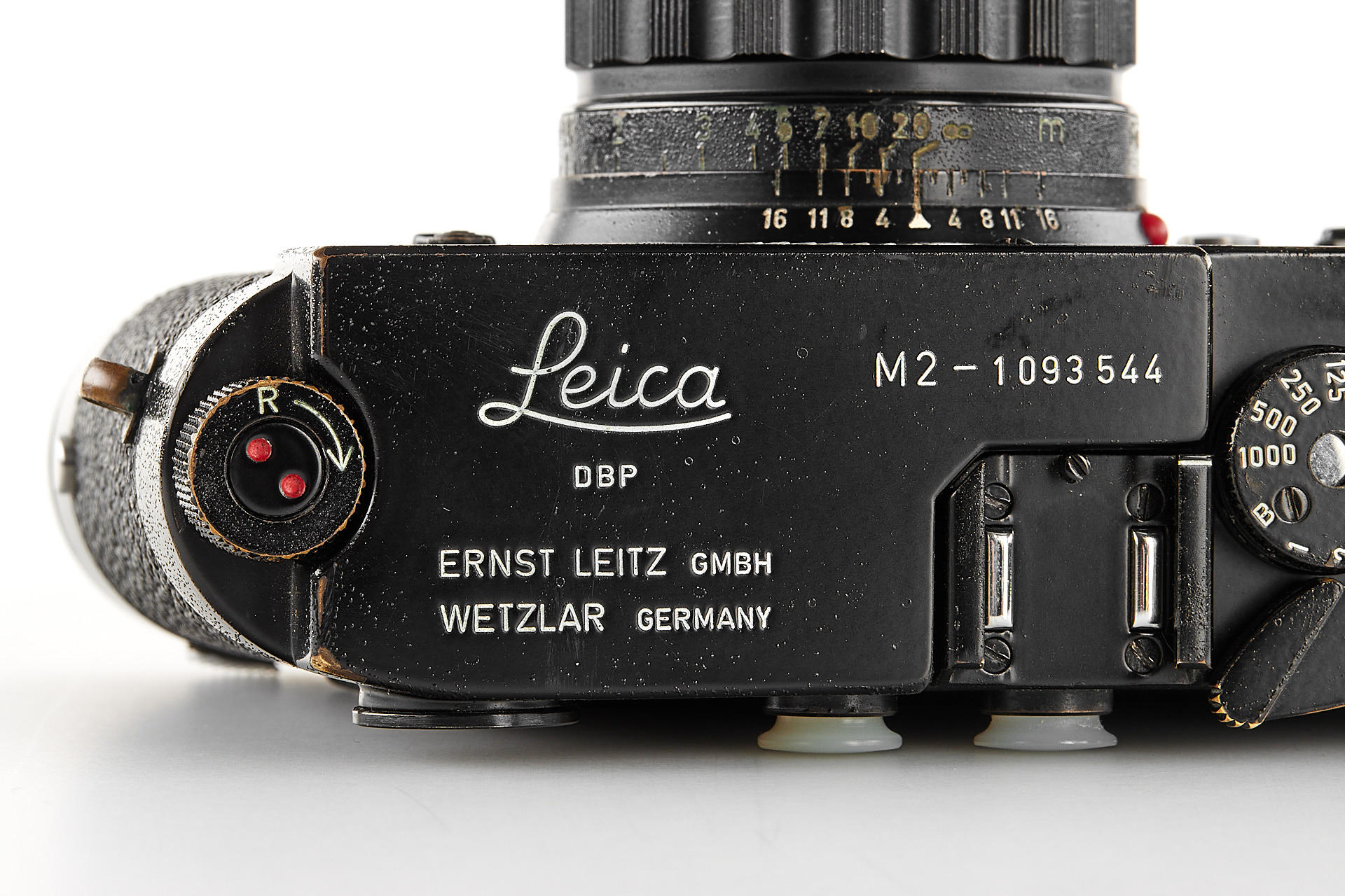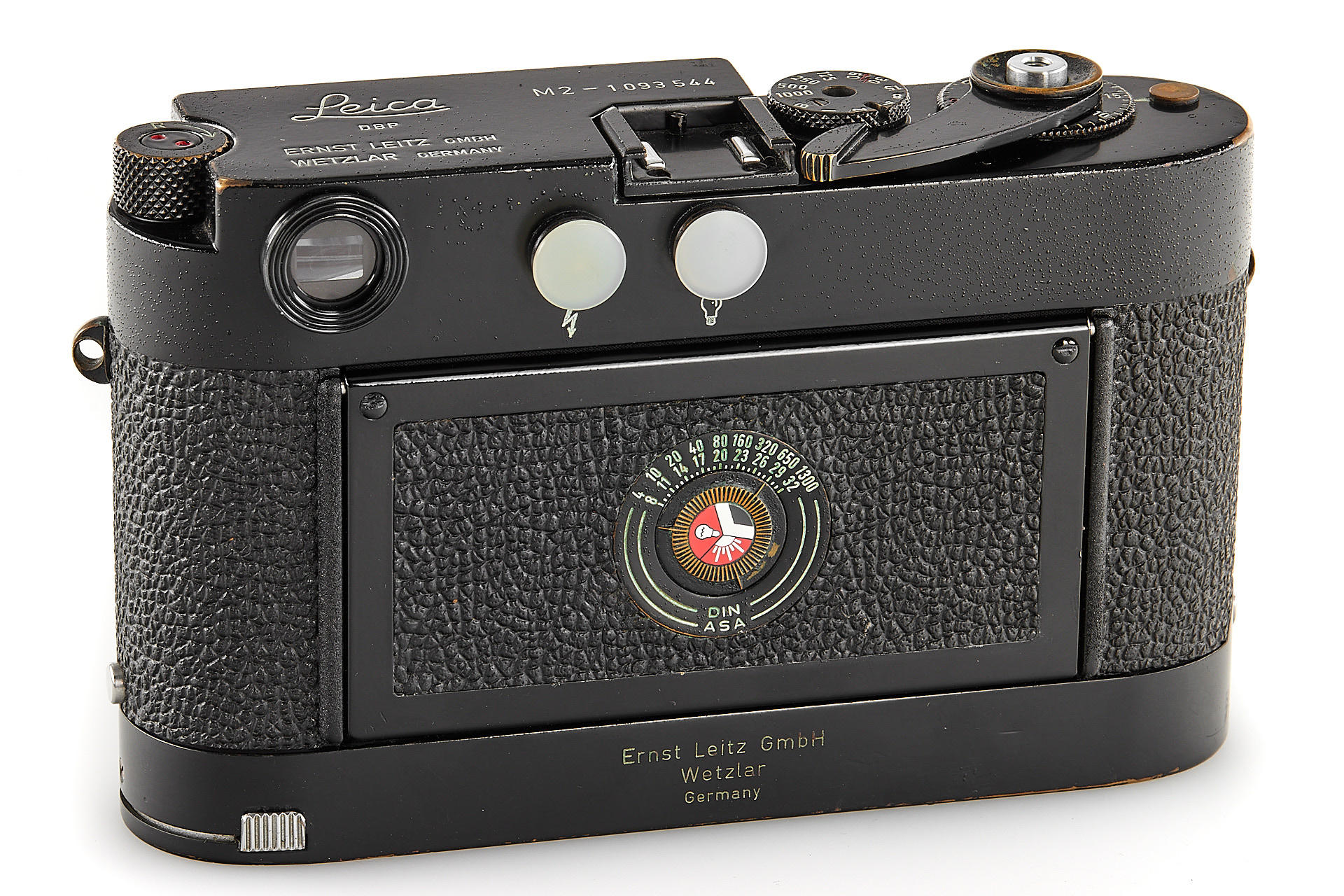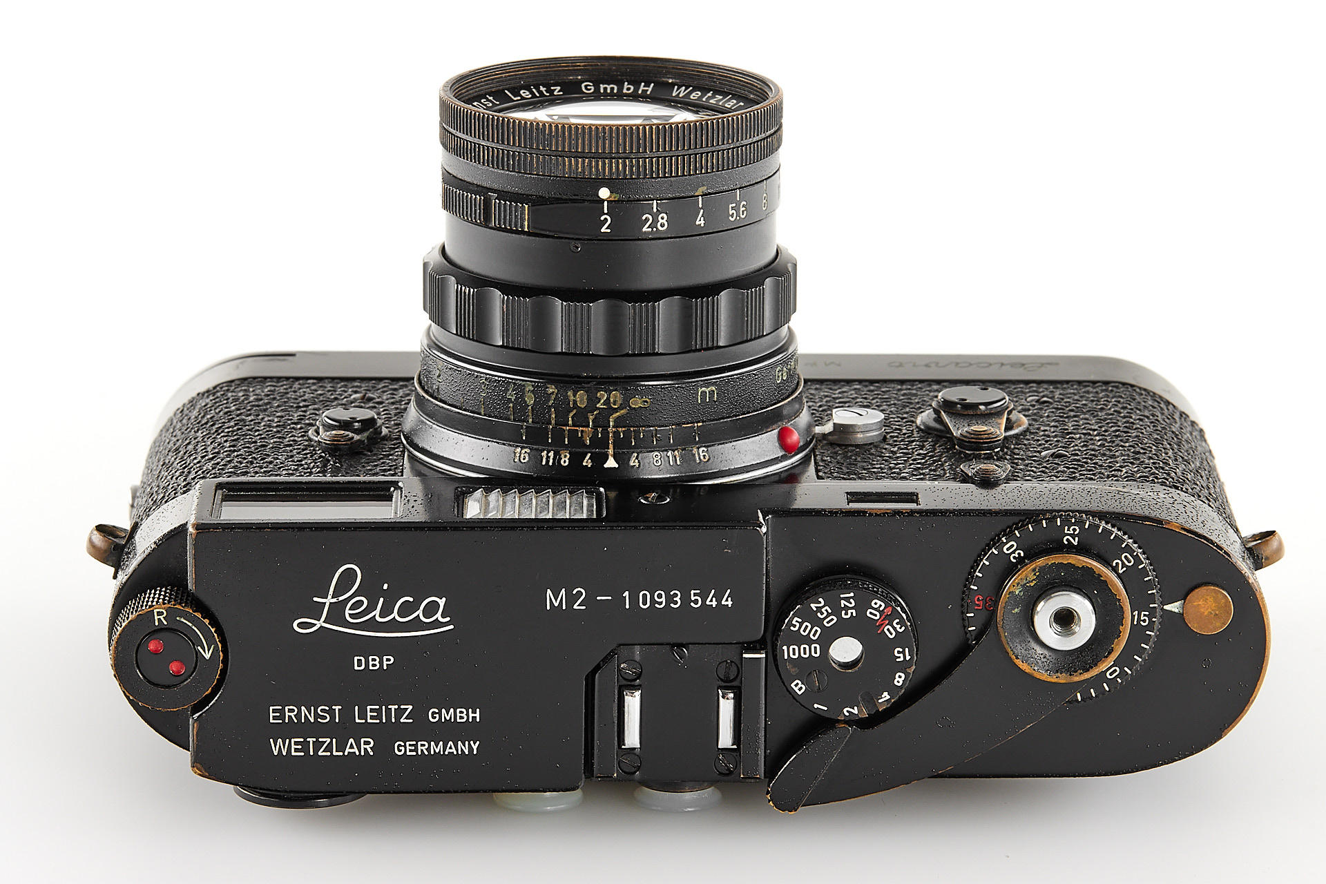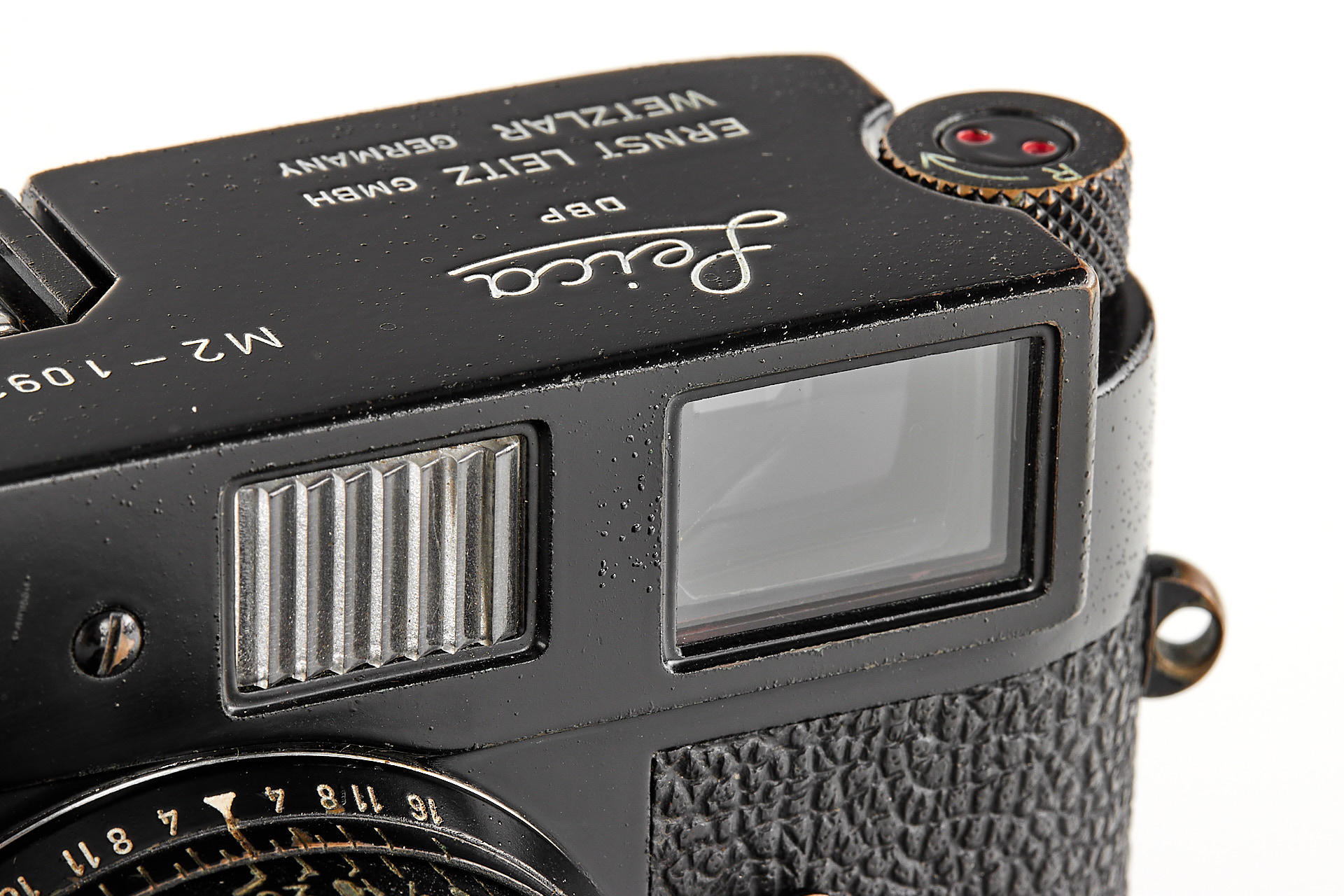 sought-after black paint M2 in amazing, original condition with characteristic tiny bubbles appearing on the paint, with matching black paint Summicron 2/5cm no.1587458, black paint Leicavit MP (sought after early version), black paint lens cap and original, very rare leather case for M camera with attached Leicavit MP, a unique first-owner outfit and one of the best examples of this rare camera we have seen!