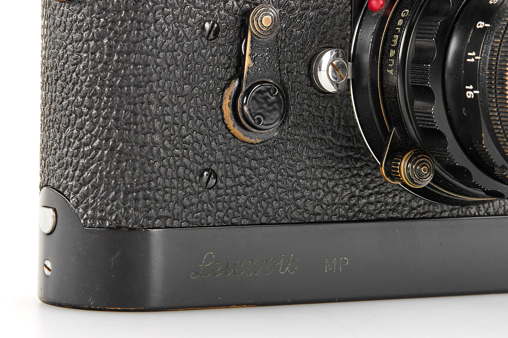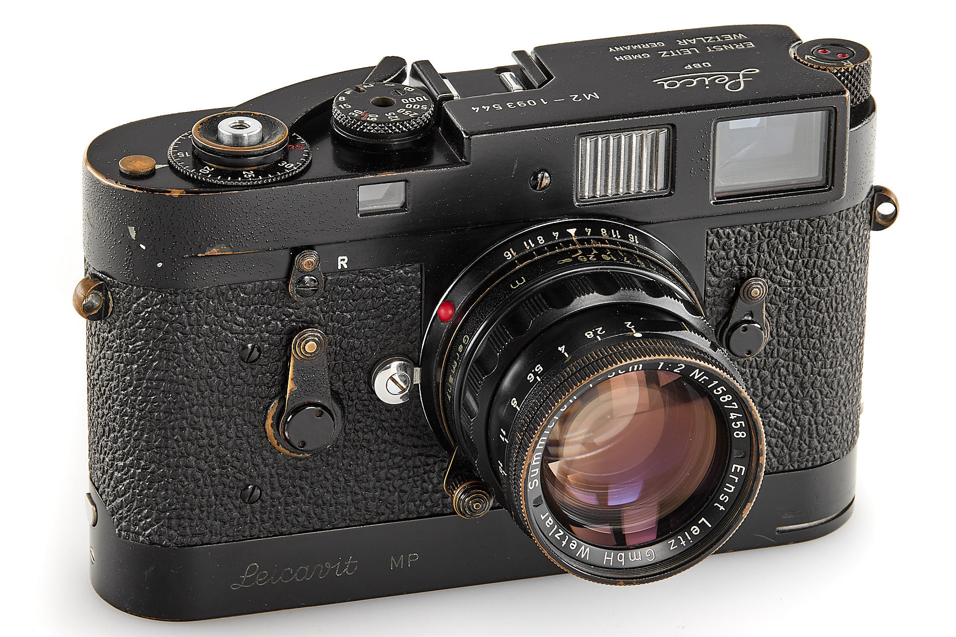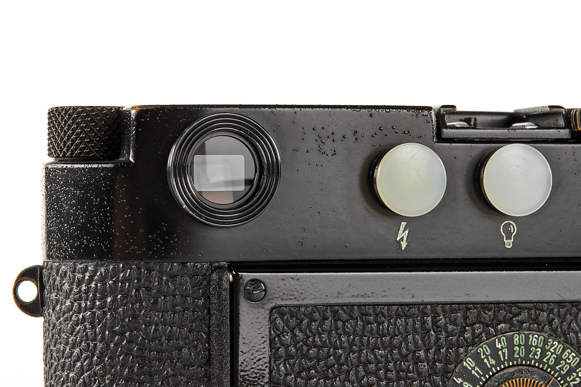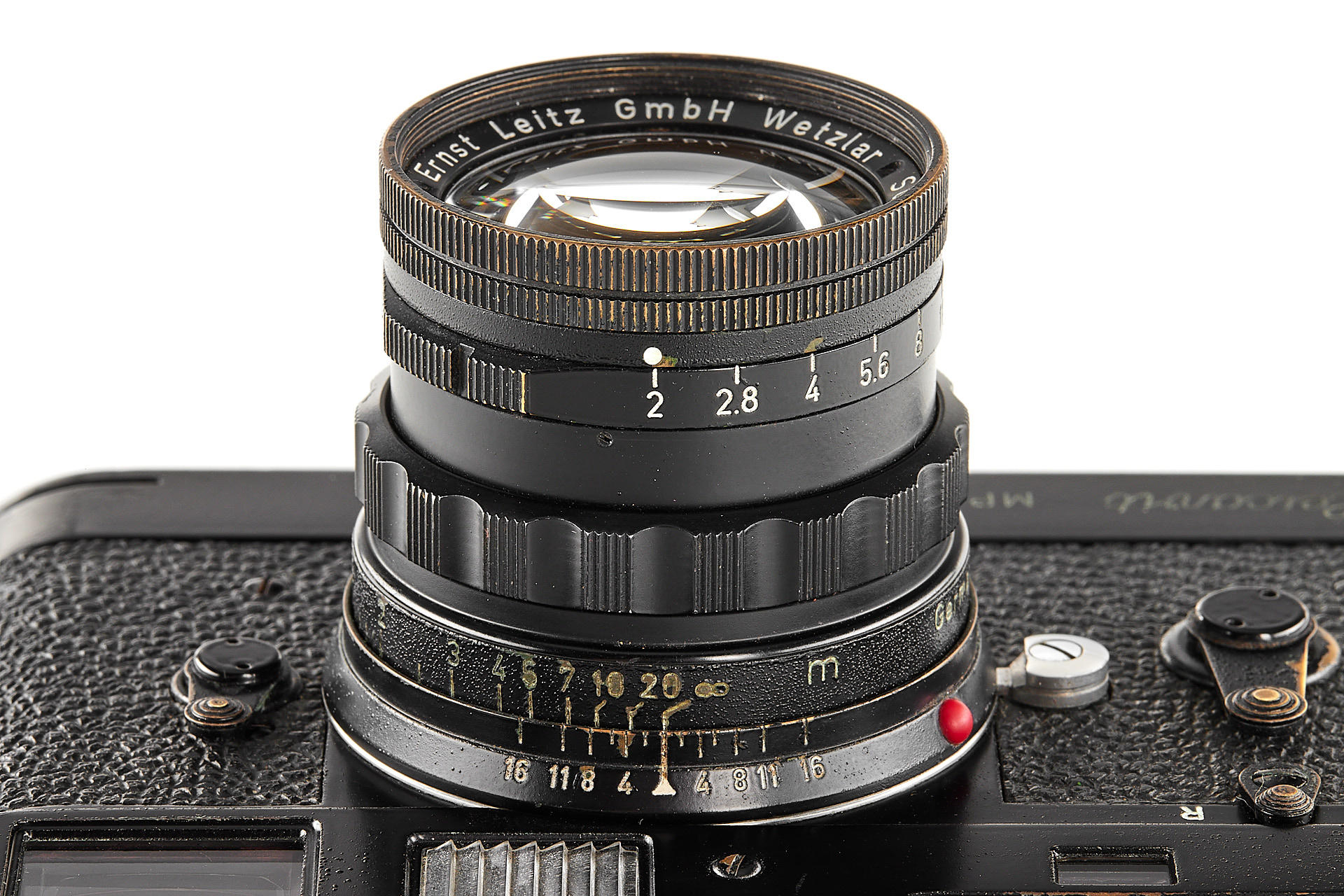 sought-after black paint M2 in amazing, original condition with characteristic tiny bubbles appearing on the paint, with matching black paint Summicron 2/5cm no.1587458, black paint Leicavit MP (sought after early version), black paint lens cap and original, very rare leather case for M camera with attached Leicavit MP, a unique first-owner outfit and one of the best examples of this rare camera we have seen!