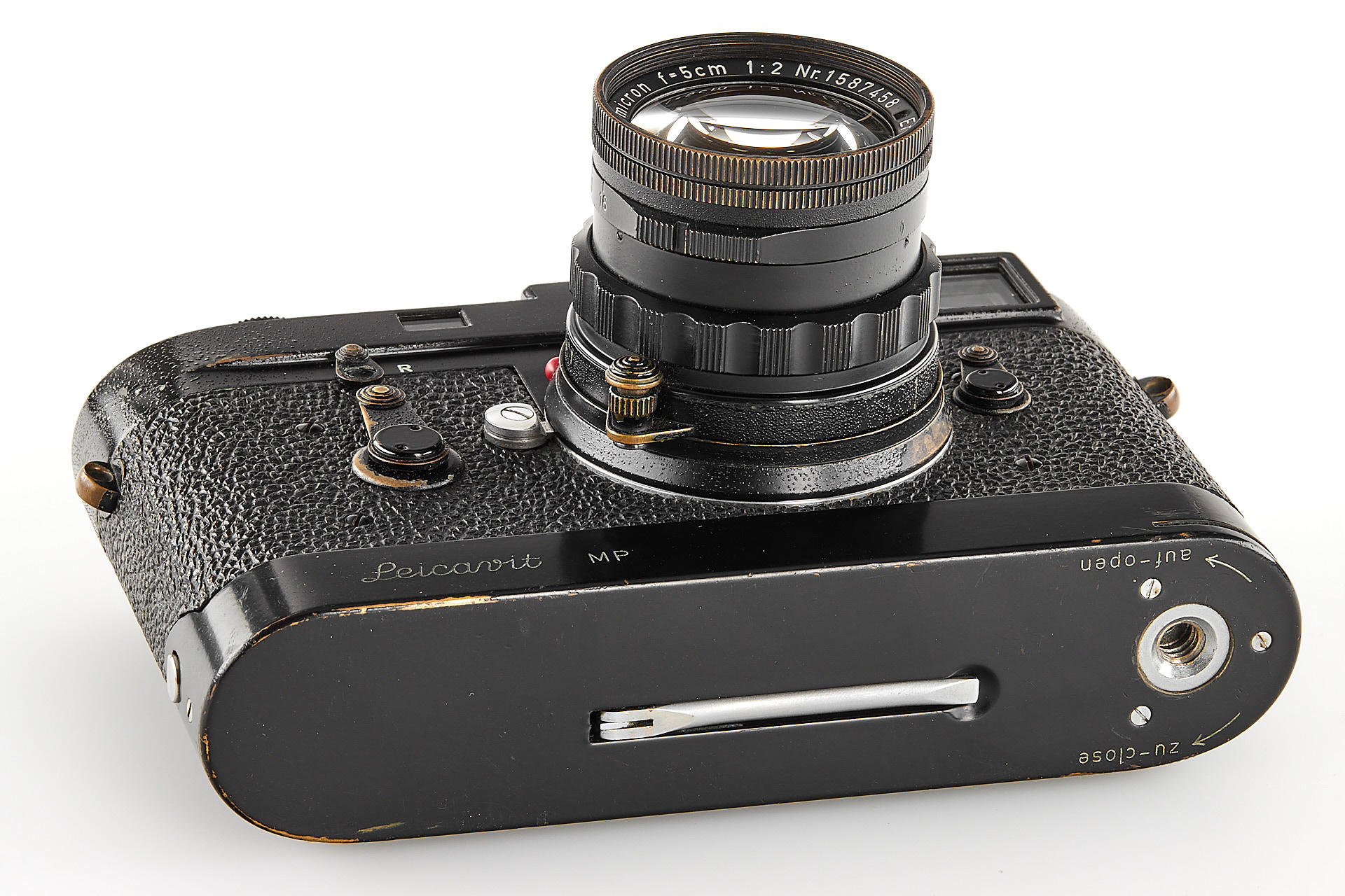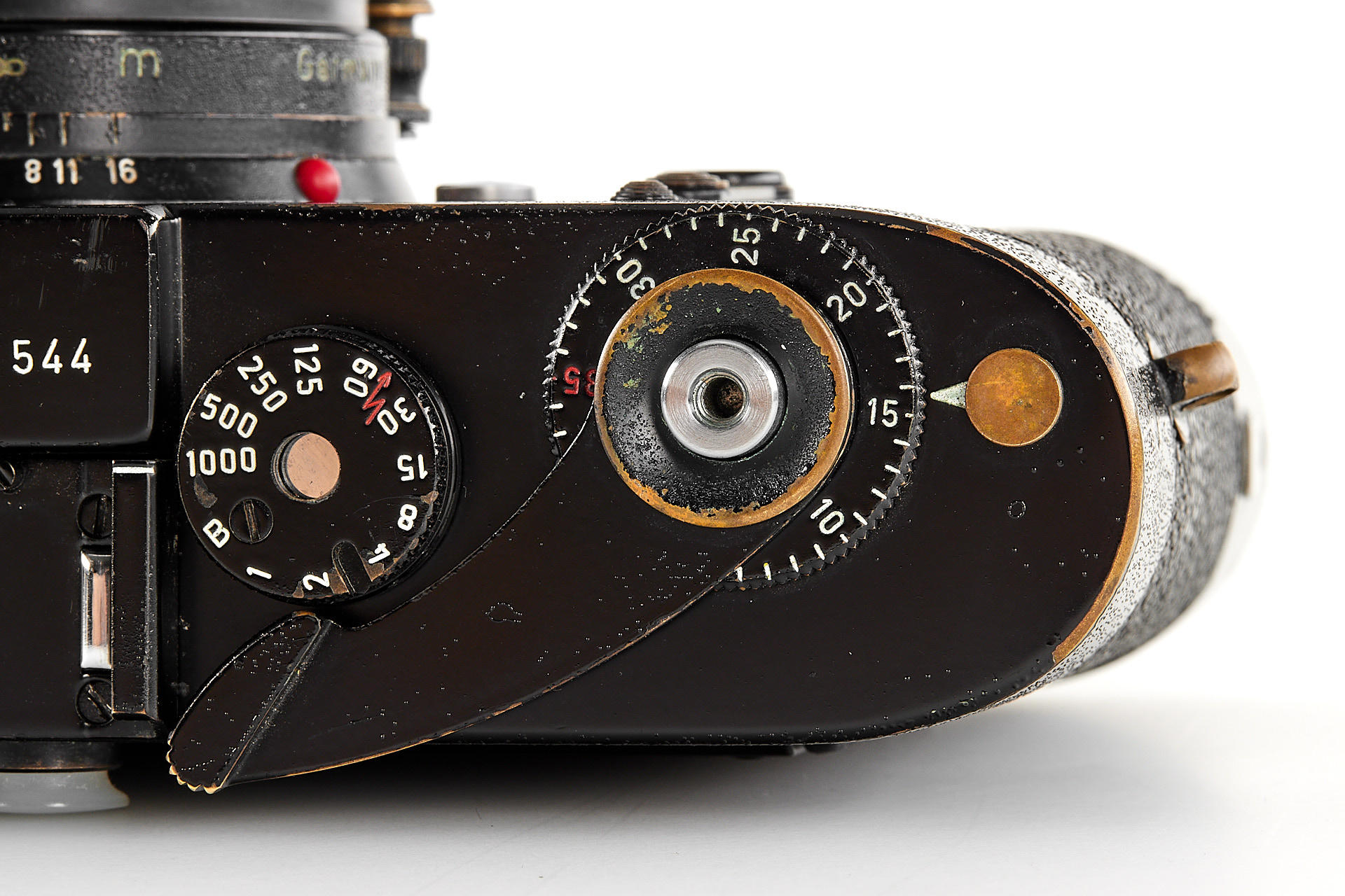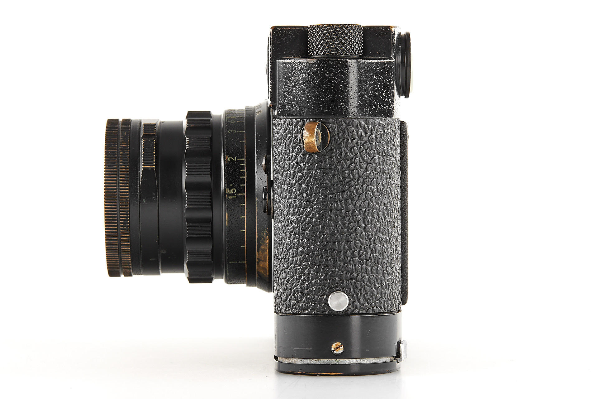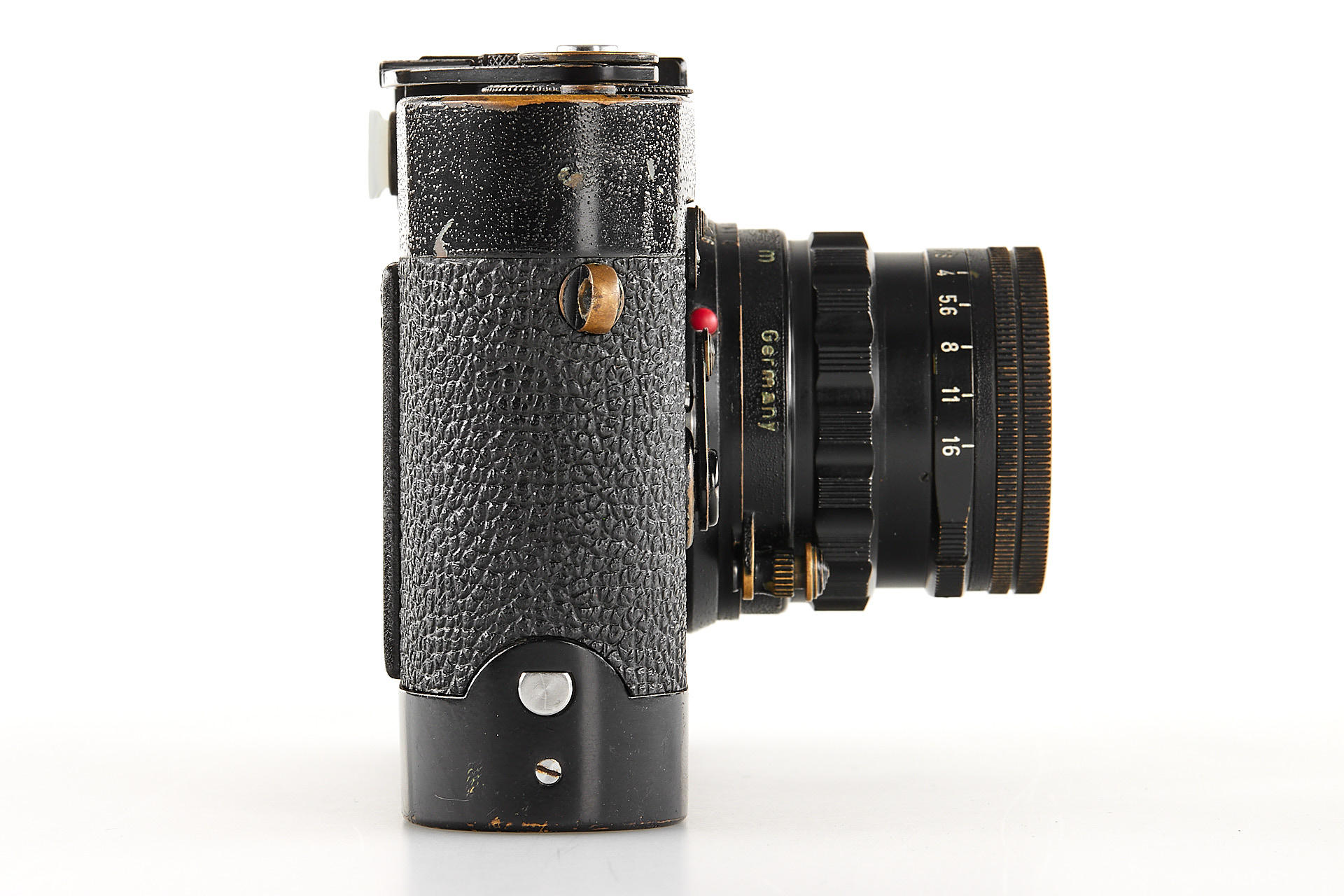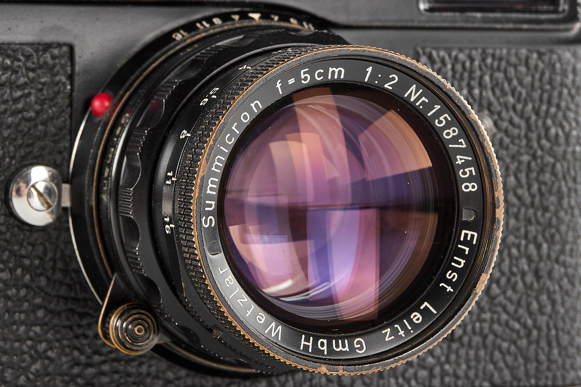 sought-after black paint M2 in amazing, original condition with characteristic tiny bubbles appearing on the paint, with matching black paint Summicron 2/5cm no.1587458, black paint Leicavit MP (sought after early version), black paint lens cap and original, very rare leather case for M camera with attached Leicavit MP, a unique first-owner outfit and one of the best examples of this rare camera we have seen!