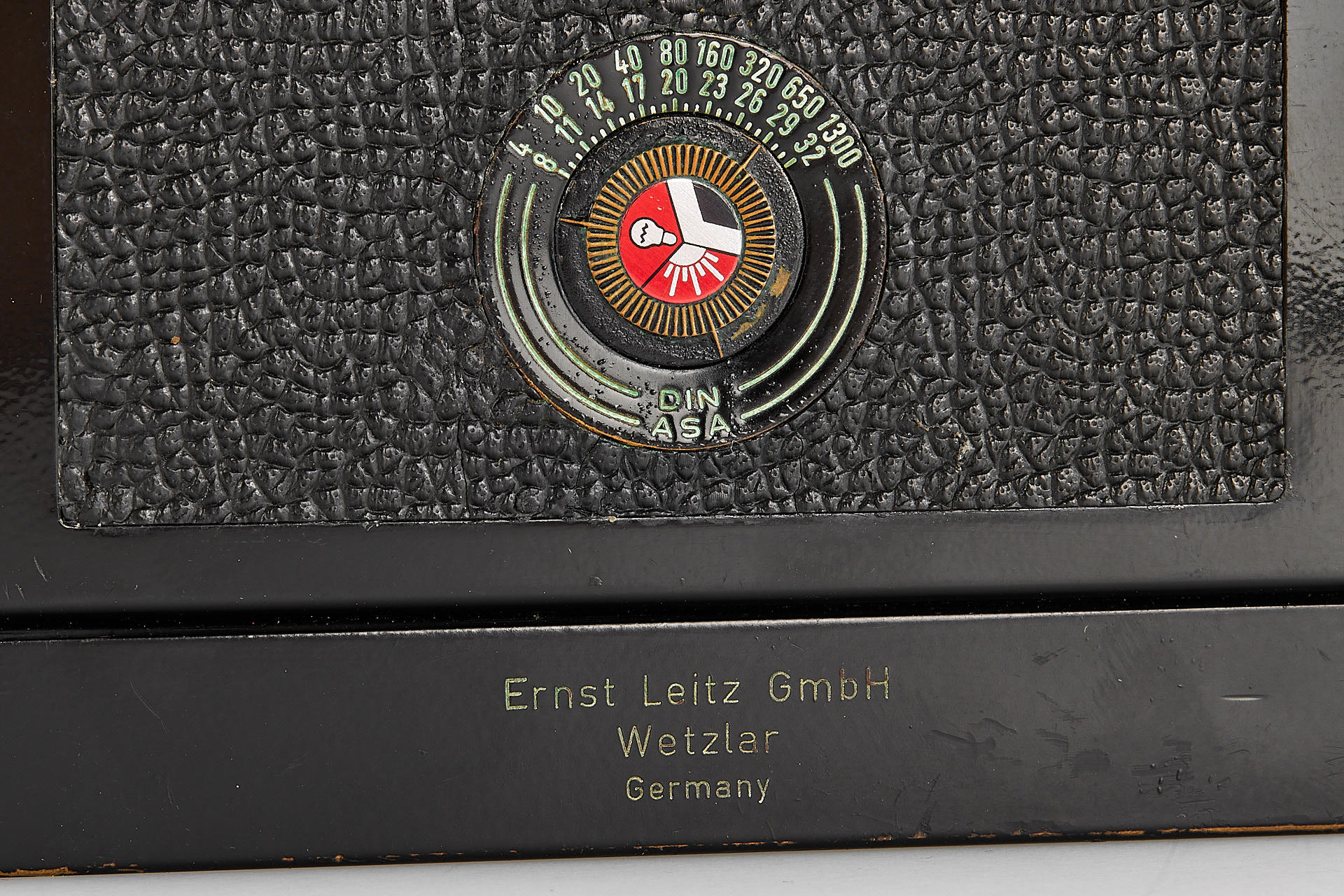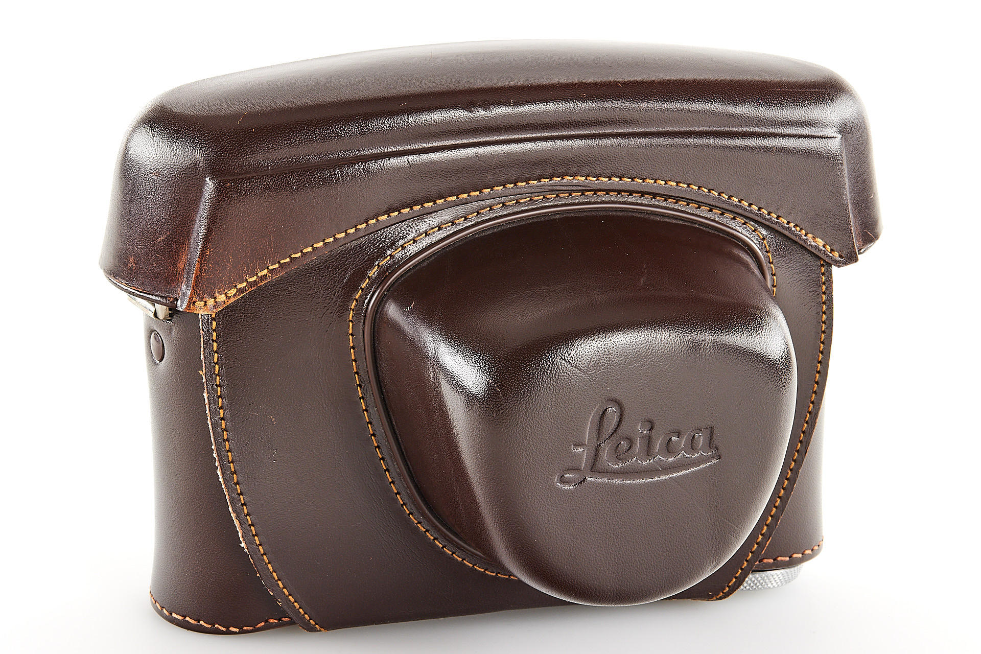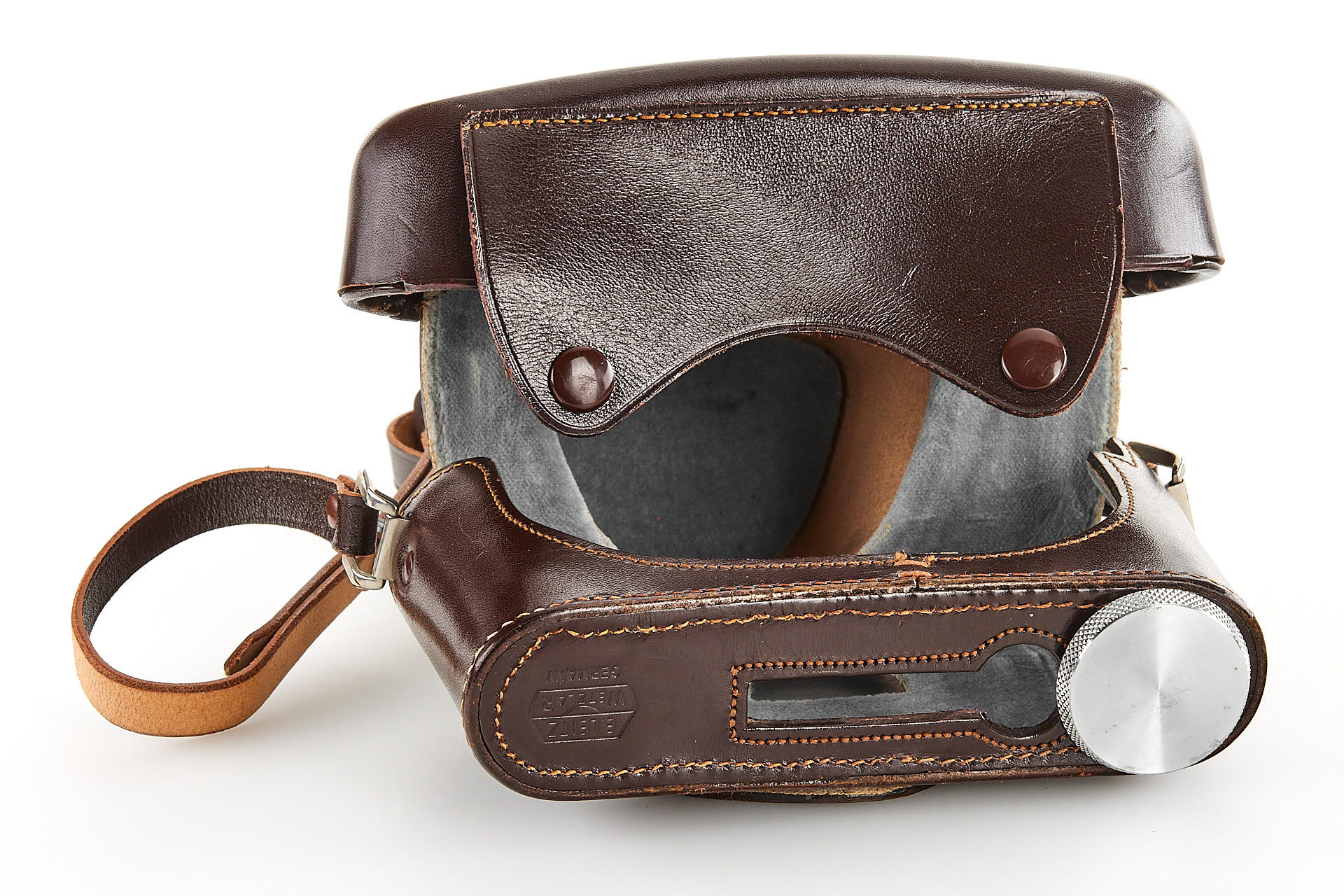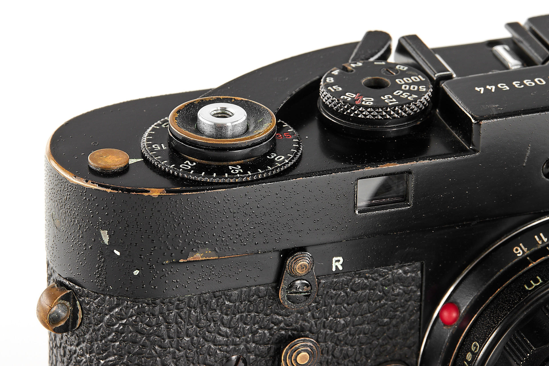sought-after black paint M2 in amazing, original condition with characteristic tiny bubbles appearing on the paint, with matching black paint Summicron 2/5cm no.1587458, black paint Leicavit MP (sought after early version), black paint lens cap and original, very rare leather case for M camera with attached Leicavit MP, a unique first-owner outfit and one of the best examples of this rare camera we have seen!