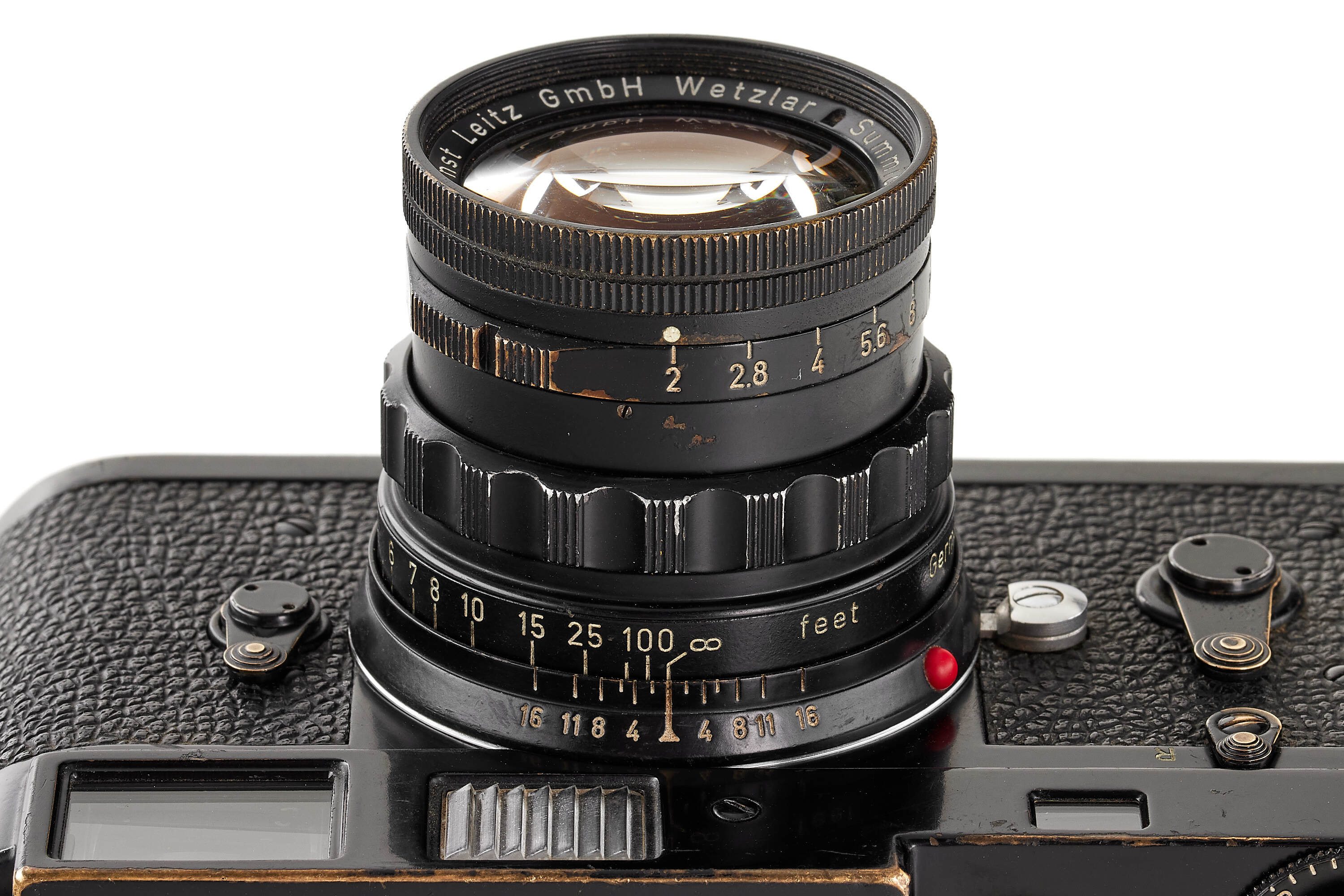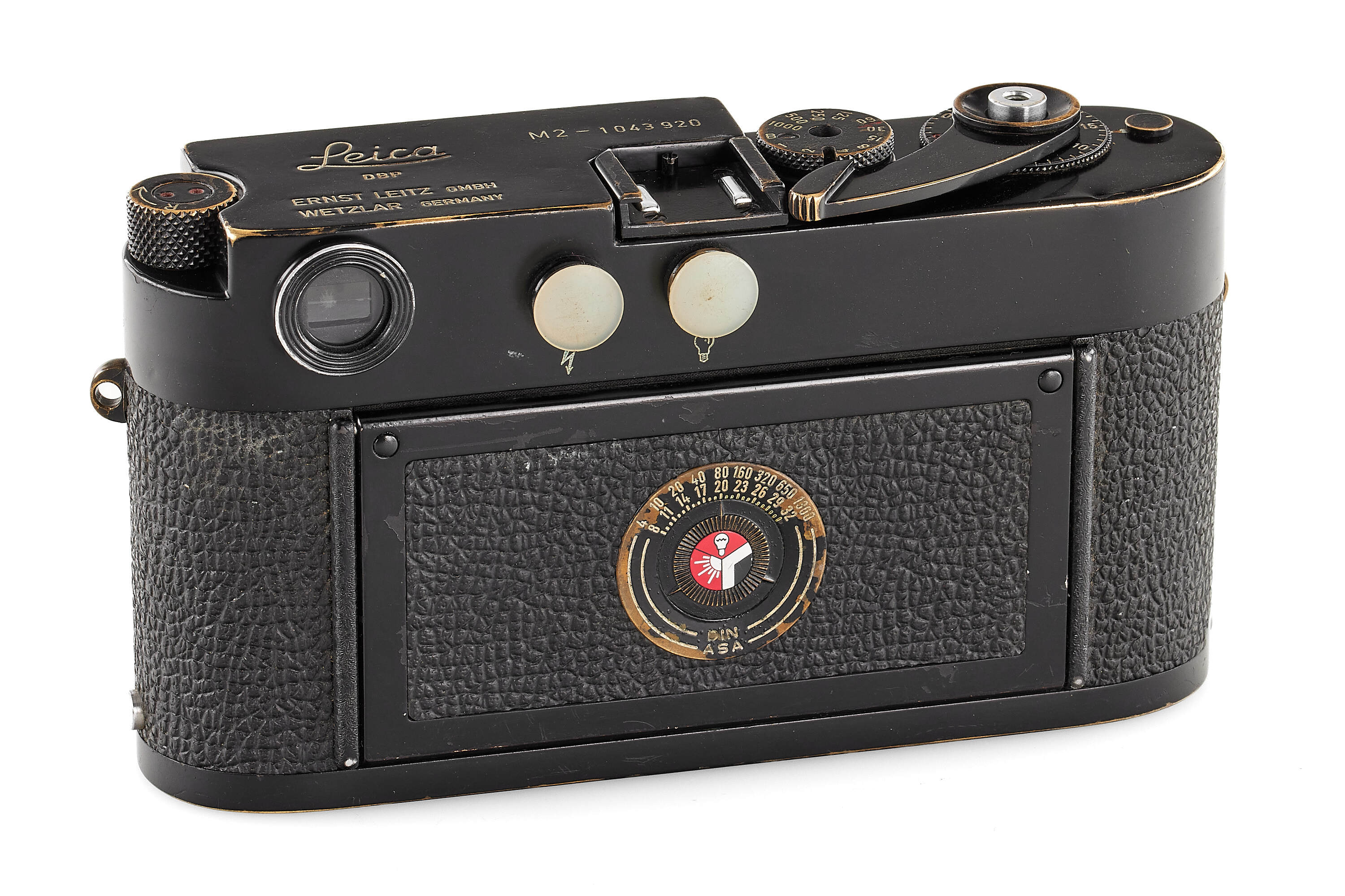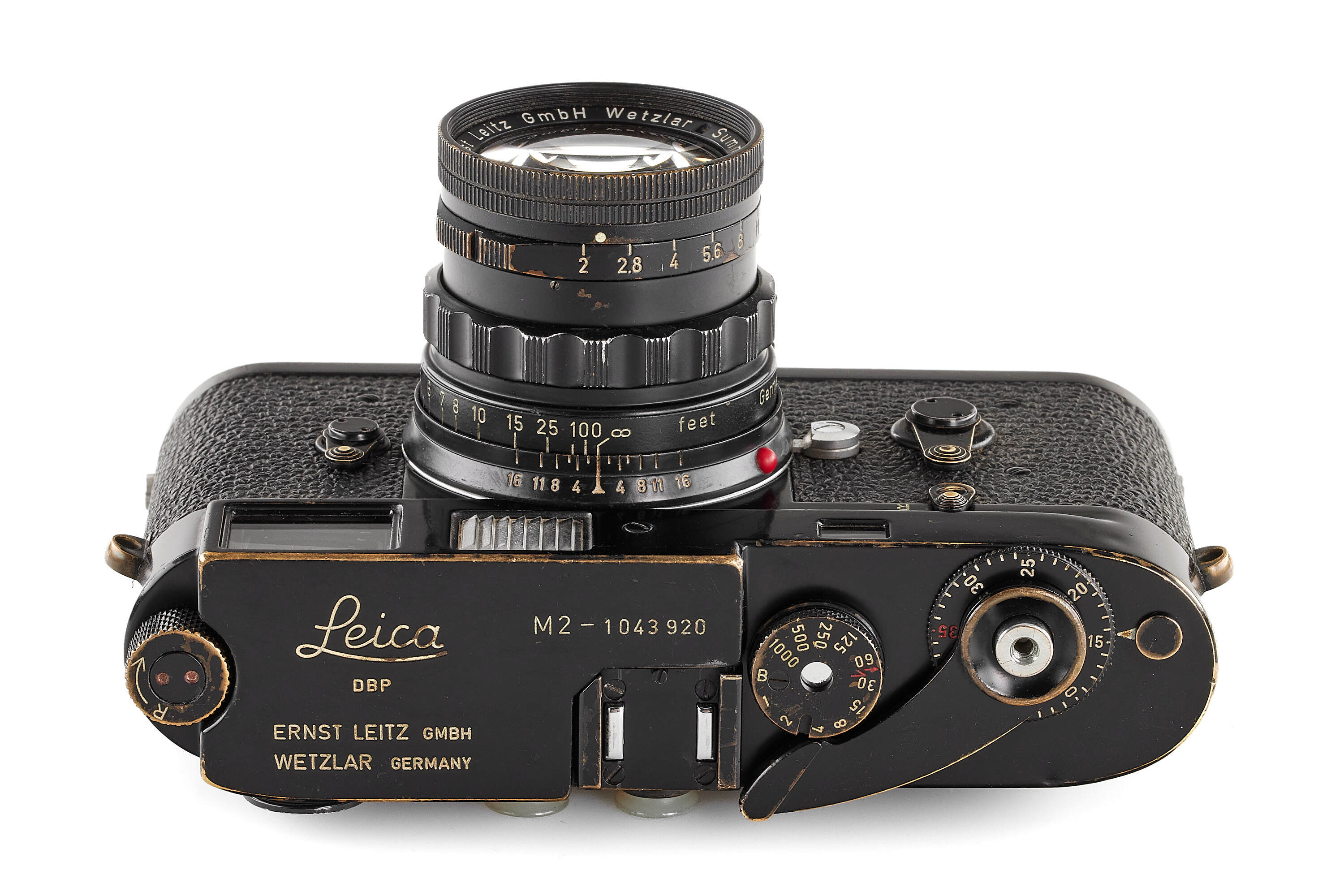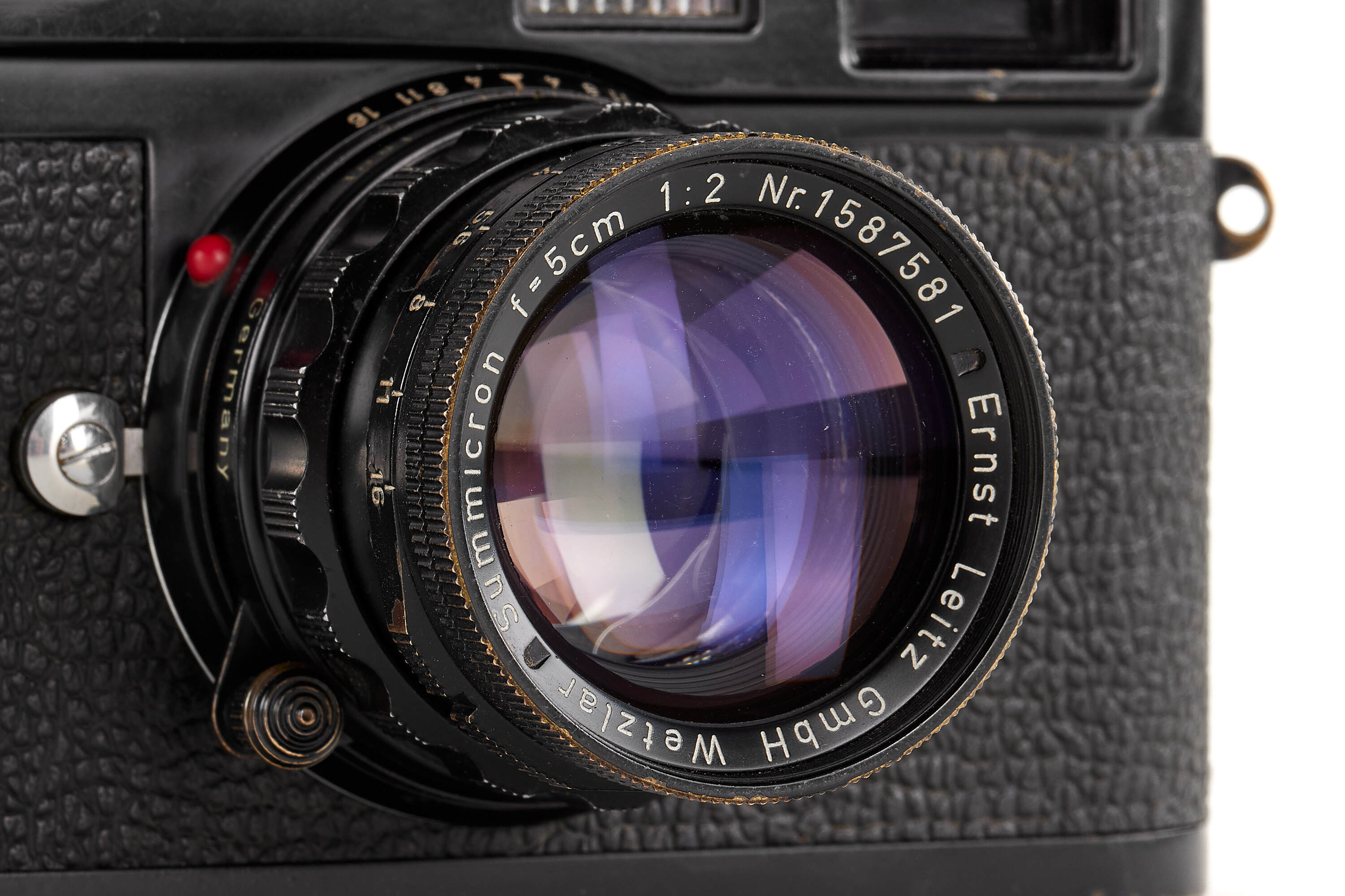 A sought-after original black-paint Leica M2 from an official production batch of 1962–63. In good cosmetic condition with an attractive, even patina. Accompanied by a black-paint/brass-mount Summicron 5 cm f/2 no. 1587581, with a black-paint front cap and 12585H hood. Both the camera and the lens were delivered together to New Zealand on 4 December 1963.