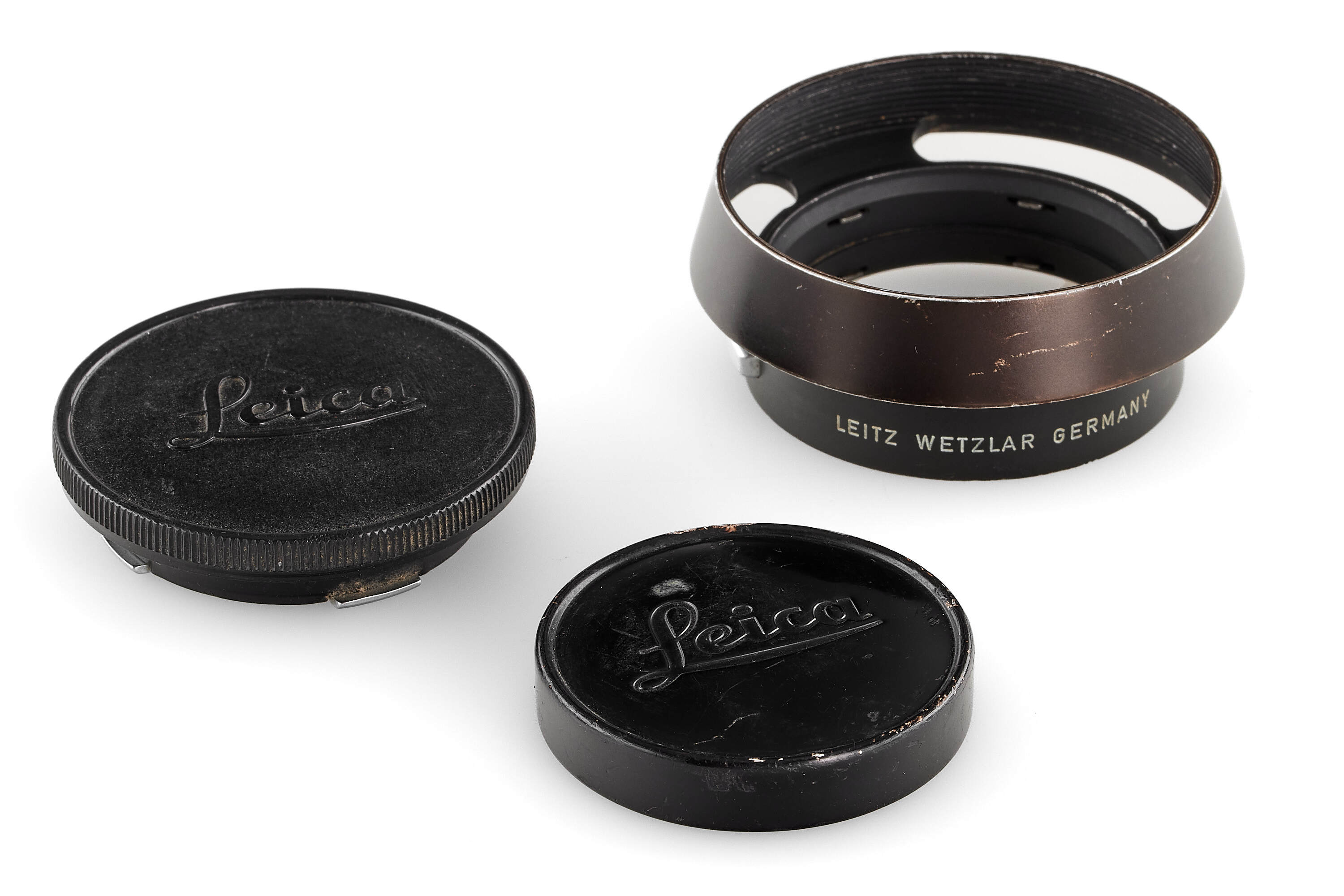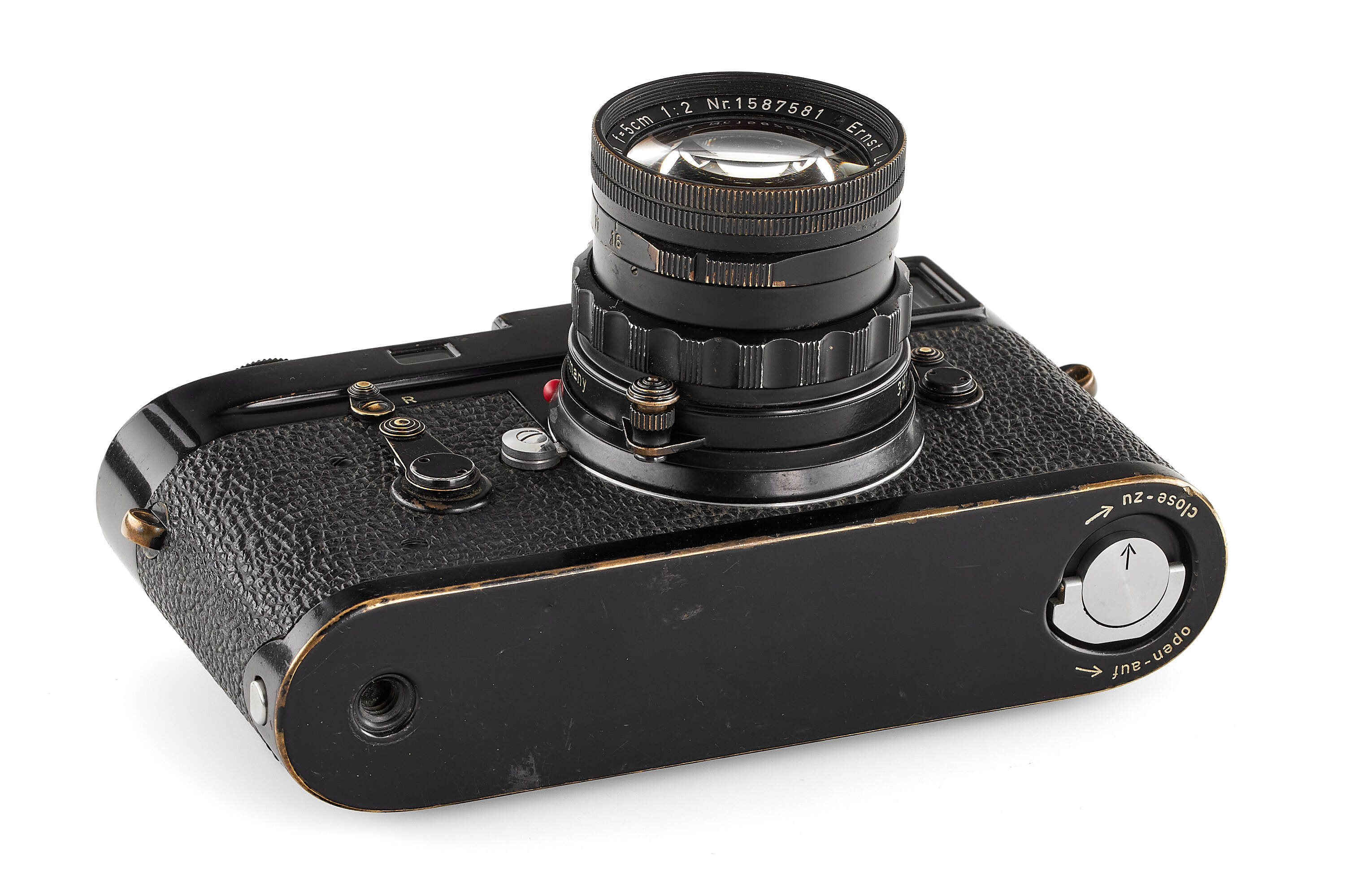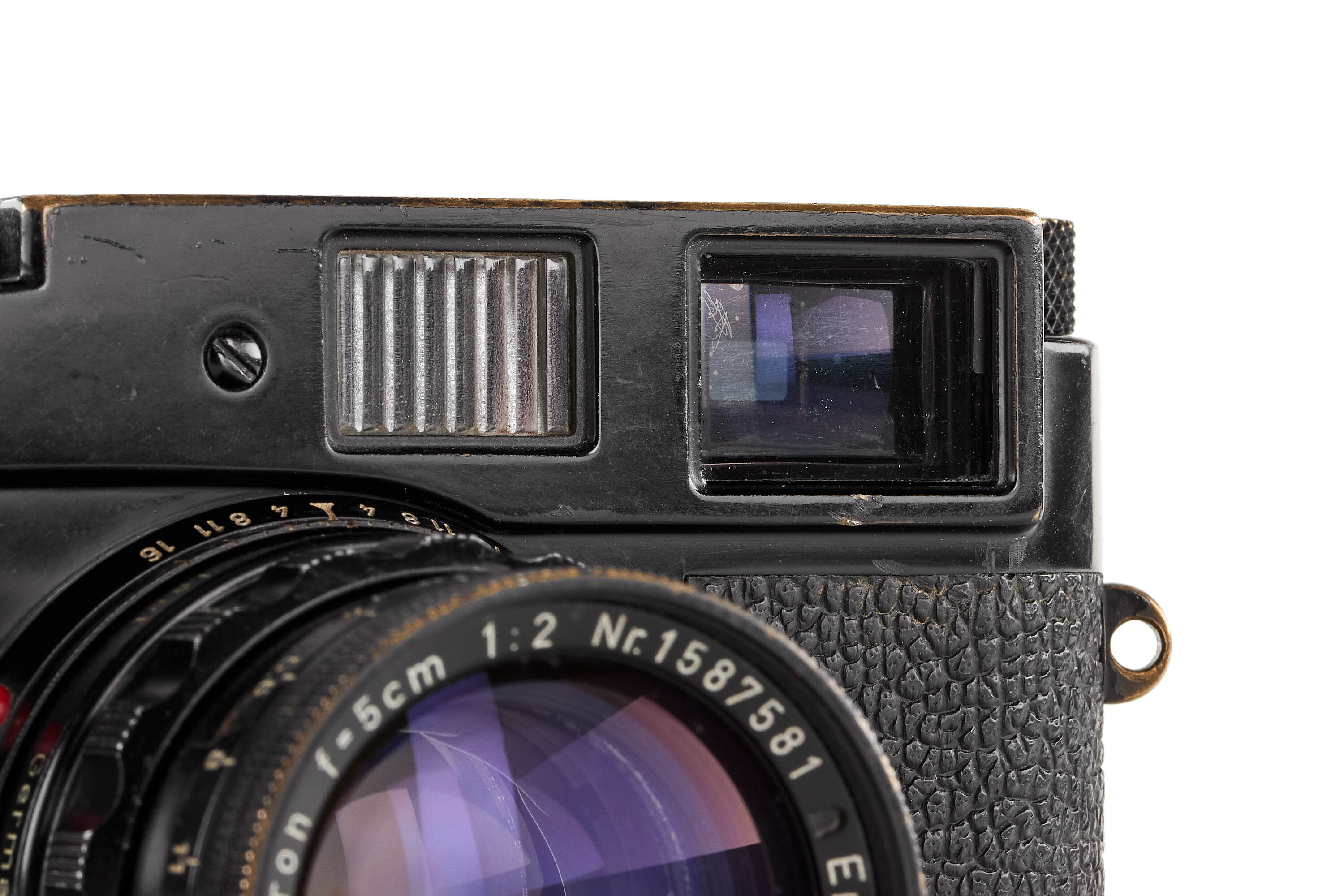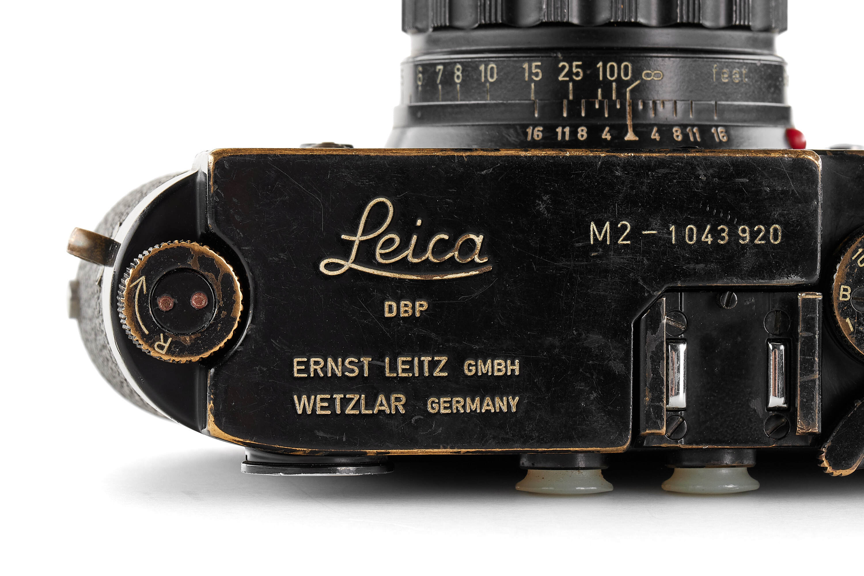 A sought-after original black-paint Leica M2 from an official production batch of 1962–63. In good cosmetic condition with an attractive, even patina. Accompanied by a black-paint/brass-mount Summicron 5 cm f/2 no. 1587581, with a black-paint front cap and 12585H hood. Both the camera and the lens were delivered together to New Zealand on 4 December 1963.