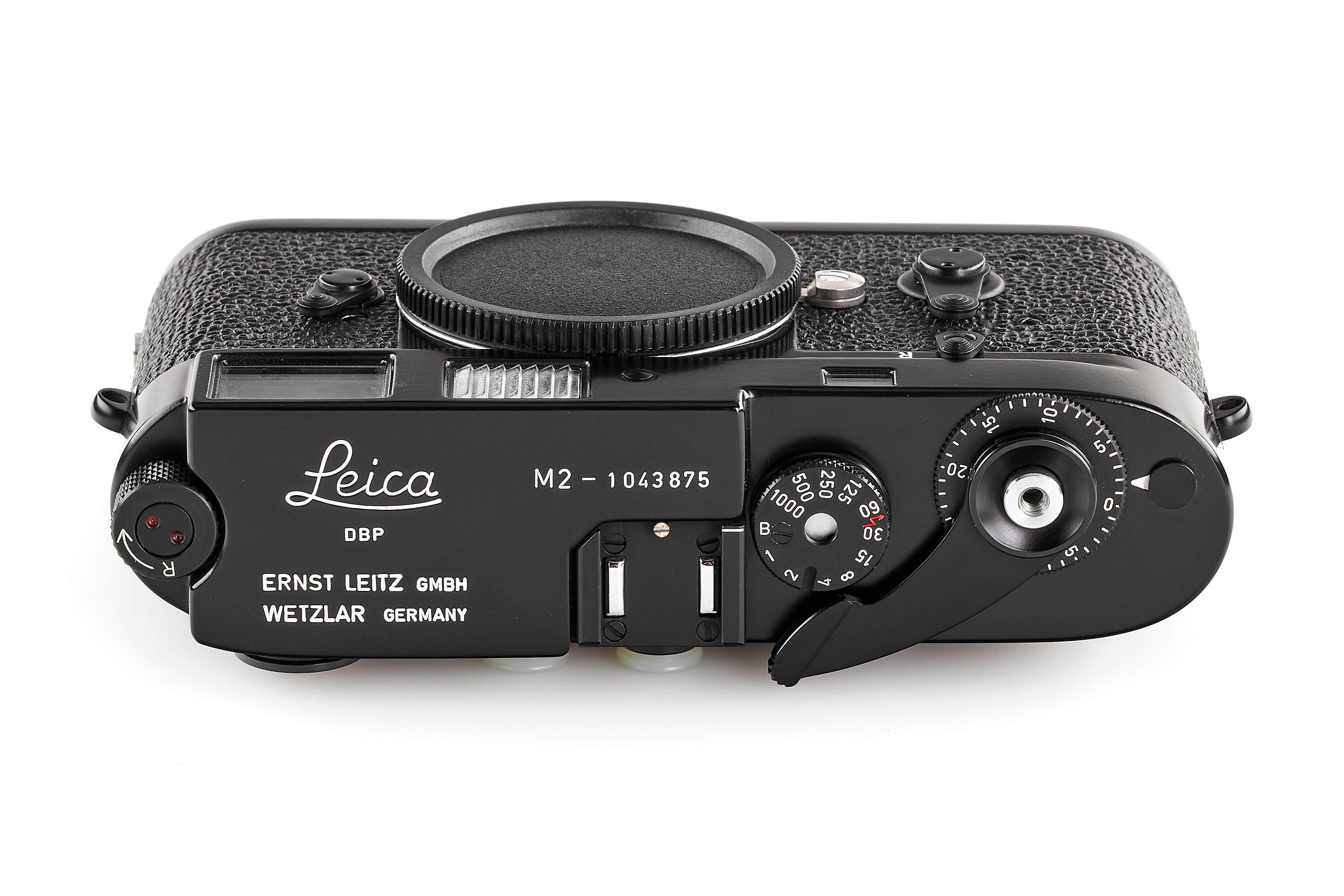 A rare, sought-after black paint Leica M2, from an official batch of 200 cameras with self-timer (numbers 1043801 to 1044000), in outstanding mint condition - completely restored by Leica around 1960s (new type top plate, some elements black/chrome), with body cap and control tag, initially delivered to retailer Cattaneo, Italy, on 09.11.1962.