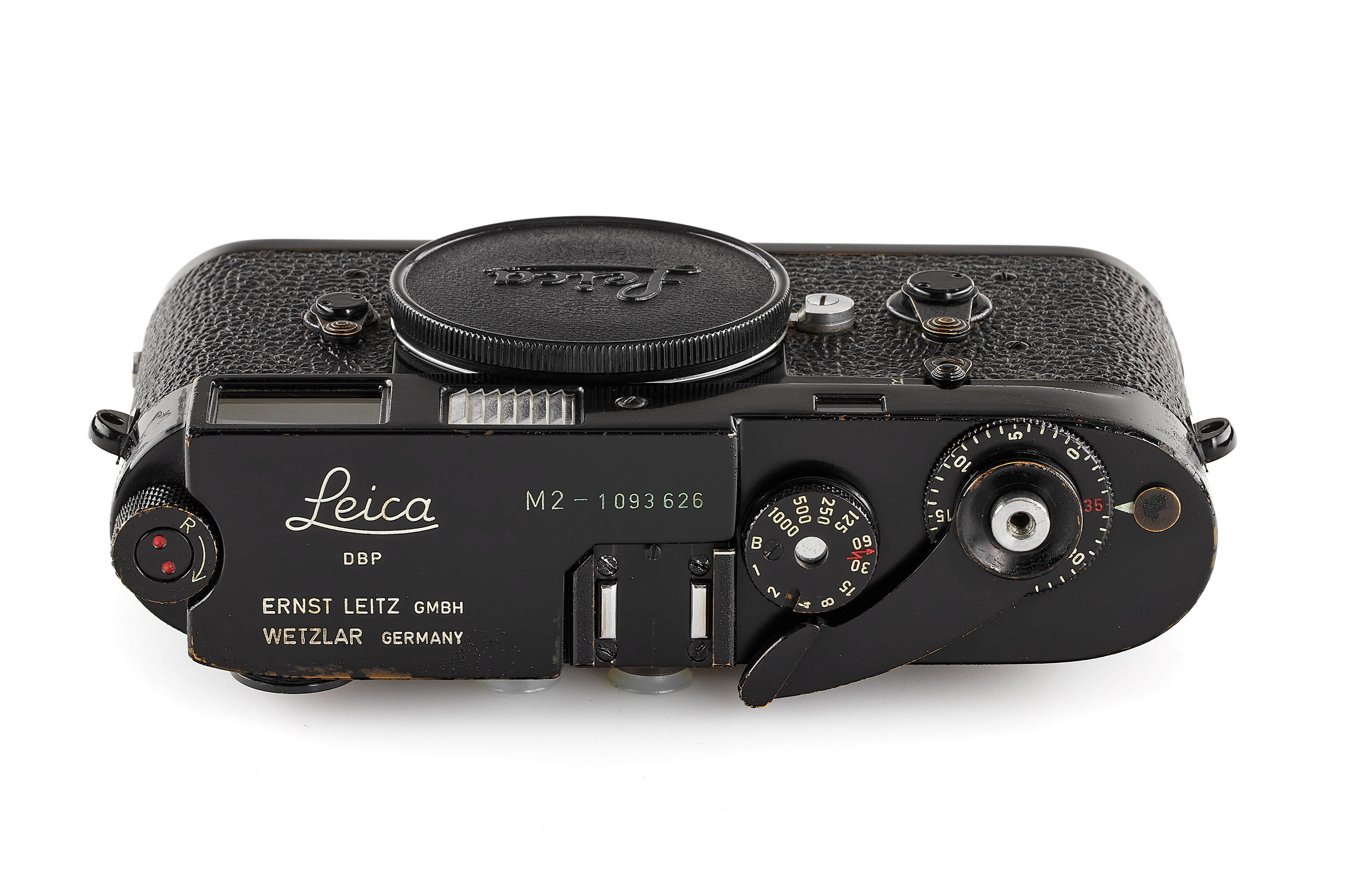 Beautiful rare Leica M2 in original black paint finish, from a batch of 250 units (nos.1093501-10930750) issued in 1964, in very good condition, showing an attractive light patina and small bubbles appearing in paint, later film door and black painted chrome strap lugs , with body cap.