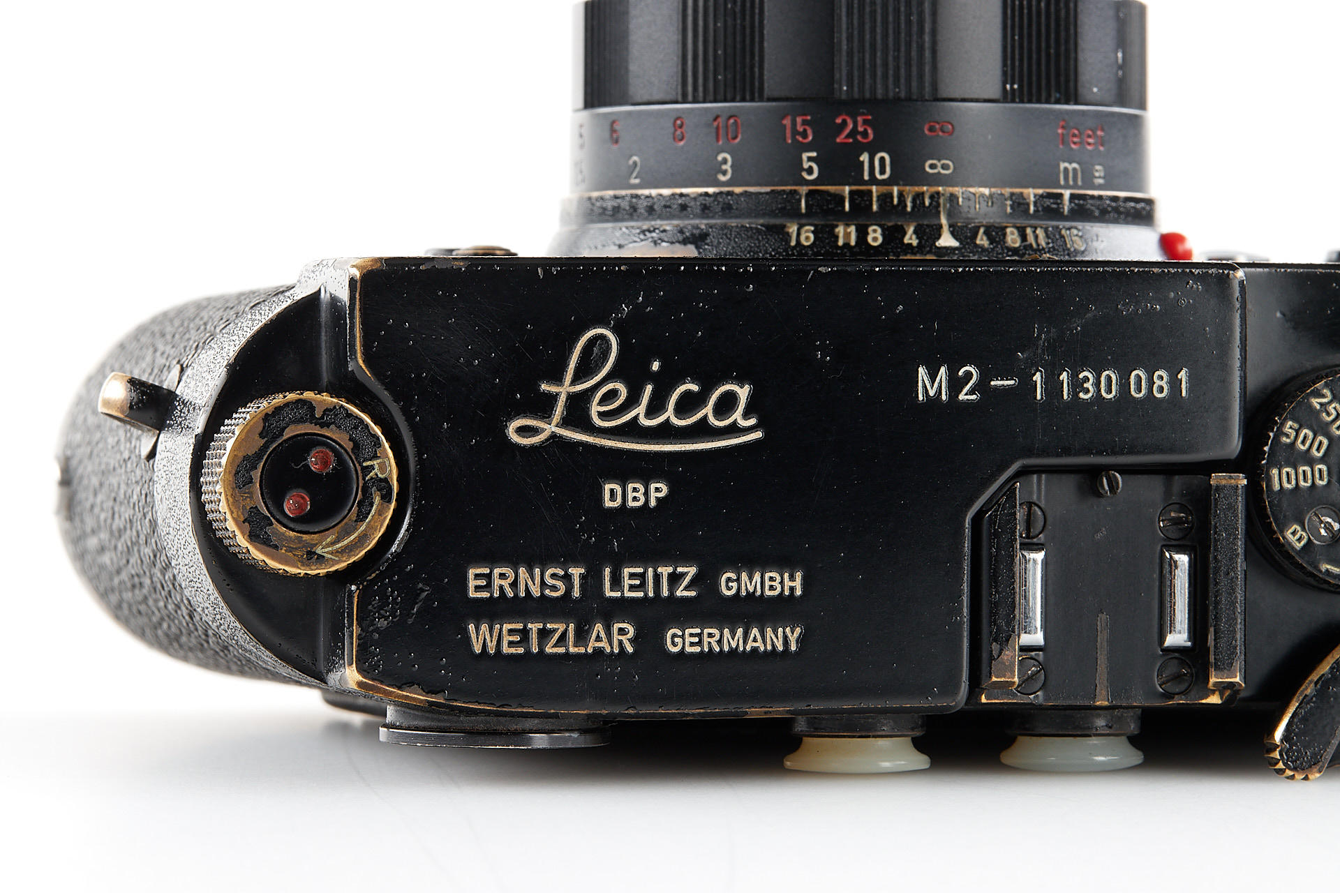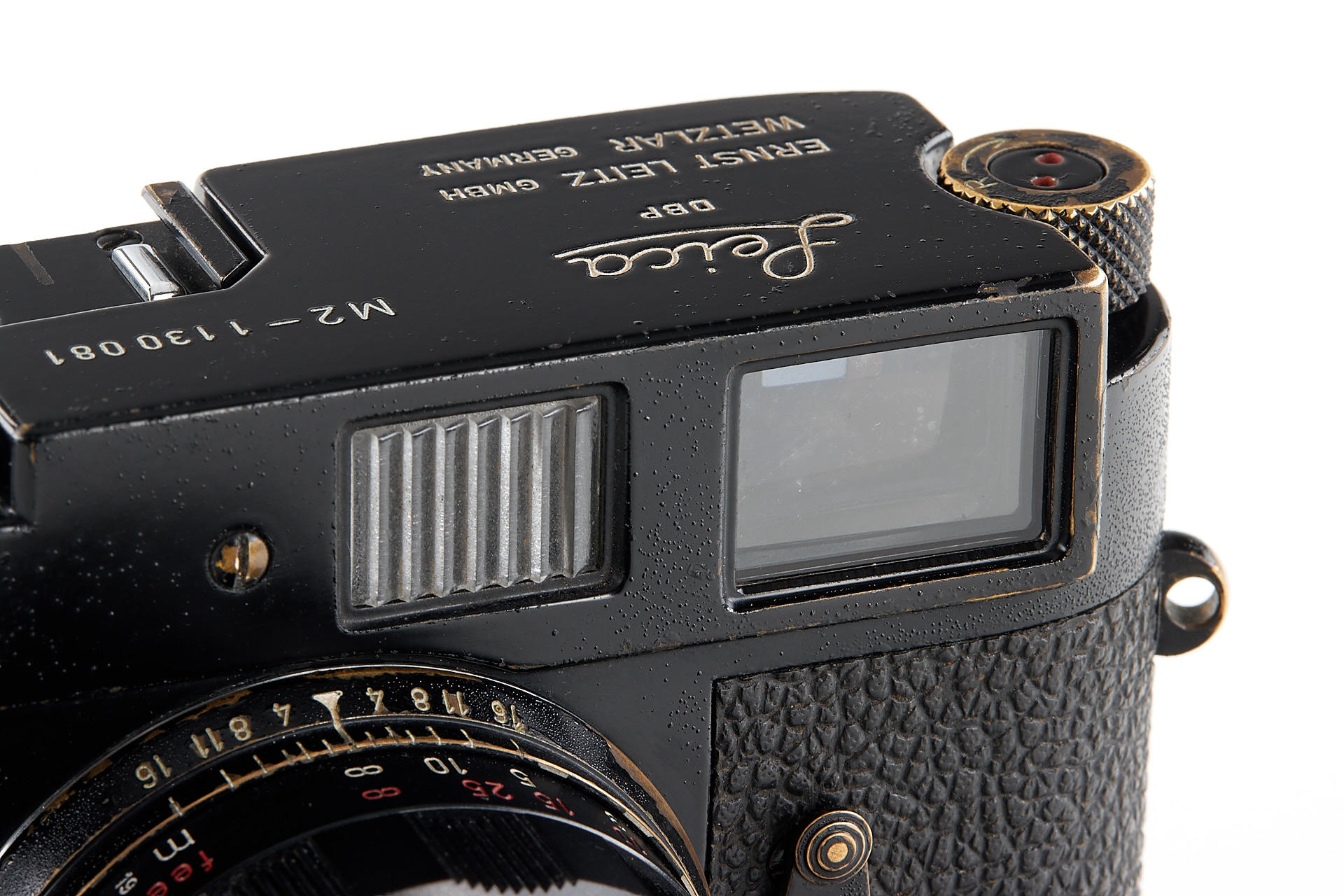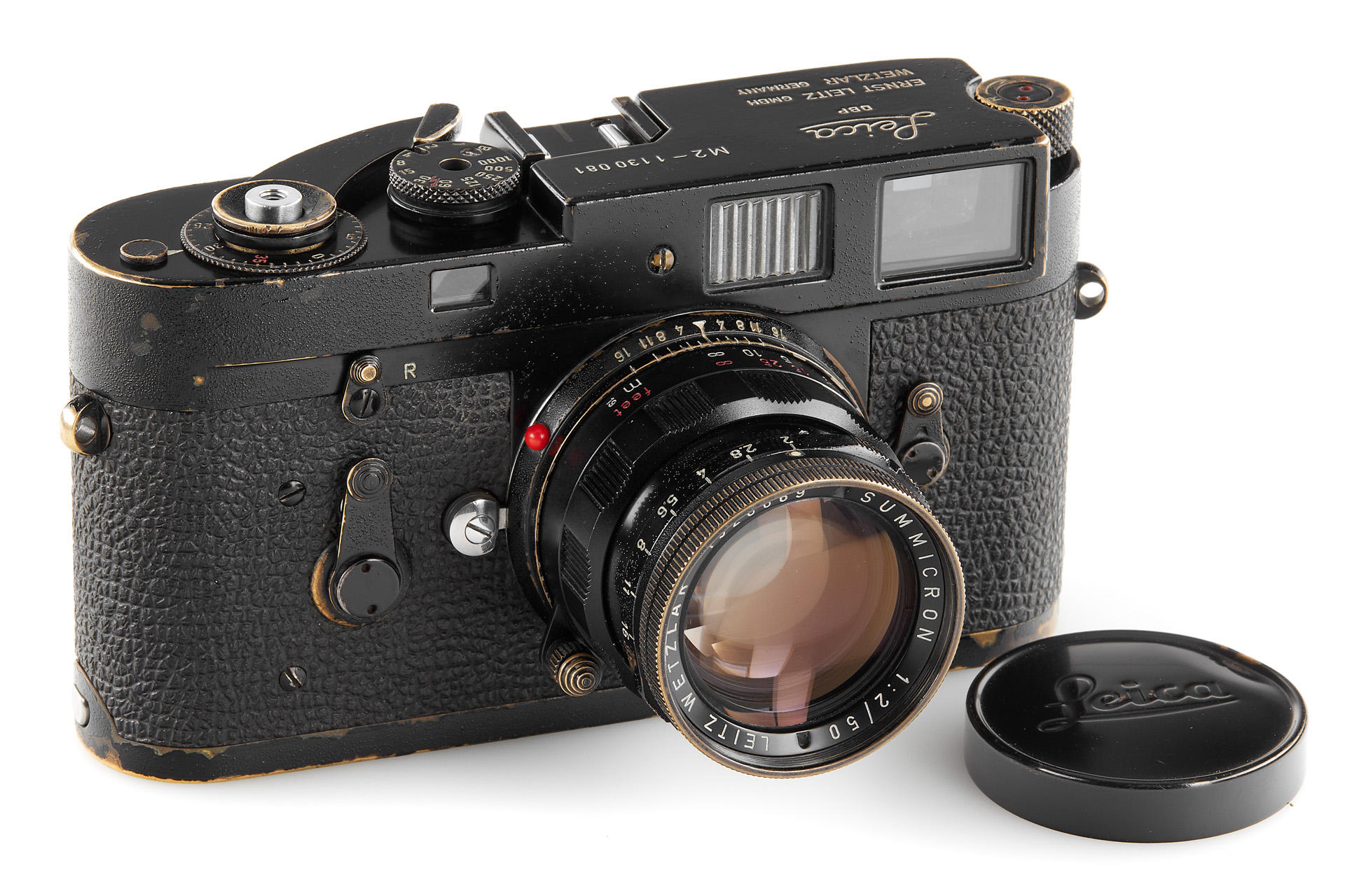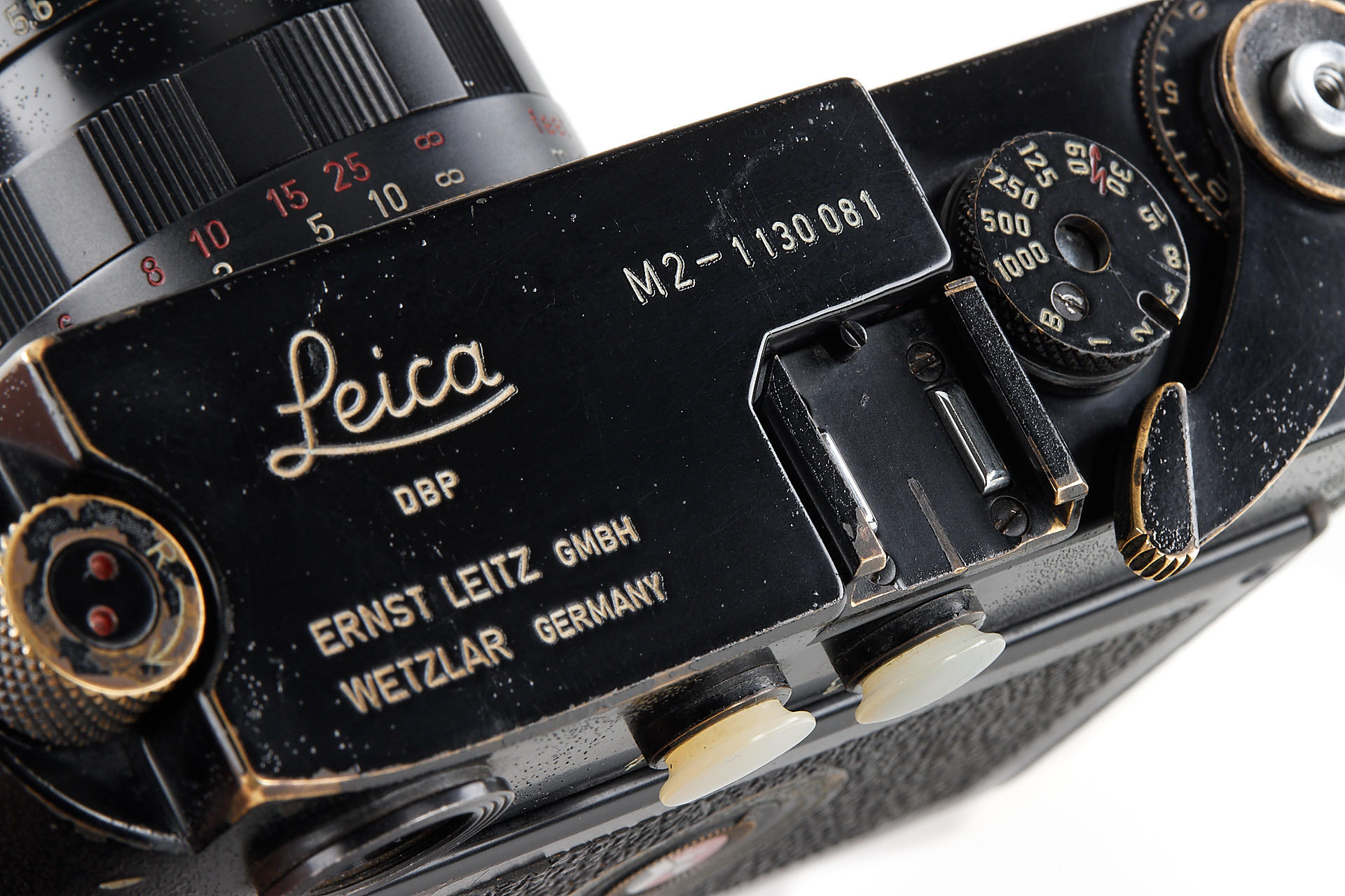 a beautiful, original black paint M2, from an official batch of 300 cameras issued in 1965, in very good condition, small bubbles appearing in the paint, with black paint Summicron 2/50mm no.1926669, black paint lens cap, black paint Leica-Meter MR no.23654