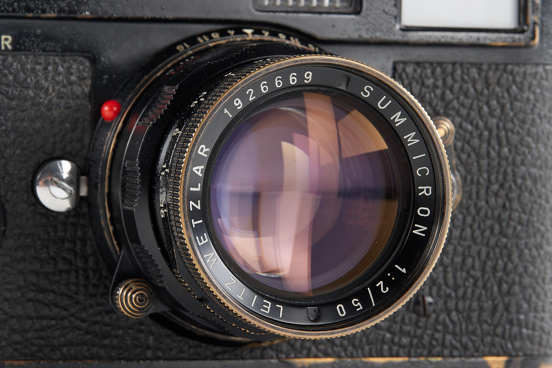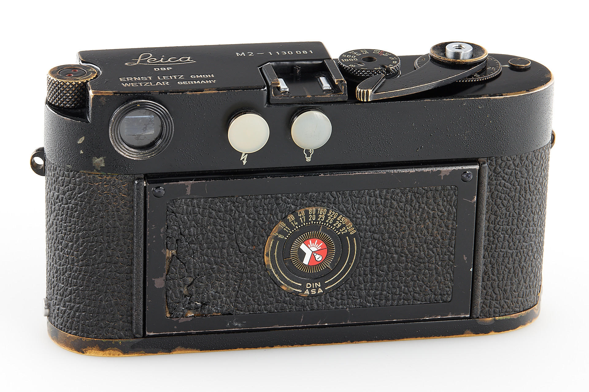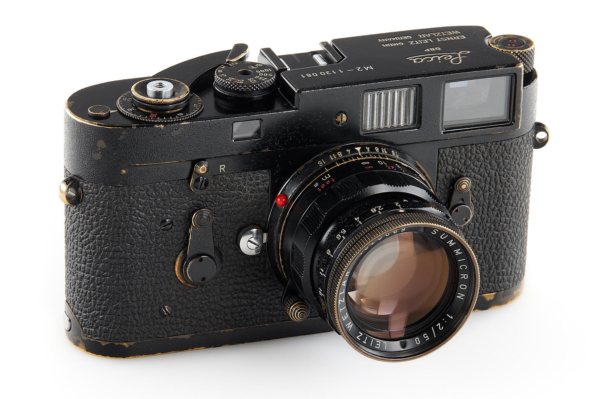 a beautiful, original black paint M2, from an official batch of 300 cameras issued in 1965, in very good condition, small bubbles appearing in the paint, with black paint Summicron 2/50mm no.1926669, black paint lens cap, black paint Leica-Meter MR no.23654