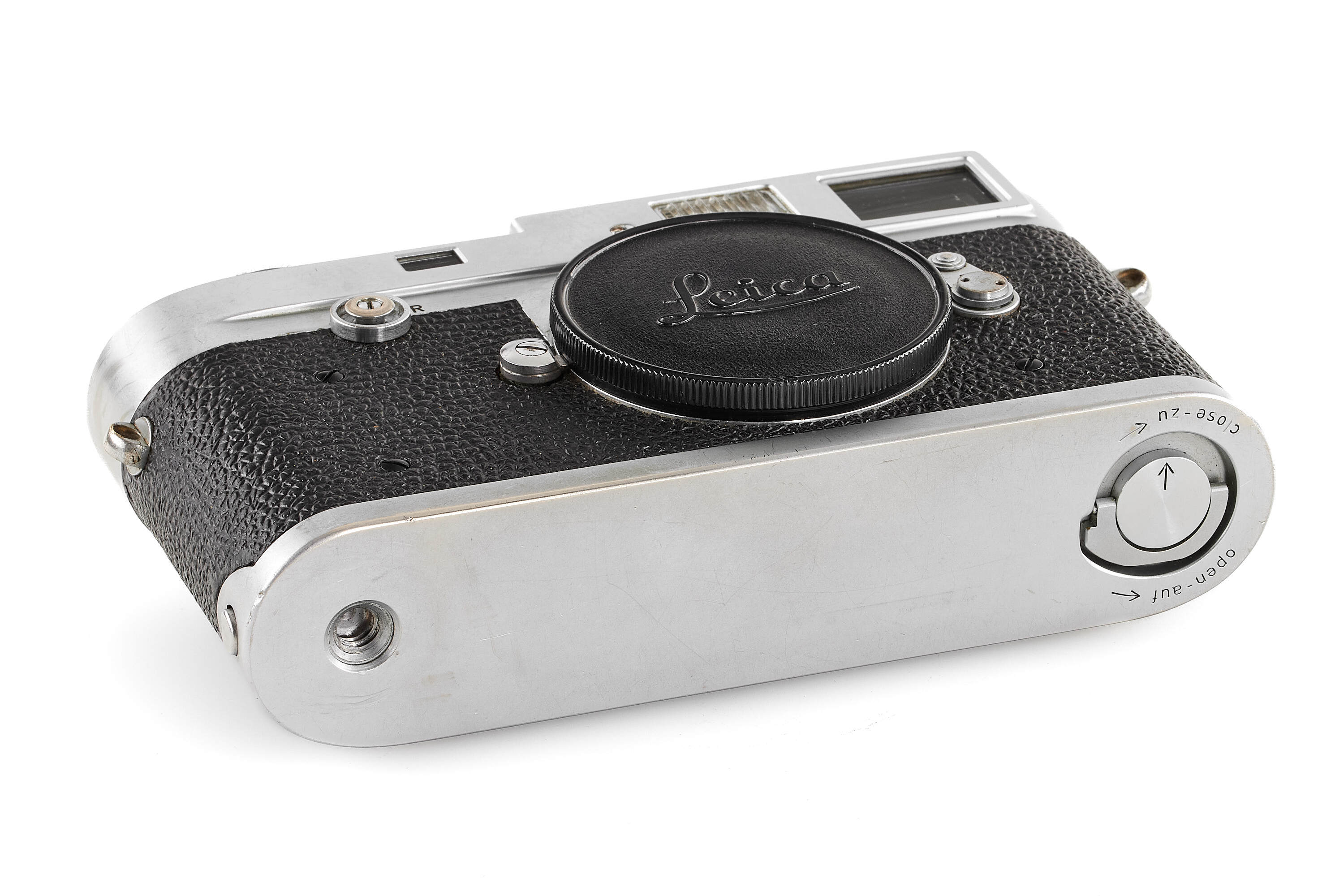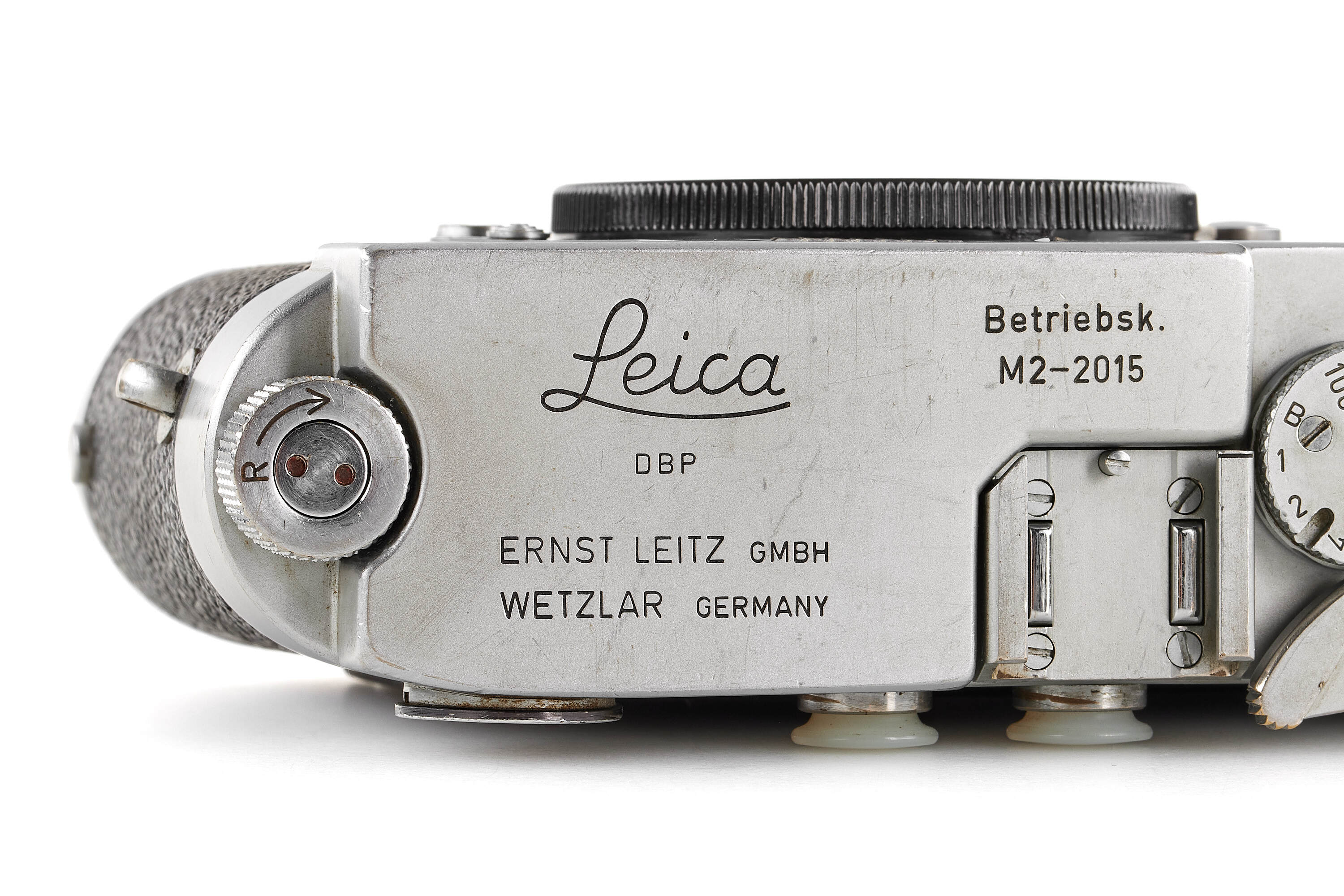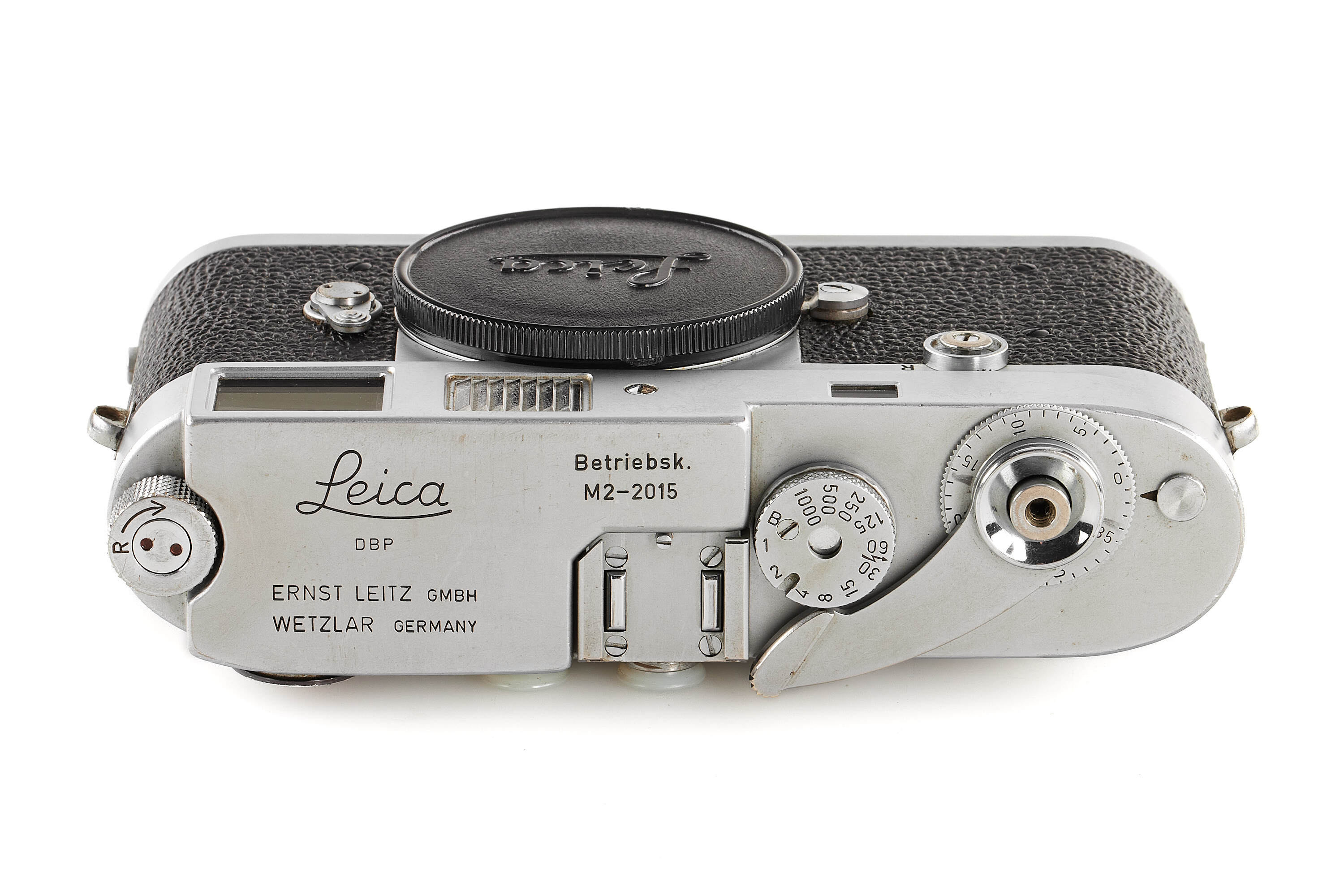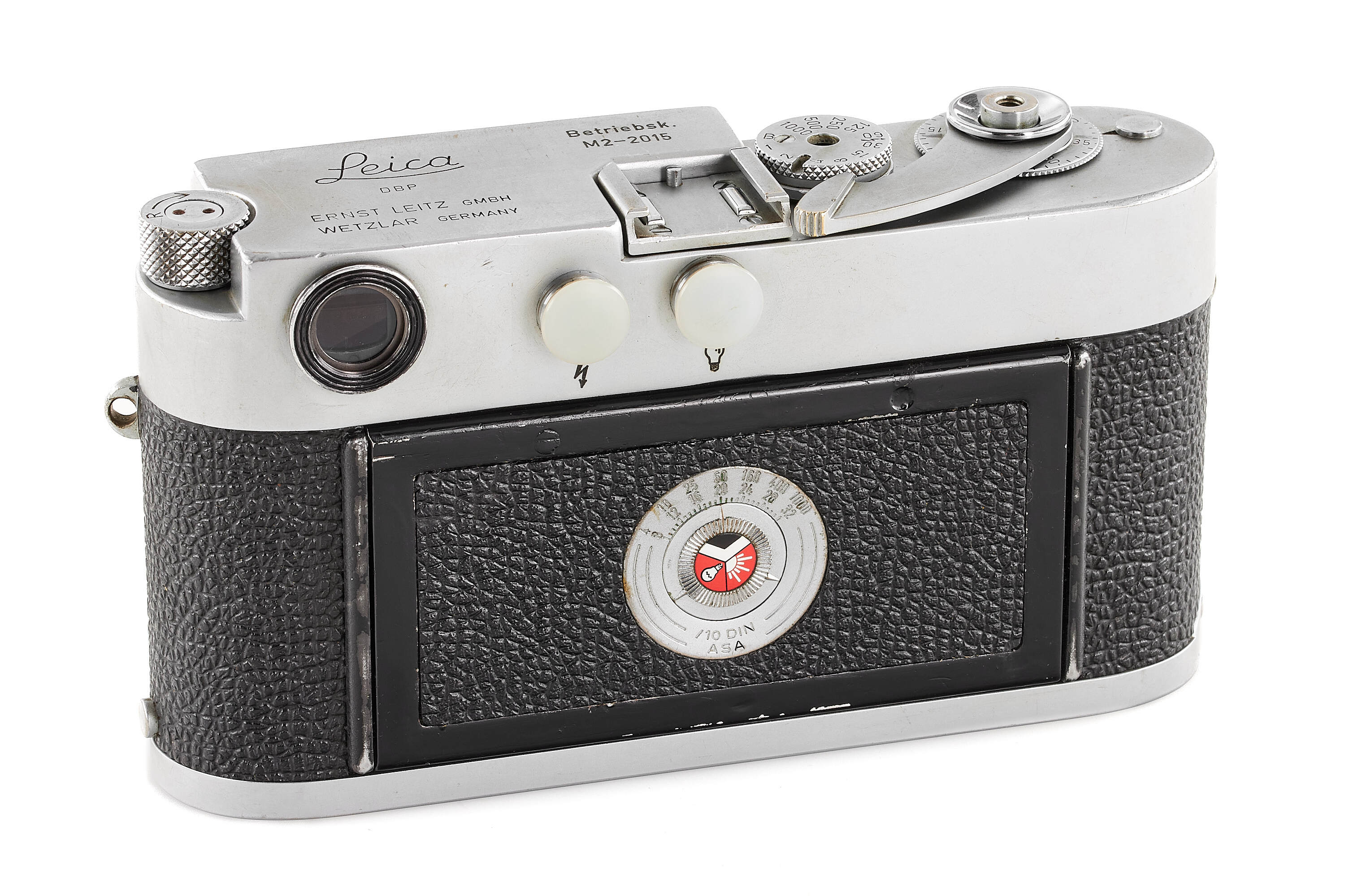 Very rare Leica M2 Betriebskamera (for intern use only), in good, original condition, top plate engraved 'Betriebsk. M2–2015', with body cap. By the end of the 1950s, Leitz Wetzlar had about 7,000 employees. Leica cameras were used also internally in various departments, where cameras were needed, and there was a well-organised camera lending service for temporary private use, as a courtesy to those members of the company, who couldn’t or didn’t want to afford a Leica camera. After the war, the term “Betriebskamera” was used, beginning with Leica model IIIc. Not only in total sales, but also for internal use, the number of Leica M2 cameras was much less than of the M3 in proportion. A maximum of 82 Leica M2 “Betriebsk.” cameras were completed, beginning with no. 2001.