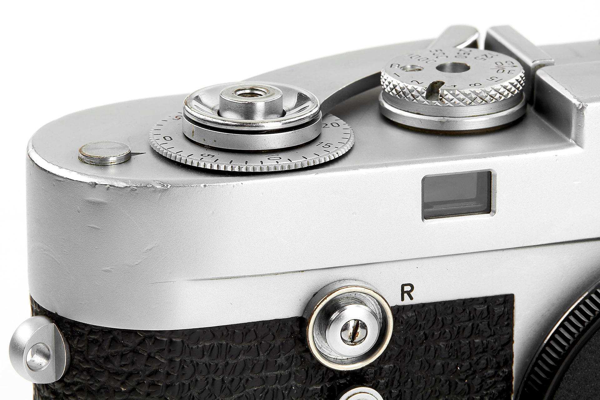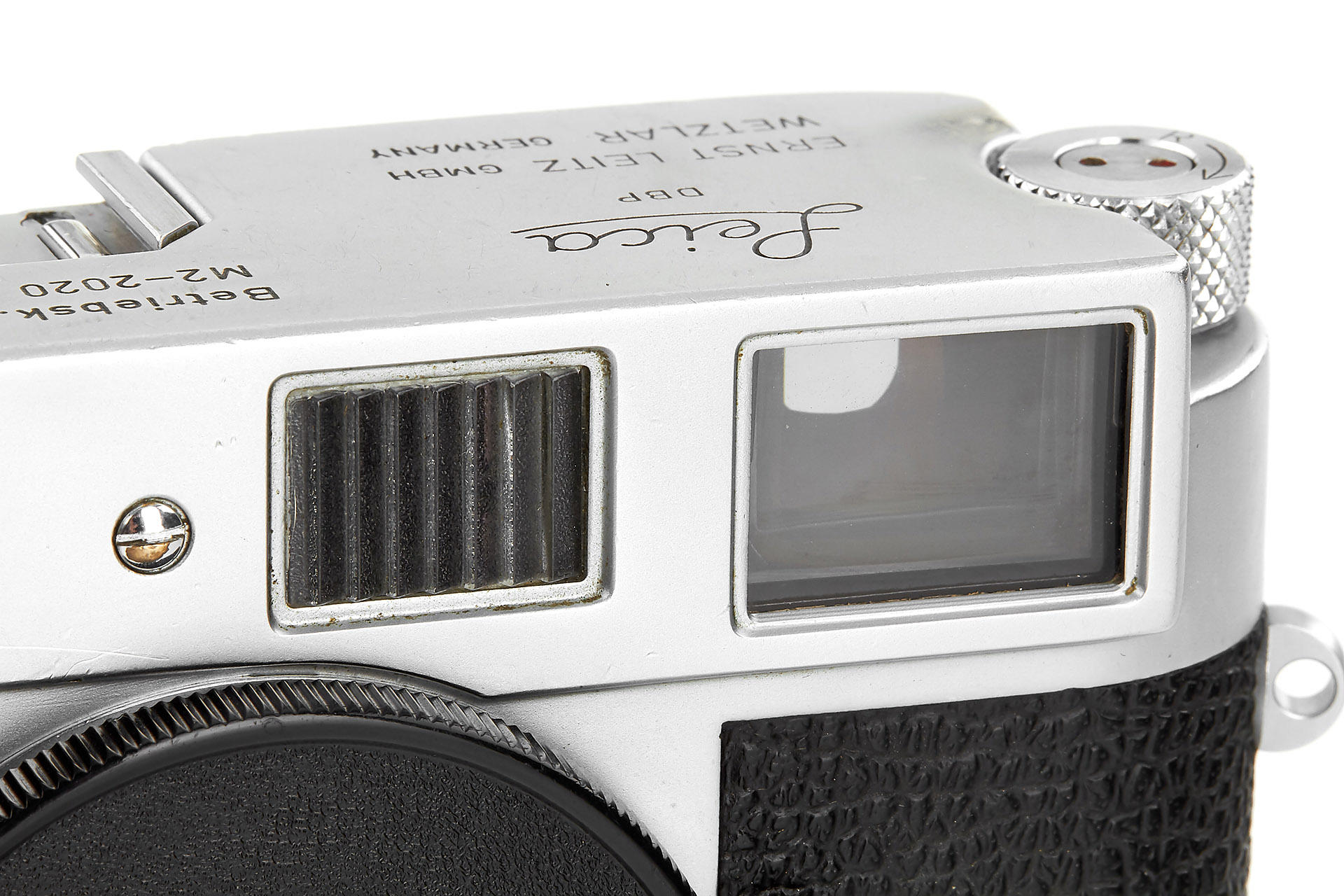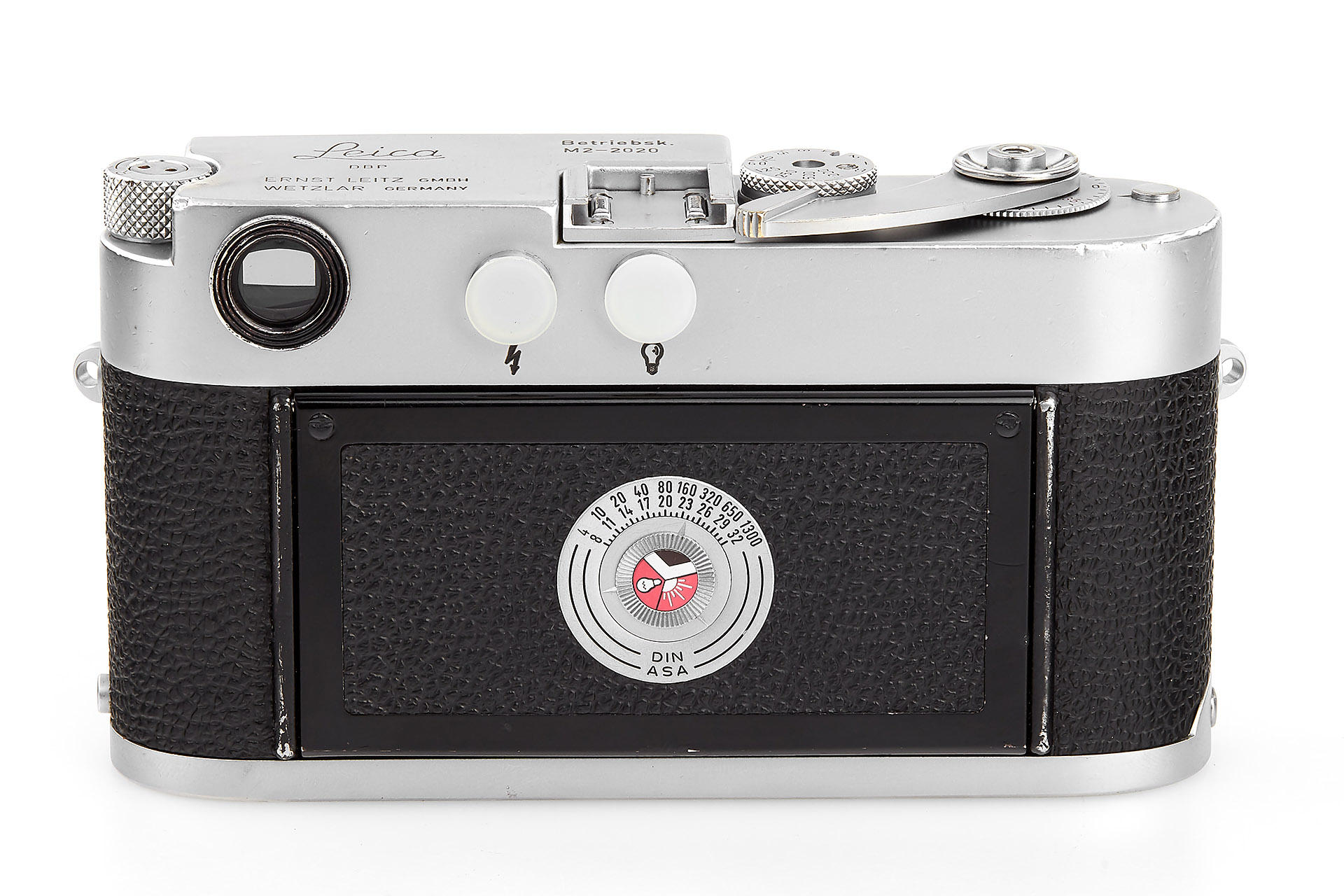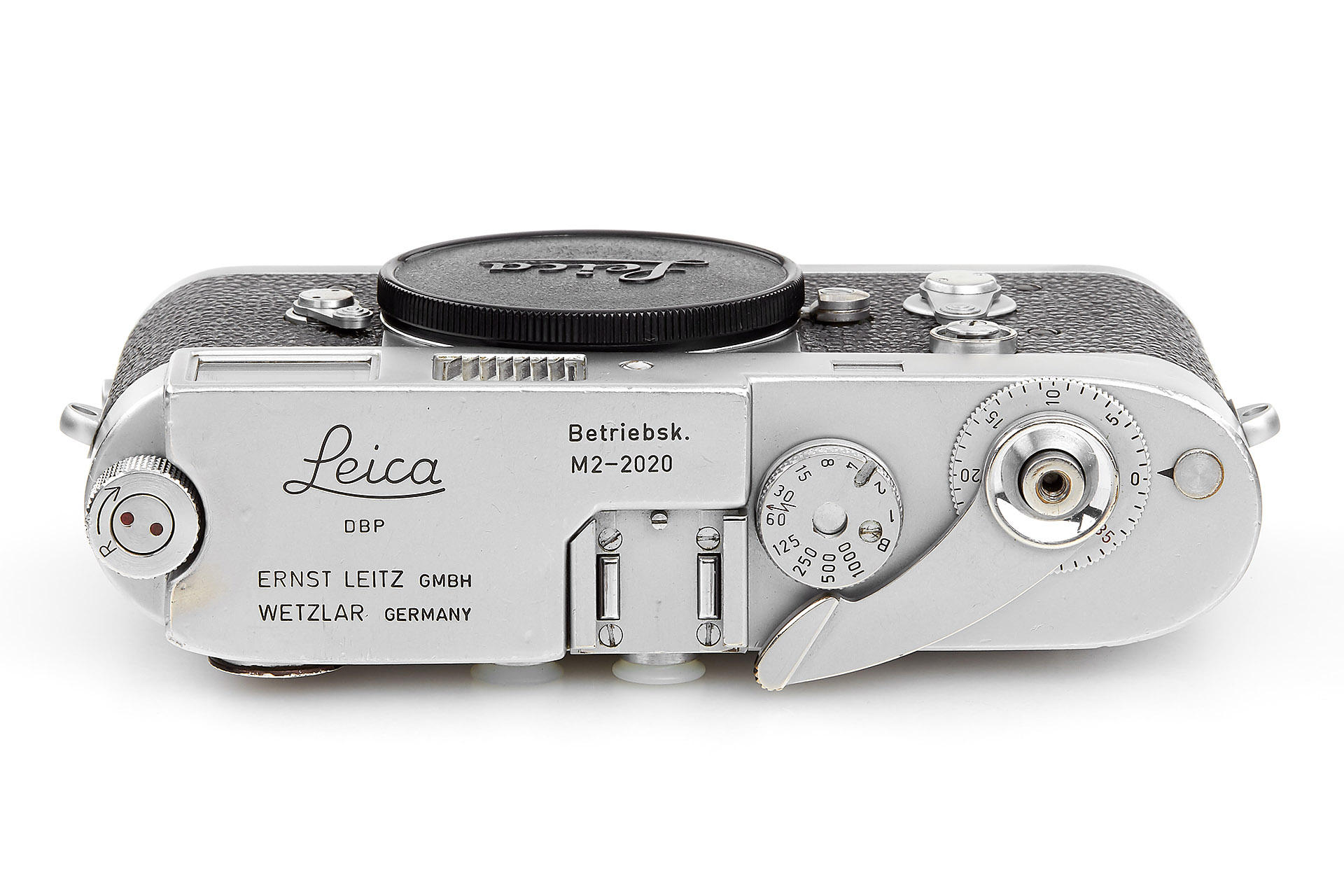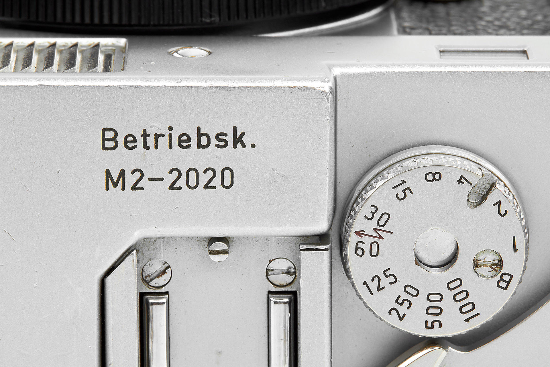 Very rare Leica M2 Betriebskamera (for factory use only), in fully original condition, top plate engraved “Betriebsk. M2 – 2020” By the end of the 1950s, Leitz Wetzlar had about 7,000 employees. Leica cameras were used also internally in various departments, where cameras were needed, and there was a well-organised camera lending service for temporary private use, as a courtesy to those members of the company, who couldn’t or didn’t want to afford a Leica camera. After the war, the term “Betriebskamera” was used, beginning with Leica model IIIc. Not only in total sales, but also for internal use, the number of Leica M2 cameras was much less than of the M3 in proportion. A maximum of 82 Leica M2 “Betriebsk.” cameras were completed, beginning with no. 2001.