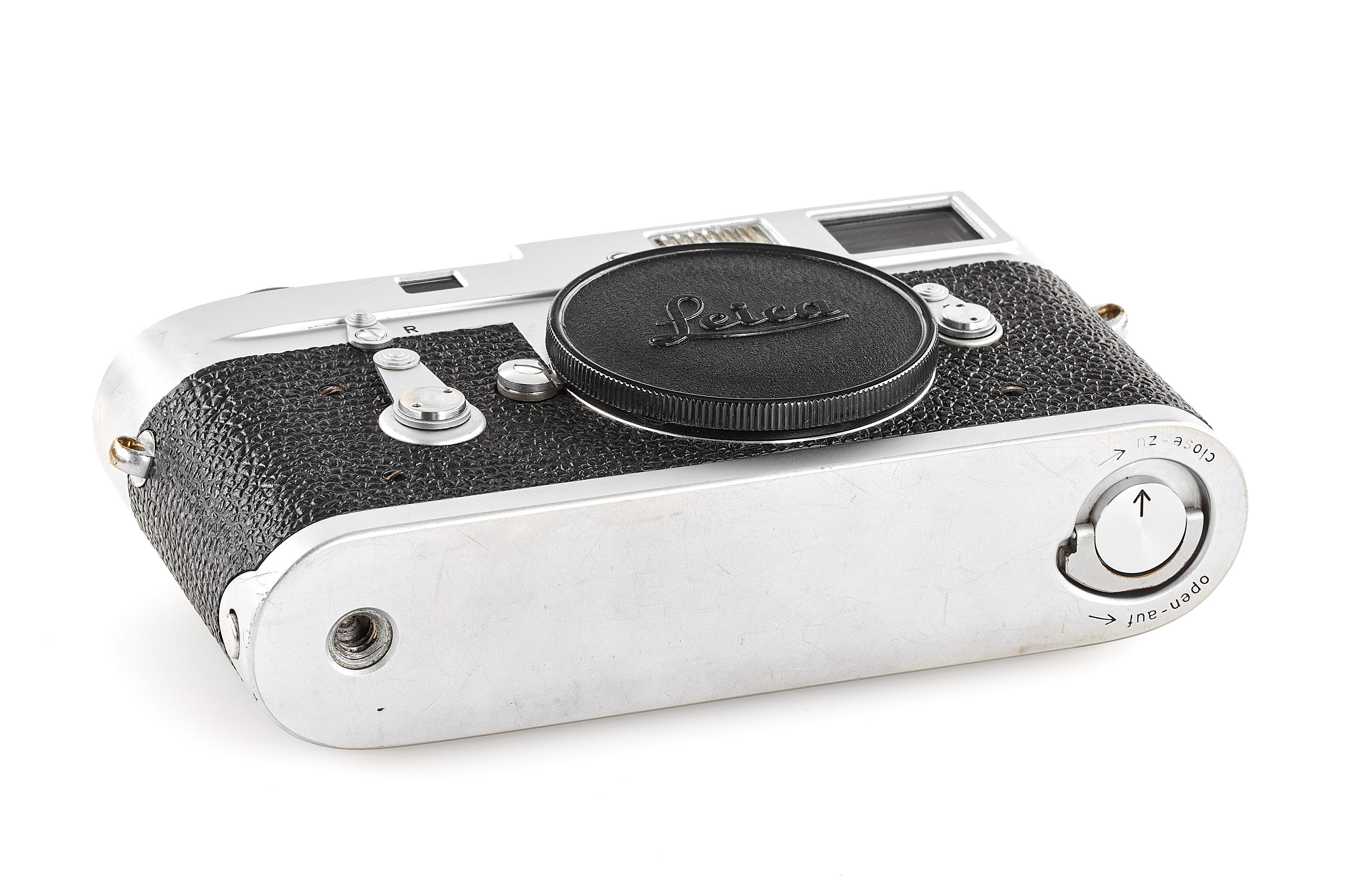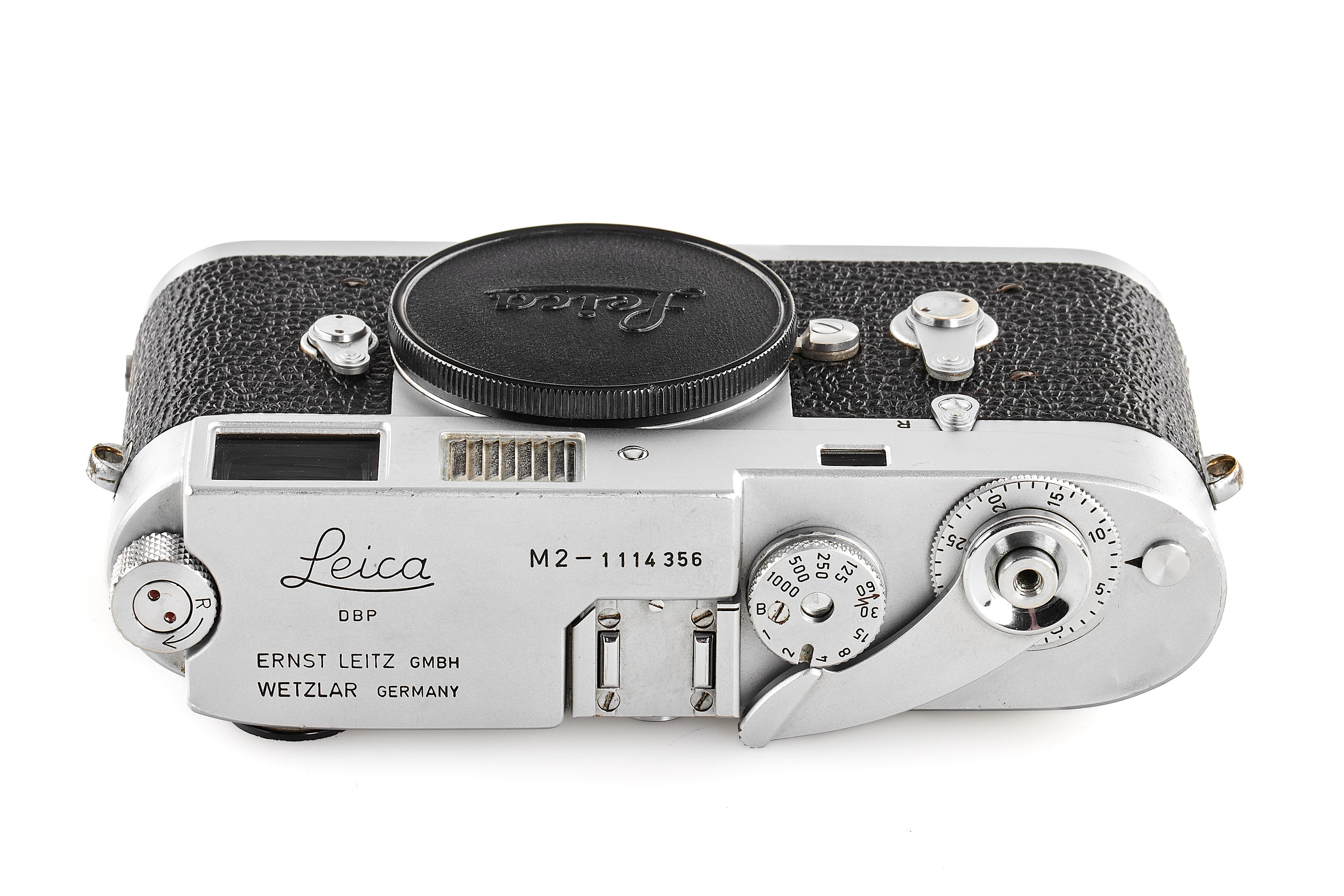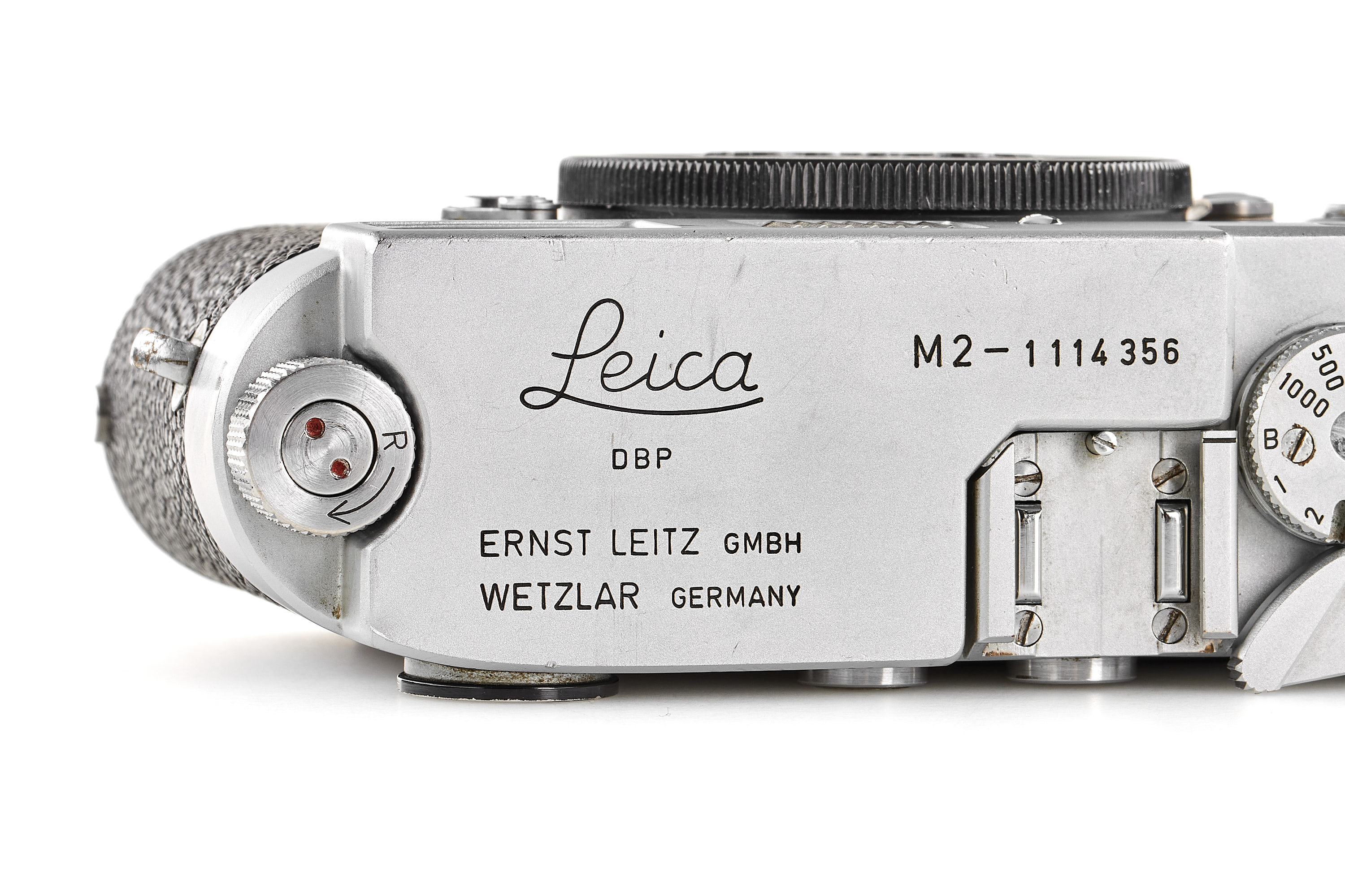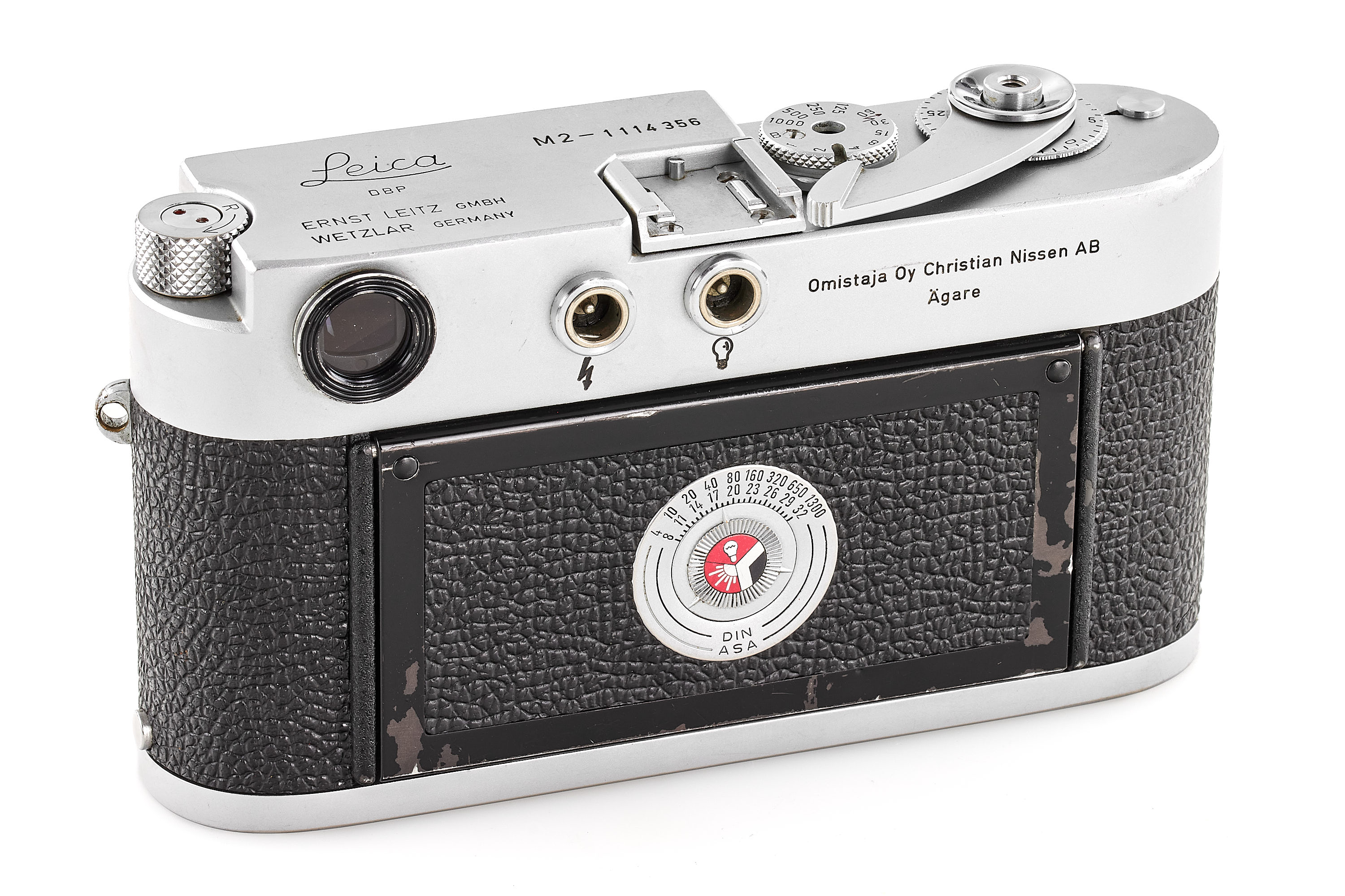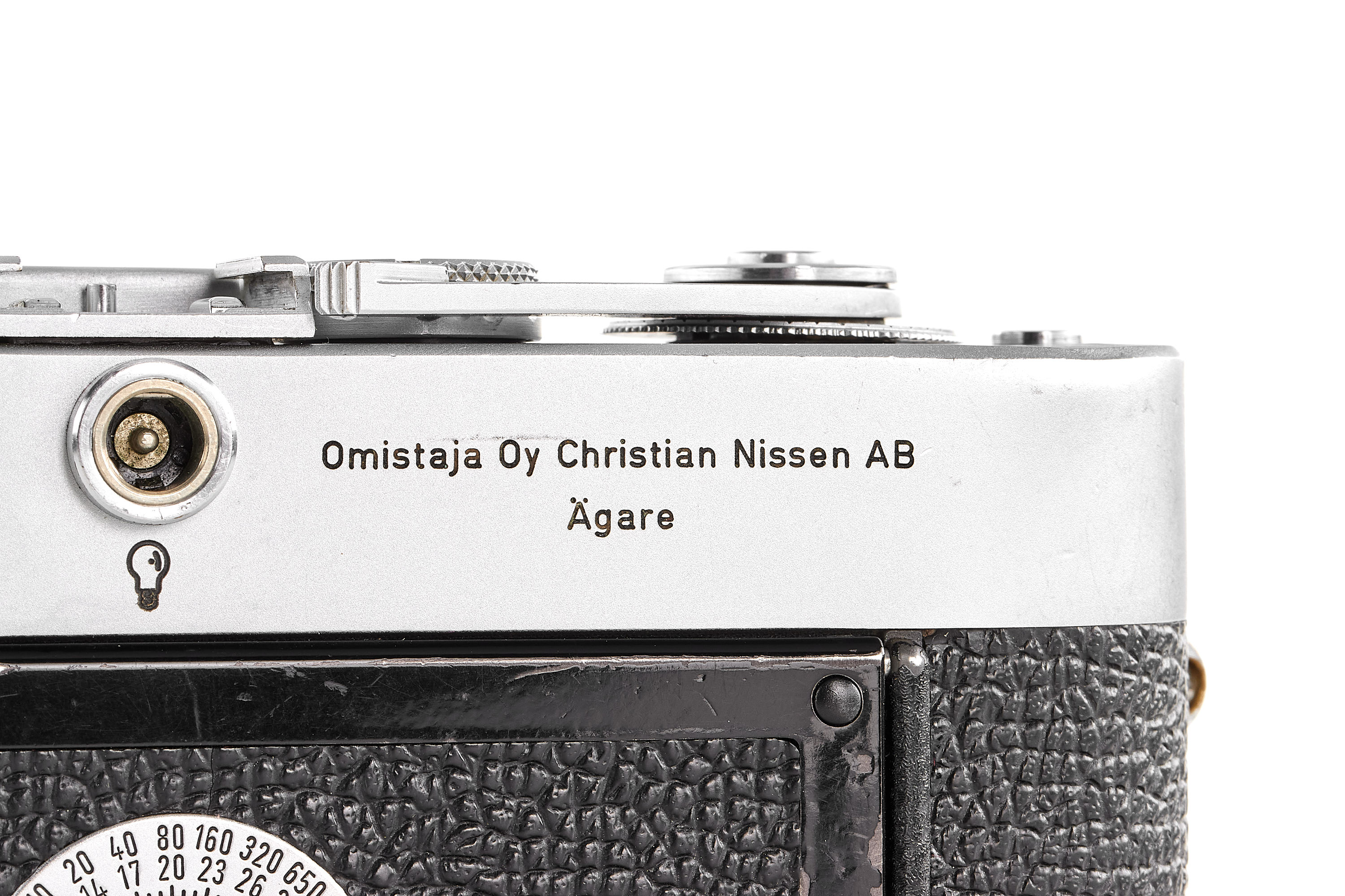 Very interesting Leica M2 chrome engraved on the back side with 'Omistaja Oy Christian Nissen AB Ägare' (Finnish/Swedish for Property of the company Chistian Nissen), Chistian Nissen opened his business as an optician in 1891 in Helsinki selling binoculars and microscope made by Ernst Leitz, the company continued selling Leitz products for many years, the camera is in very good condition and working order, it was delivered to Nissen on 11.11.1965, together with body cap and 1991 'Leica Info' magazine, an article on p.6, 7 and 8 celebrates the centenary of the company.