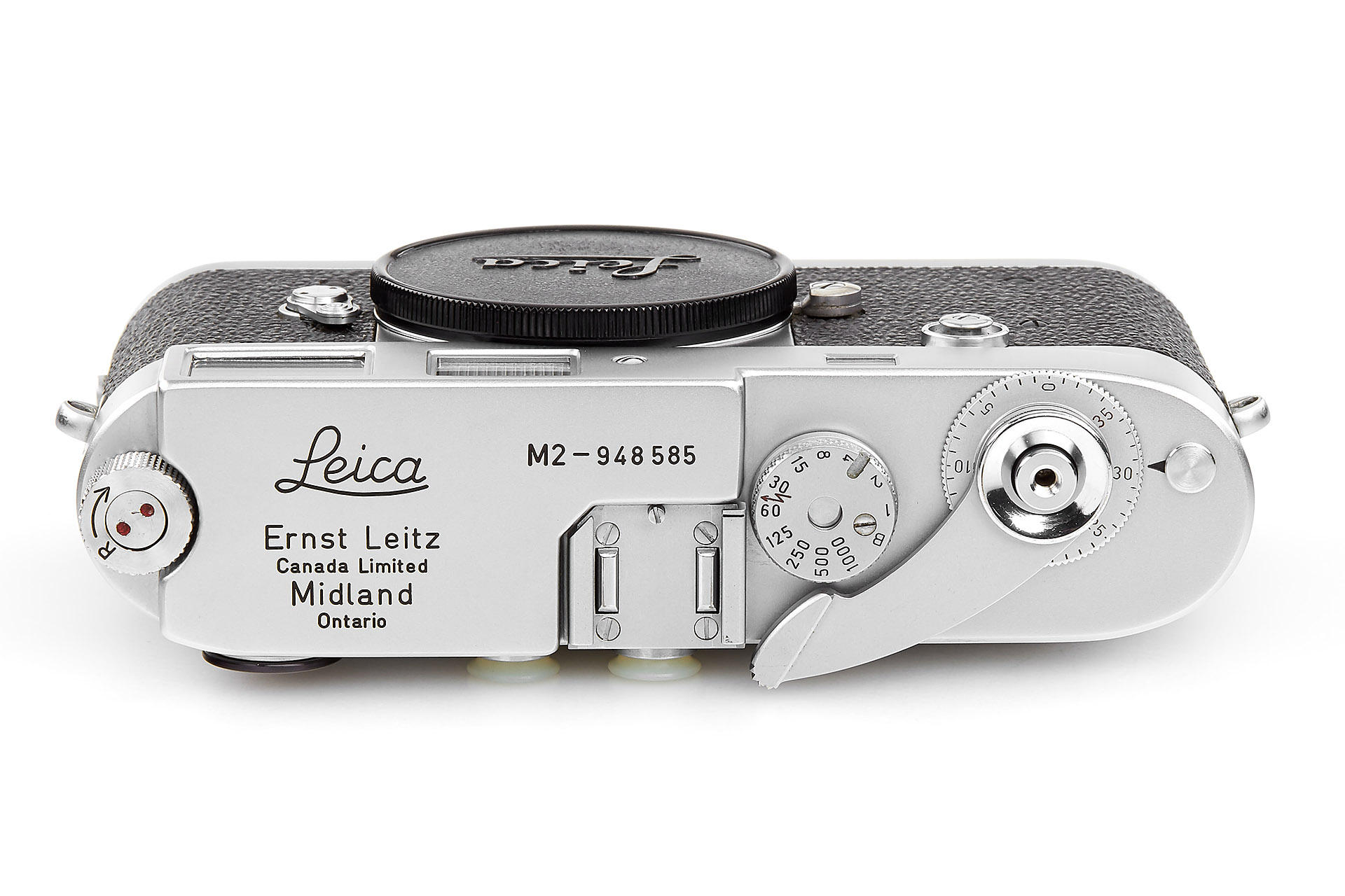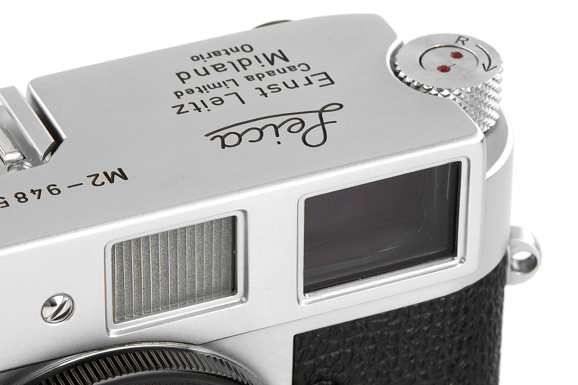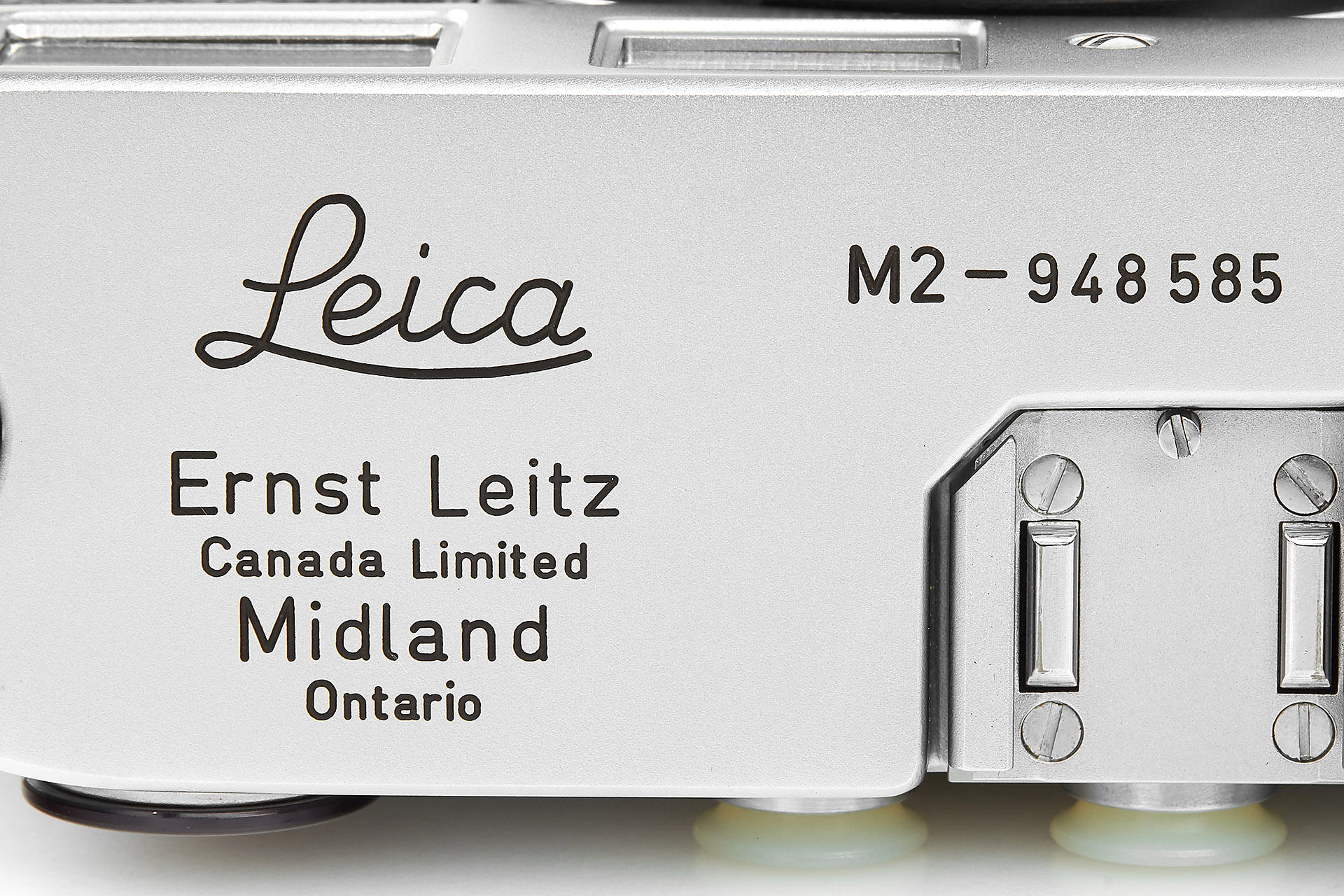 Very rare Leica M2 in near mint condition produced in Canada, engraved "Ernst Leitz Canada Limited Midland Ontario" on the top plate. In response to requests from press photographers, the M2 with built-in 35 mm wideangle viewfinder was introduced in 1957. The frameline for the 50 mm field in the viewfinder is smaller, which was generally appreciated by the M2 customers. As a camera made for professionals, it is equipped with the robust manually resettable framecounter. The Leica M2 was offered parallel to the M3. Only about 1,500 units of the Leica M2 were assembled at the Leitz plant in Canada, while total production of this camera numbered more than 76,000. Usually these cameras were equipped with top plates from the Wetzlar production. Just a handful of single units carry the “Leitz Canada“ engravings and were probably intended as samples.