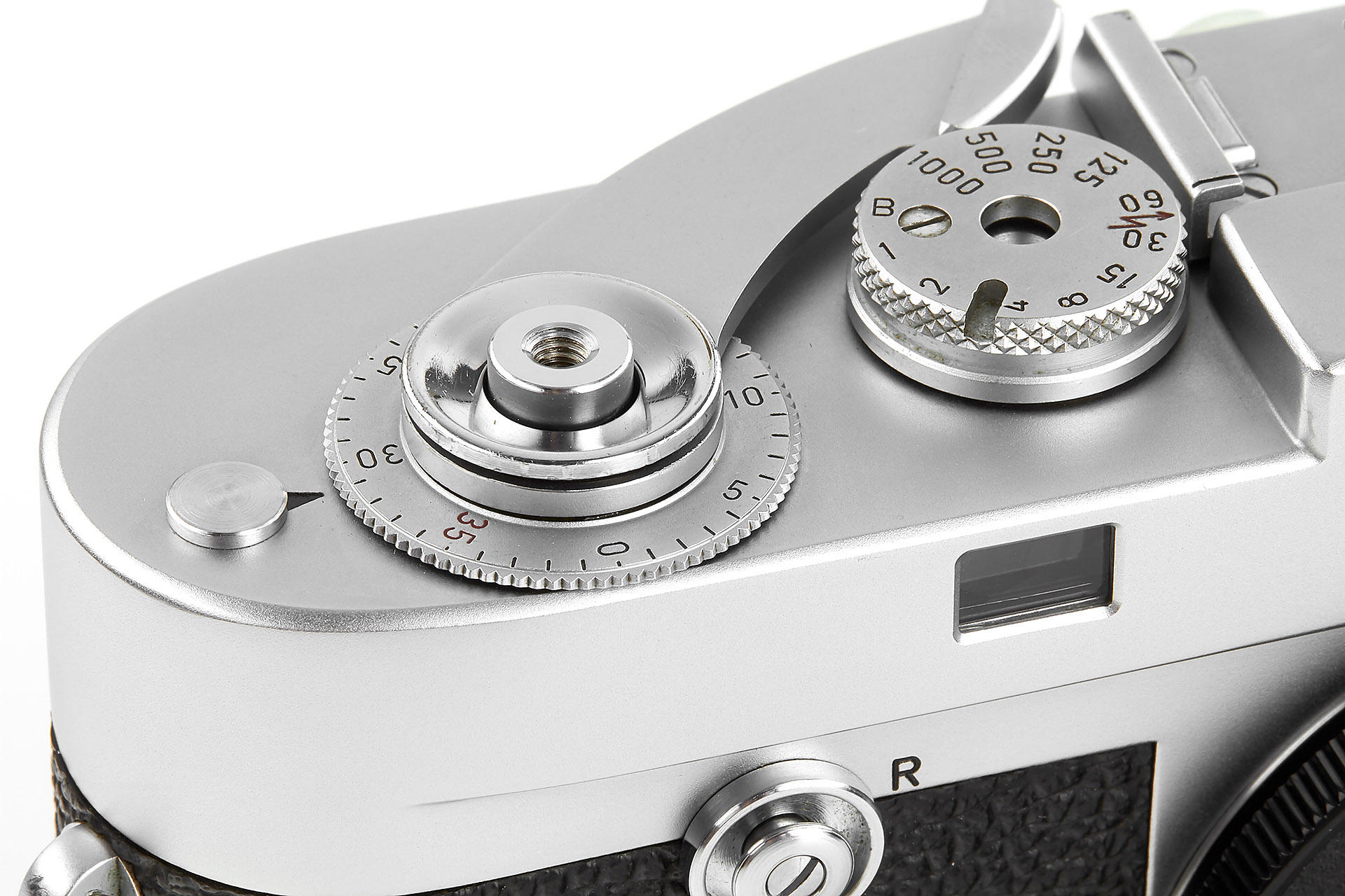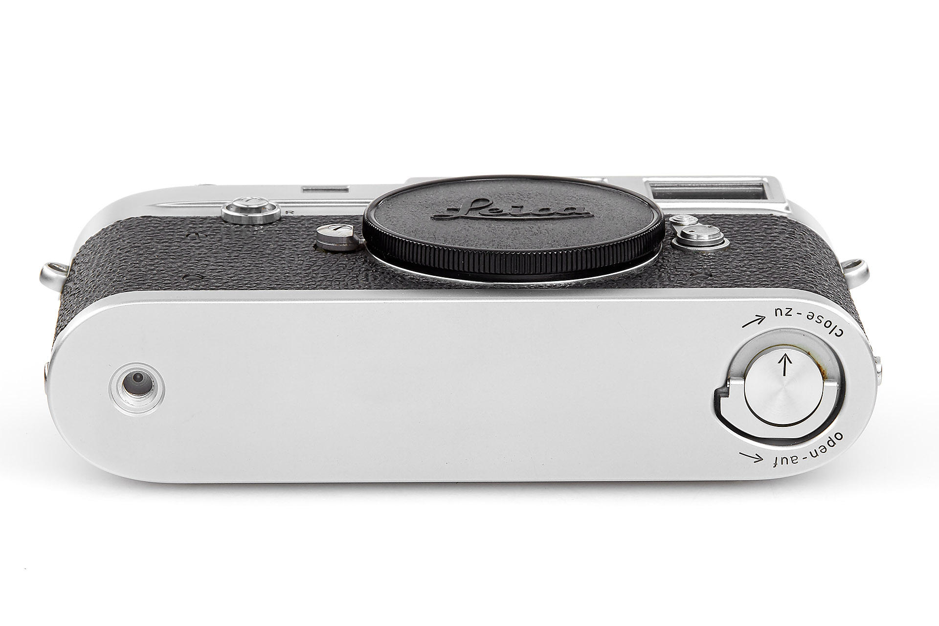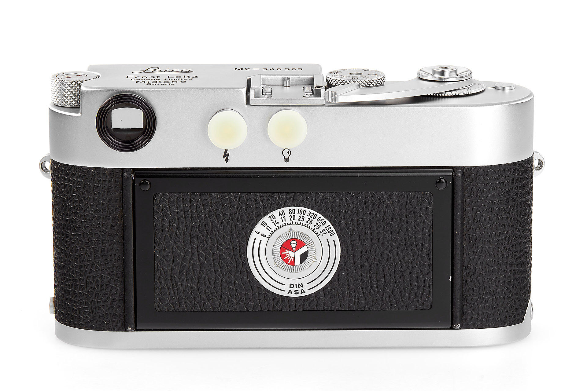 Very rare Leica M2 in near mint condition produced in Canada, engraved "Ernst Leitz Canada Limited Midland Ontario" on the top plate. In response to requests from press photographers, the M2 with built-in 35 mm wideangle viewfinder was introduced in 1957. The frameline for the 50 mm field in the viewfinder is smaller, which was generally appreciated by the M2 customers. As a camera made for professionals, it is equipped with the robust manually resettable framecounter. The Leica M2 was offered parallel to the M3. Only about 1,500 units of the Leica M2 were assembled at the Leitz plant in Canada, while total production of this camera numbered more than 76,000. Usually these cameras were equipped with top plates from the Wetzlar production. Just a handful of single units carry the “Leitz Canada“ engravings and were probably intended as samples.