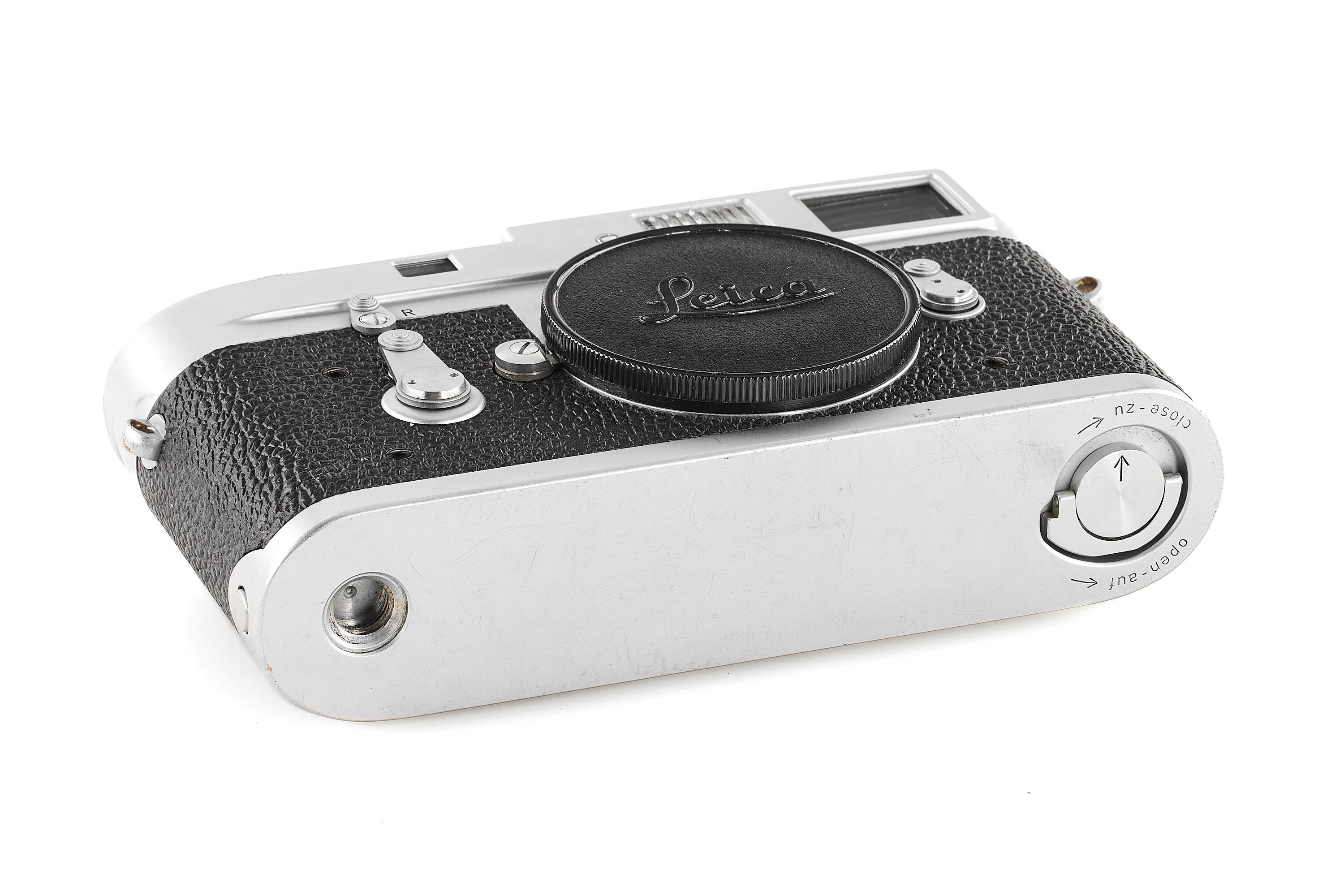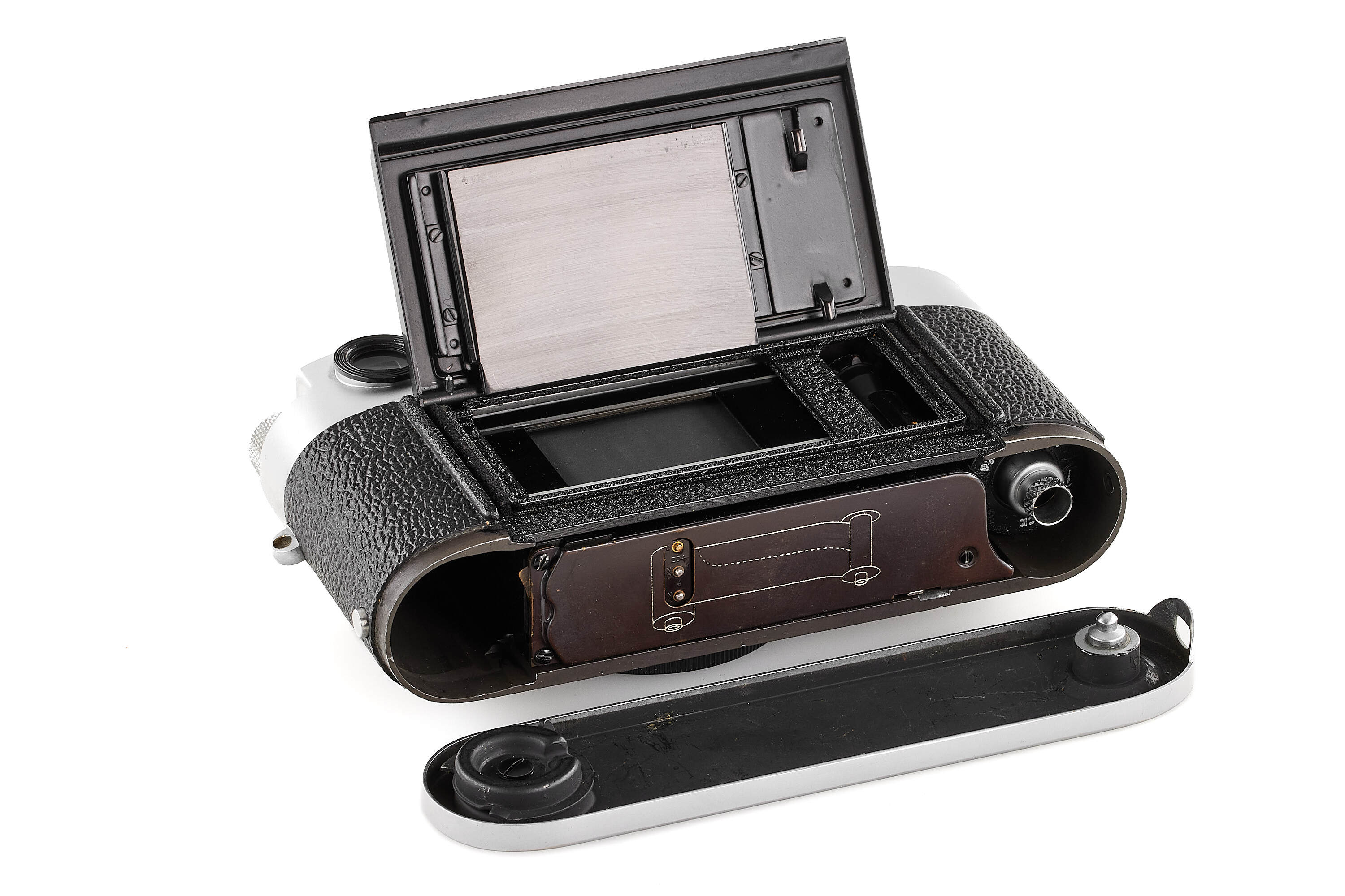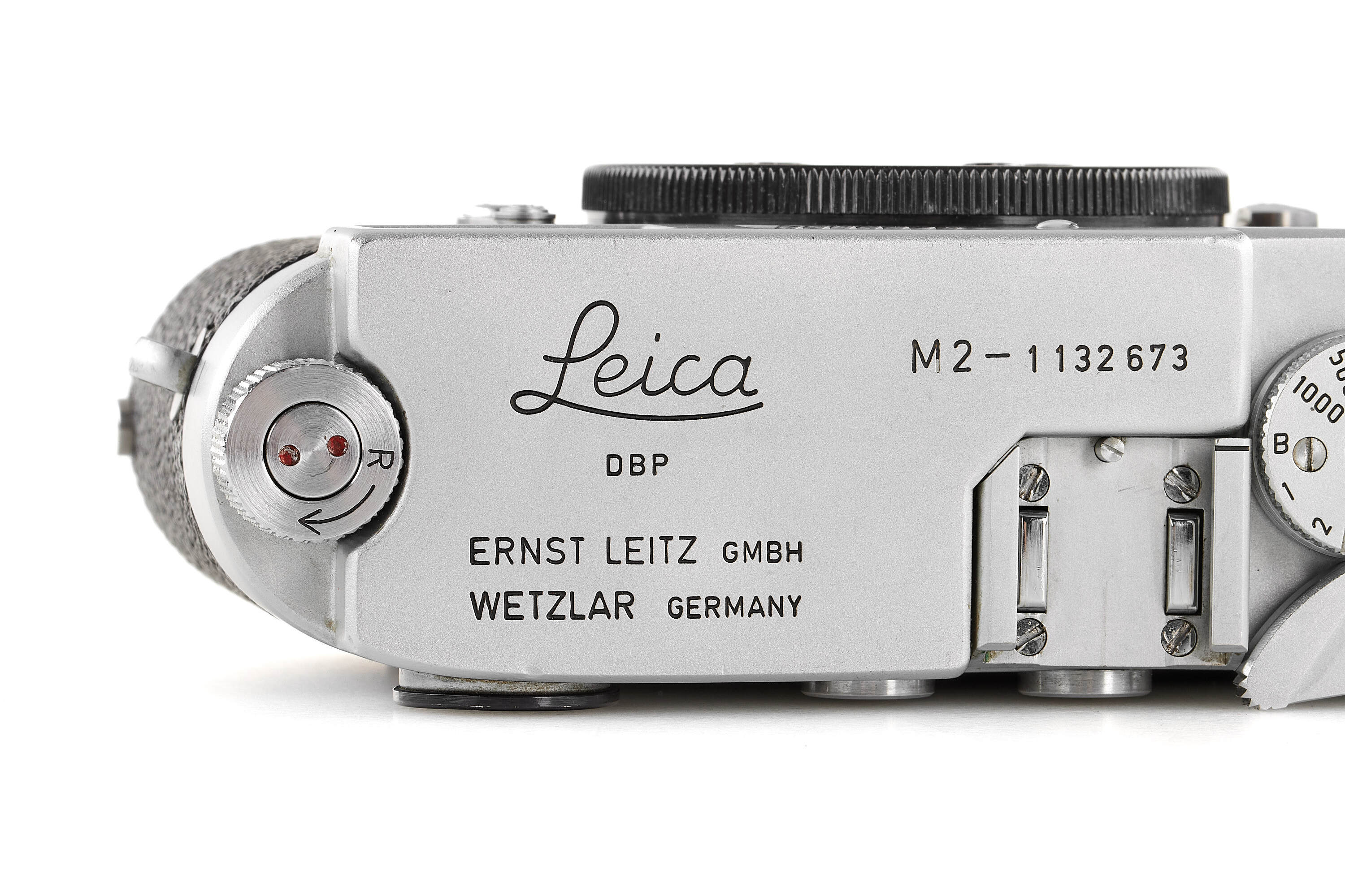 Interesting M2 chrome factory modified to accept E. Leitz New York Motor Drive, in very good condition, Leica records show the camera was delivered to retailer Manca, New York, in 1966 and 1967, then returned and sent to Stuttgart in 1970 and 1971 with Motor no.02065 (here missing), the cover plate inside is cut out to expose the 3 contacts, with body cap.