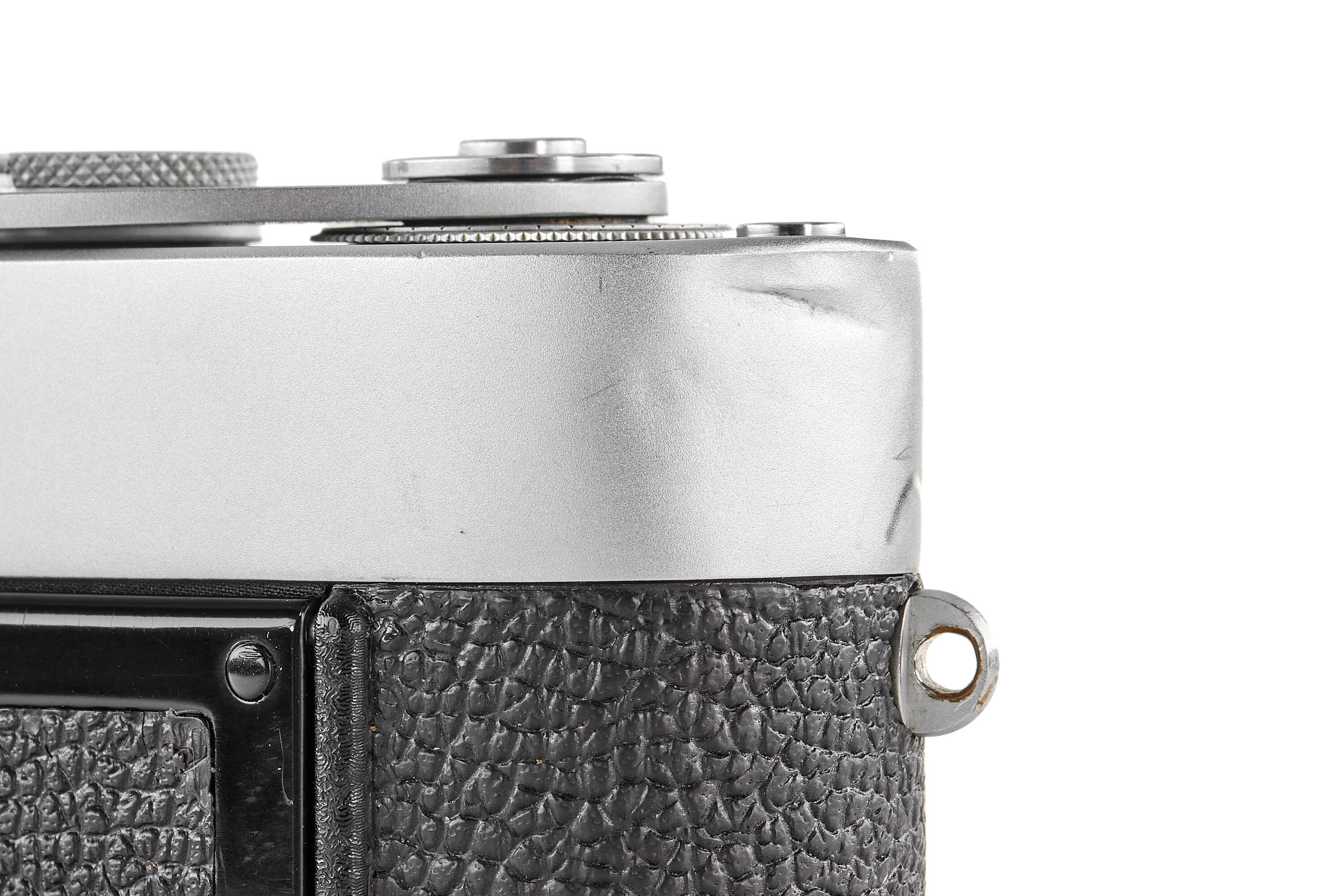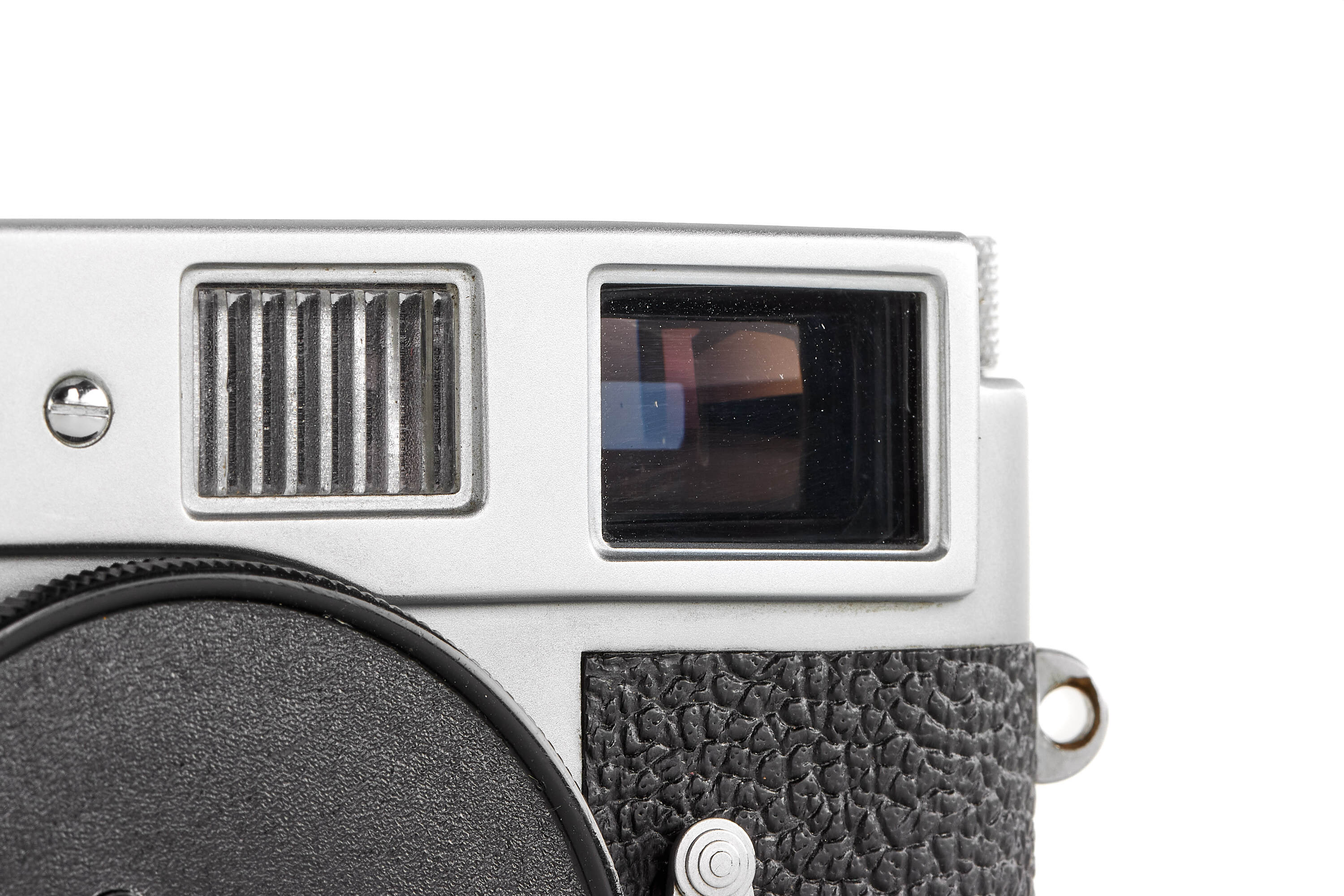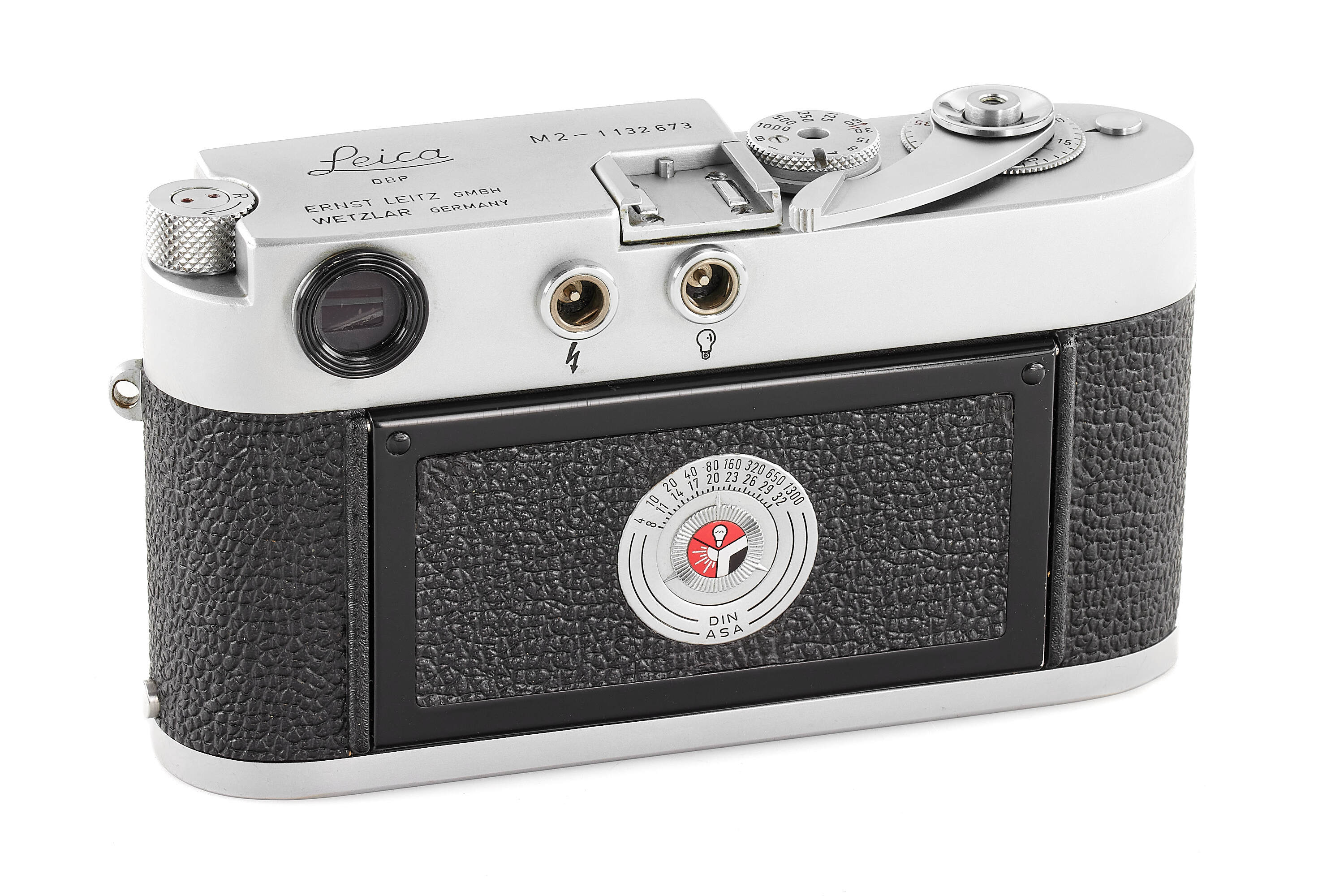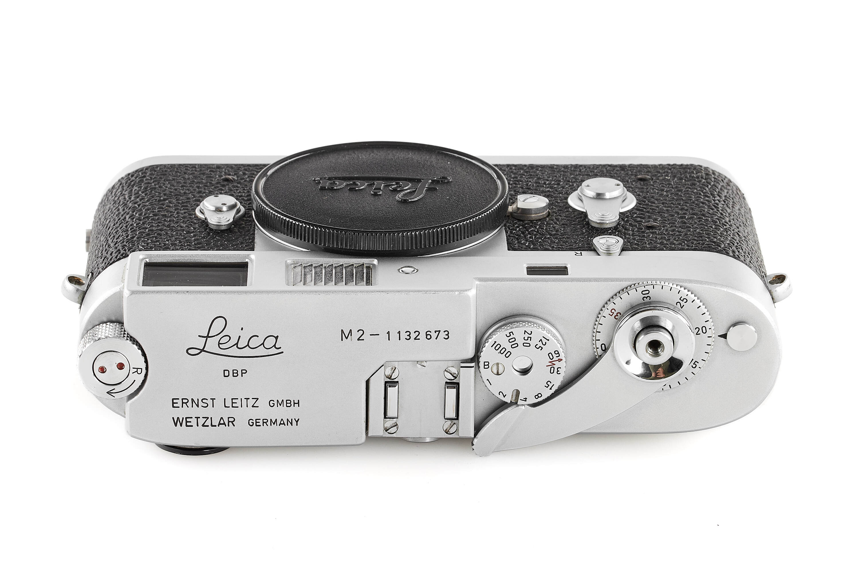 Interesting M2 chrome factory modified to accept E. Leitz New York Motor Drive, in very good condition, Leica records show the camera was delivered to retailer Manca, New York, in 1966 and 1967, then returned and sent to Stuttgart in 1970 and 1971 with Motor no.02065 (here missing), the cover plate inside is cut out to expose the 3 contacts, with body cap.