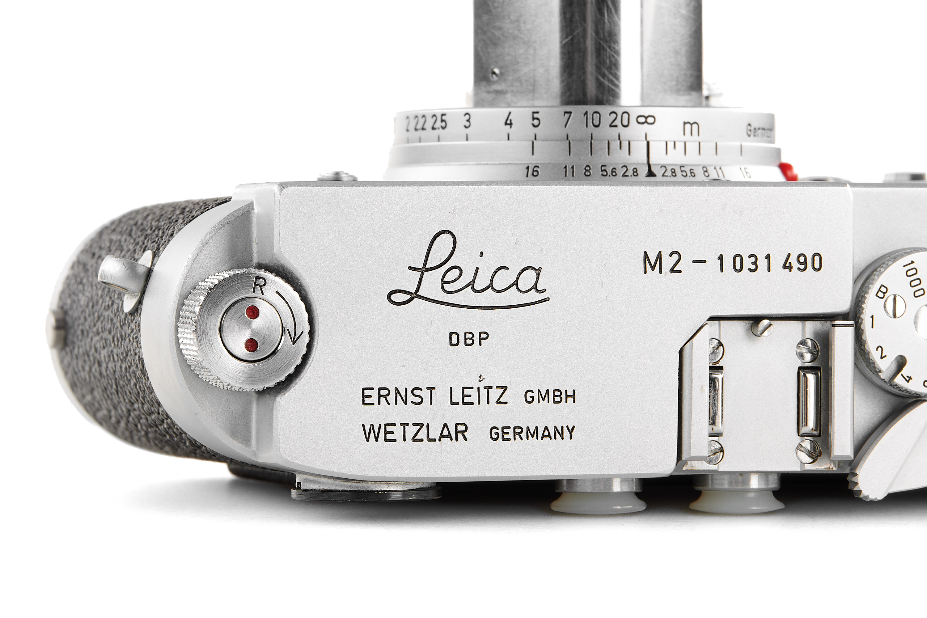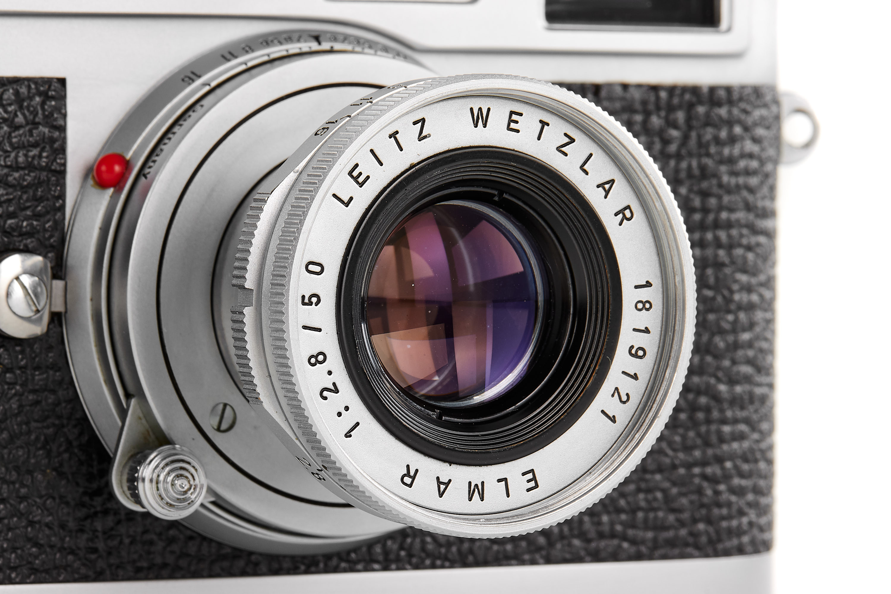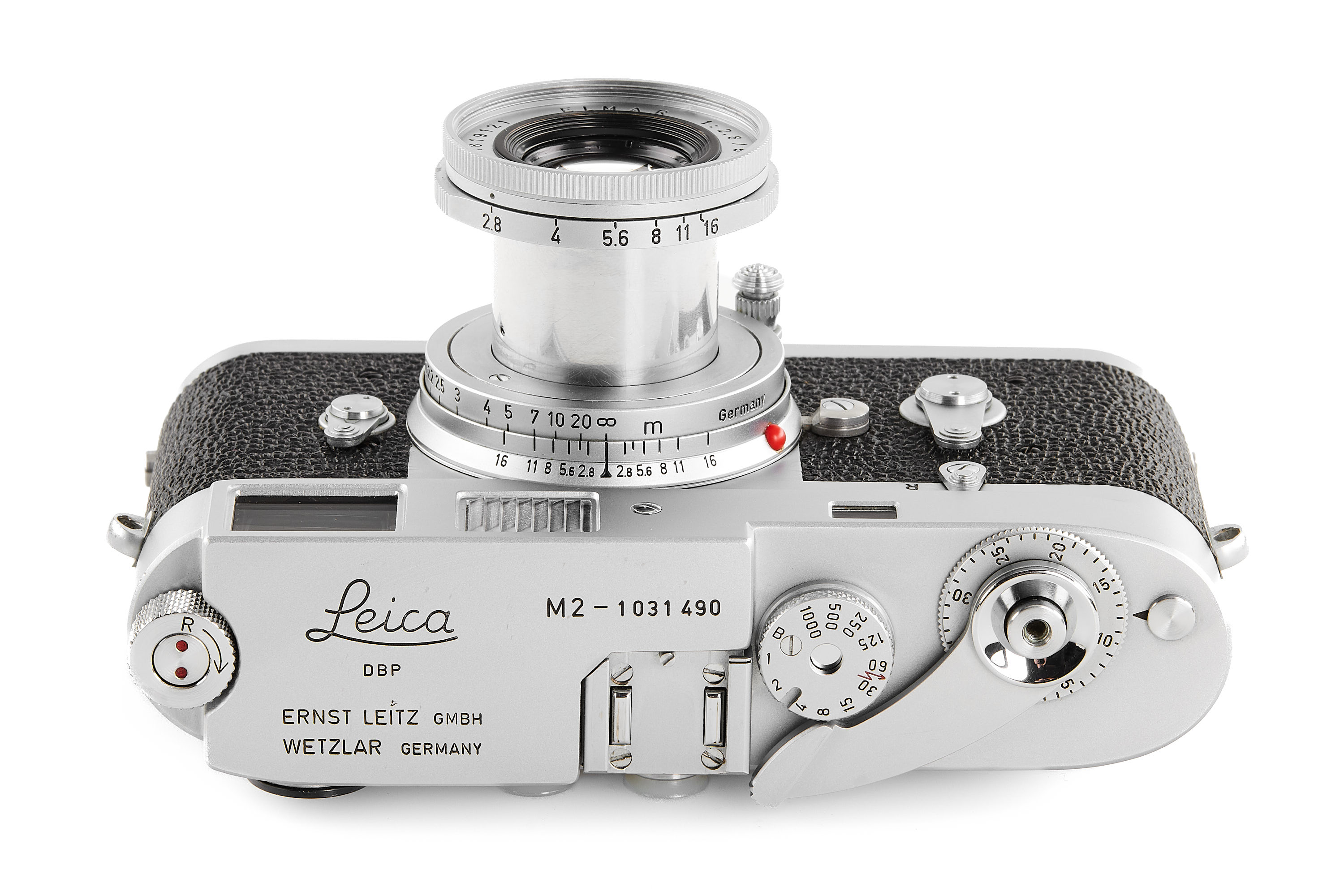 Beautiful Leica M2 in almost mint condition and working order, with meter scaled Elmar 2.8/50mm no.1819121, good optics only showing minimal cleaning marks, with front lens cap and UVa filter, both delivered to Brussels in 1962.
