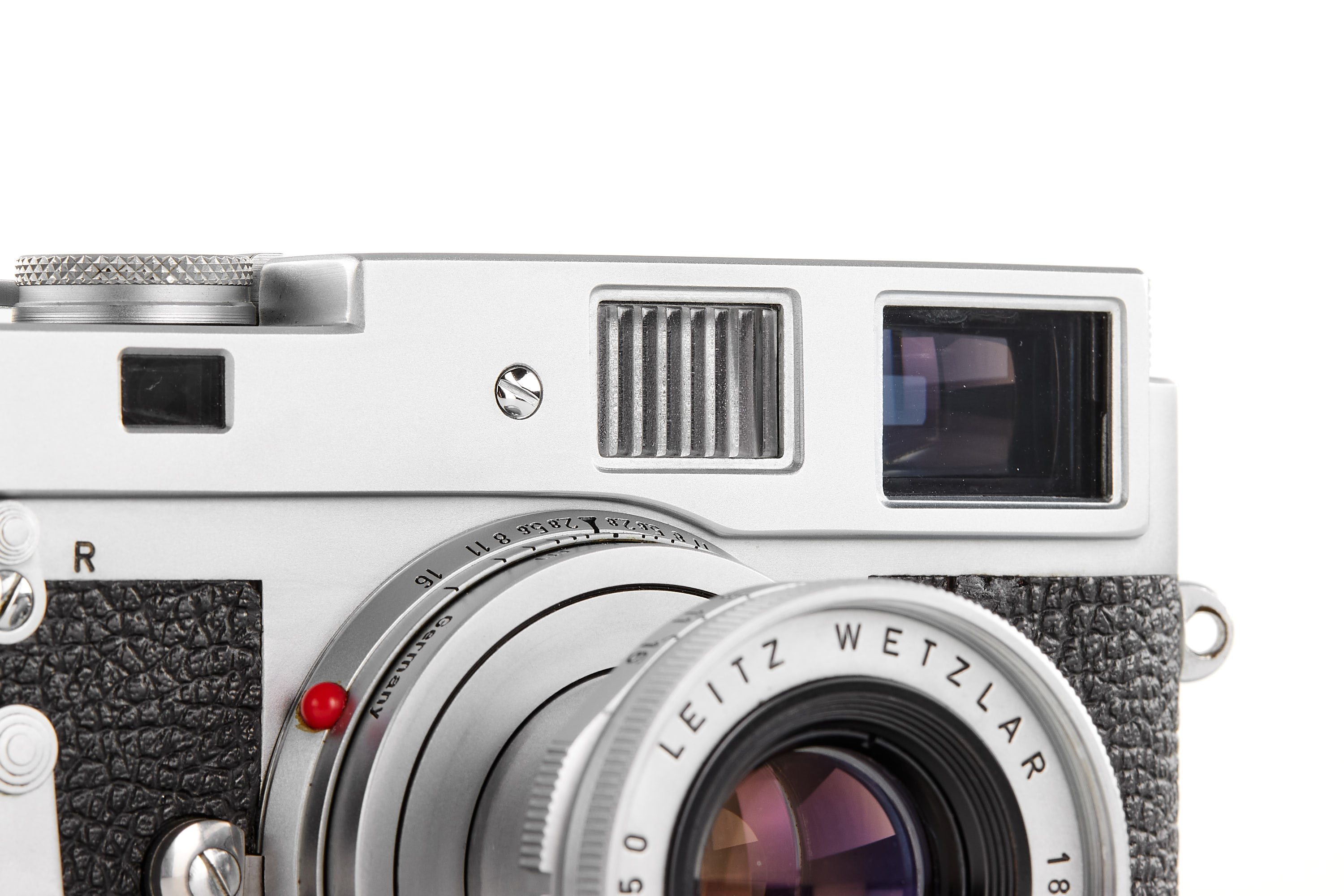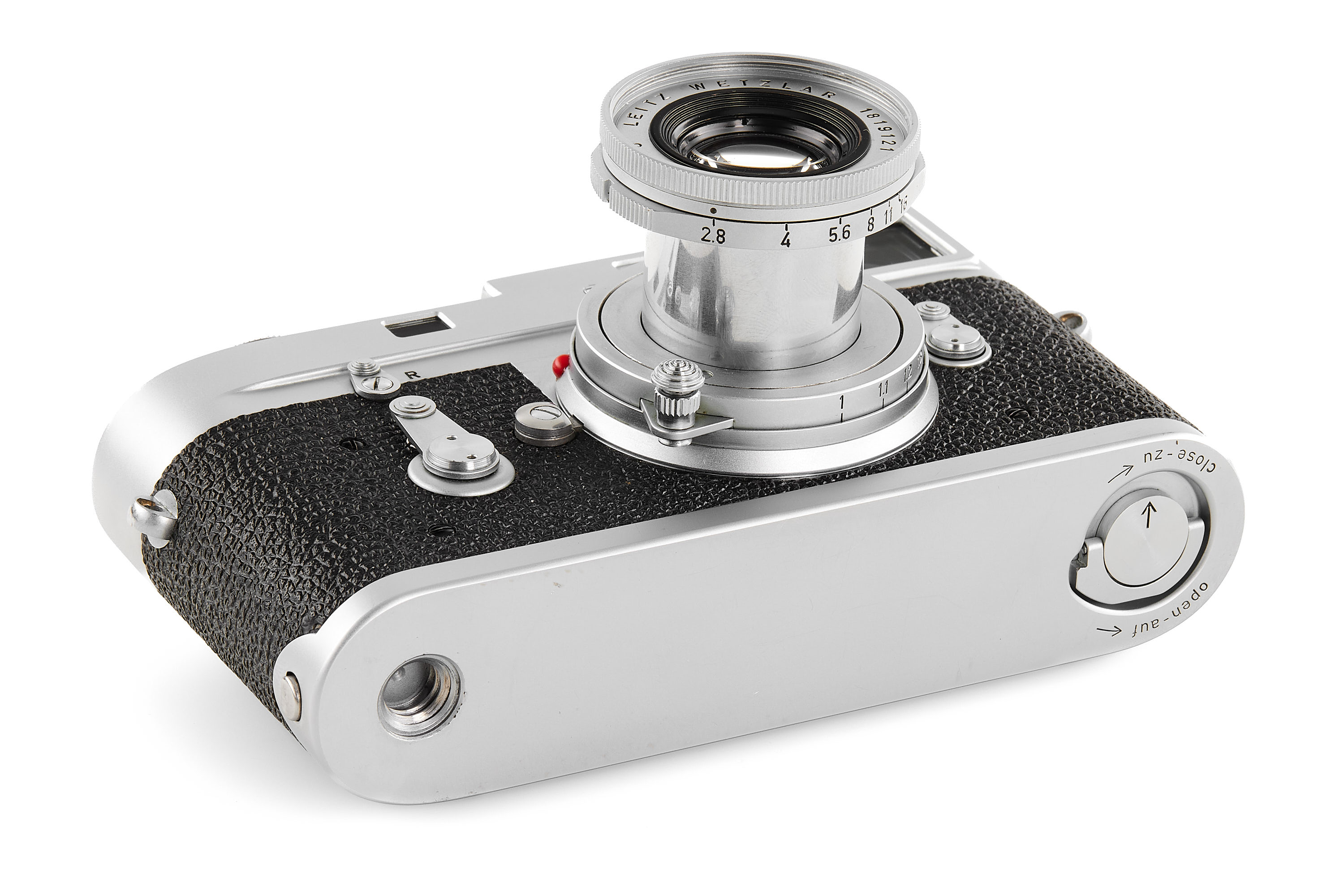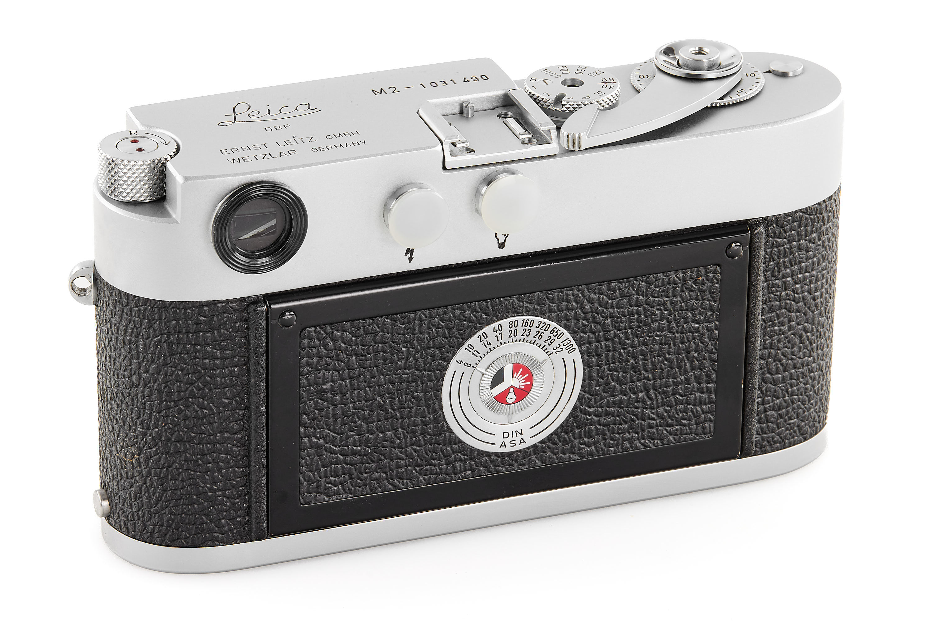 Beautiful Leica M2 in almost mint condition and working order, with meter scaled Elmar 2.8/50mm no.1819121, good optics only showing minimal cleaning marks, with front lens cap and UVa filter, both delivered to Brussels in 1962.