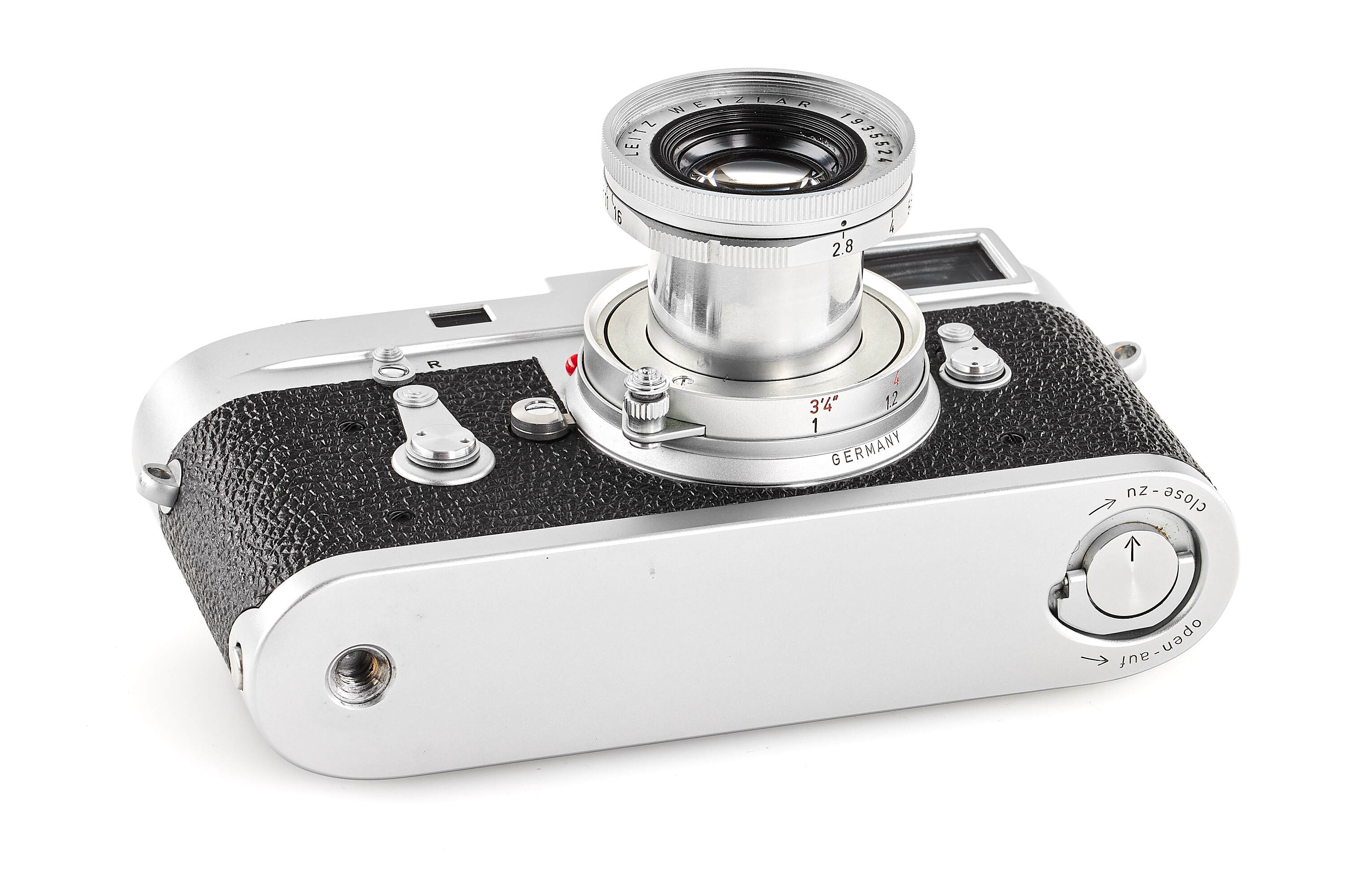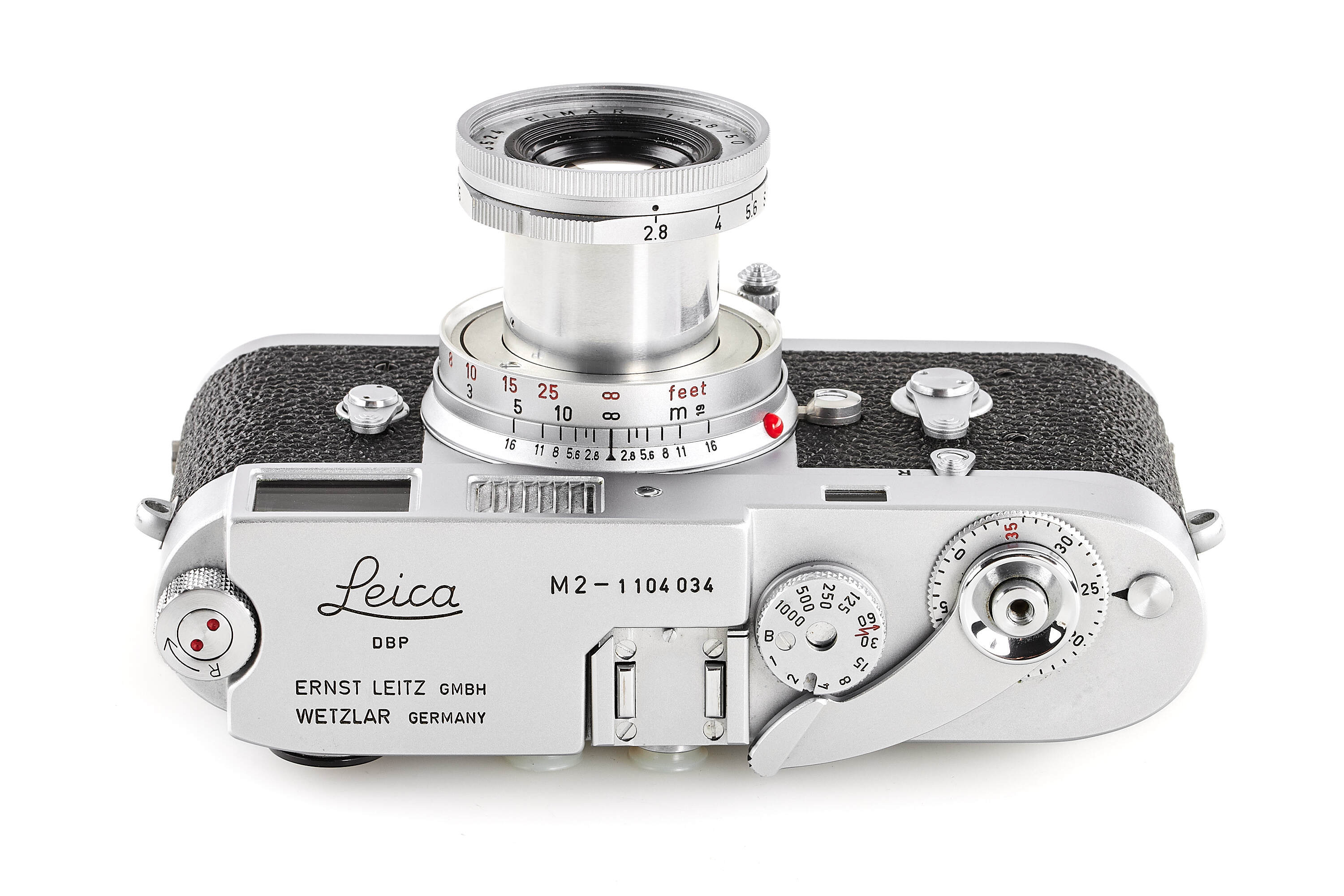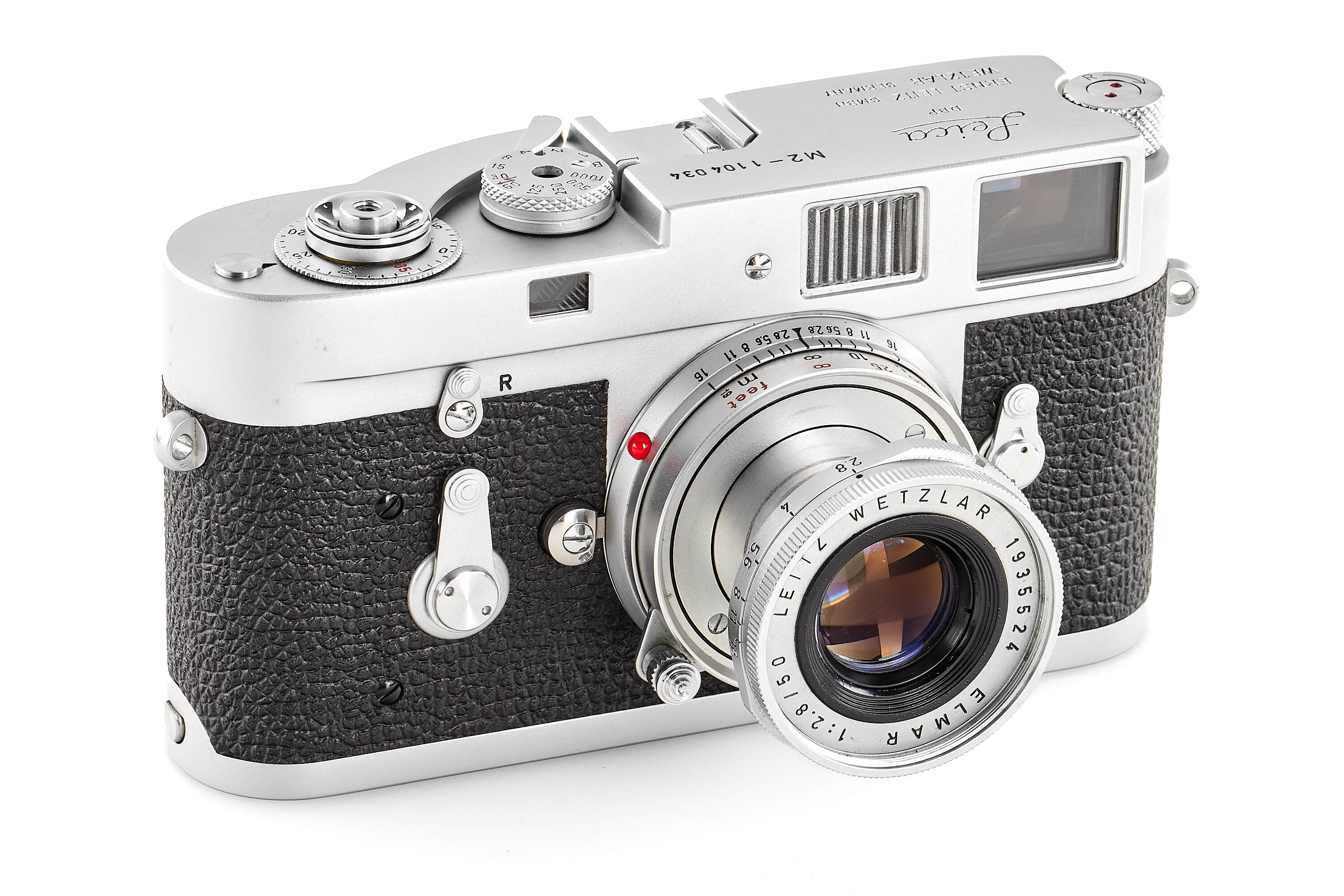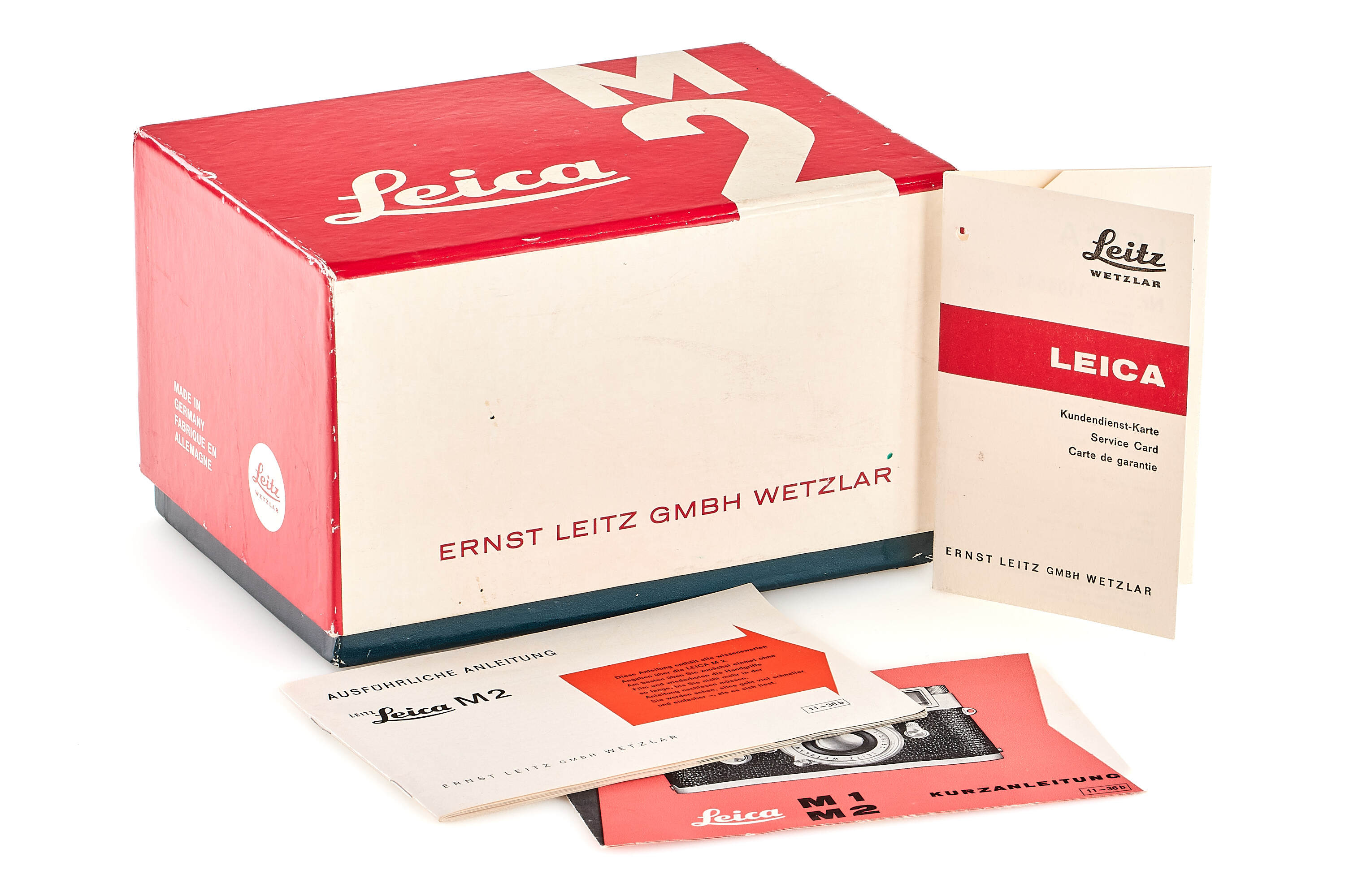 A Leica M2 body with self-timer, in beautiful, near-mint condition and good working order, with near-mint Elmar 2.8/50mm no.1935524, leather case, unnumbered maker's box, instructions and a warranty card with matching serial number.