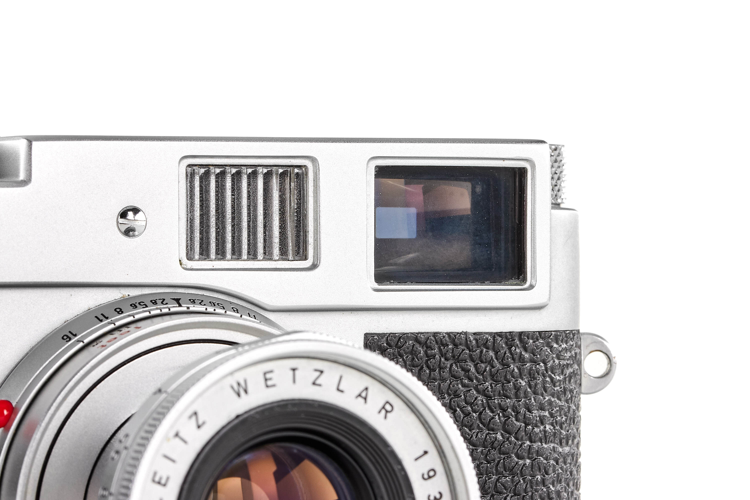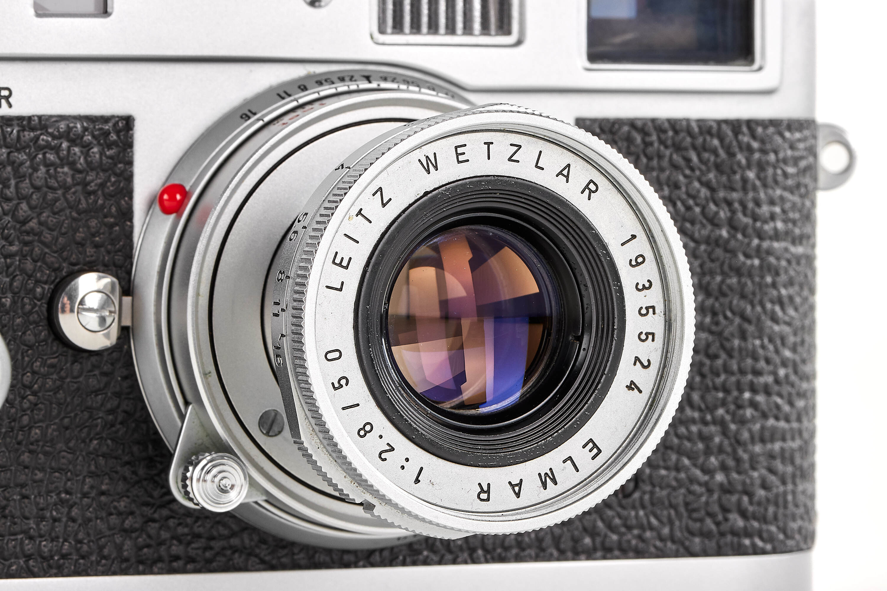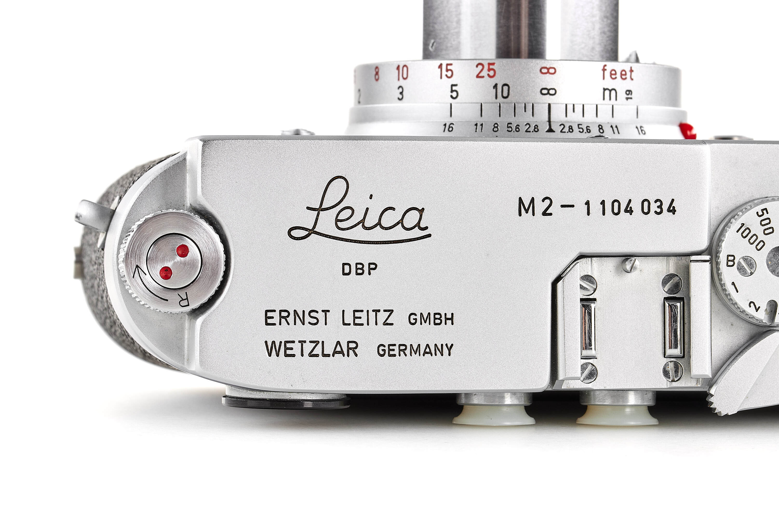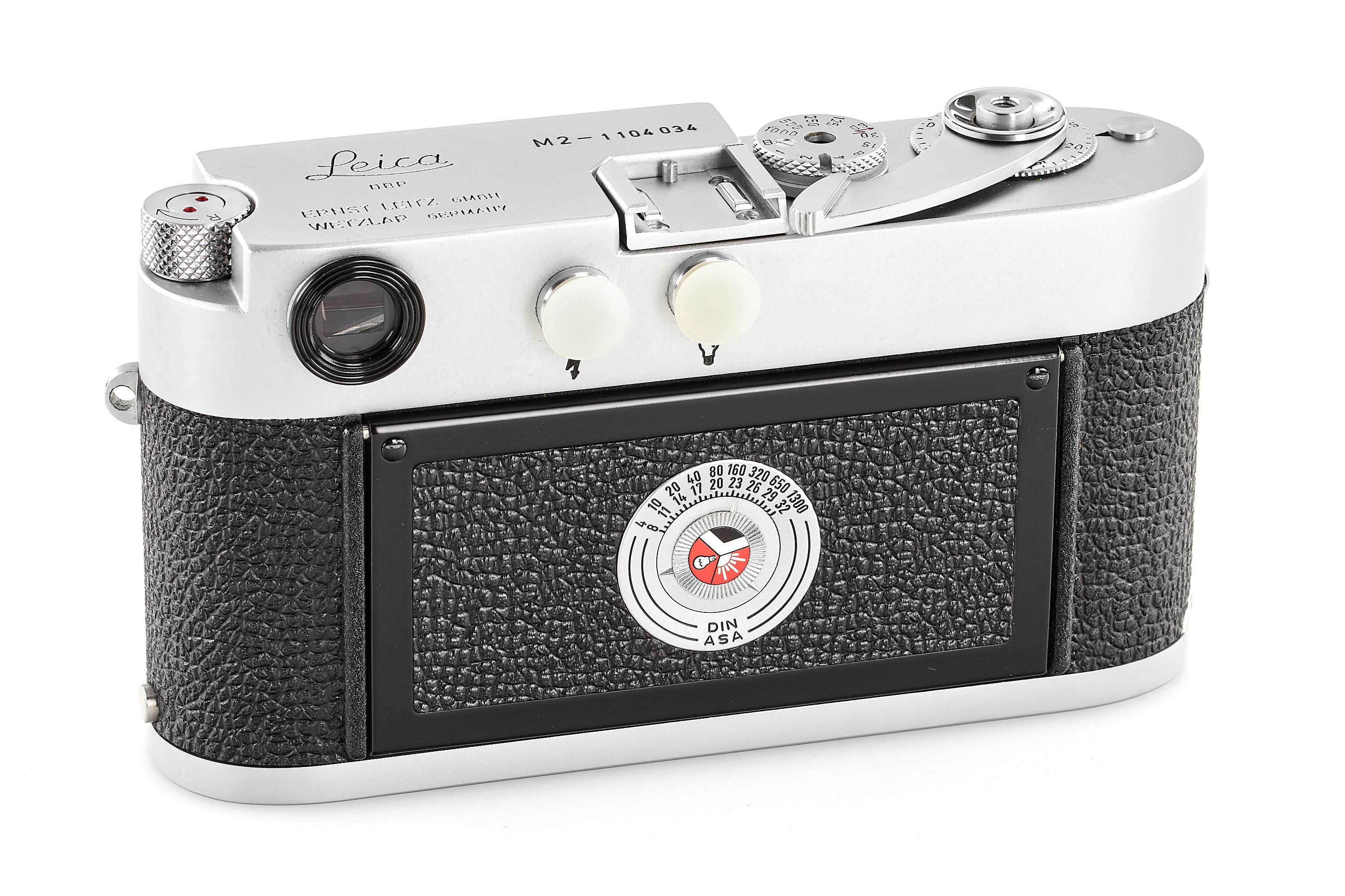 A Leica M2 body with self-timer, in beautiful, near-mint condition and good working order, with near-mint Elmar 2.8/50mm no.1935524, leather case, unnumbered maker's box, instructions and a warranty card with matching serial number.
