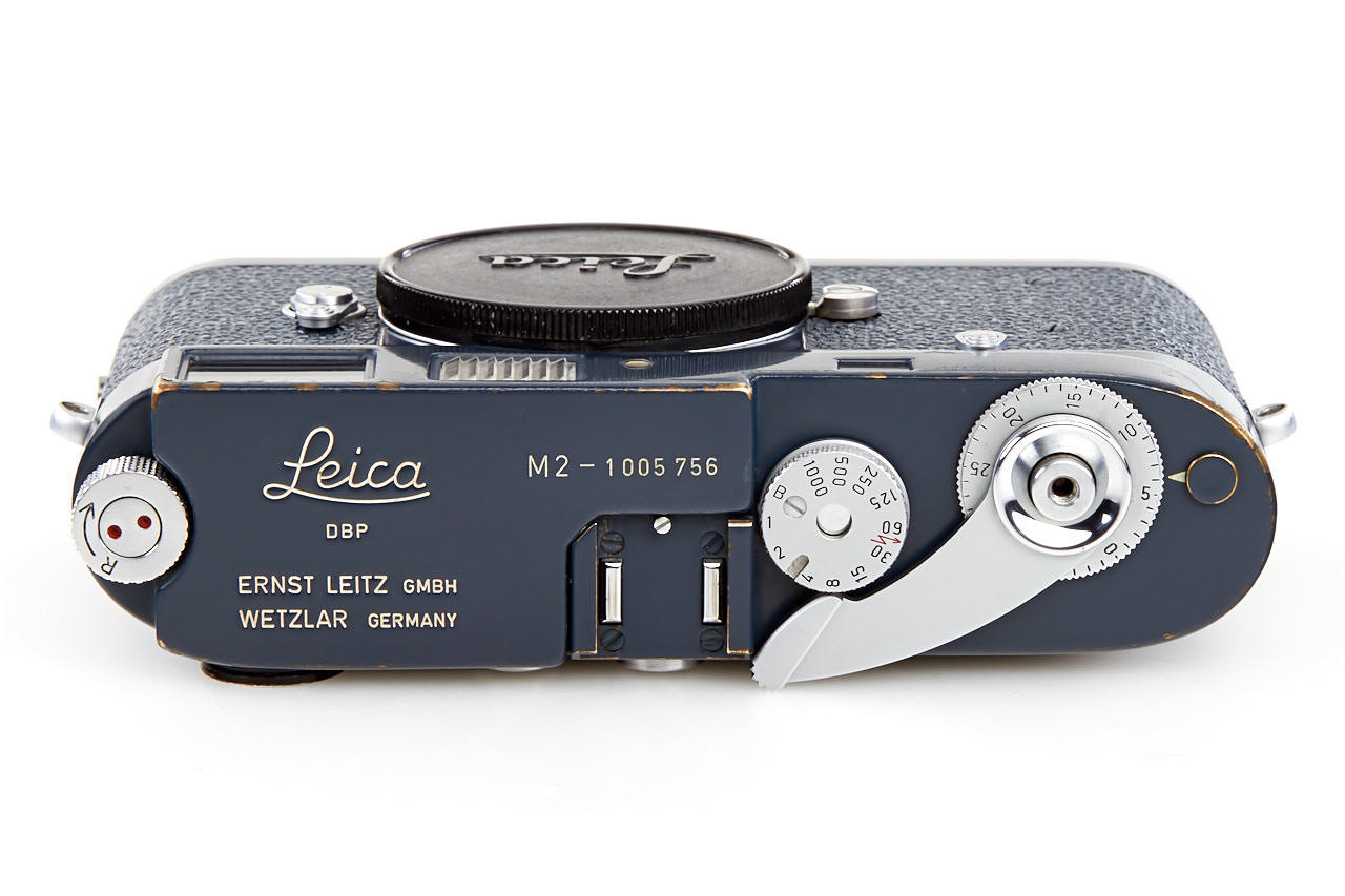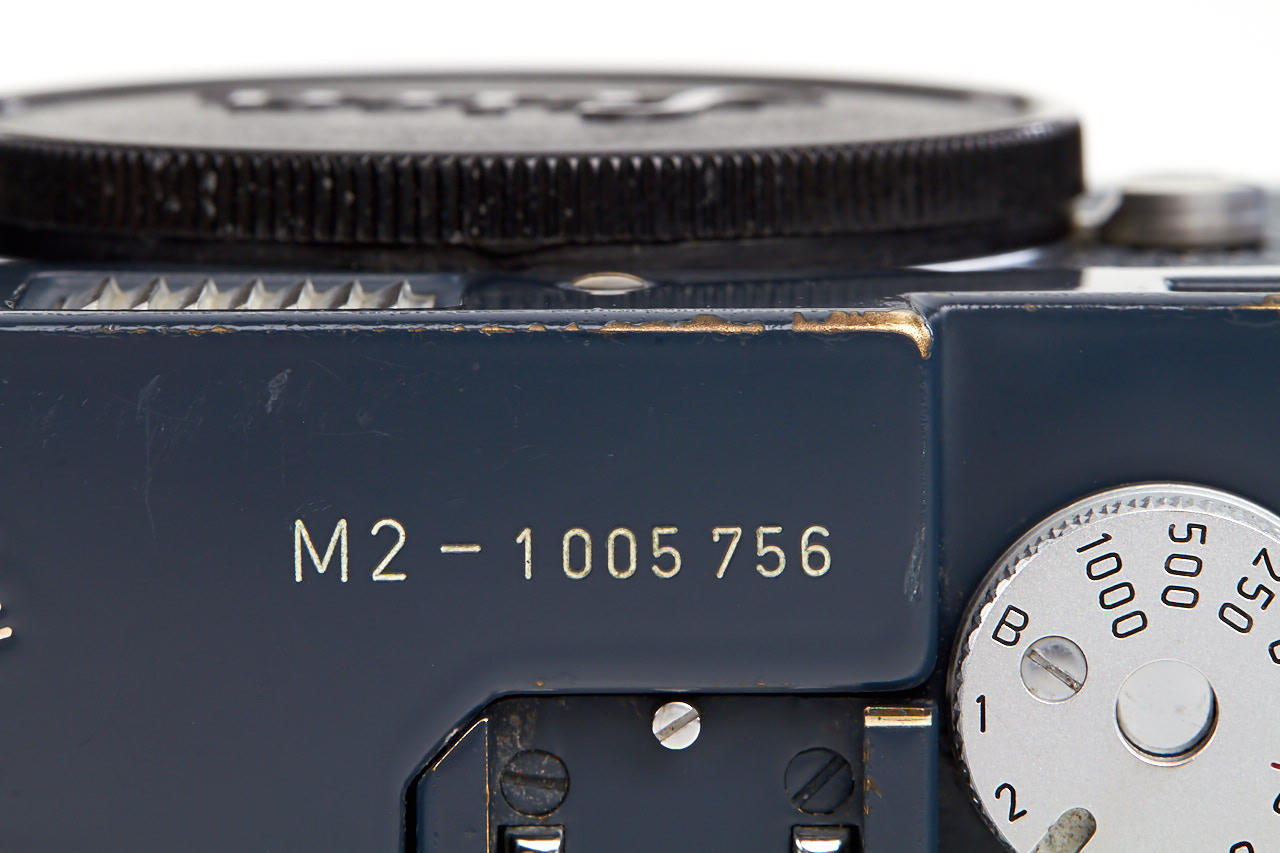 In 1960 twenty M2 grey painted cameras (nos.1005751-1005770) were delivered to the US Air Force in Germany, the offered camera no.1105756 is in beautiful 100% original and working condition, still with 'L' seal. Only approx. 10 cameras are believed still to exist, it is the second camera to be sold in public auction. The grey M2 is one of the most rare production Leica cameras ever - the camera was delivered to U.S.A. F.E. Wiesb. on June 9th, 1960 - this camera is illustrated in Lager I page 157 - ex Jim Jannard collection !