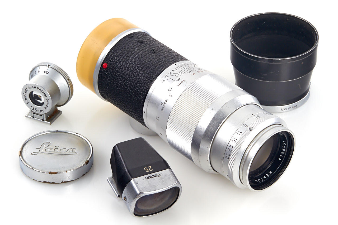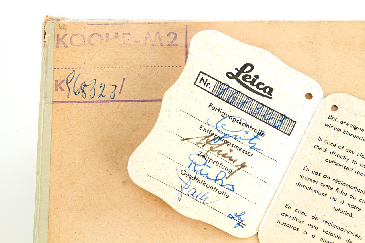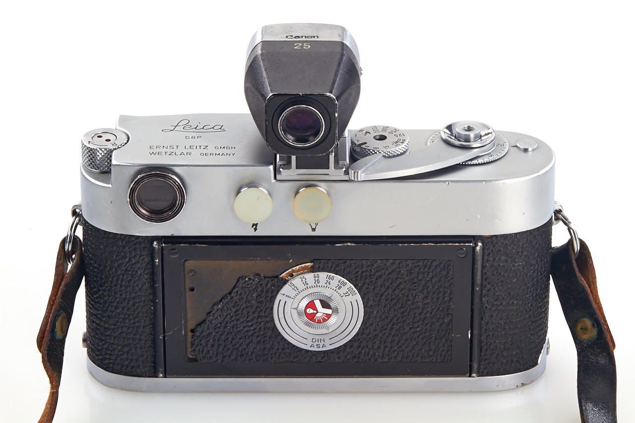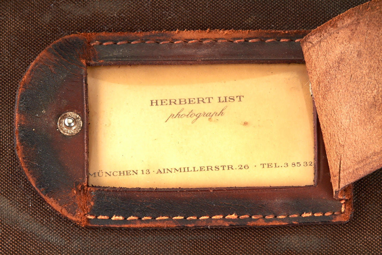 Outfit from the estate of the famous German photographer Herbert List, including M2 body no.968323 (1959, button rewind model, dent on top plate, original maker's box with matching number, red/gold inspection card, instructions), Canon Lens 3.5/25mm no.12517 with M-adapter and 25mm Canon finder (condition B/C), Hektor 4.5/13.5cm no.1689544 (hood, filter, caps, 135mm finder SHOOC with box) - with a beautiful leather case used and owned by Herbert List (c.37x40x66cm) with the name card 'HERBERT LIST photograph MÜNCHEN 13 AINMILLERSTR.26 TEL.38532' attached on the case. The outfit comes with a the certificate of provenance and a very fine vintage portrait photograph (24x30cm) of Herbert List taken by Berndt List in 1963.