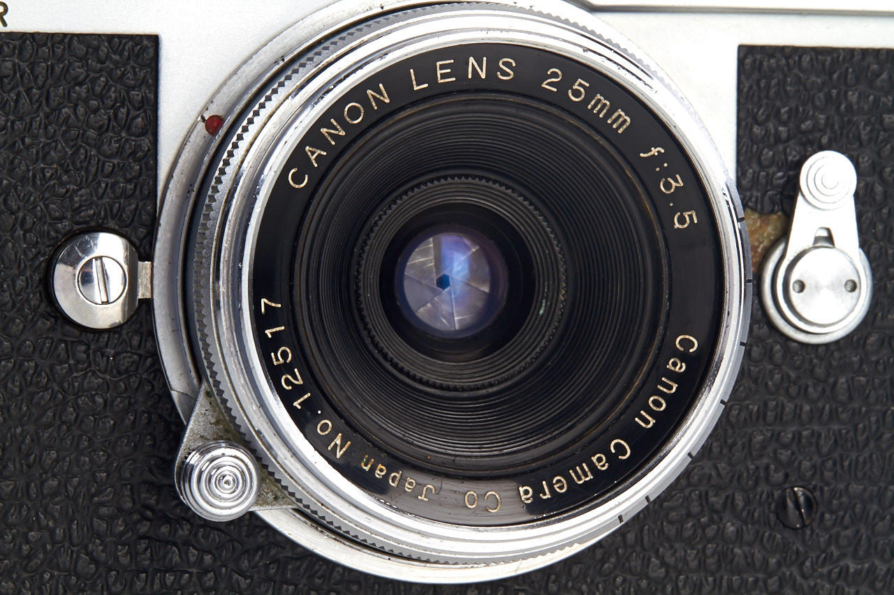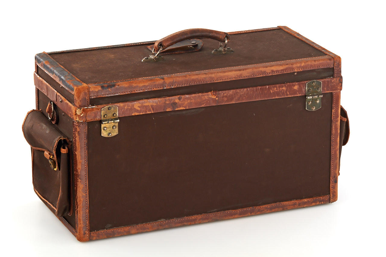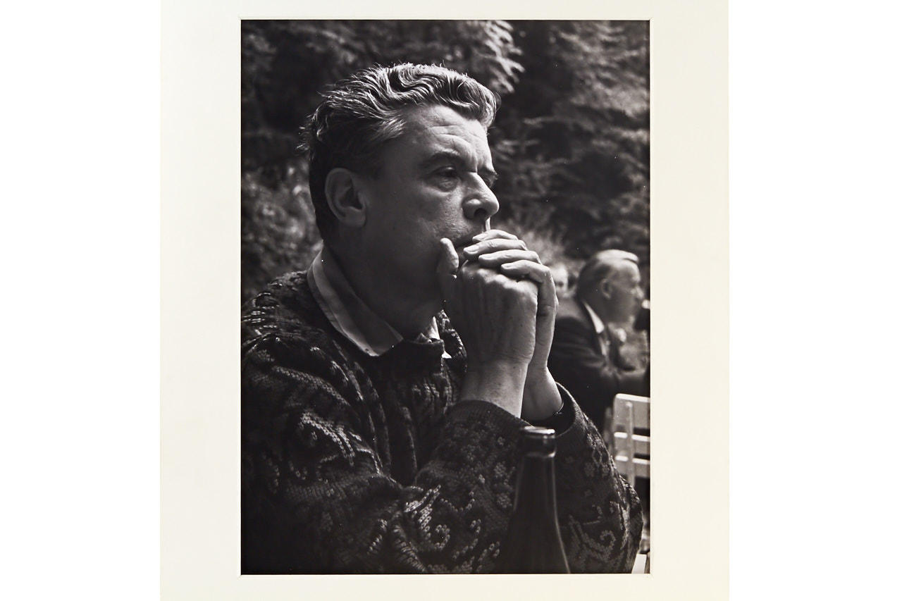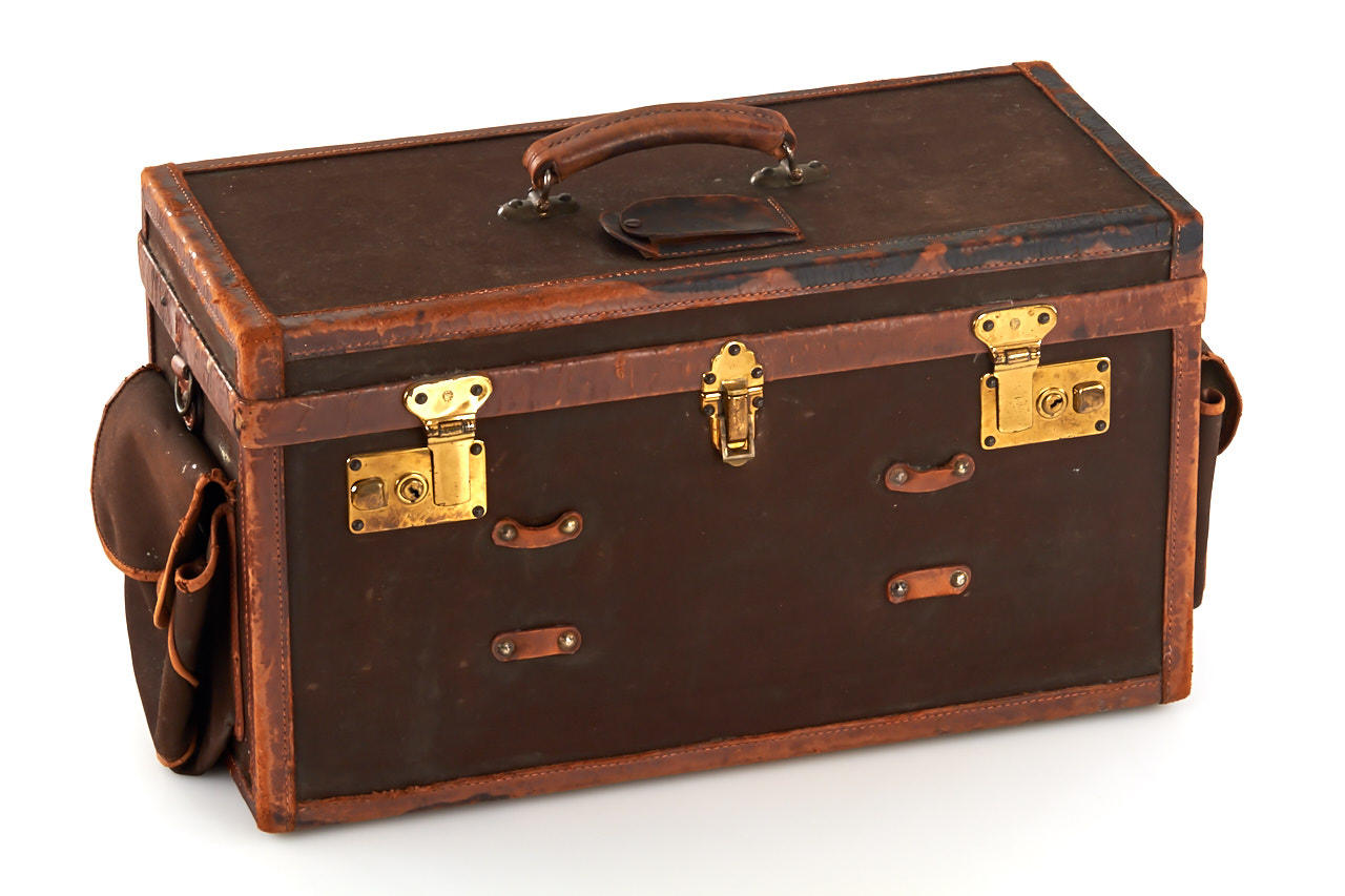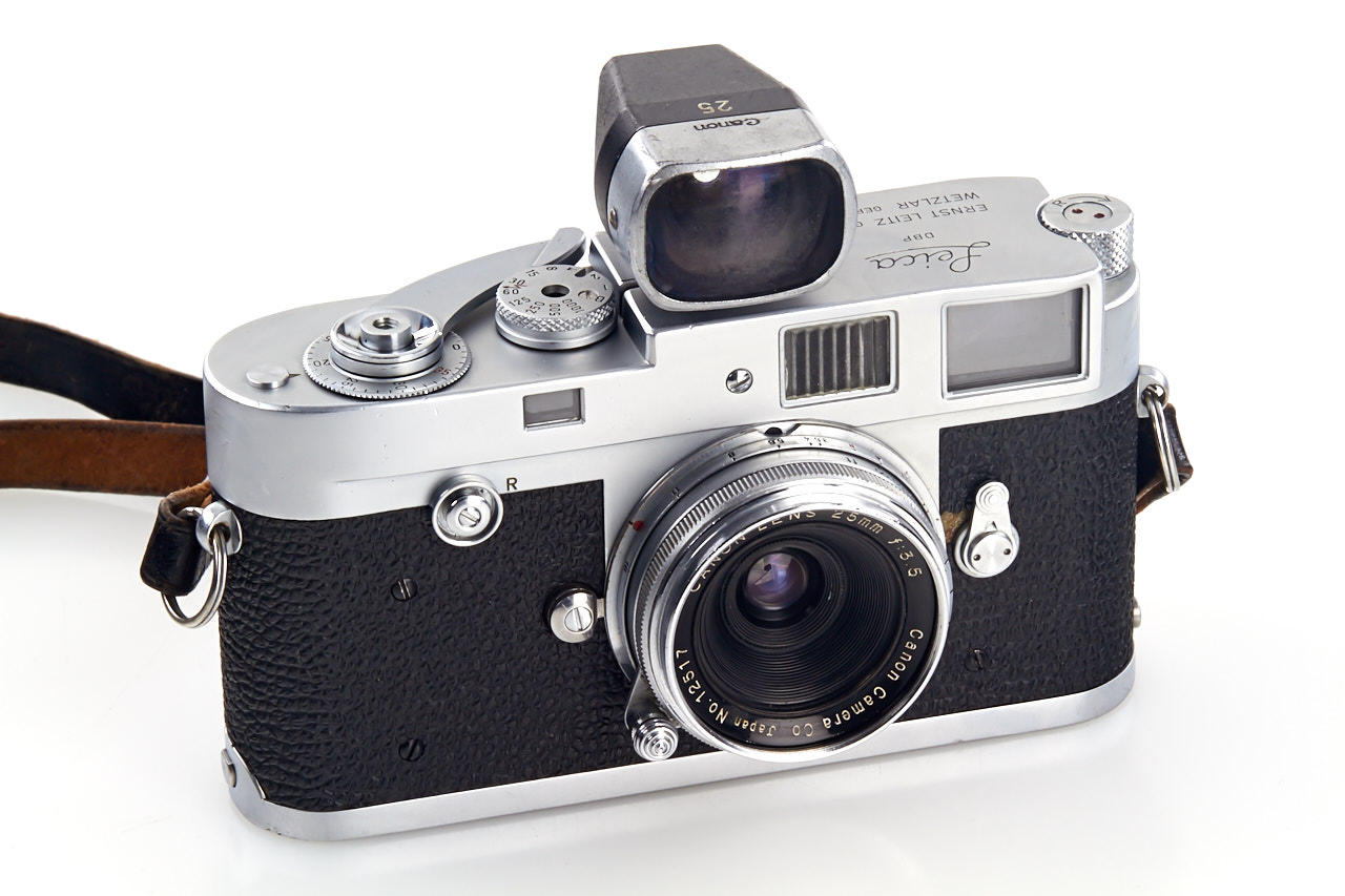 Outfit from the estate of the famous German photographer Herbert List, including M2 body no.968323 (1959, button rewind model, dent on top plate, original maker's box with matching number, red/gold inspection card, instructions), Canon Lens 3.5/25mm no.12517 with M-adapter and 25mm Canon finder (condition B/C), Hektor 4.5/13.5cm no.1689544 (hood, filter, caps, 135mm finder SHOOC with box) - with a beautiful leather case used and owned by Herbert List (c.37x40x66cm) with the name card 'HERBERT LIST photograph MÜNCHEN 13 AINMILLERSTR.26 TEL.38532' attached on the case. The outfit comes with a the certificate of provenance and a very fine vintage portrait photograph (24x30cm) of Herbert List taken by Berndt List in 1963.