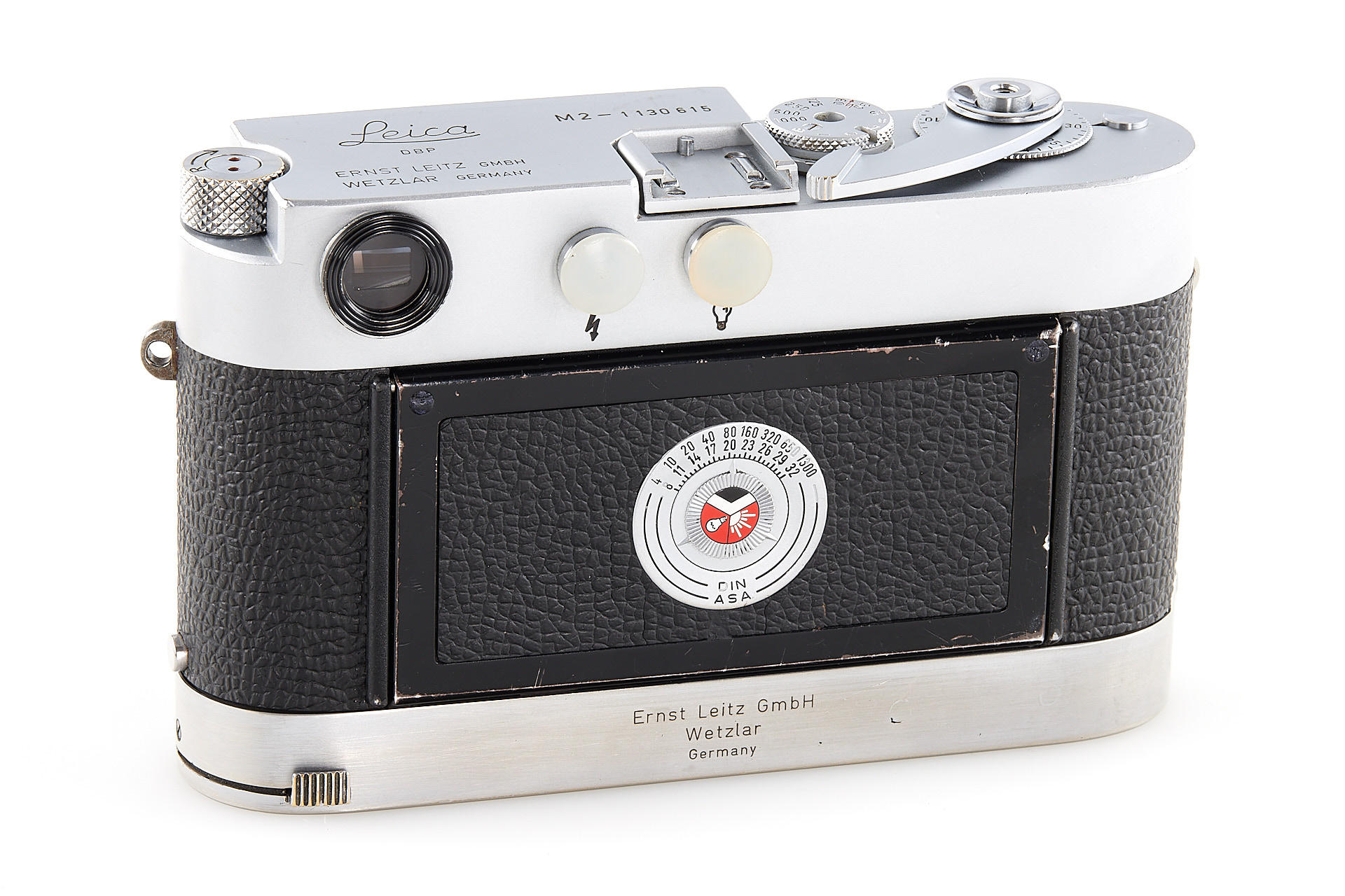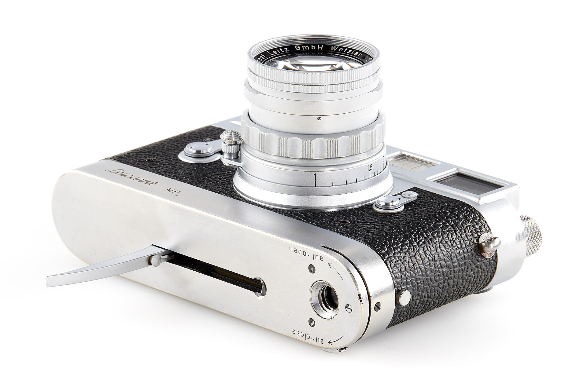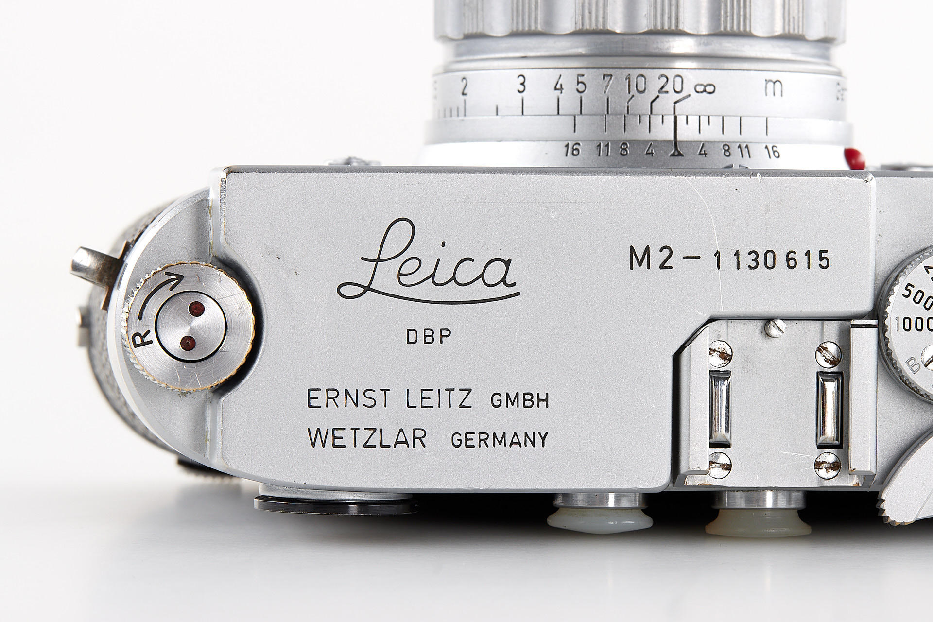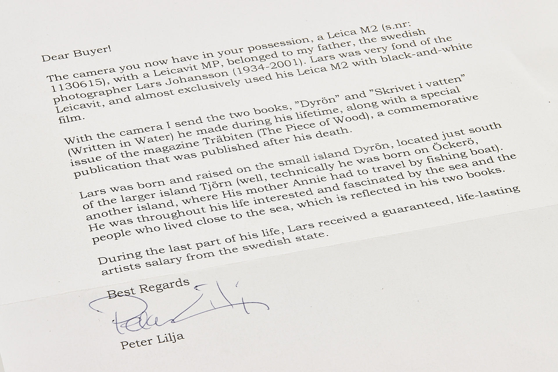 chrome Leica M2 used and owned by known swedish photographer Lars Johansson (1934-2001). The camera shows signs of professional use, but it is still perfectly working. Included in the set is a Leicavit MP (cond. B-), and rigid Summicron 2/5cm no.1606763 (very good optics). Also included with this special camera is a letter of confirmation from the son of Johansson and photo book Dyrön by the photographer.