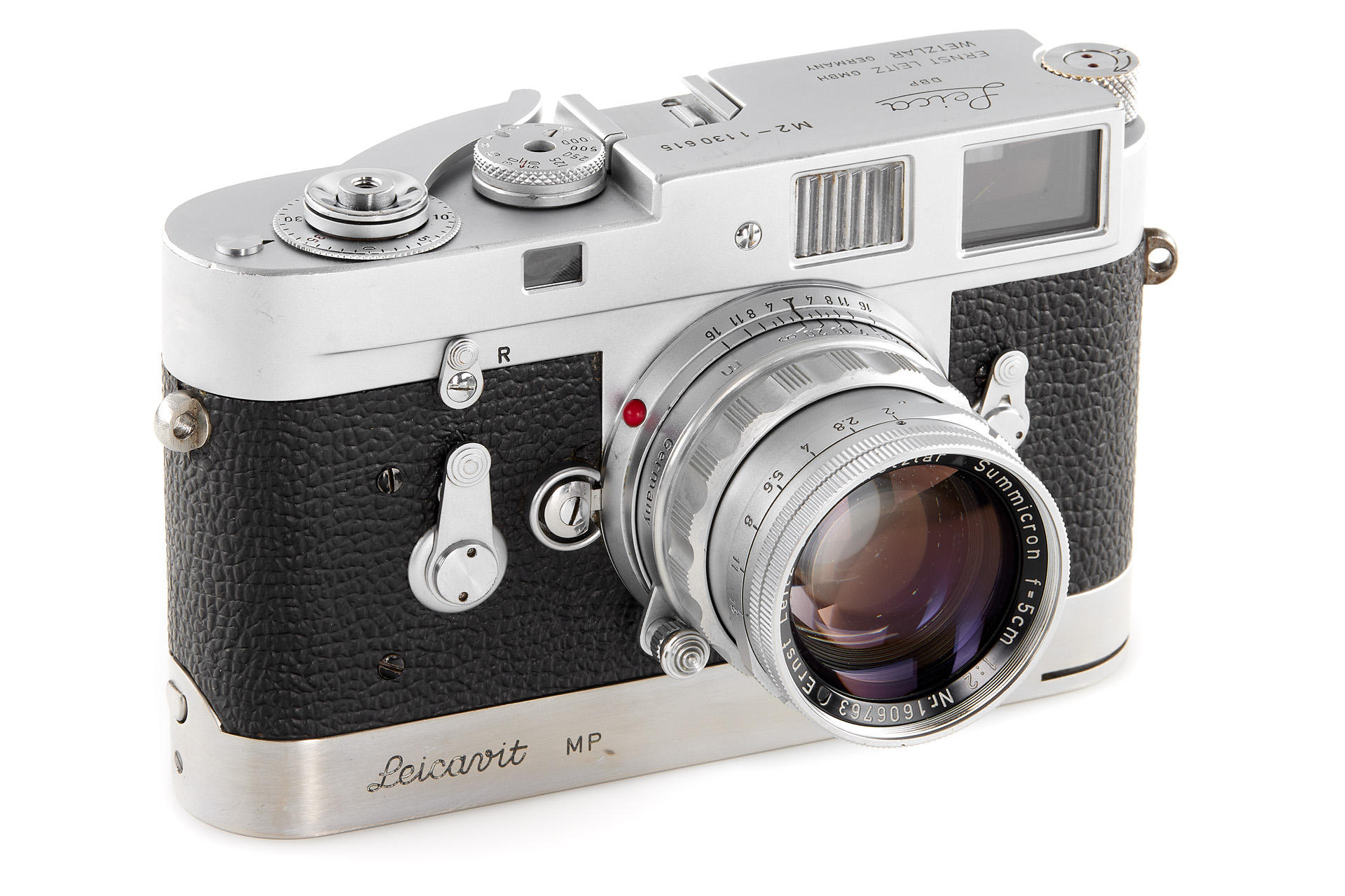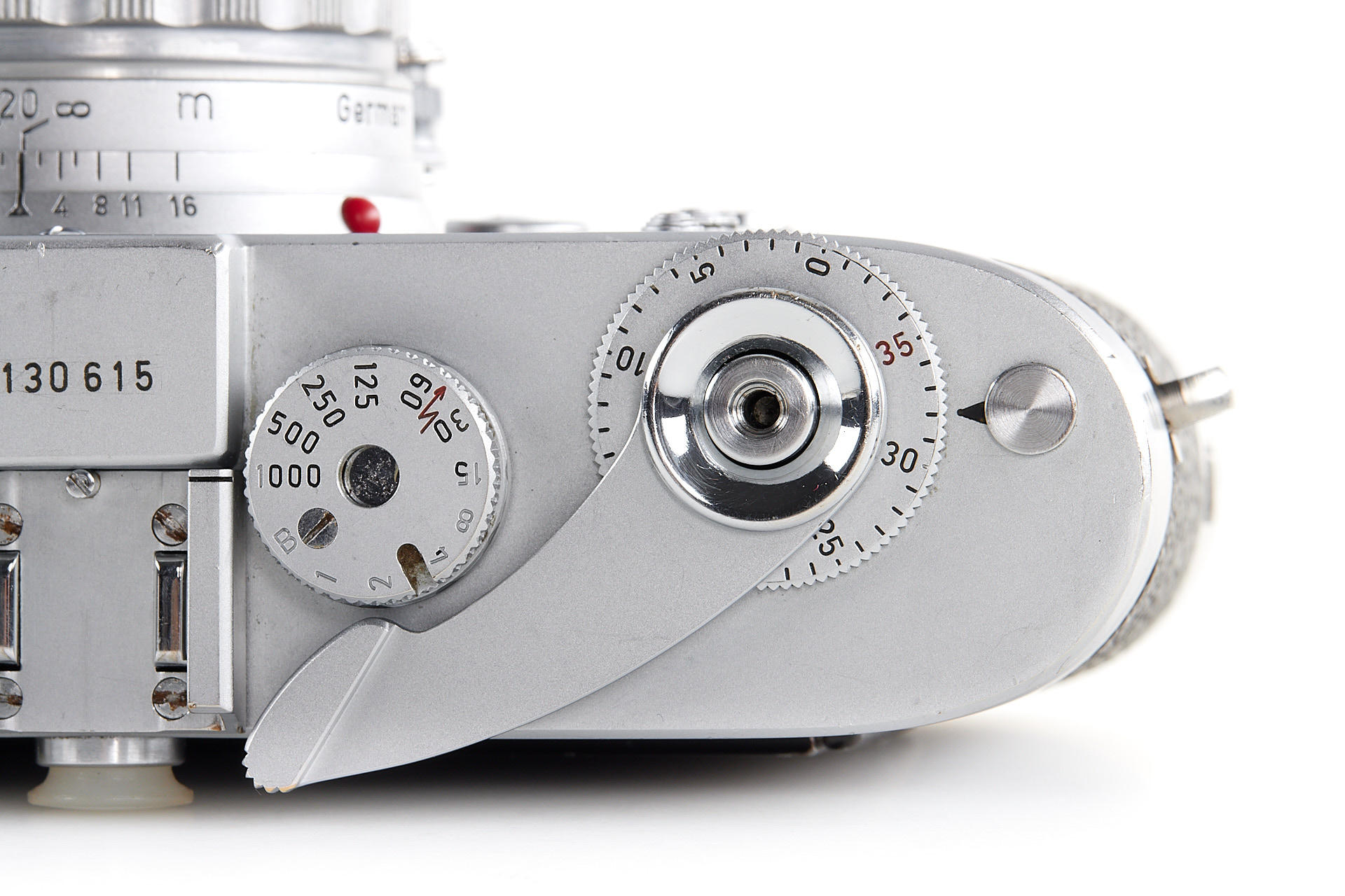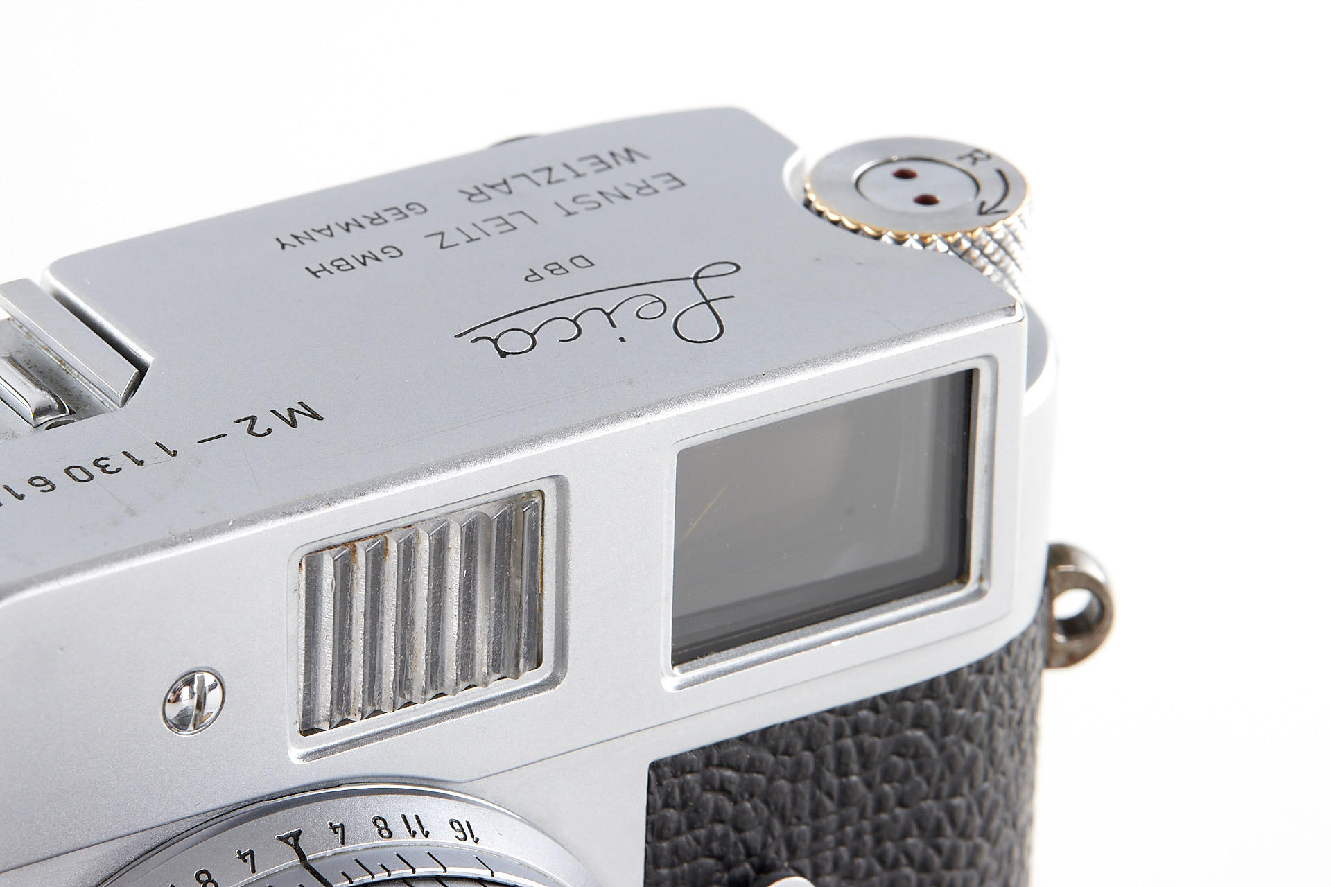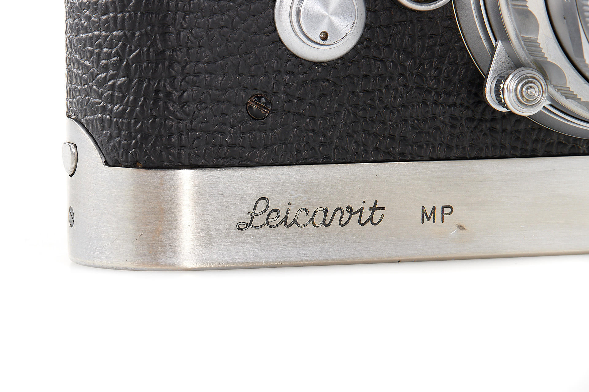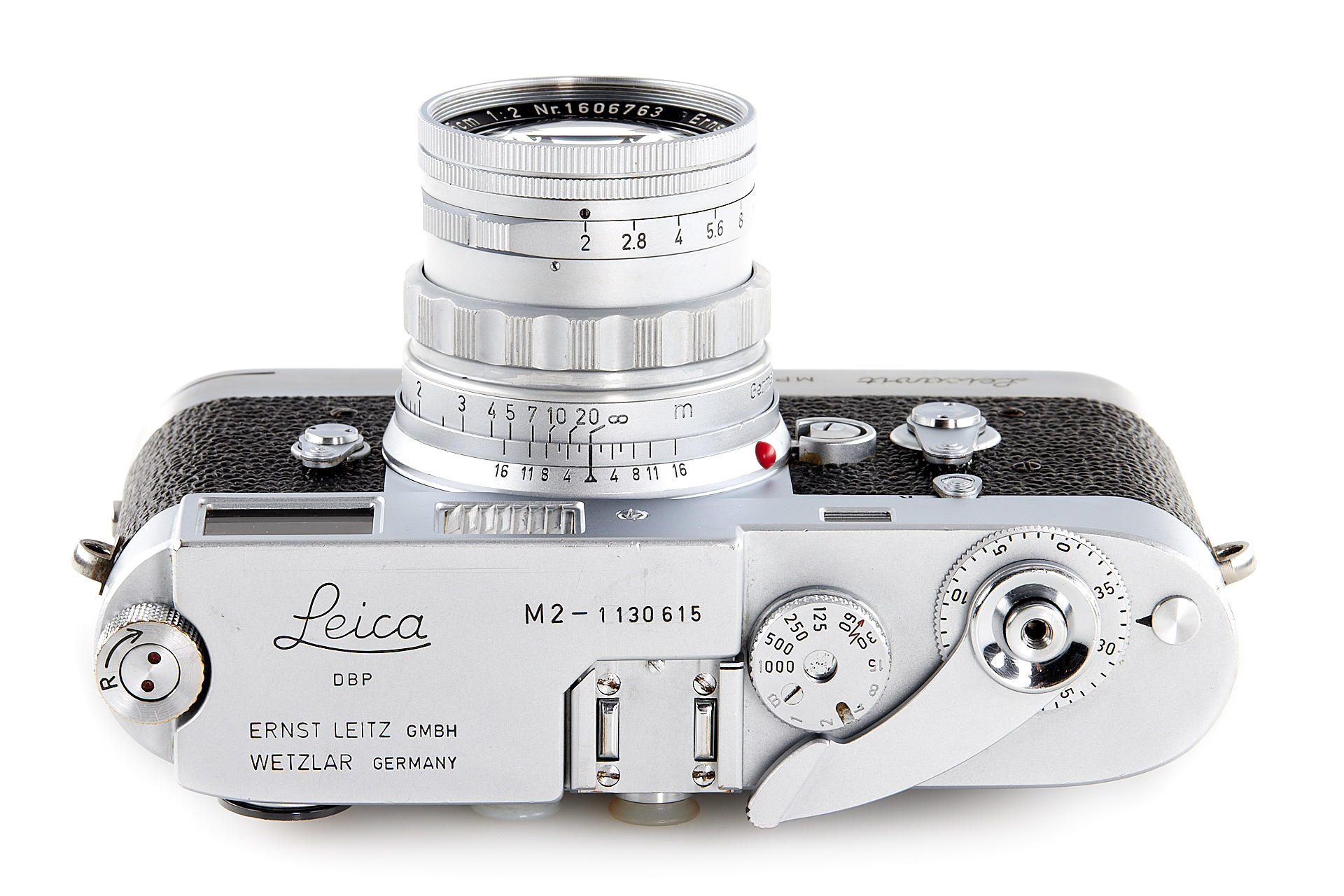chrome Leica M2 used and owned by known swedish photographer Lars Johansson (1934-2001). The camera shows signs of professional use, but it is still perfectly working. Included in the set is a Leicavit MP (cond. B-), and rigid Summicron 2/5cm no.1606763 (very good optics). Also included with this special camera is a letter of confirmation from the son of Johansson and photo book Dyrön by the photographer.