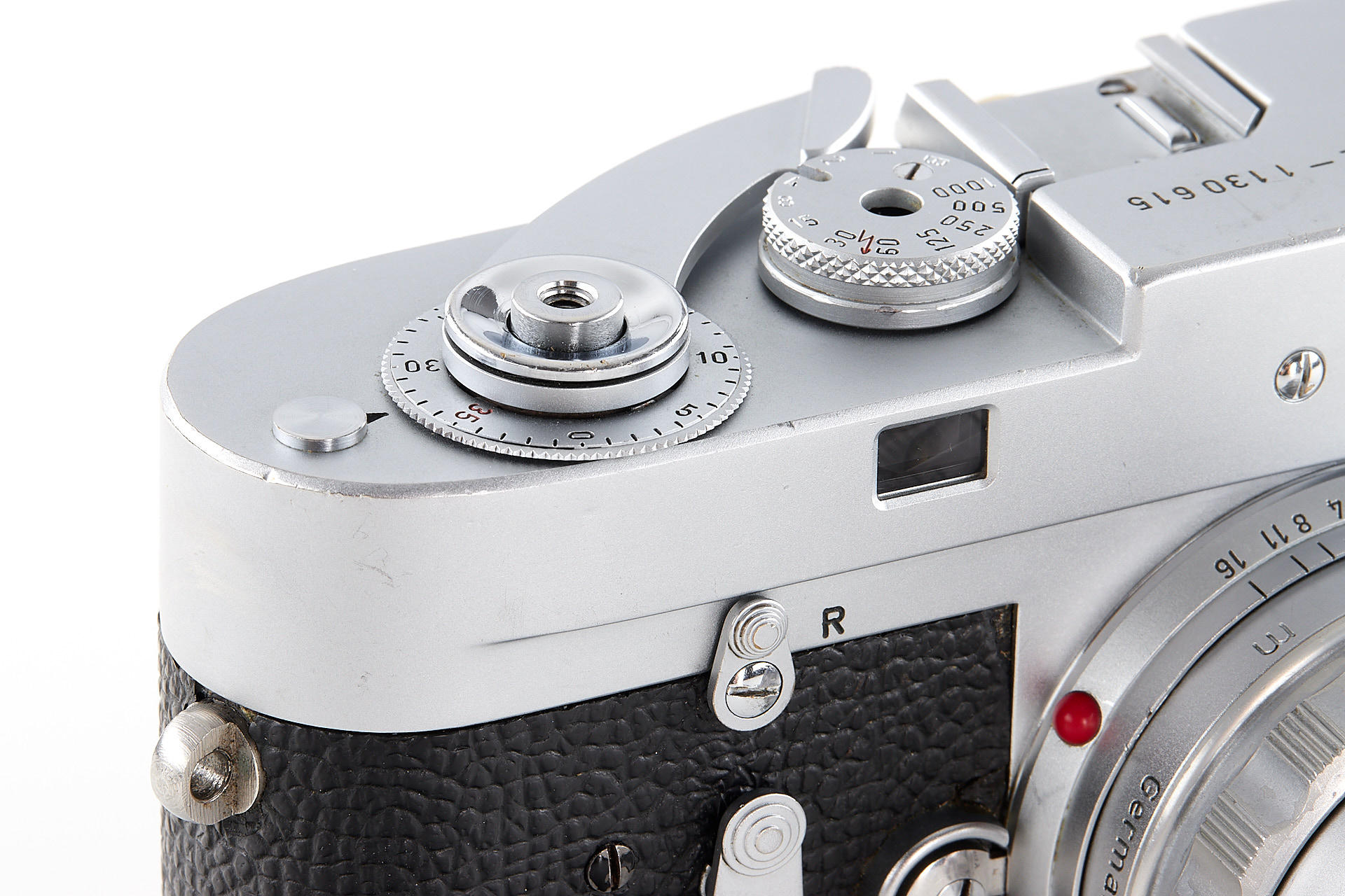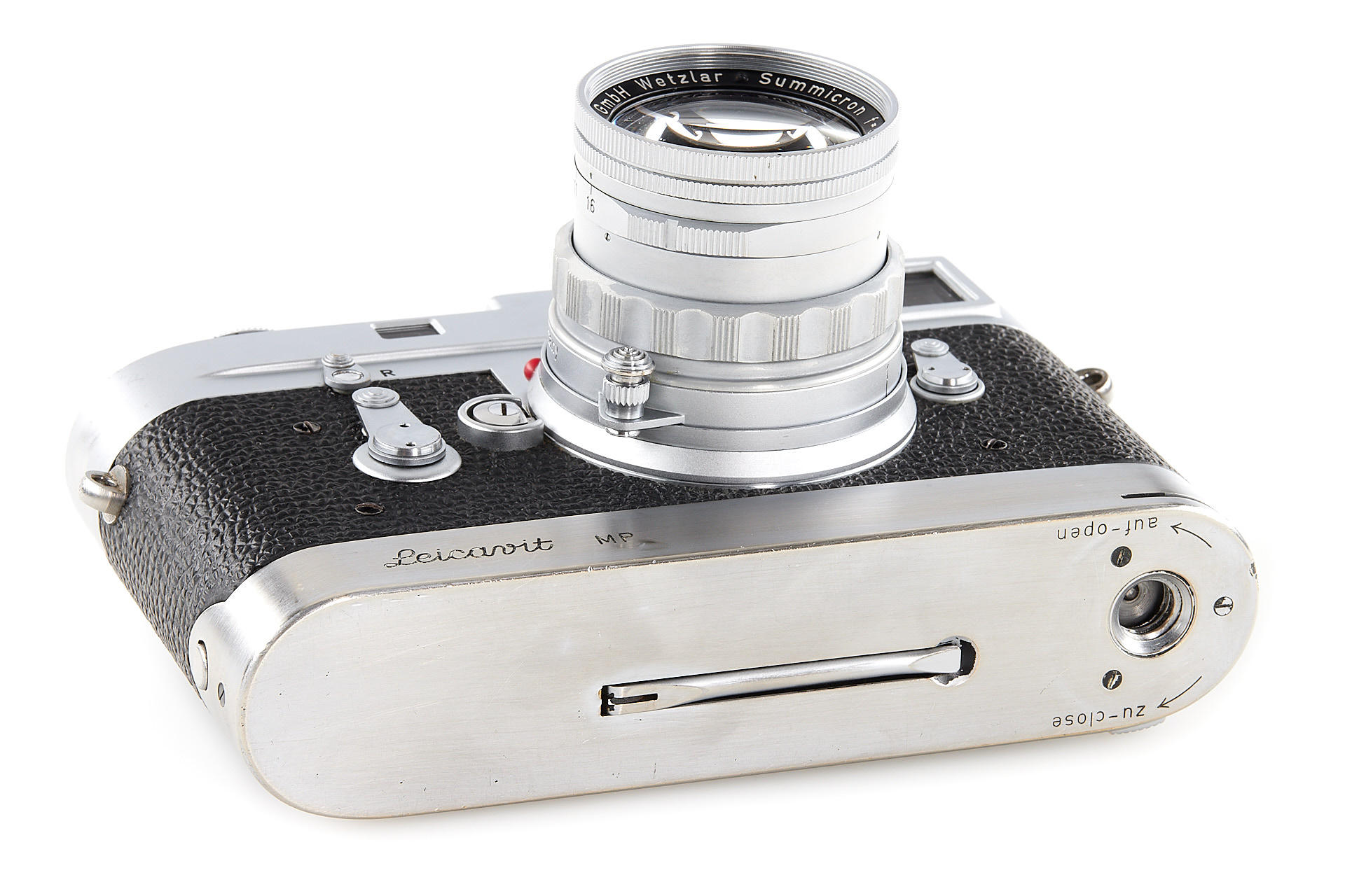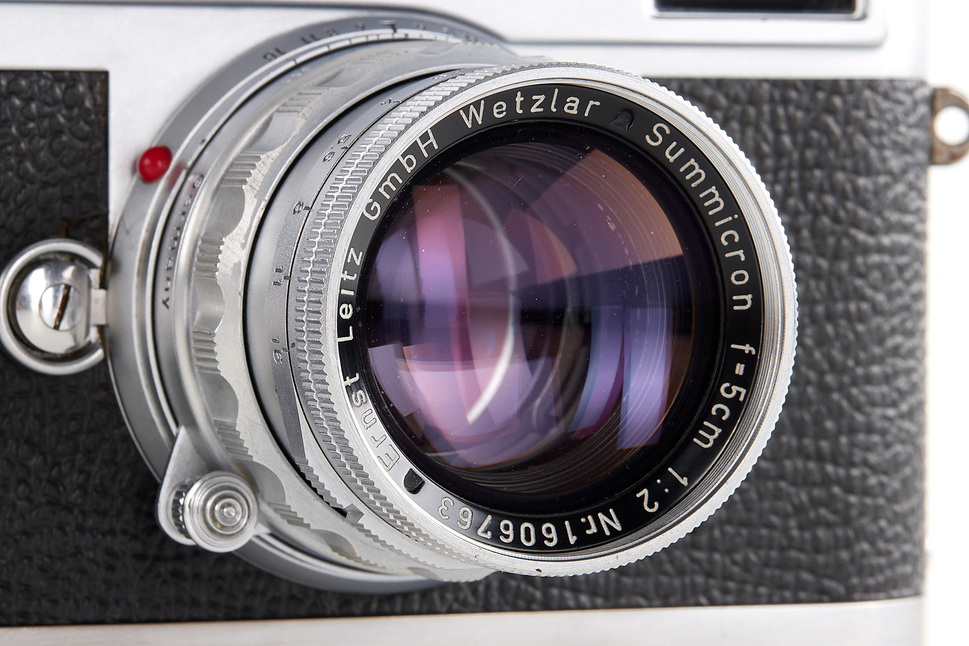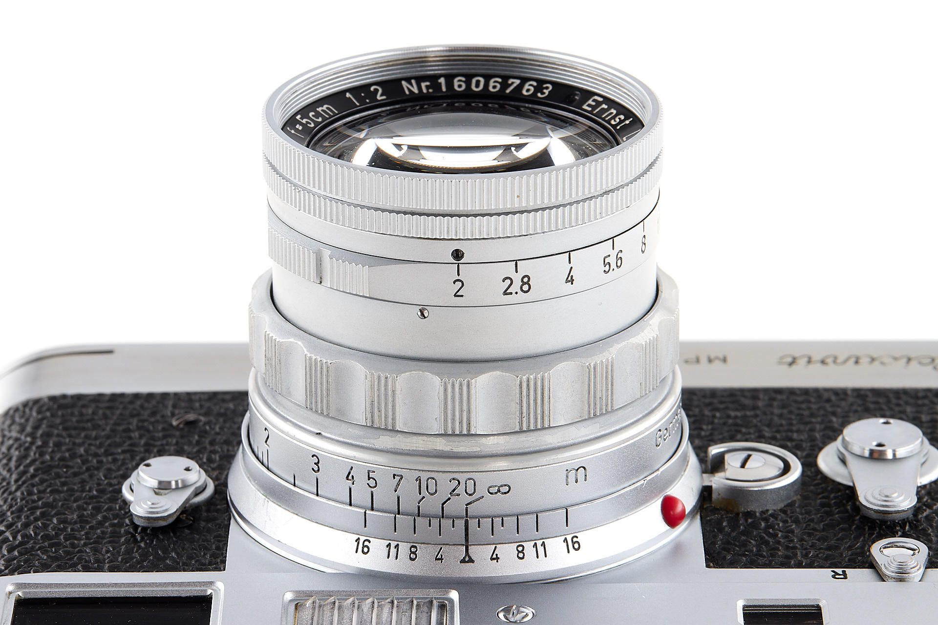 chrome Leica M2 used and owned by known swedish photographer Lars Johansson (1934-2001). The camera shows signs of professional use, but it is still perfectly working. Included in the set is a Leicavit MP (cond. B-), and rigid Summicron 2/5cm no.1606763 (very good optics). Also included with this special camera is a letter of confirmation from the son of Johansson and photo book Dyrön by the photographer.