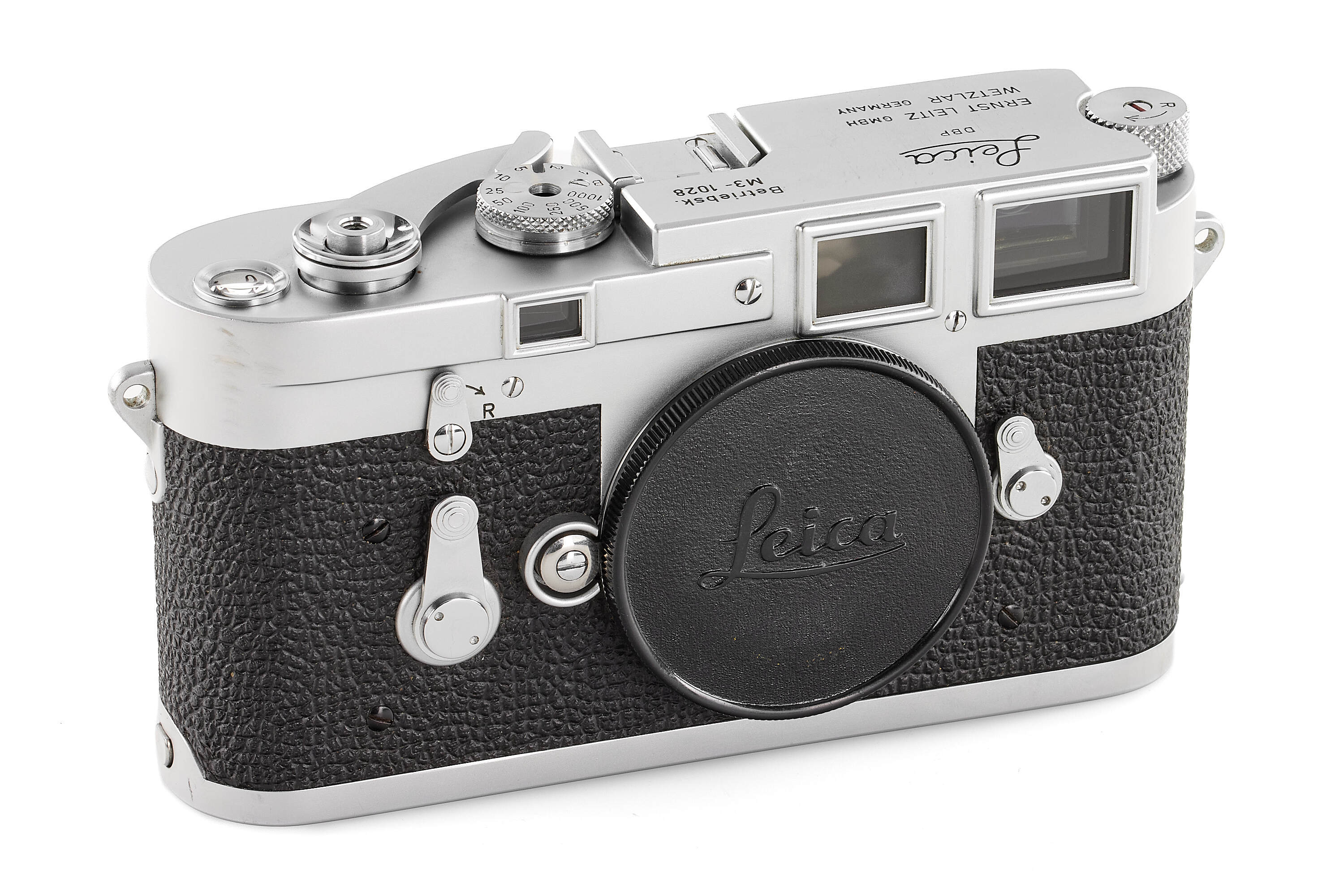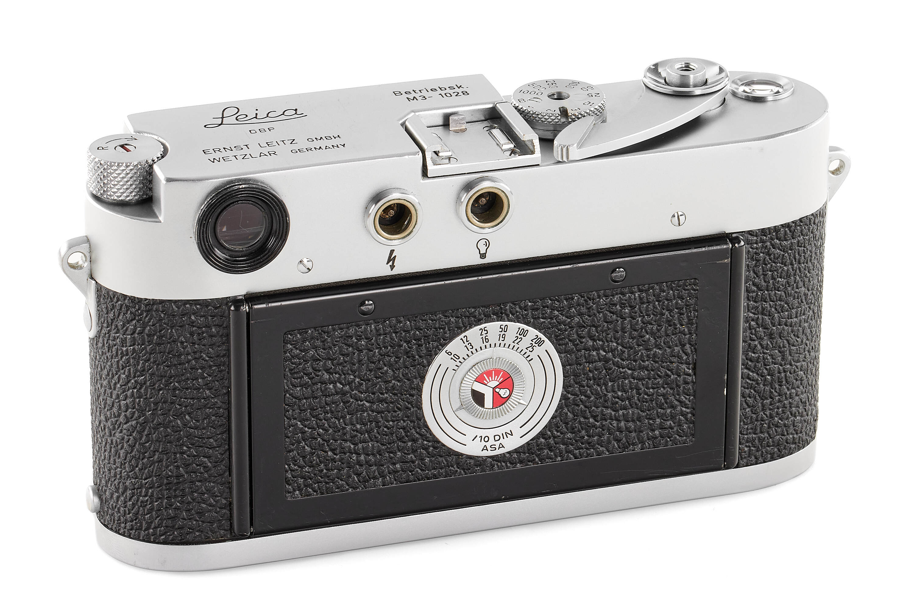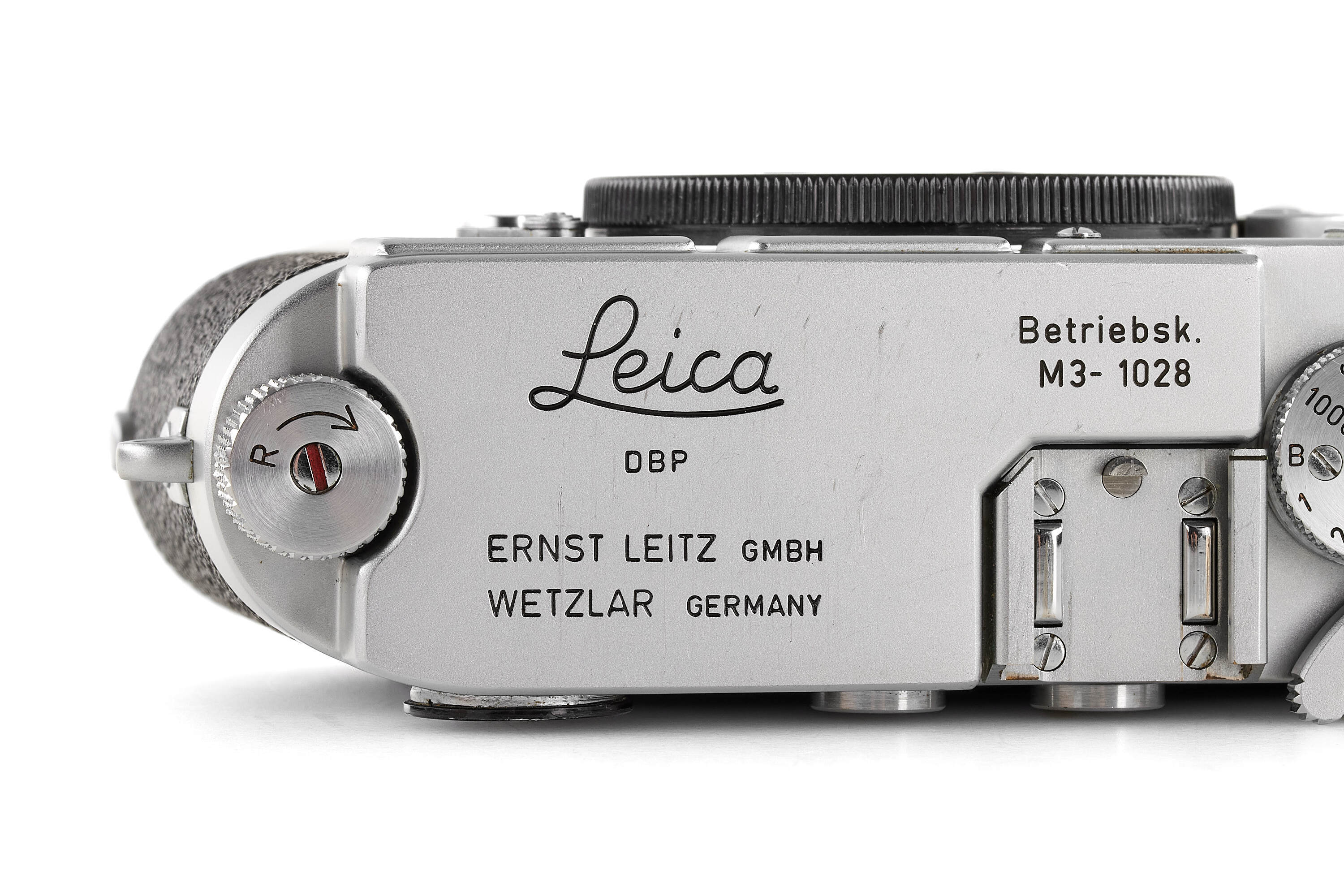 Interesting very rare and early Leica M3 Betriebskamera (for internal factory use), with some early features such as the double stroke film transport, glass press-film, memo film to 200 ISO, speed progression, etc., with frame selector, in very good condition, top plate engraved 'Betriebsk. M3 – 1028', with body cap, together with a rare sought-after DONNA Leica M3 light brown leather box, similar to the one protecting the famous and very first Leica M3 no.700000 sold at the Leitz Photographica Auction in June this year.