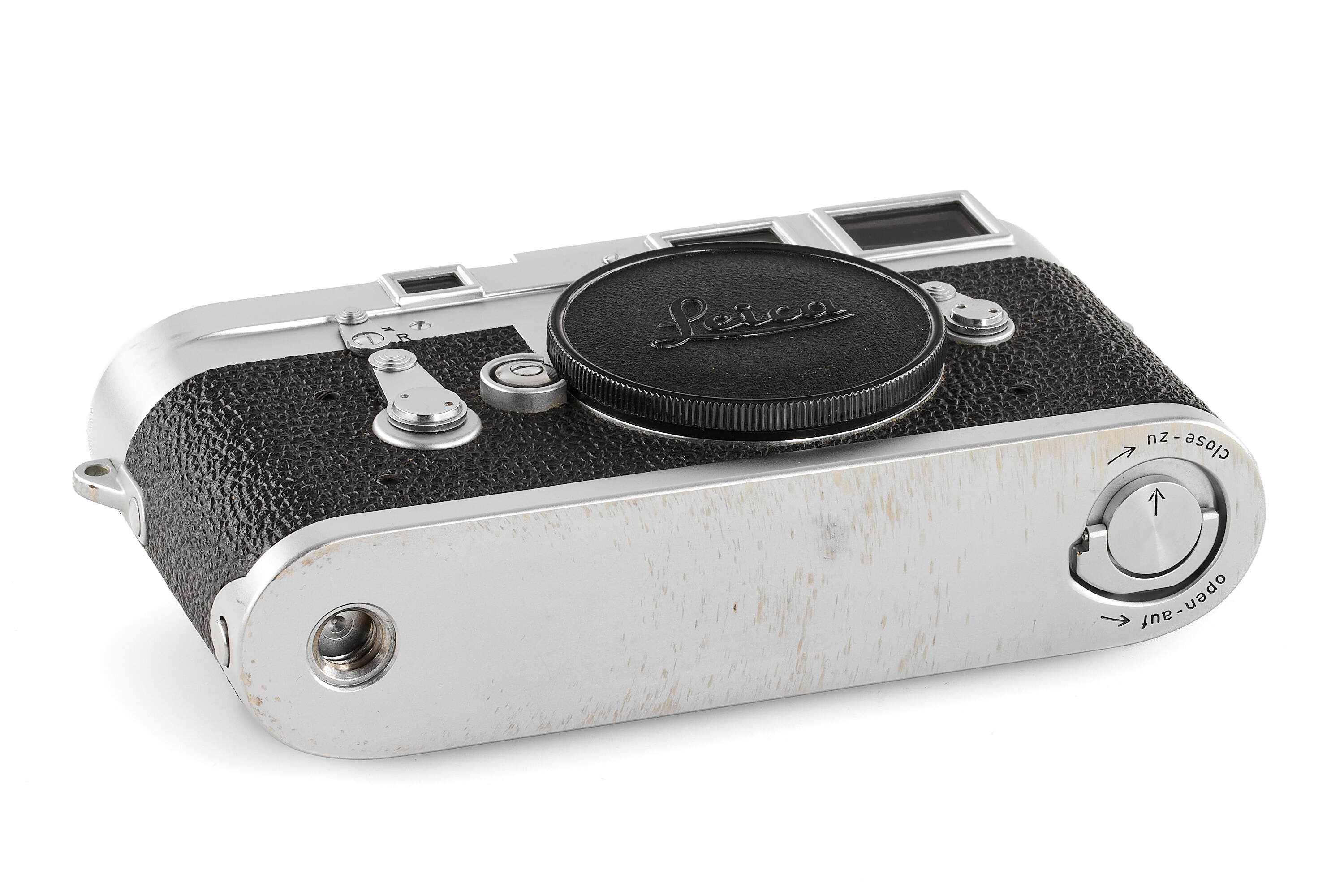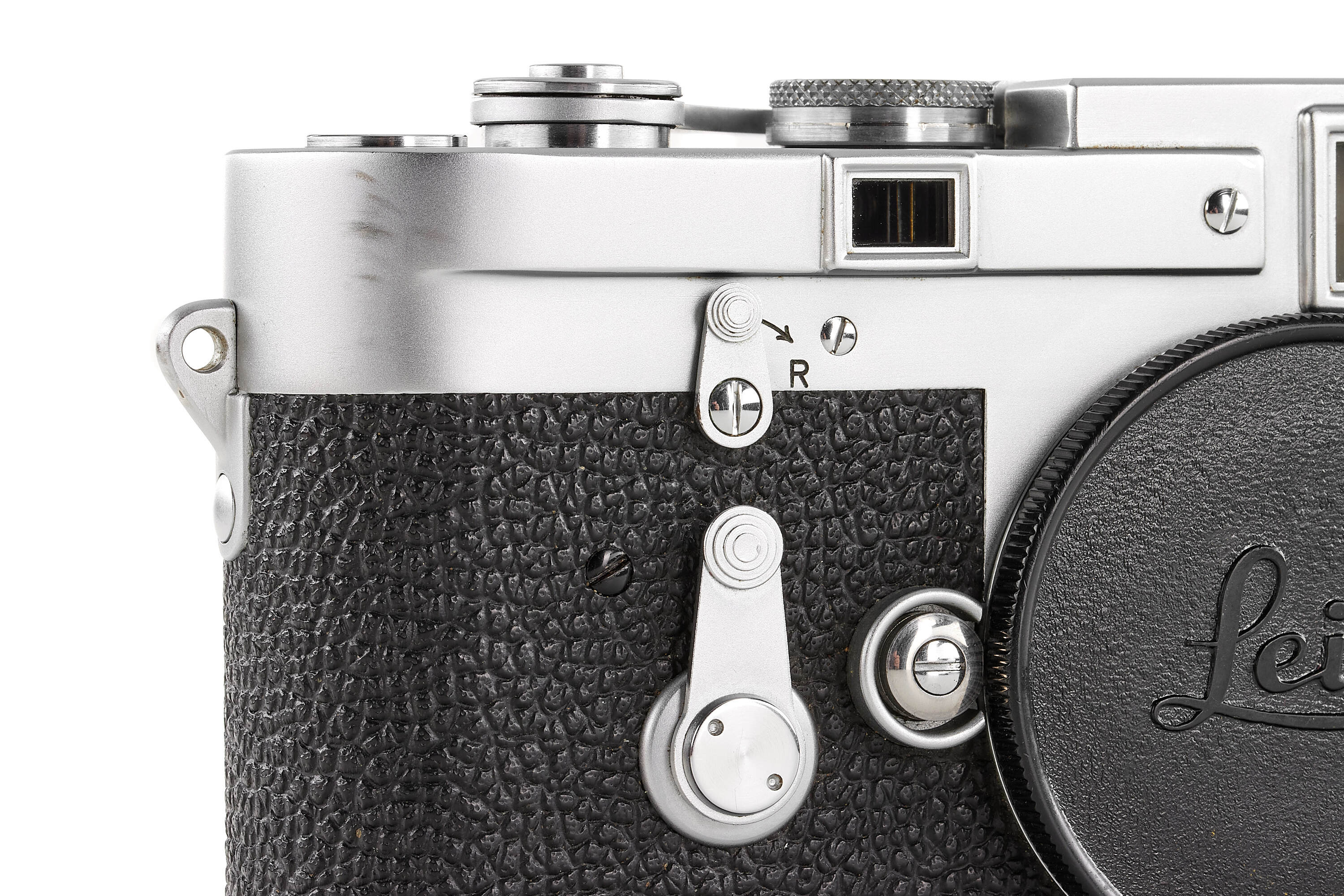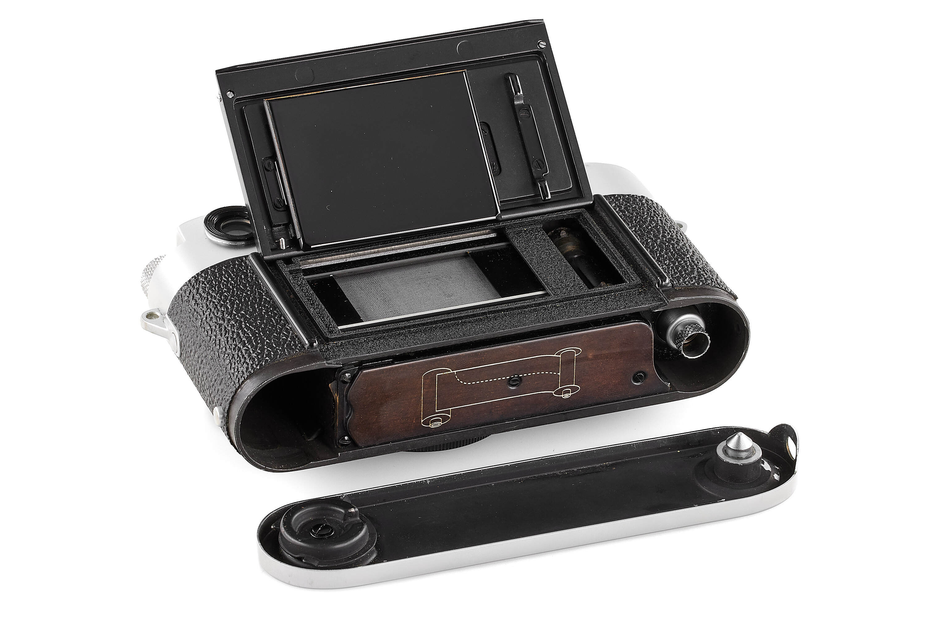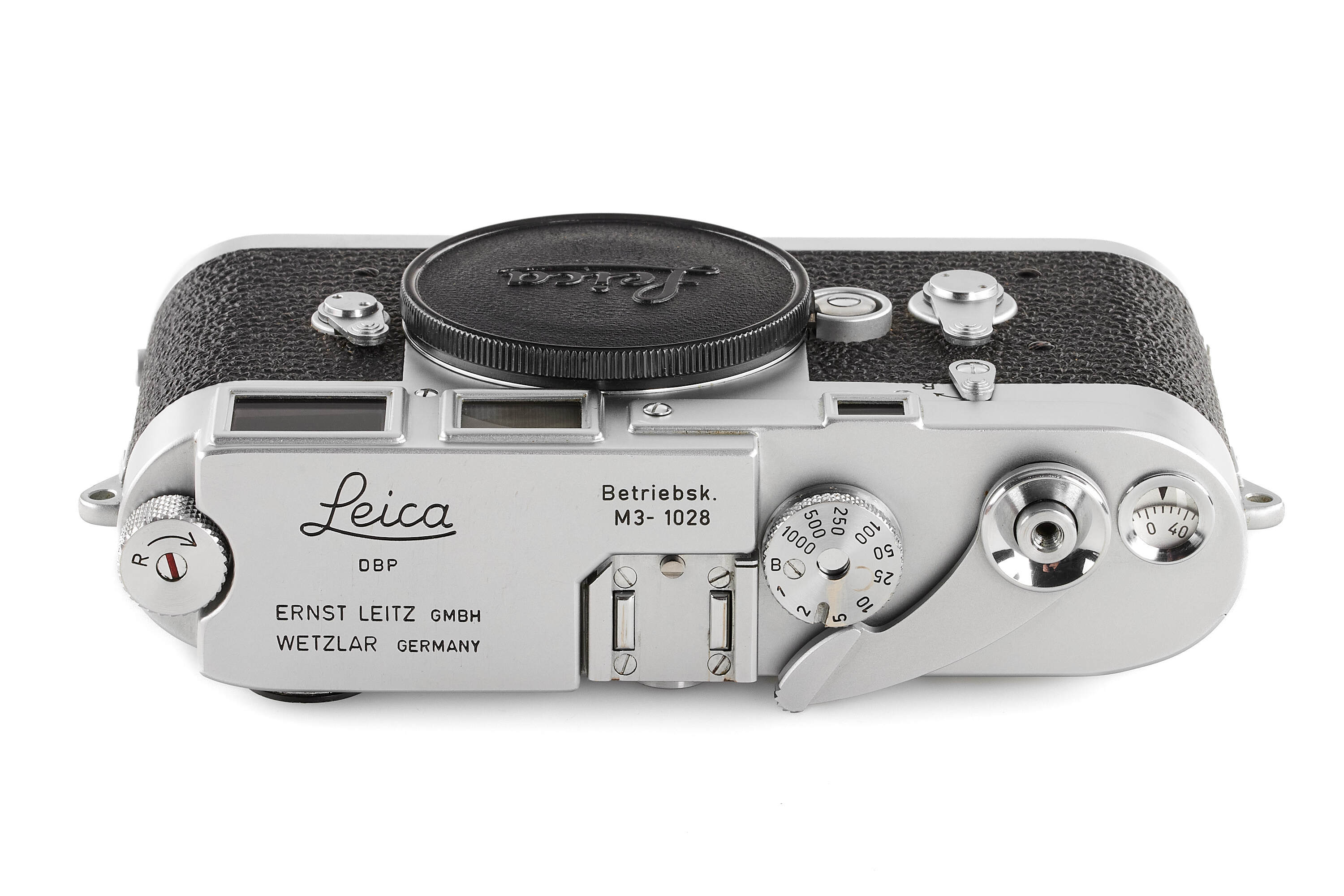 Interesting very rare and early Leica M3 Betriebskamera (for internal factory use), with some early features such as the double stroke film transport, glass press-film, memo film to 200 ISO, speed progression, etc., with frame selector, in very good condition, top plate engraved 'Betriebsk. M3 – 1028', with body cap, together with a rare sought-after DONNA Leica M3 light brown leather box, similar to the one protecting the famous and very first Leica M3 no.700000 sold at the Leitz Photographica Auction in June this year.